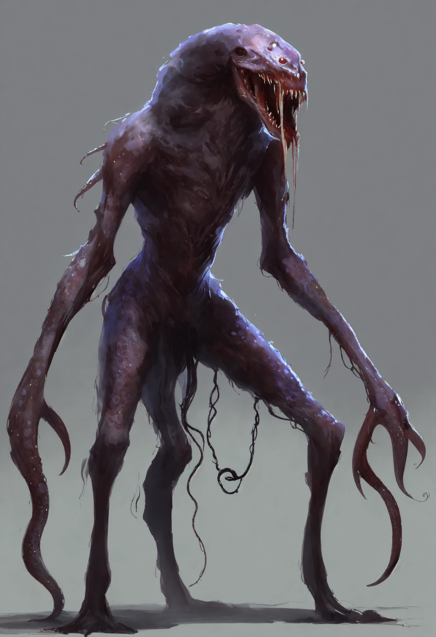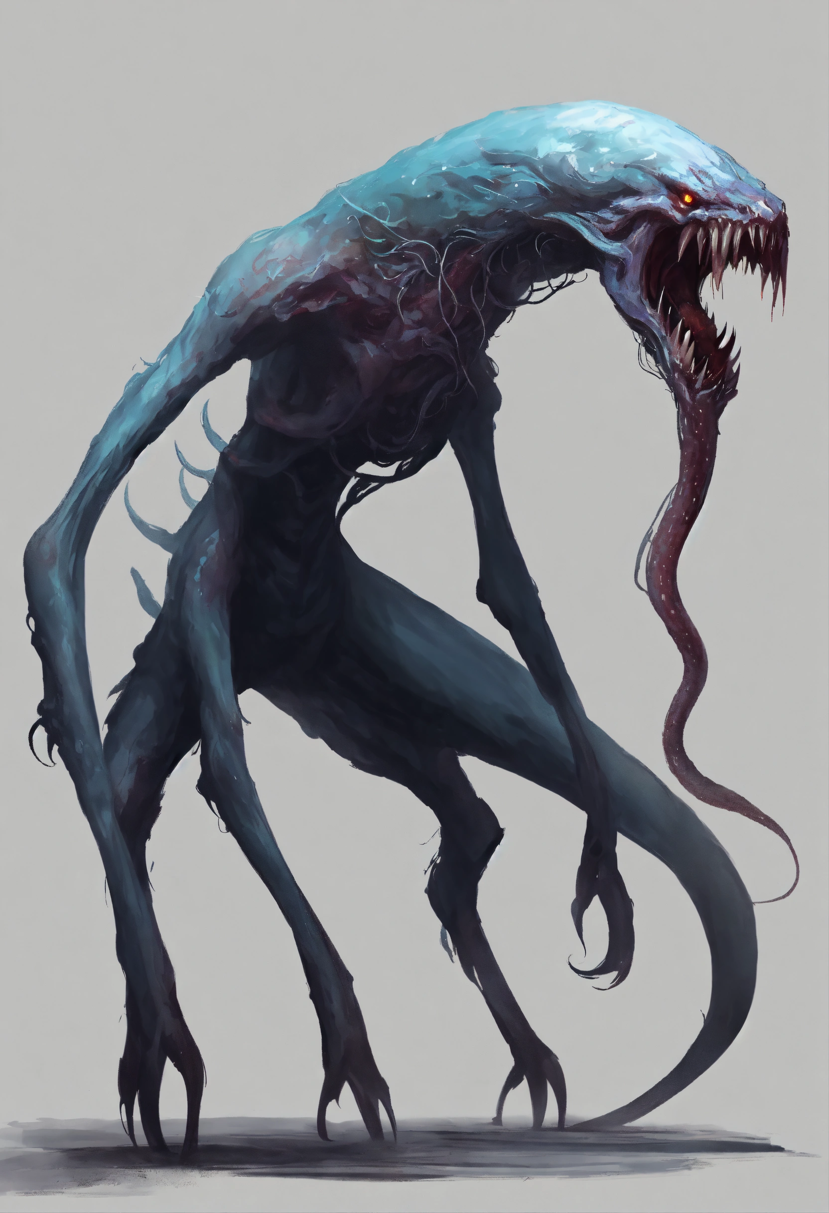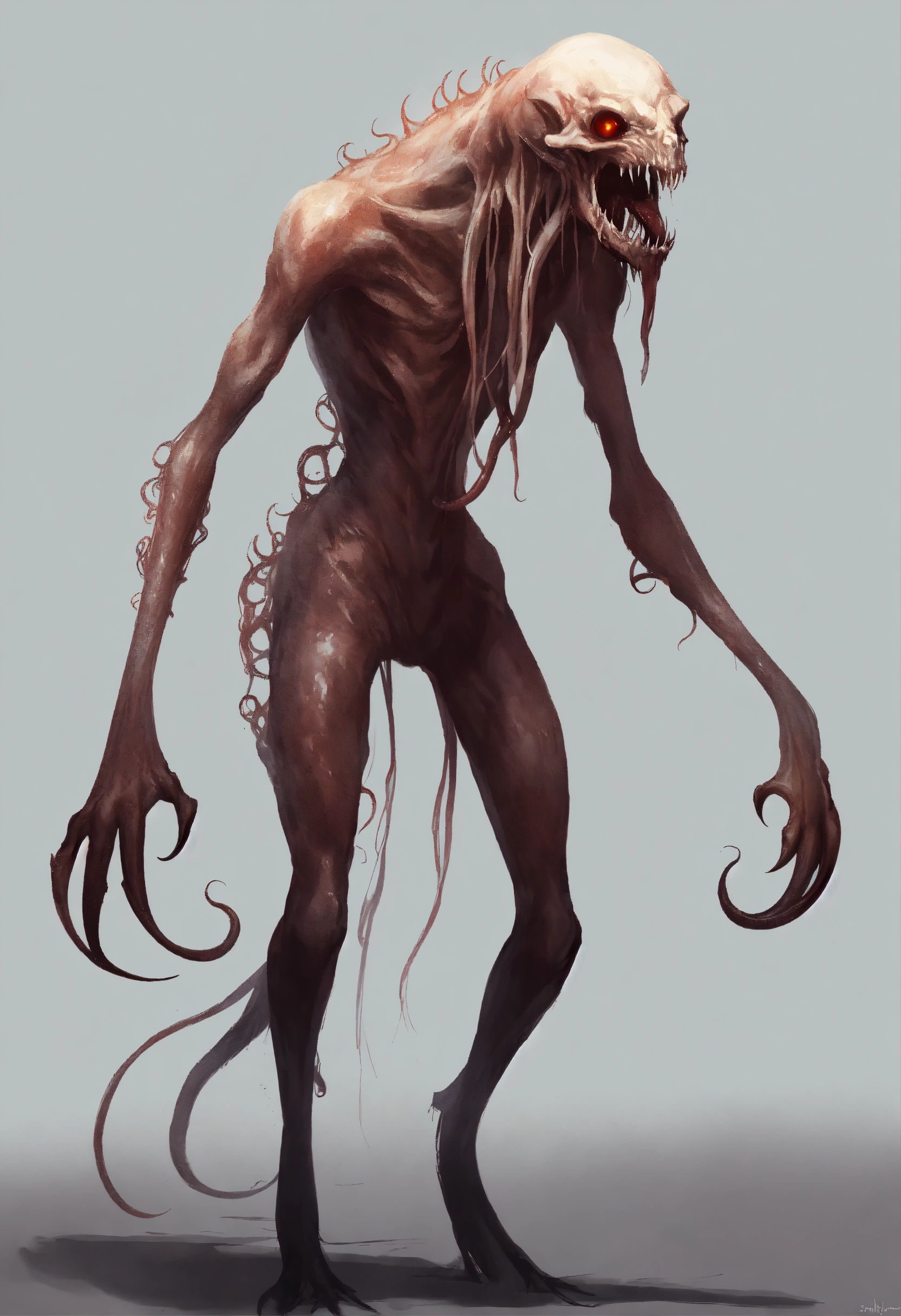 Concept art, side view, digital paintng, skiny ghostly monster, two long legs, tentacle arms, dark skin, mouth with fangs, empty eye sockets, clean white background, no background