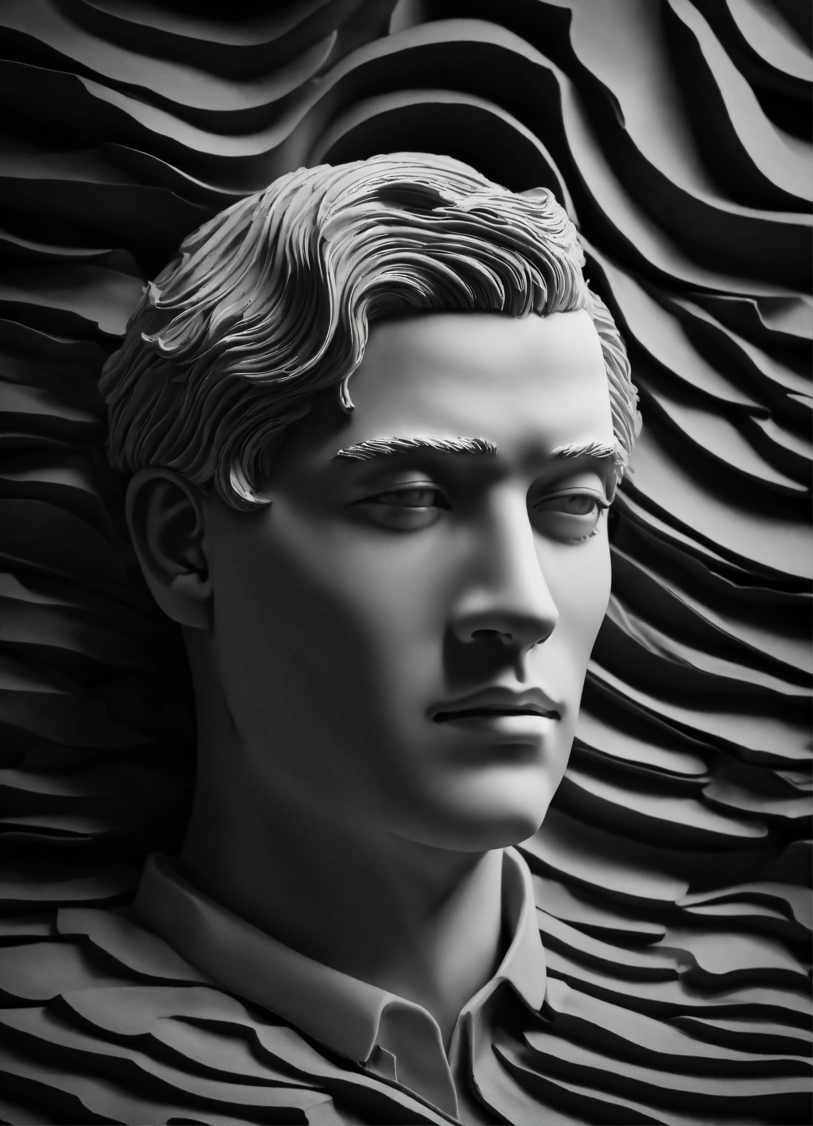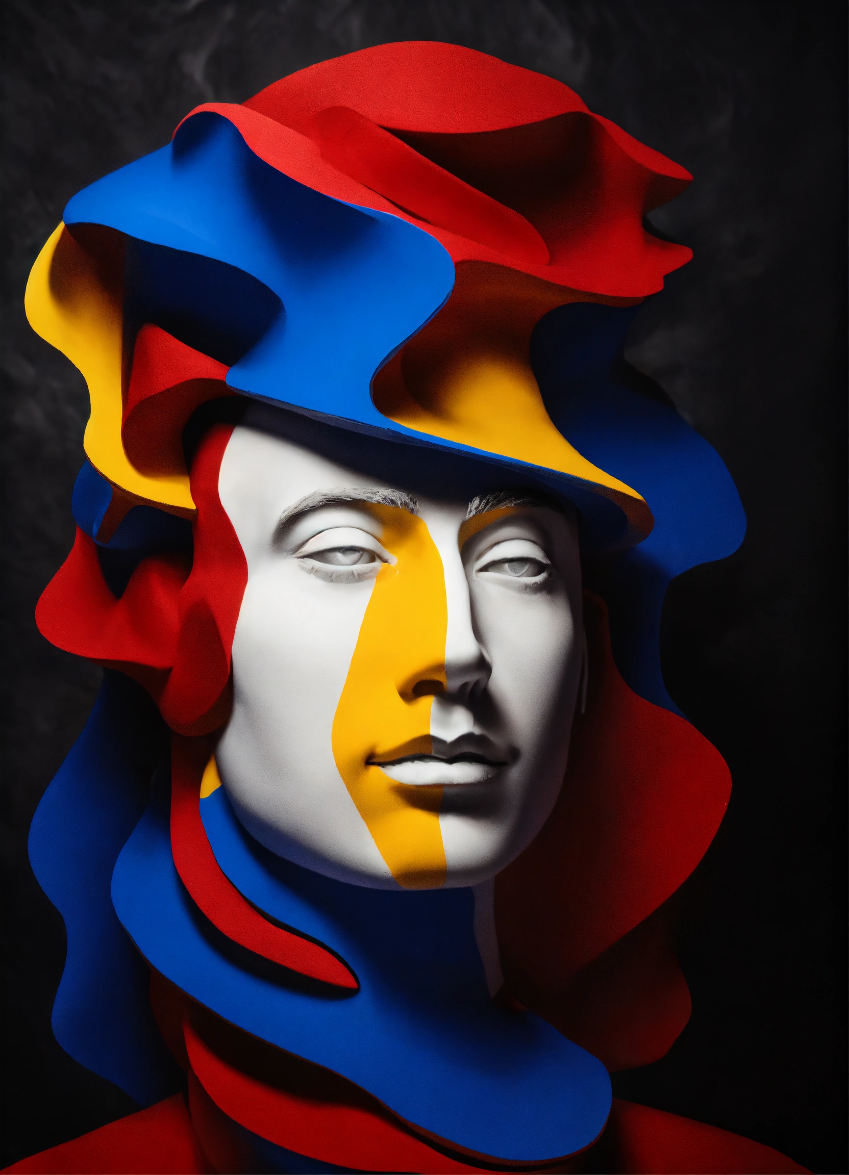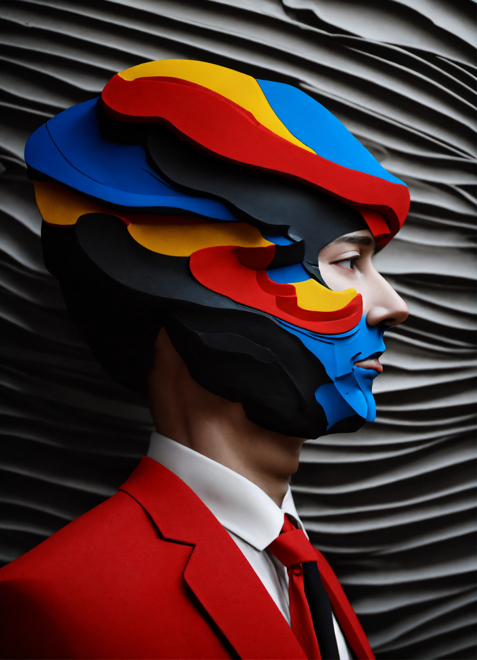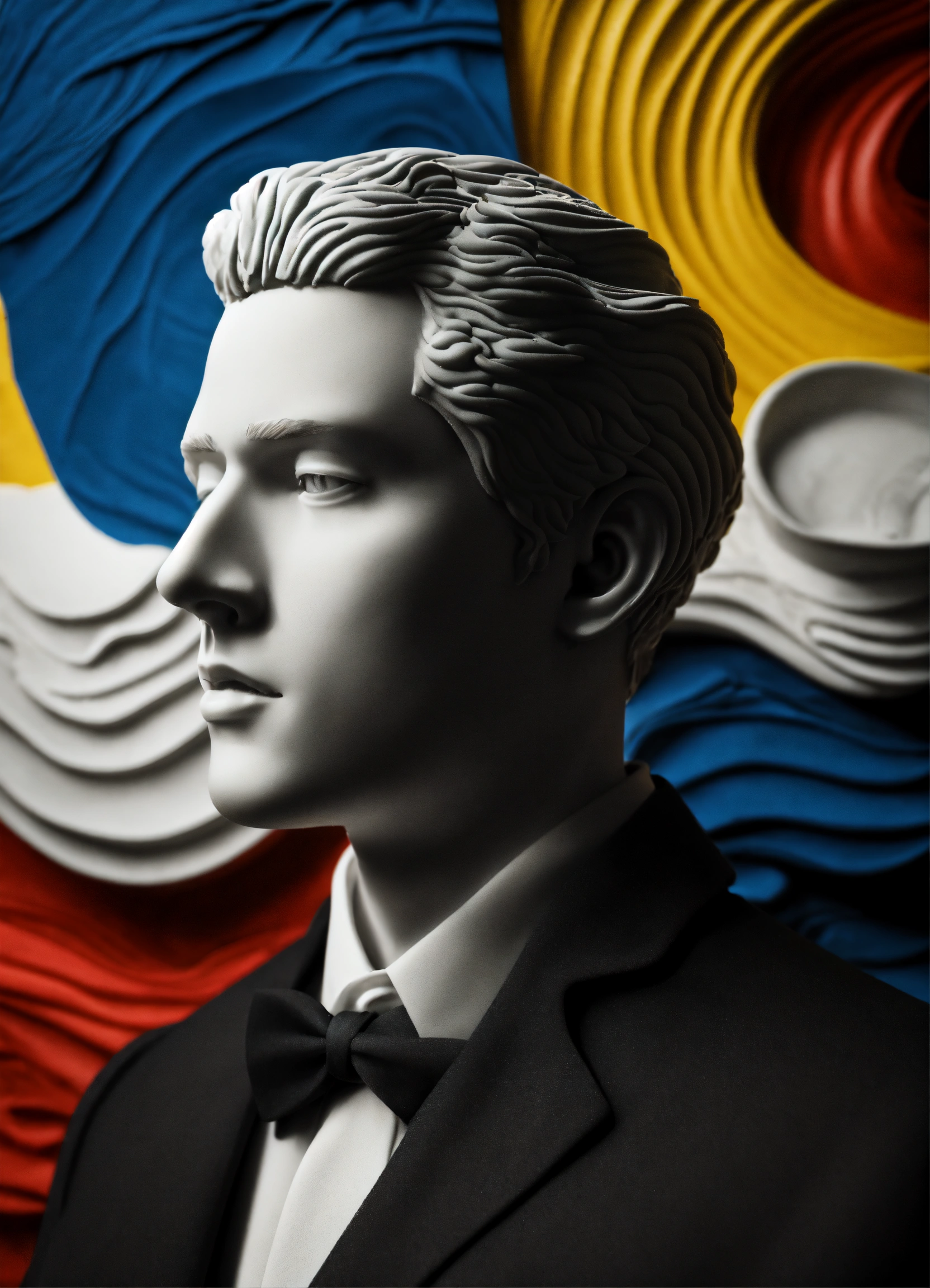 Black and white and primary colors, 3d modeling clay abstract waves, man portrait photography, immersive inspired dremascape, rené magritte inspiration.