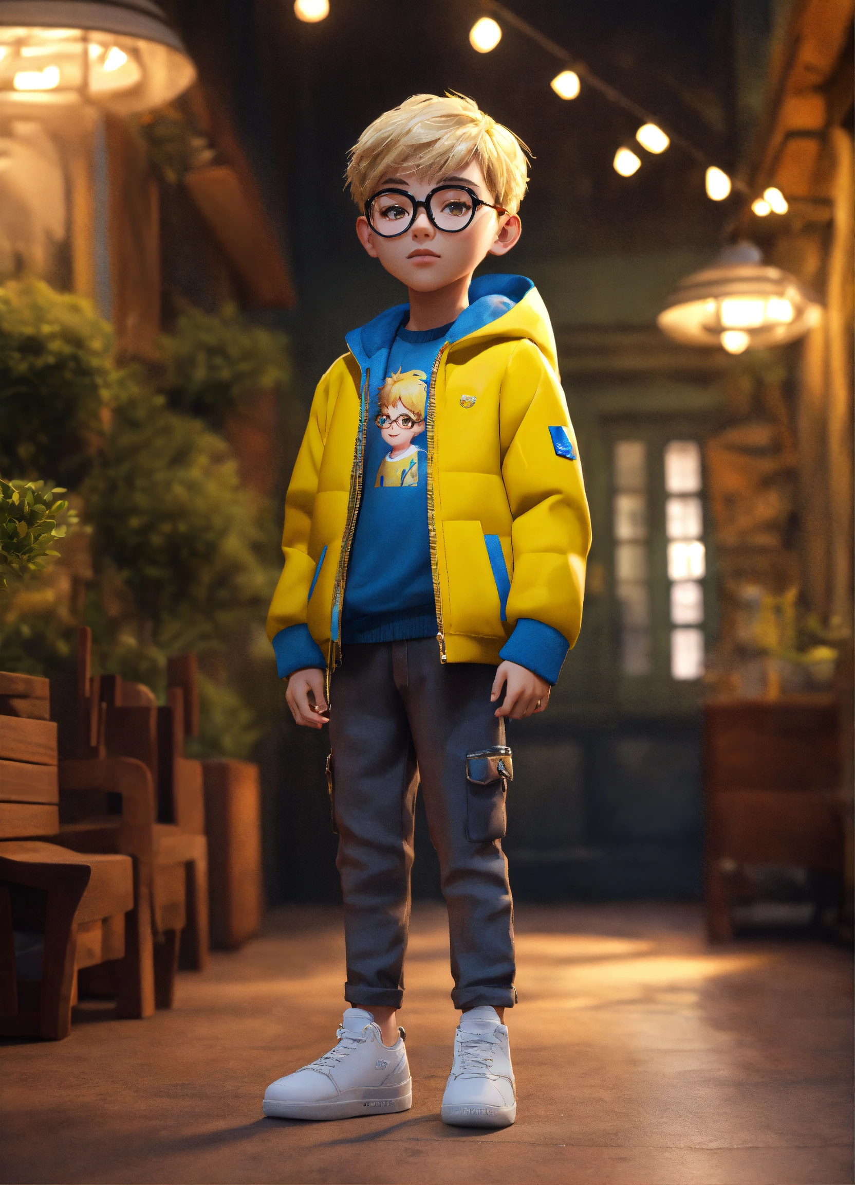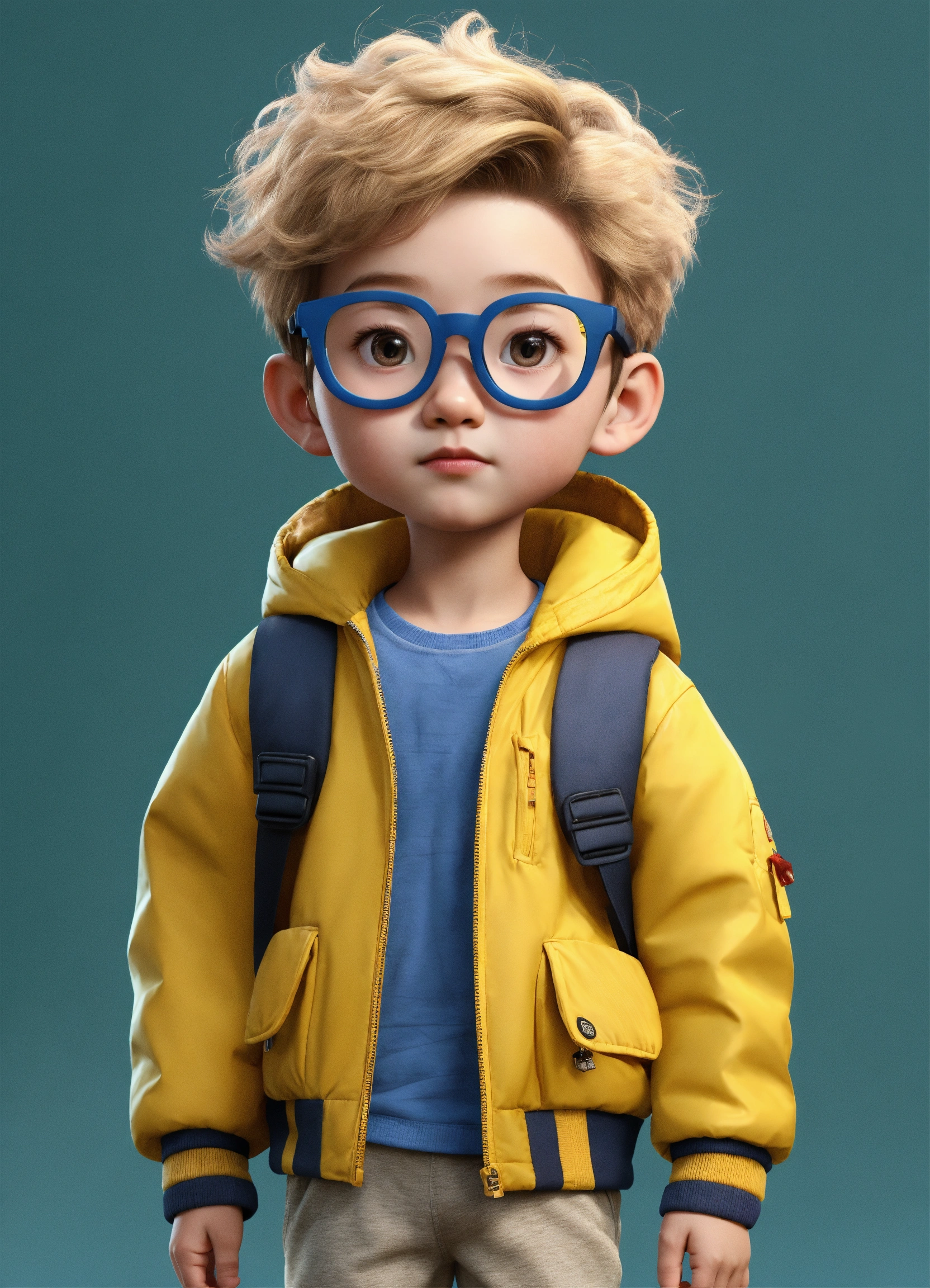 A young boy wearing glasses and a yellow jacket, beautiful 3 d rendering, full body, pixar cute, inspired by du qiong, blond boy, andrew dickson, 2 4 - year - old man, expectation, epic 3 d omolu, toddler, young handsome man, simon lee, cub, maxwell render, bixbite, hipster dad