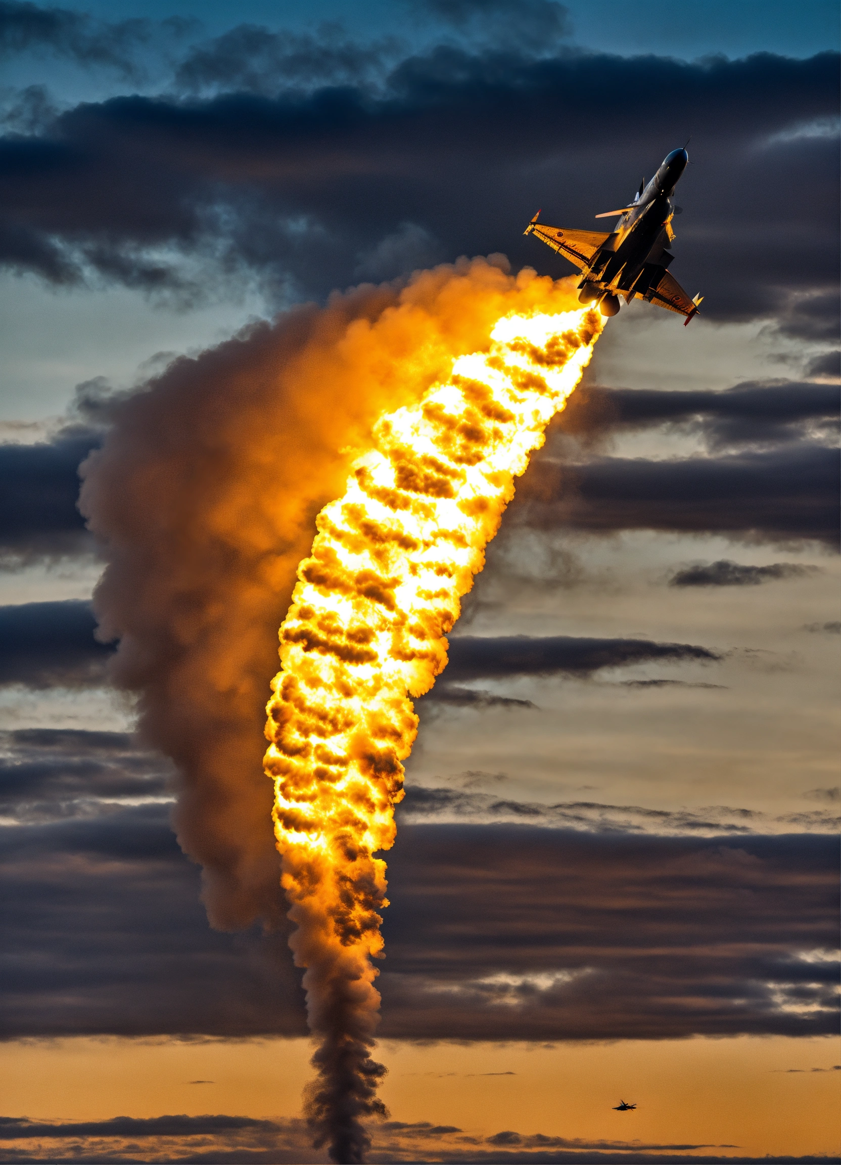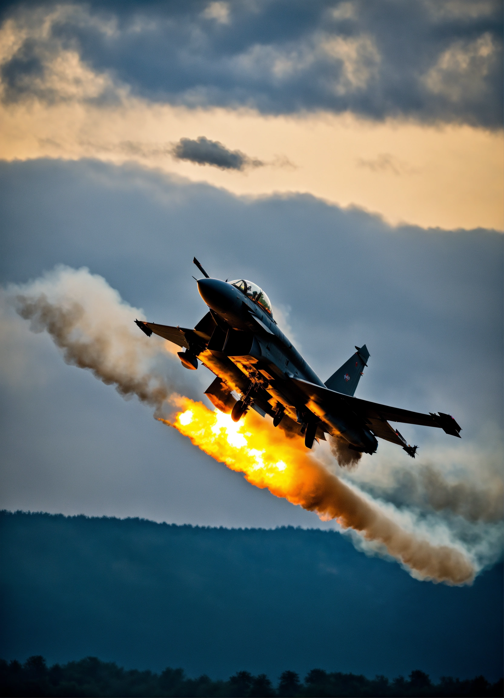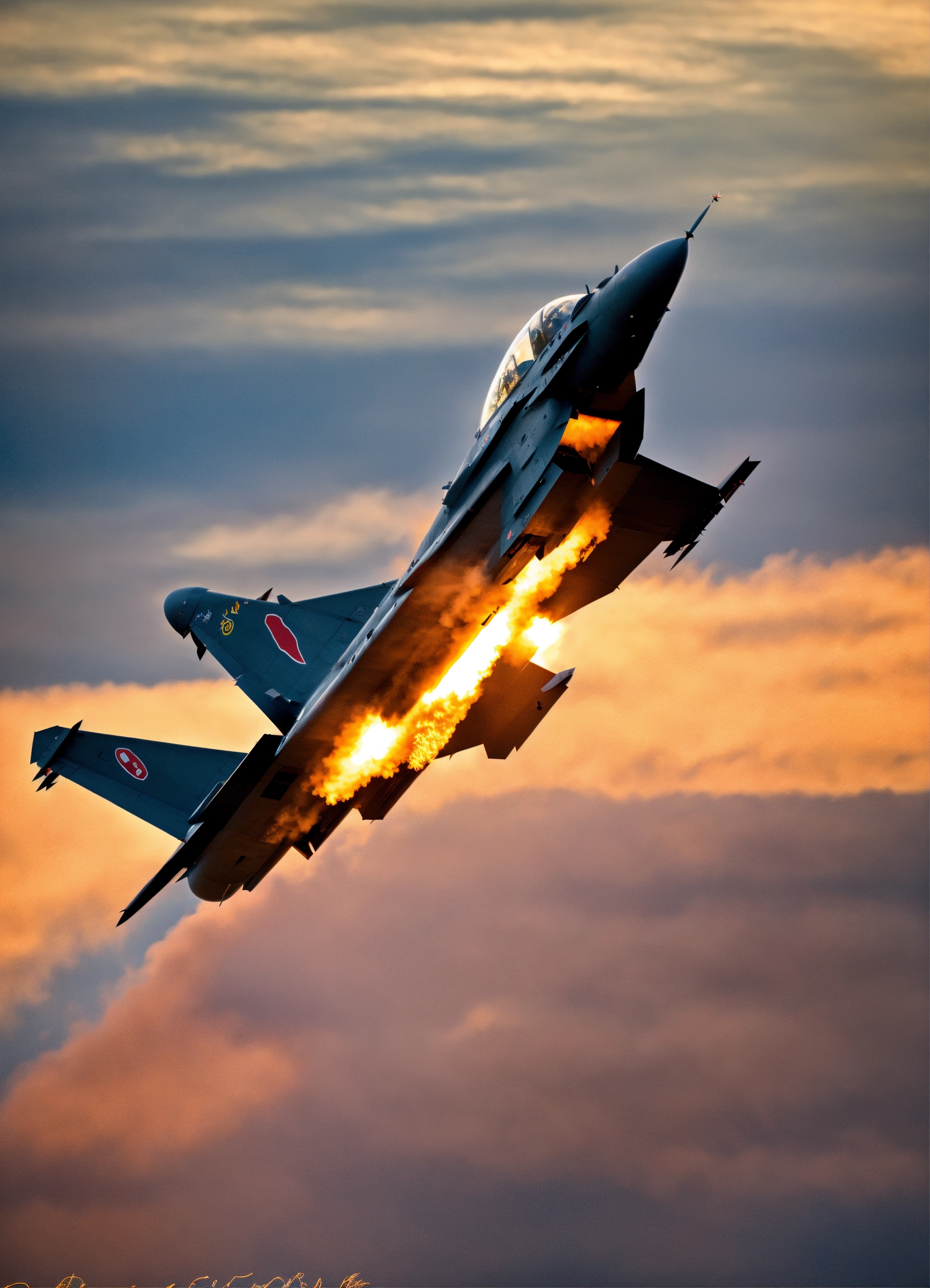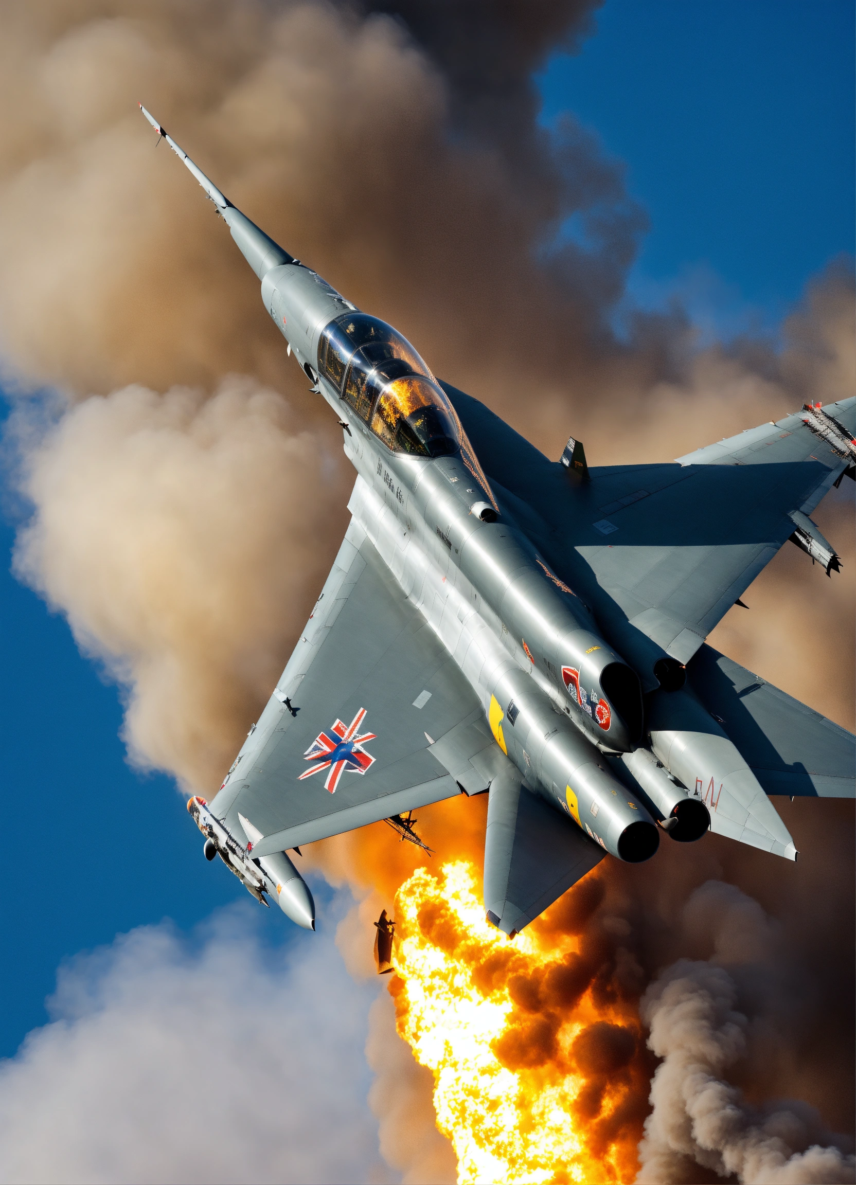Ein eurofighter typhoon, der rasant durch die luft fliegt und einen feuerschweif hinter sich lässt im nikon look.
