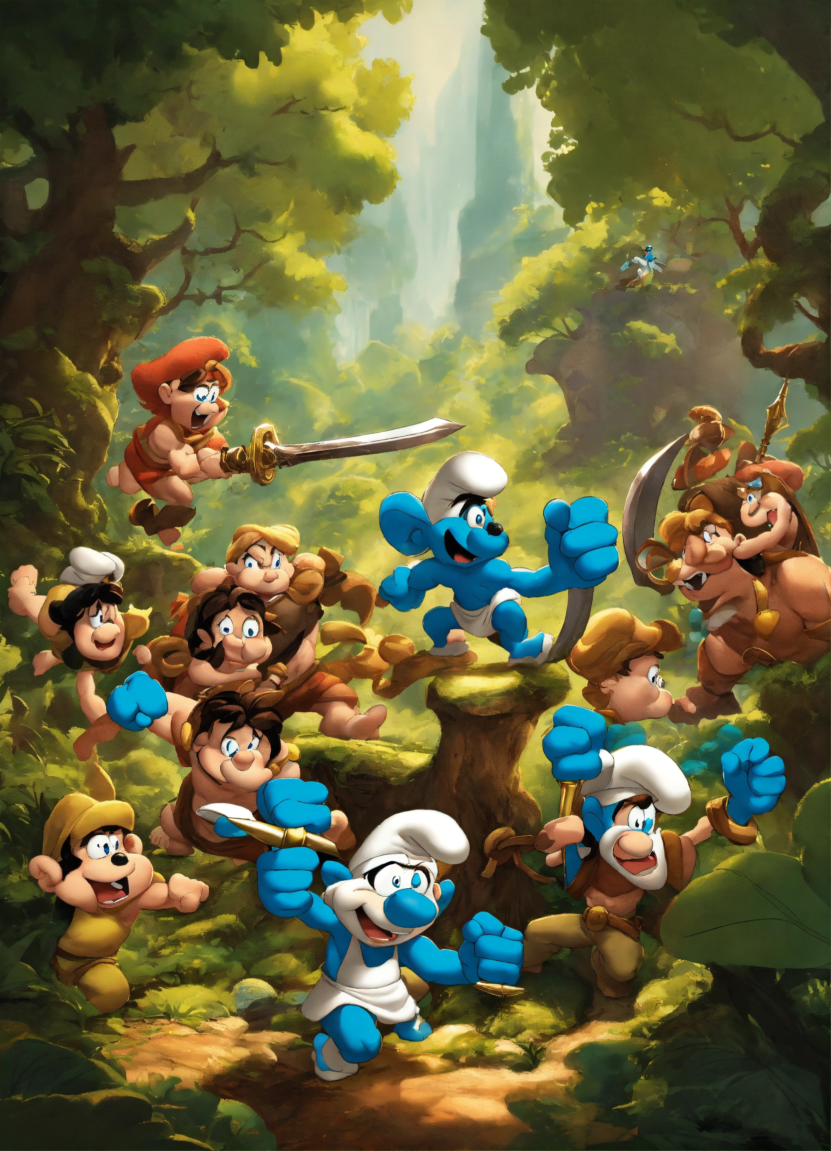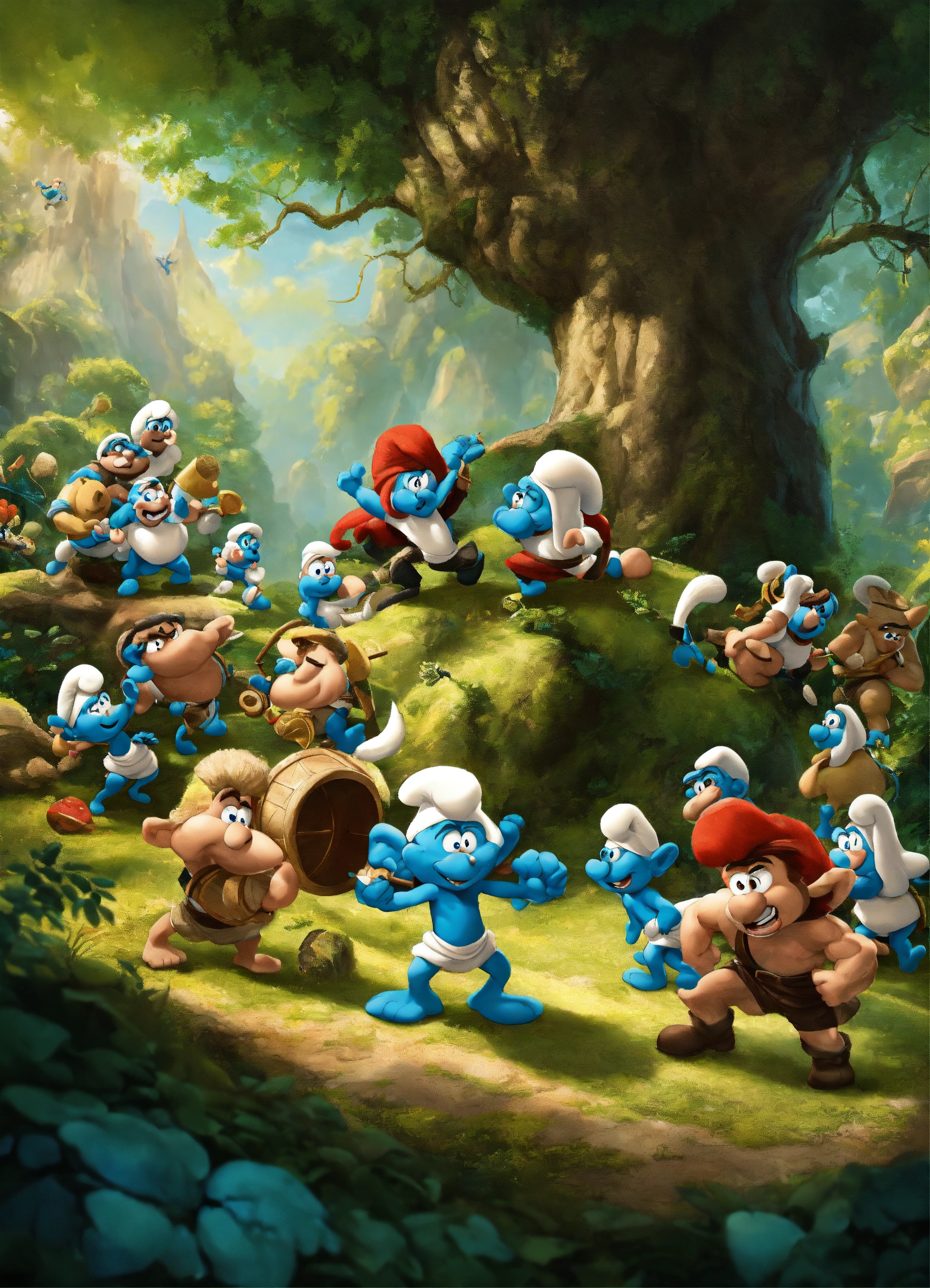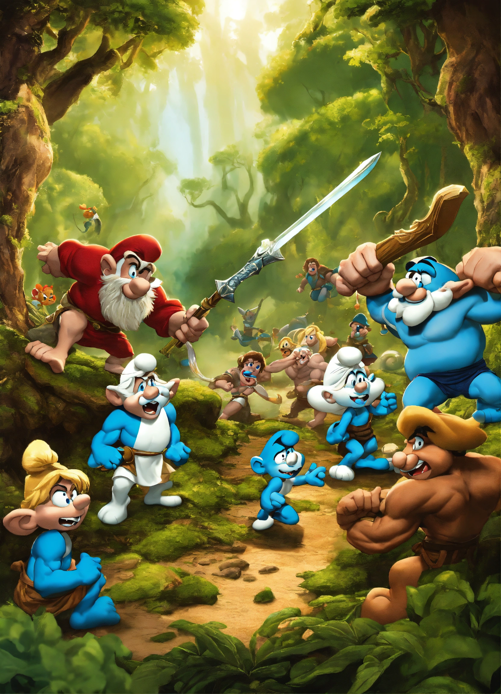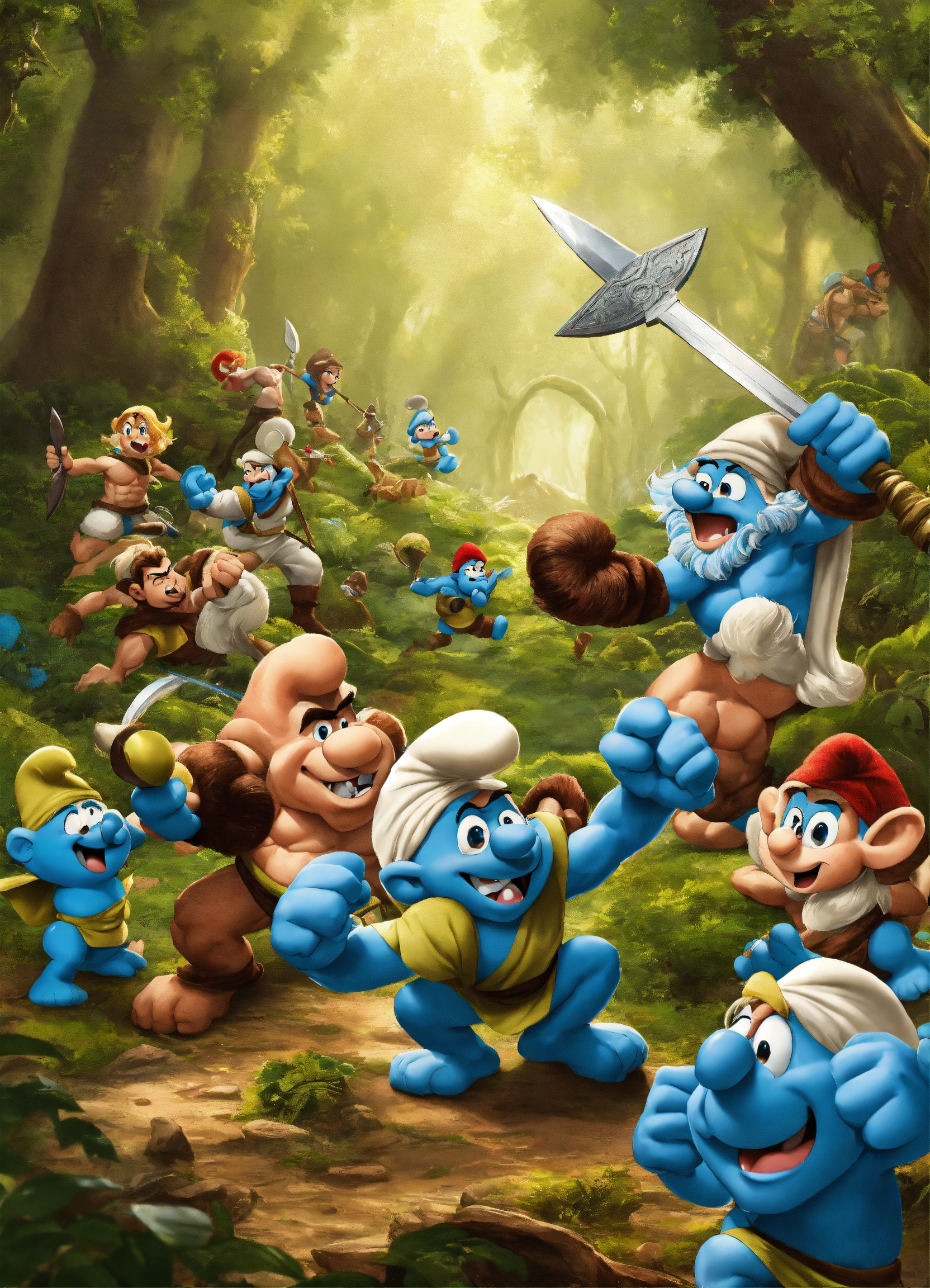The smurfs and hercules fight against gargamel. a big forest, green trees, powerful weapons, muscular hercules and cute ones.