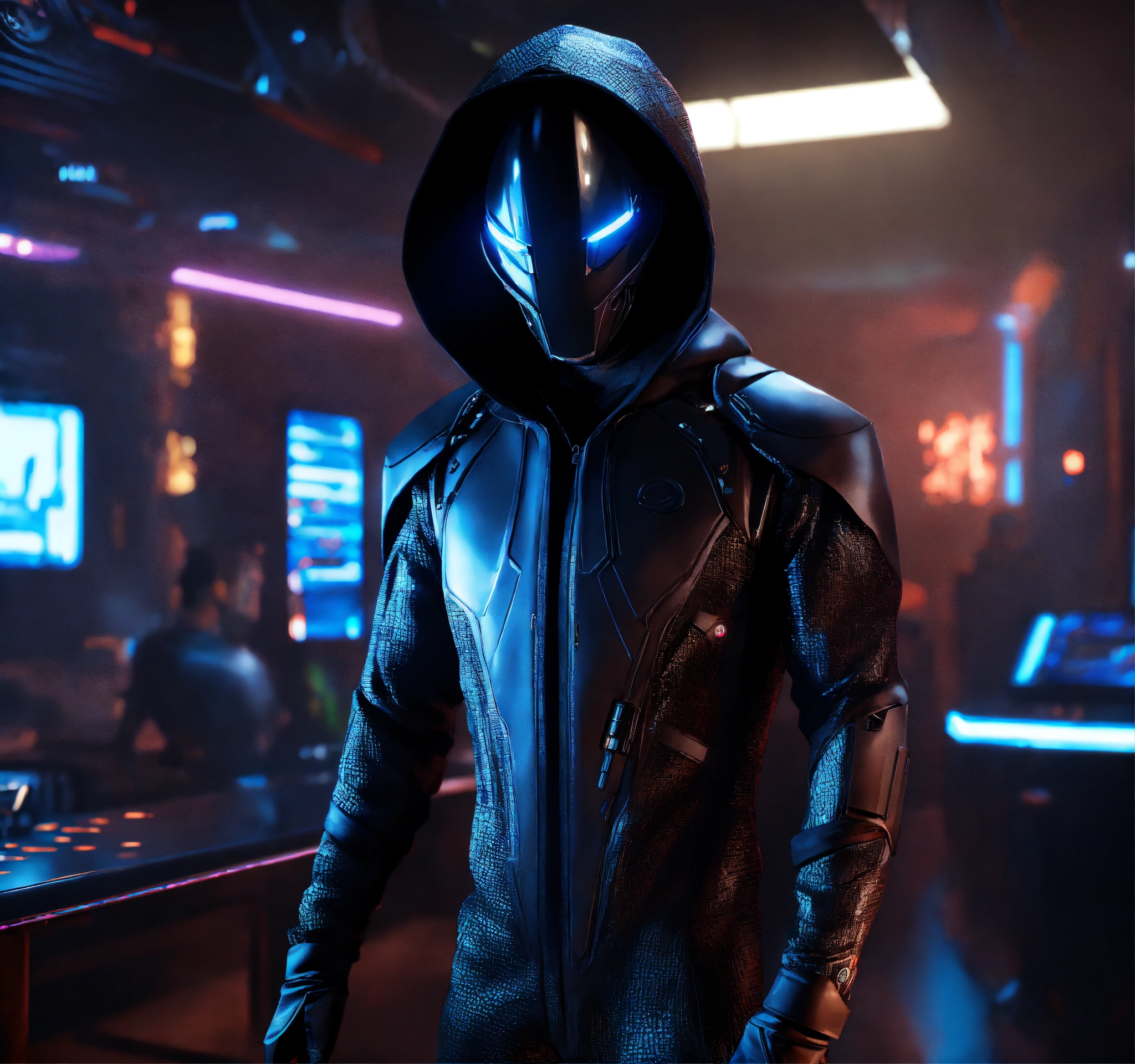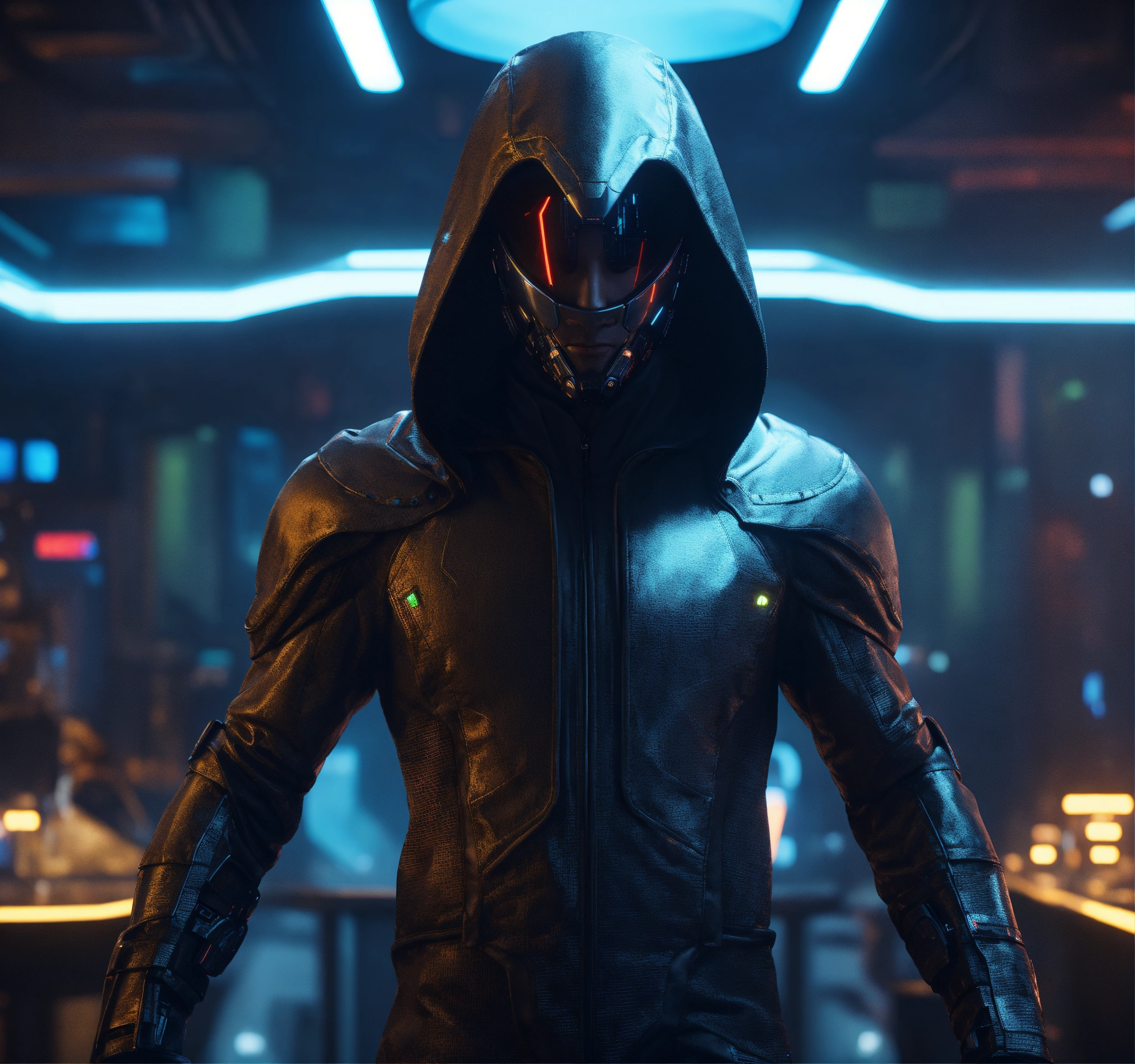 Male alien mutant half cyborg hacker wearing futuristic black clothing, hi-tech visor and hooded cape, in a dark futuristic space port bar, 8k, realistic. unreal engine, pixar