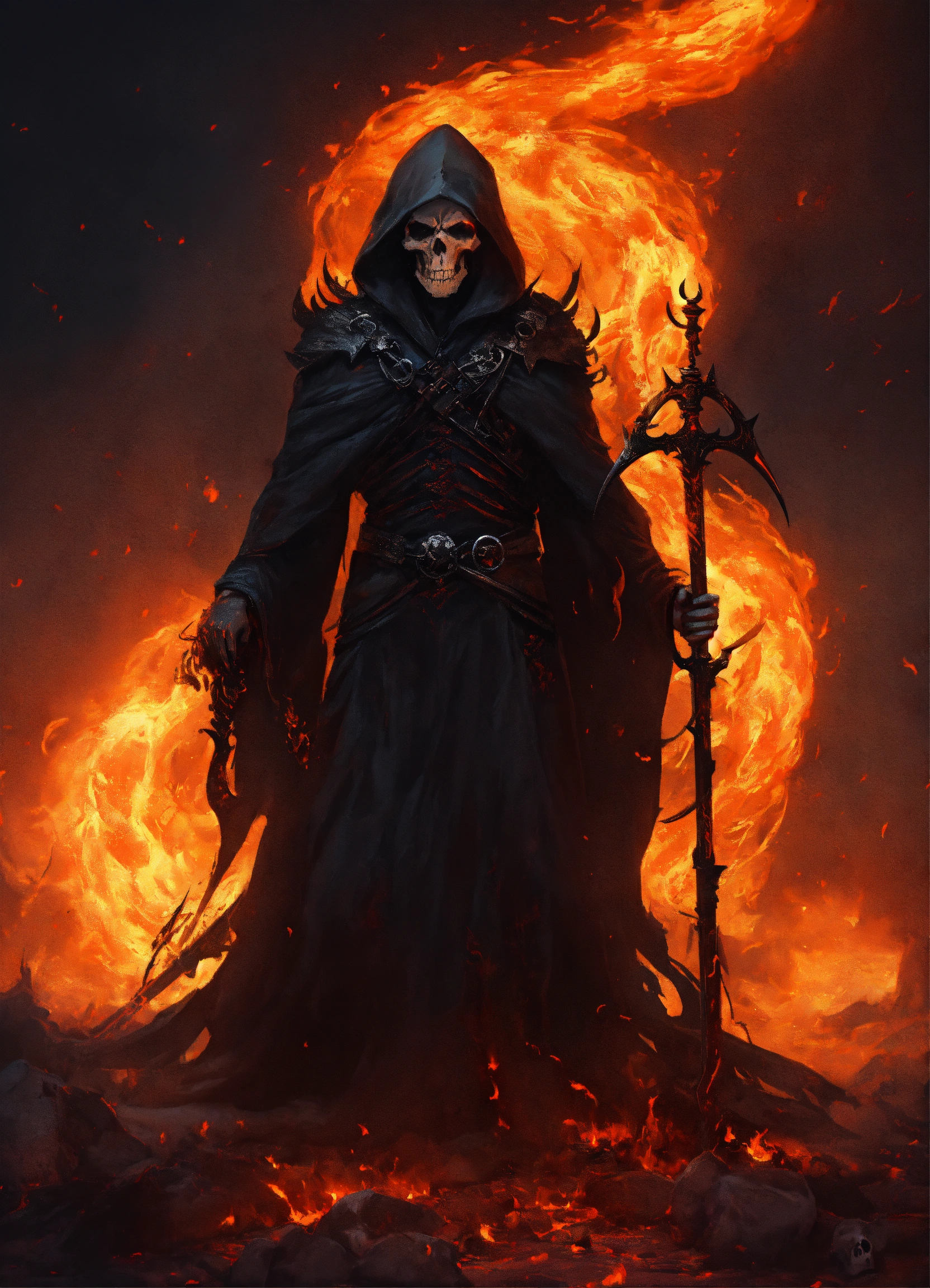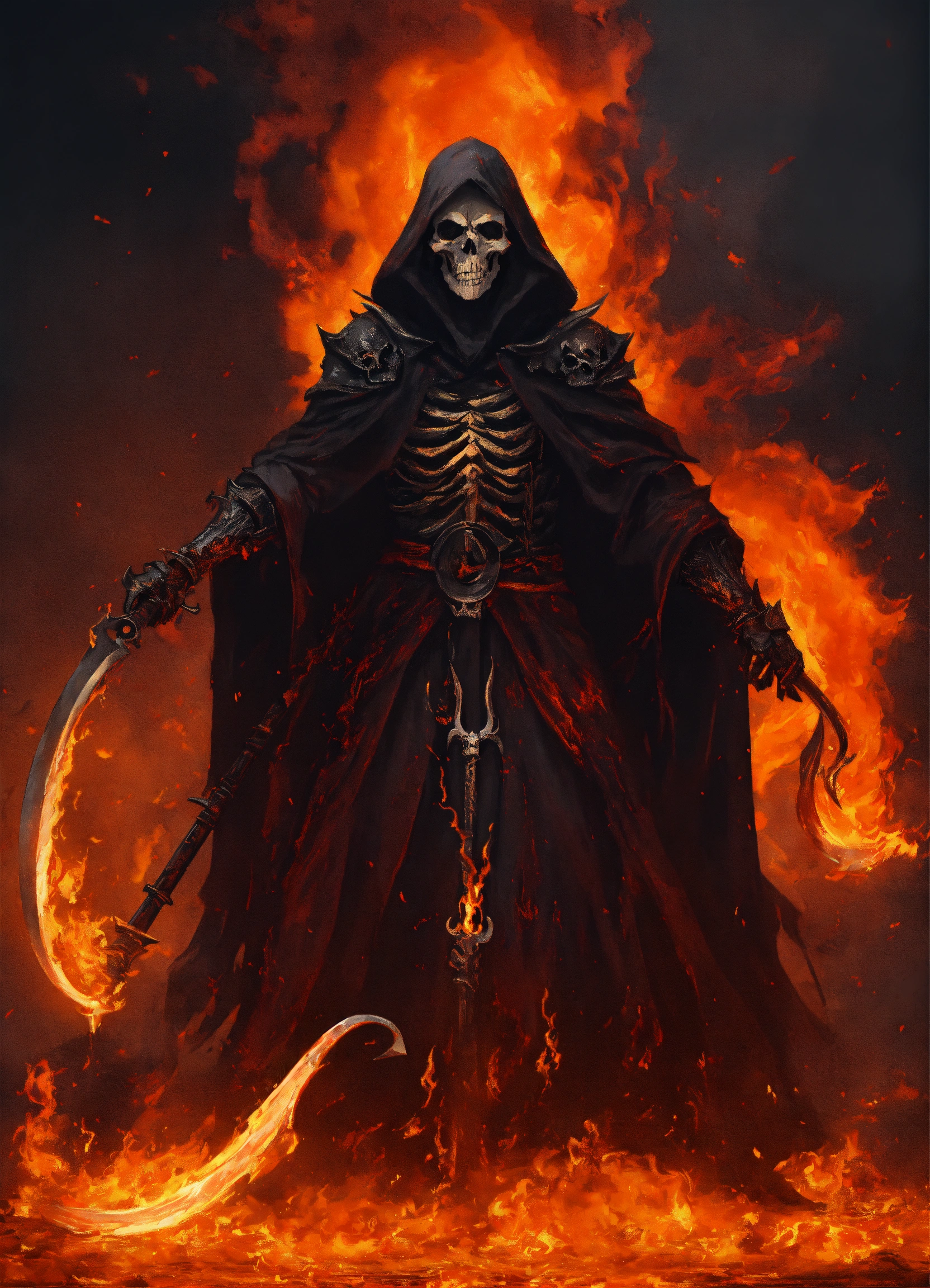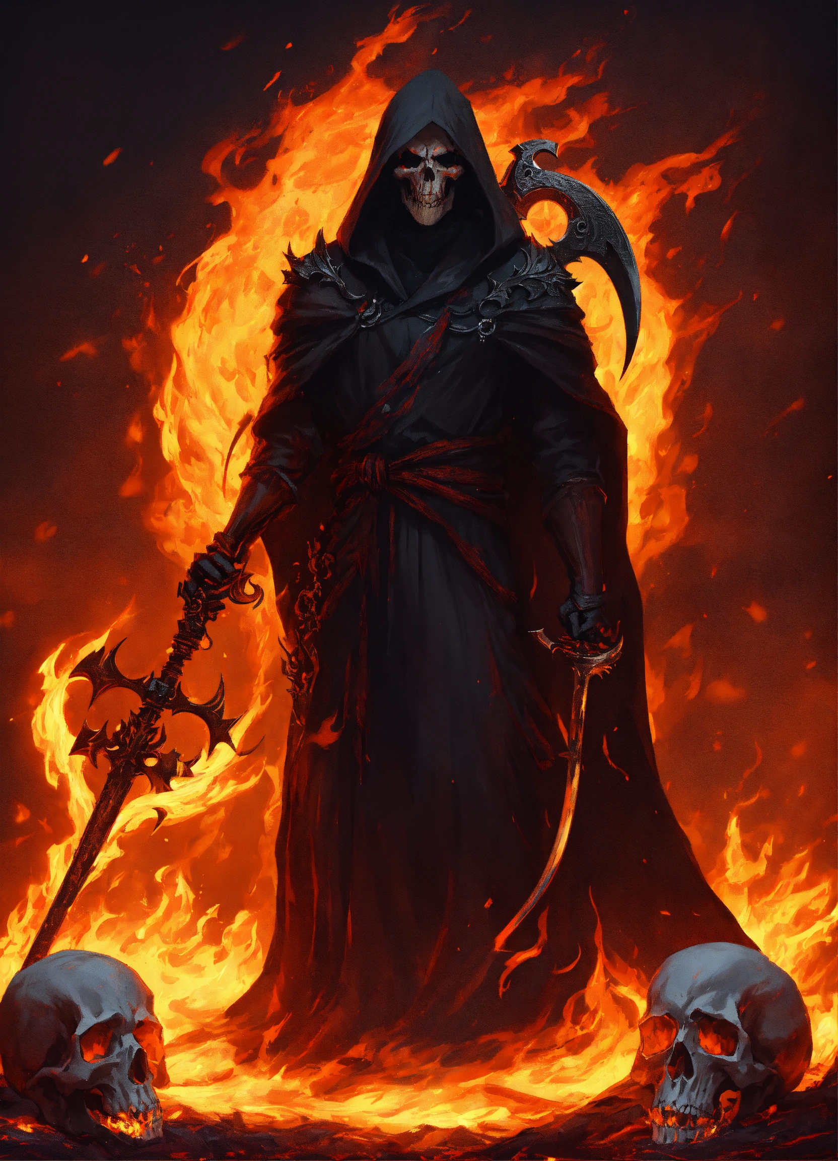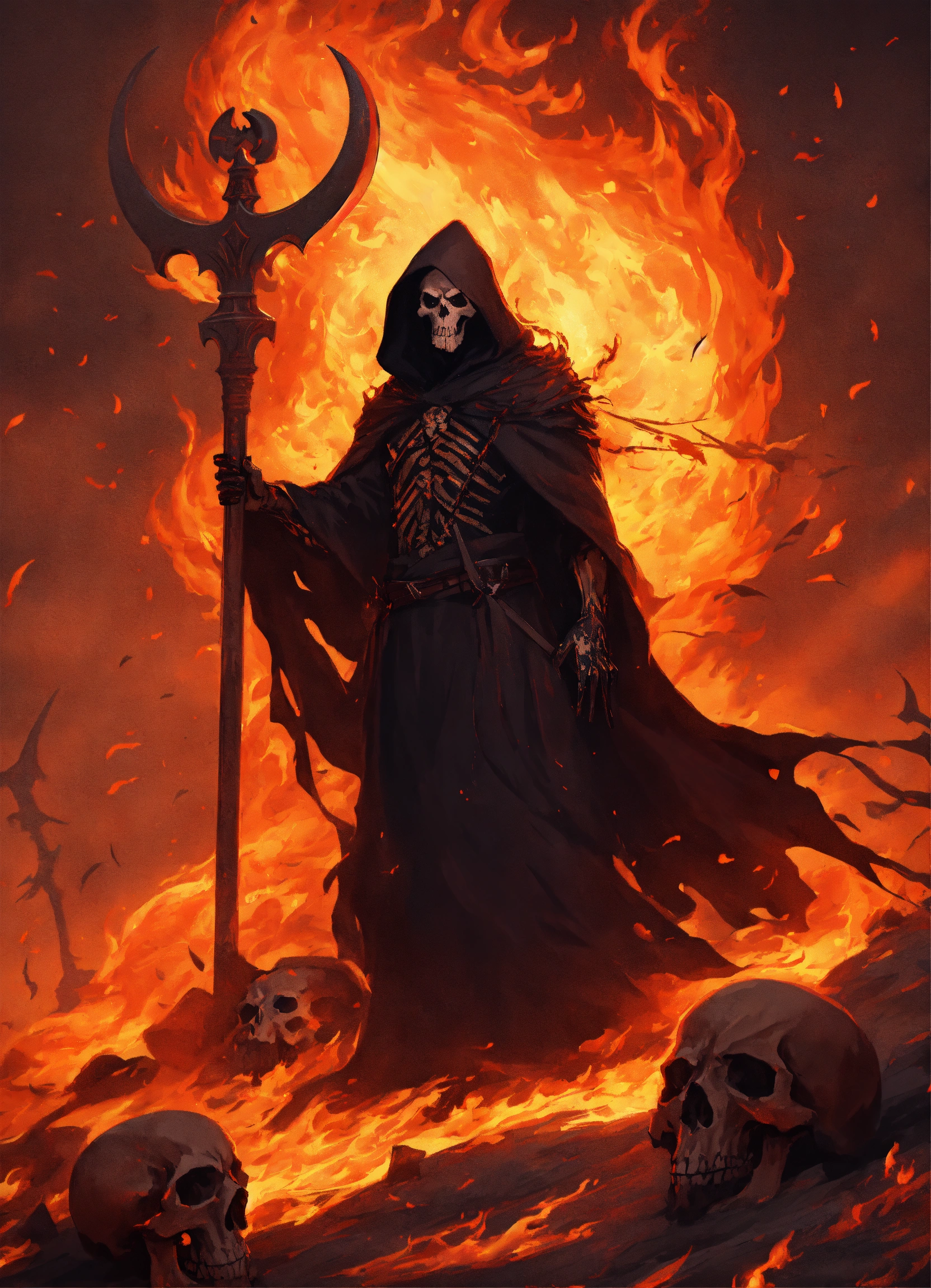 Menacing grim reaper with flaming scythe, tattered flowing robes of fire, surrounded by fire, piles of skulls at his feet, 8k, in the style of minimalism