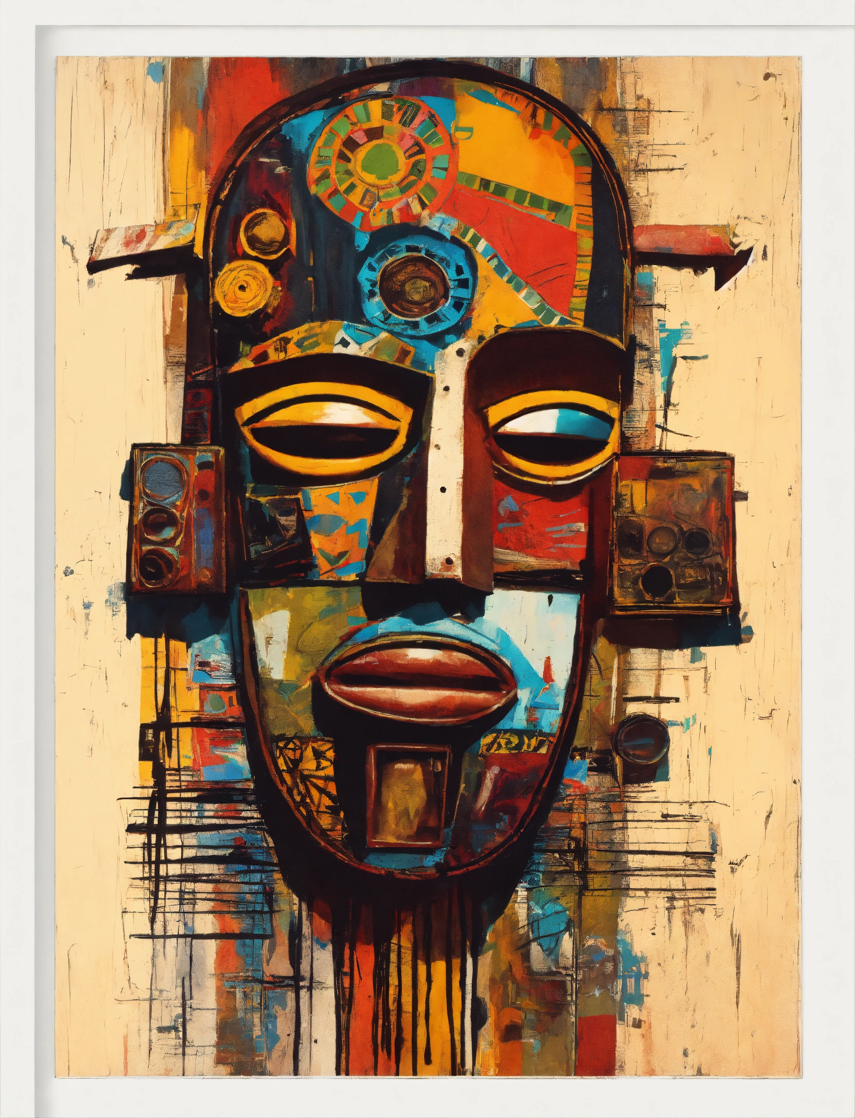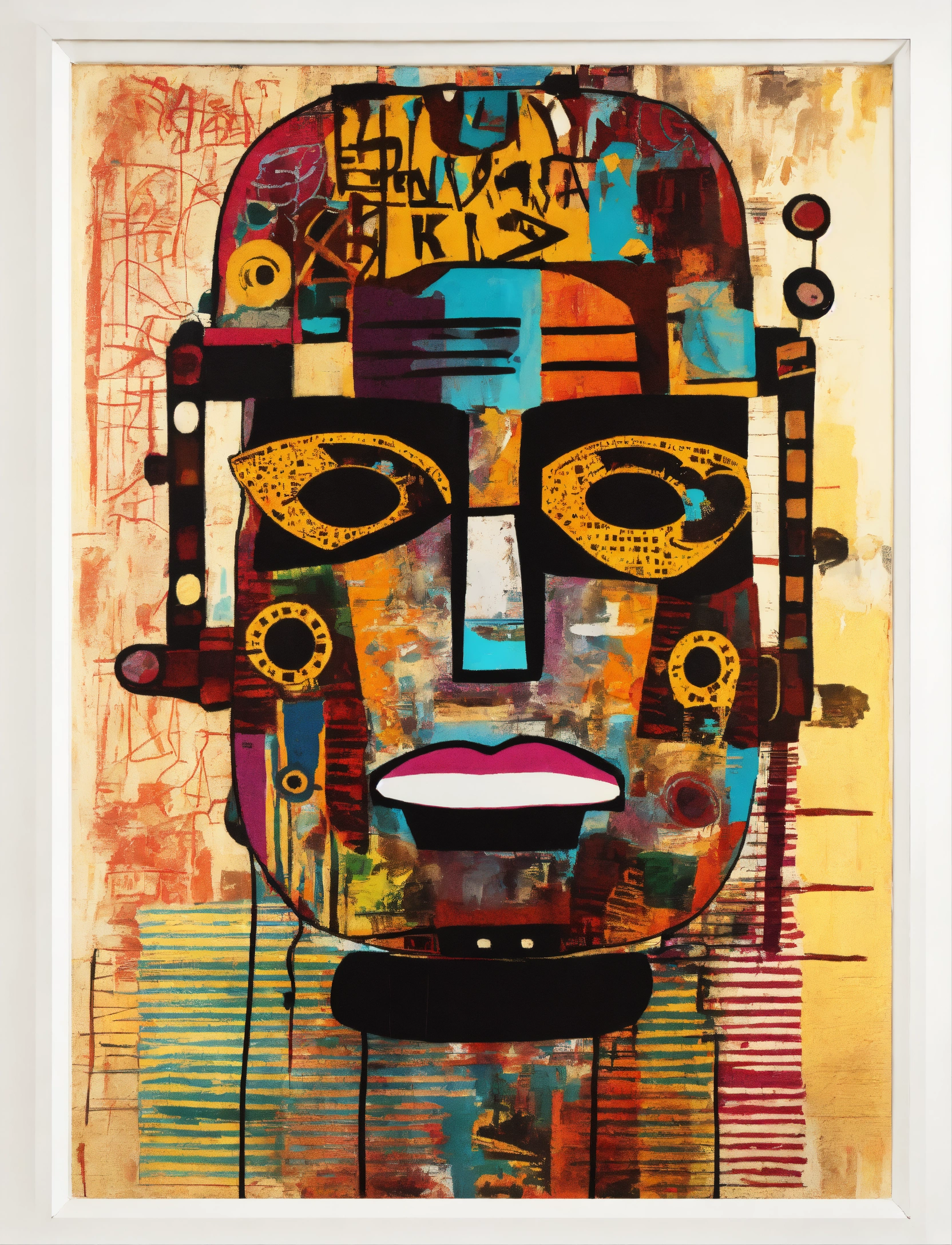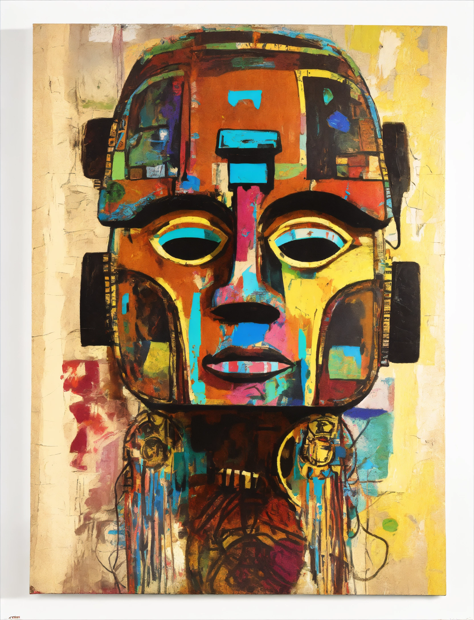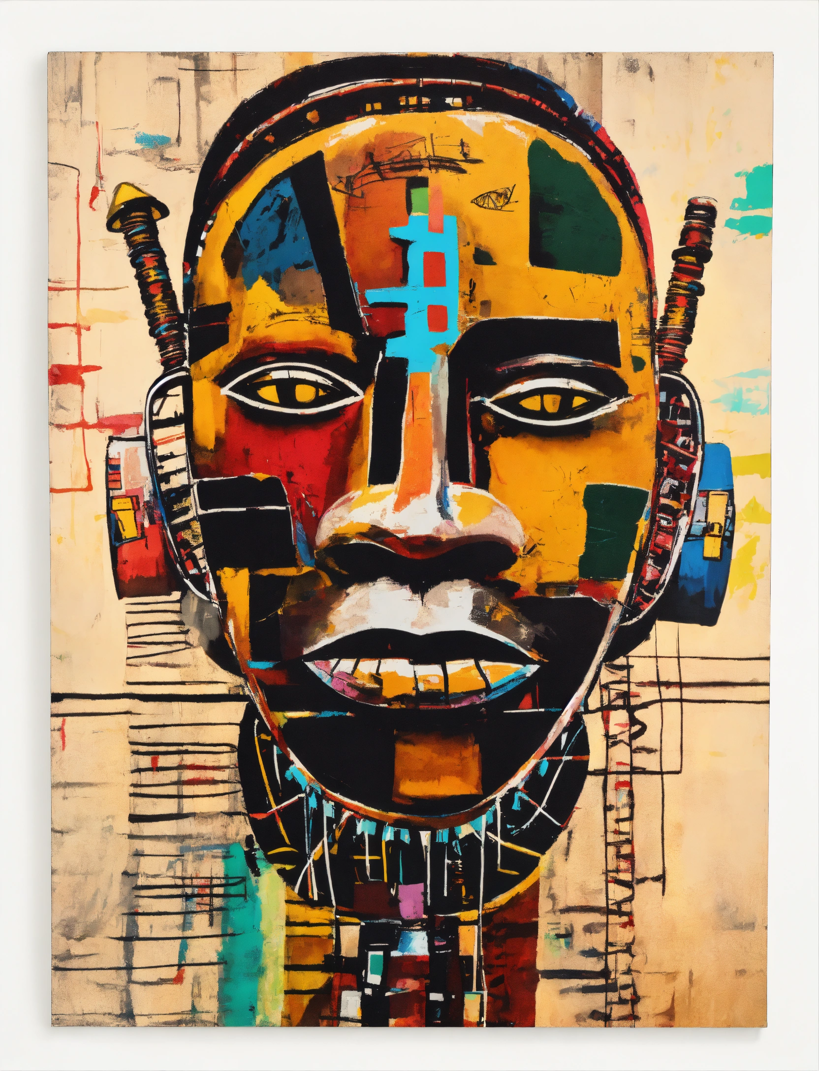 African tribal mask robot collage style abstract edgy expressionism vibrant colors warhol basquiat rothko keith haring style futuristic subway station background