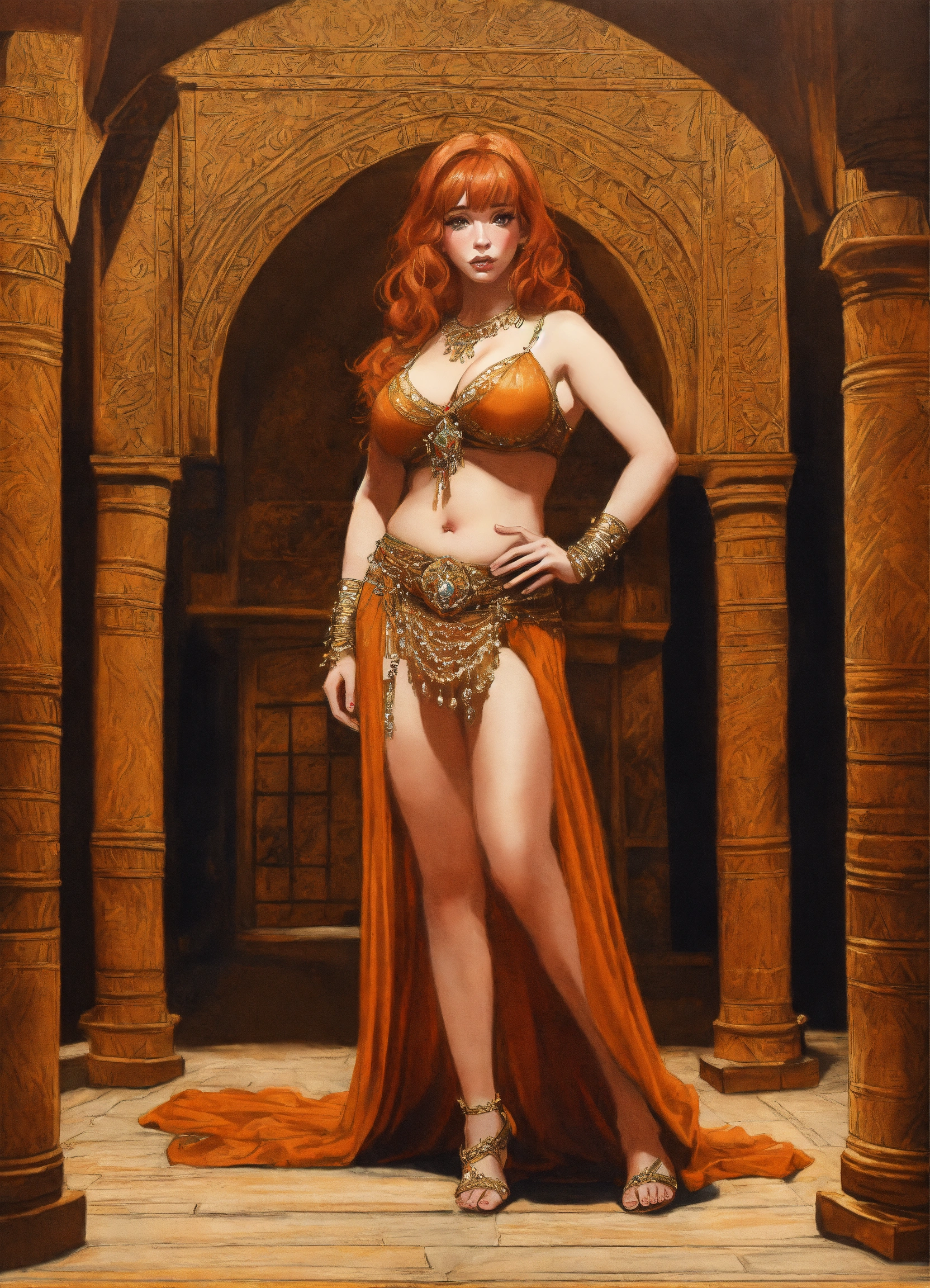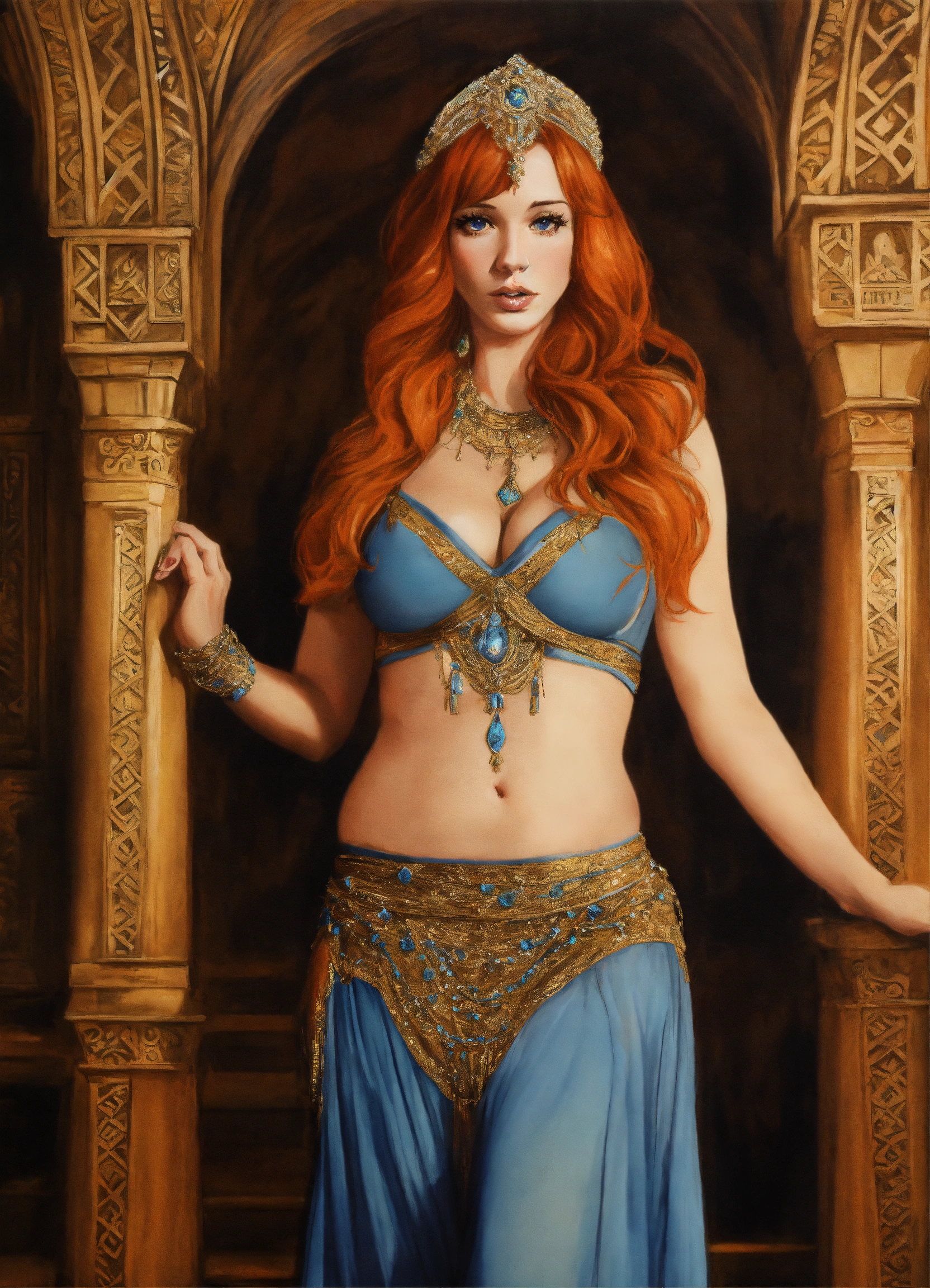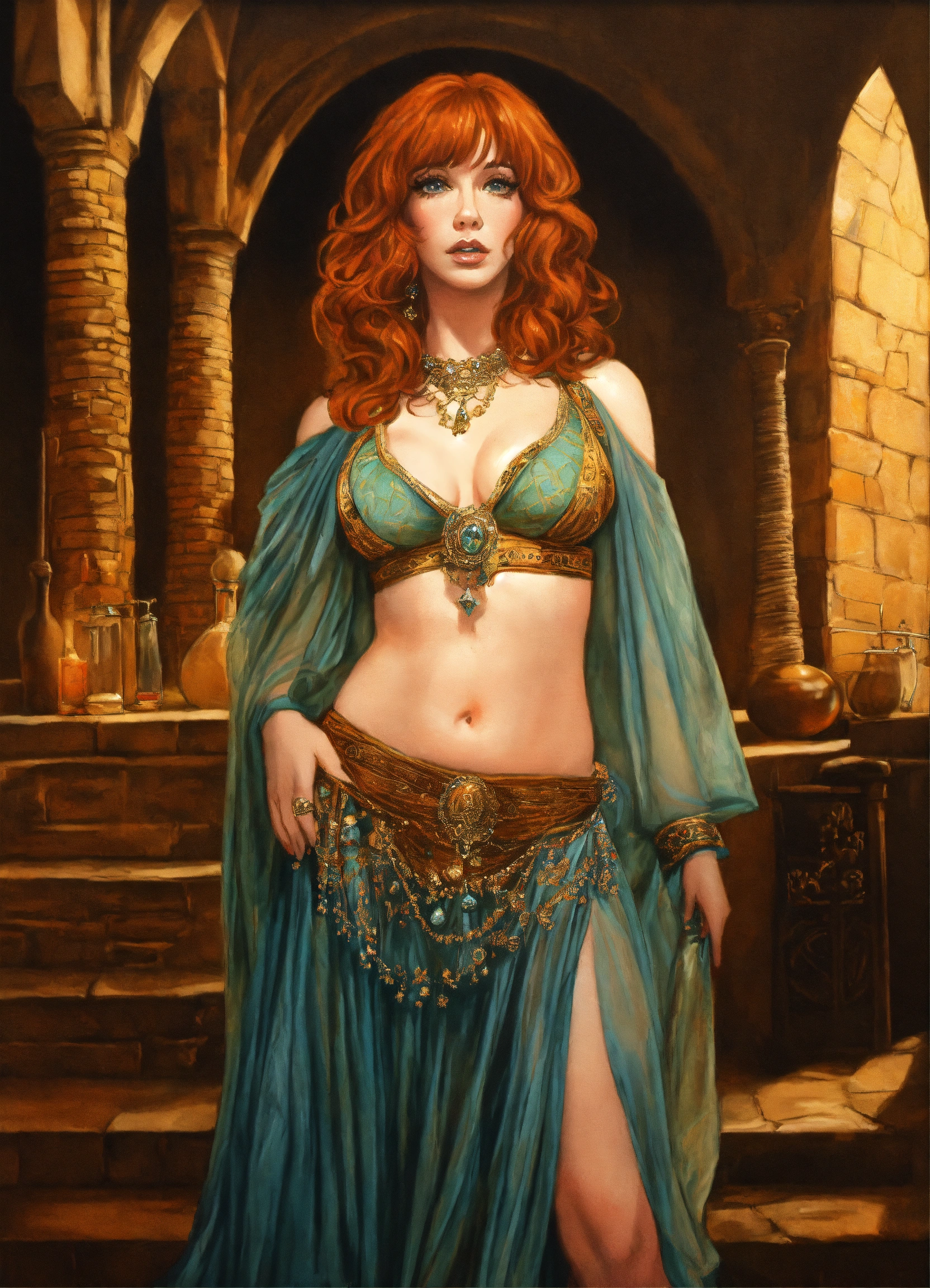 Medieval christina hendricks as belly dancer in dungeon, 1970's, paper drawing of beautiful christina hendricks with minimalist far perspective, transparent, style by larry elmore, barefoot, 8k, highly detailed, ultra-realism, hyperrealism, oil, digital art, medieval