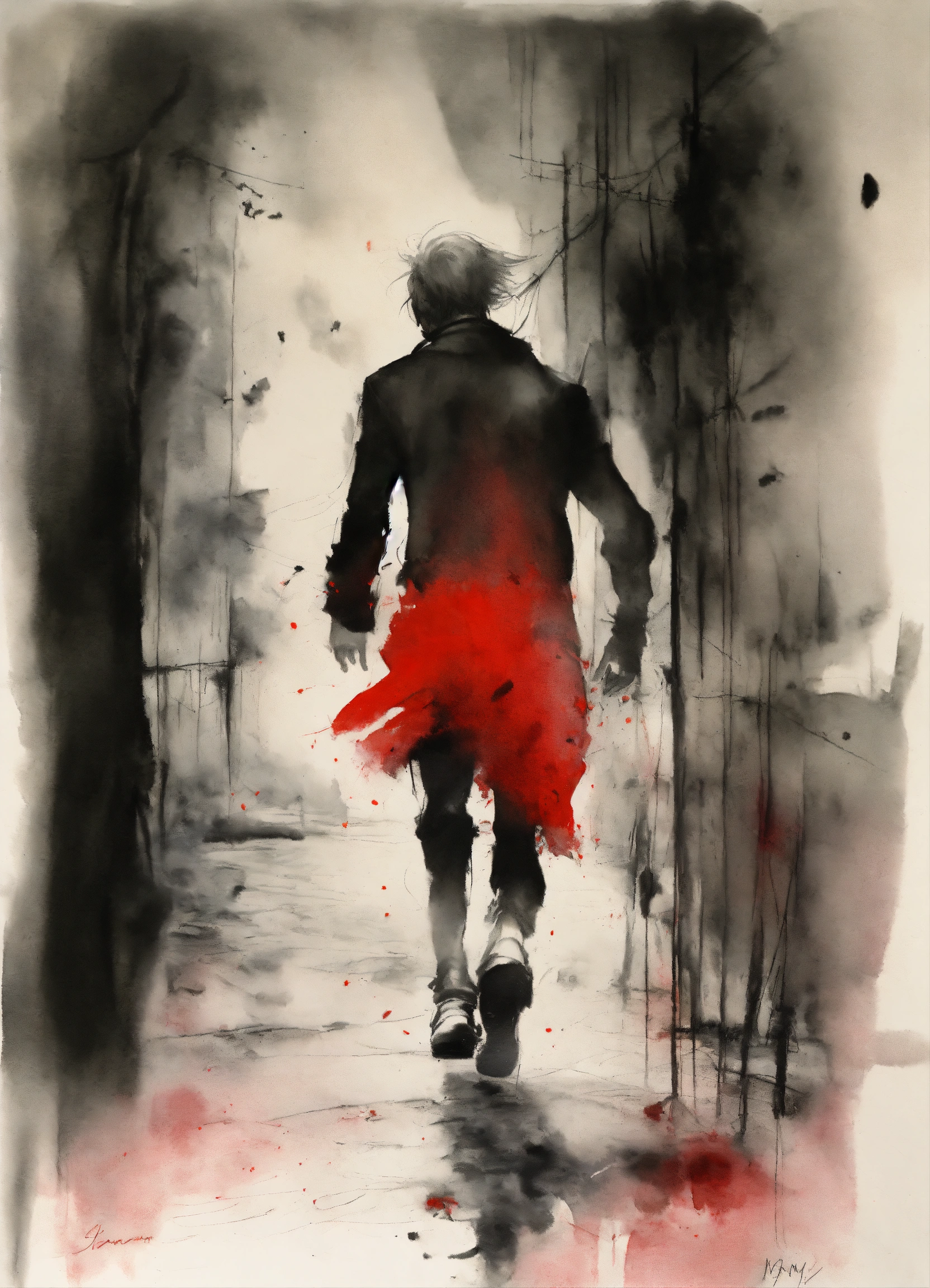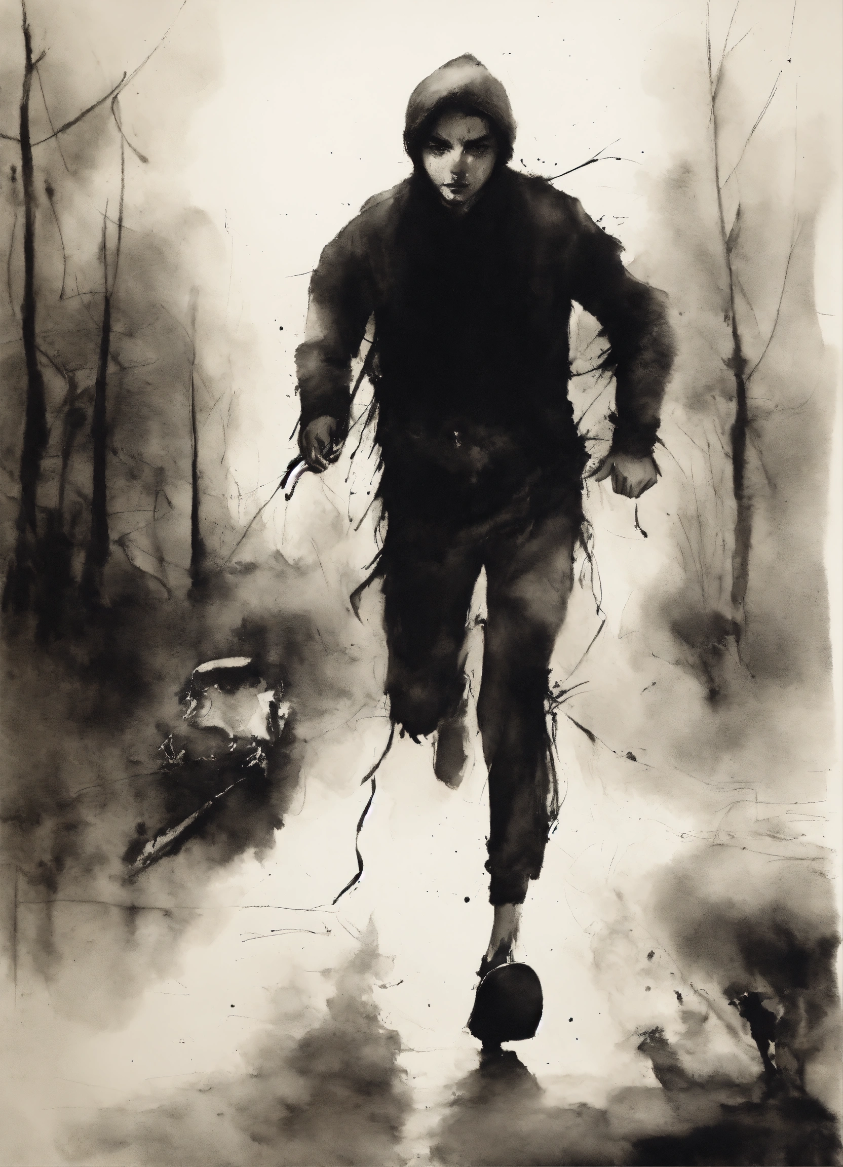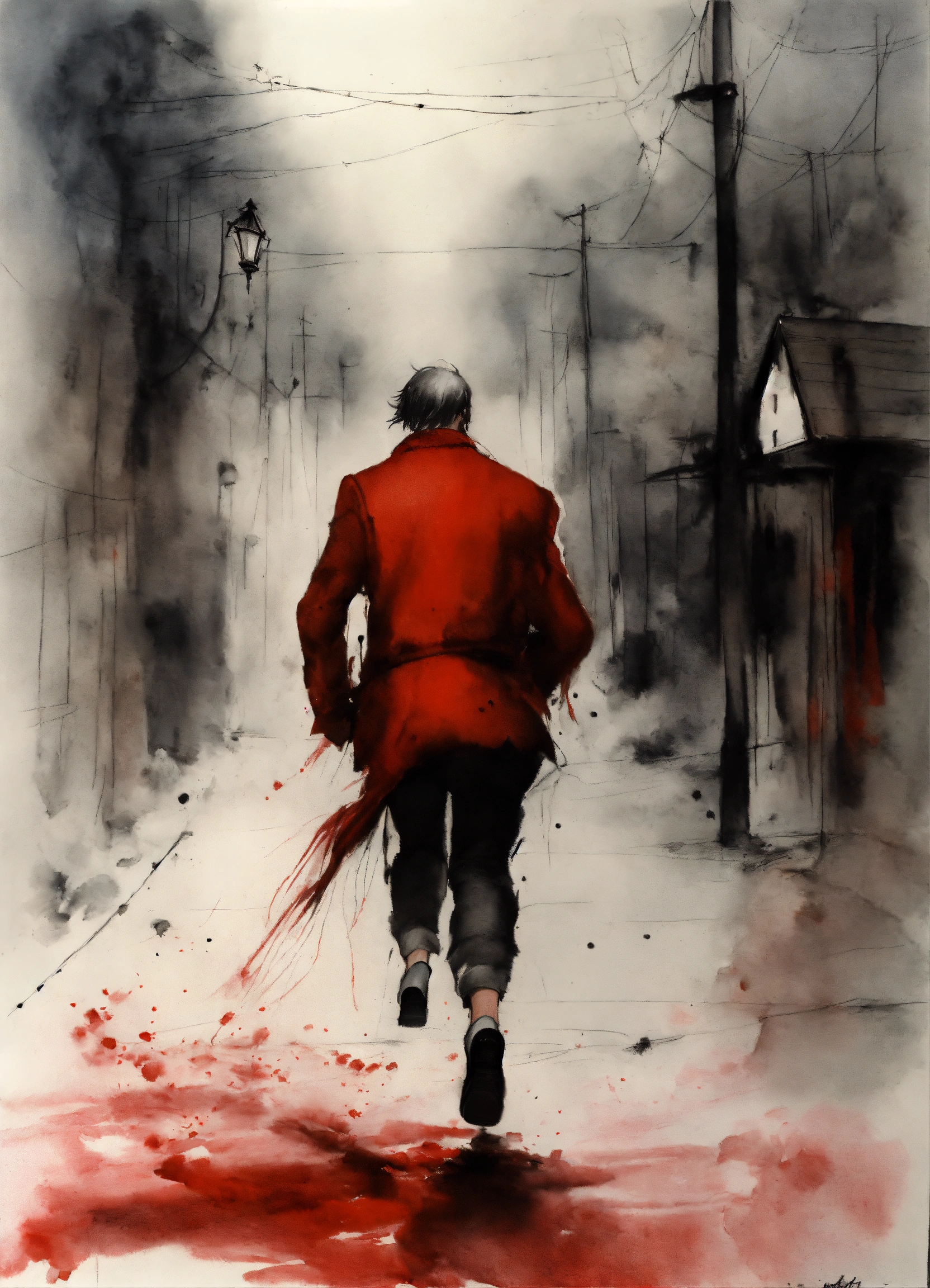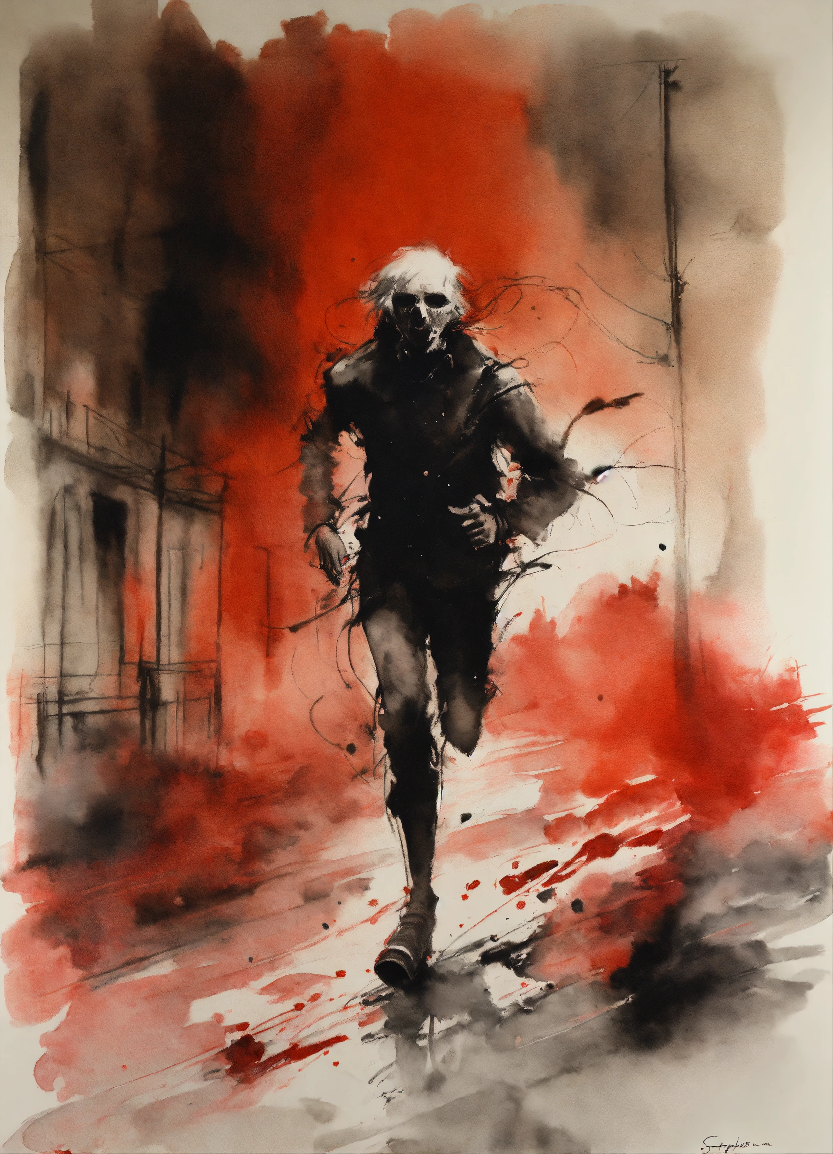 Stephen gammell style, dessin, aquarelle, aquarelles, noir et blanc et rouge, de marais, de sombres créatures, dégoulinant, man running away, a thief