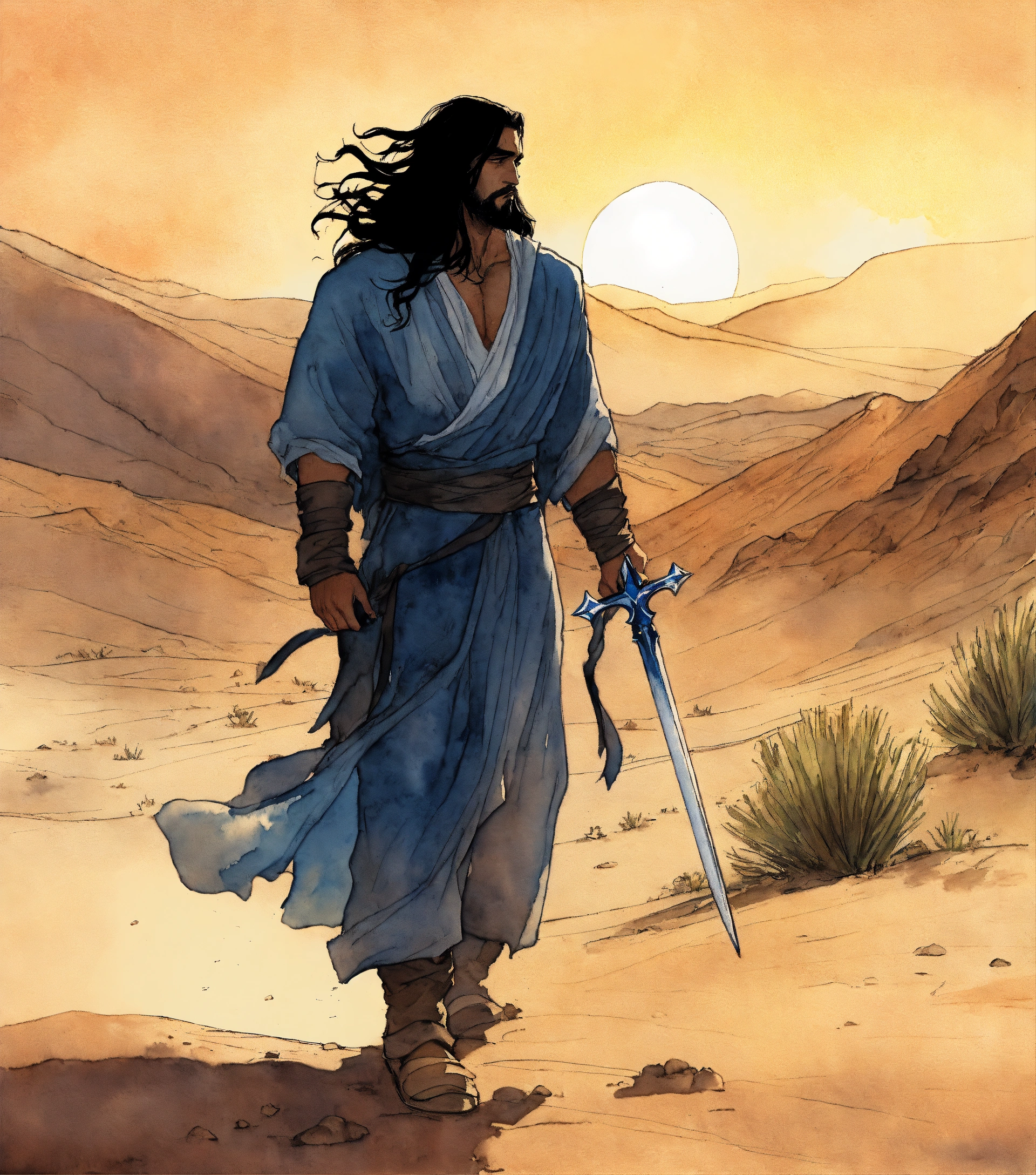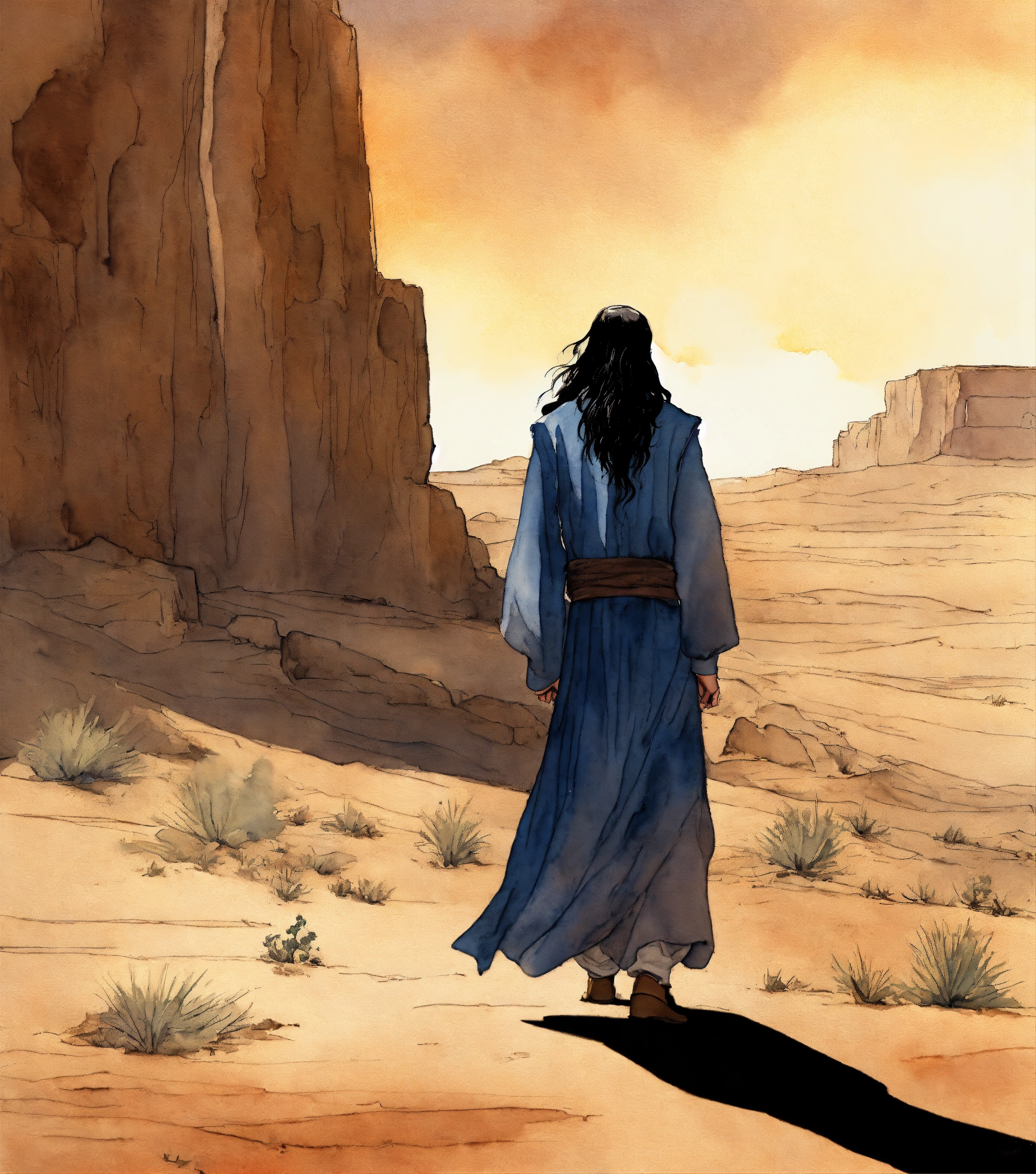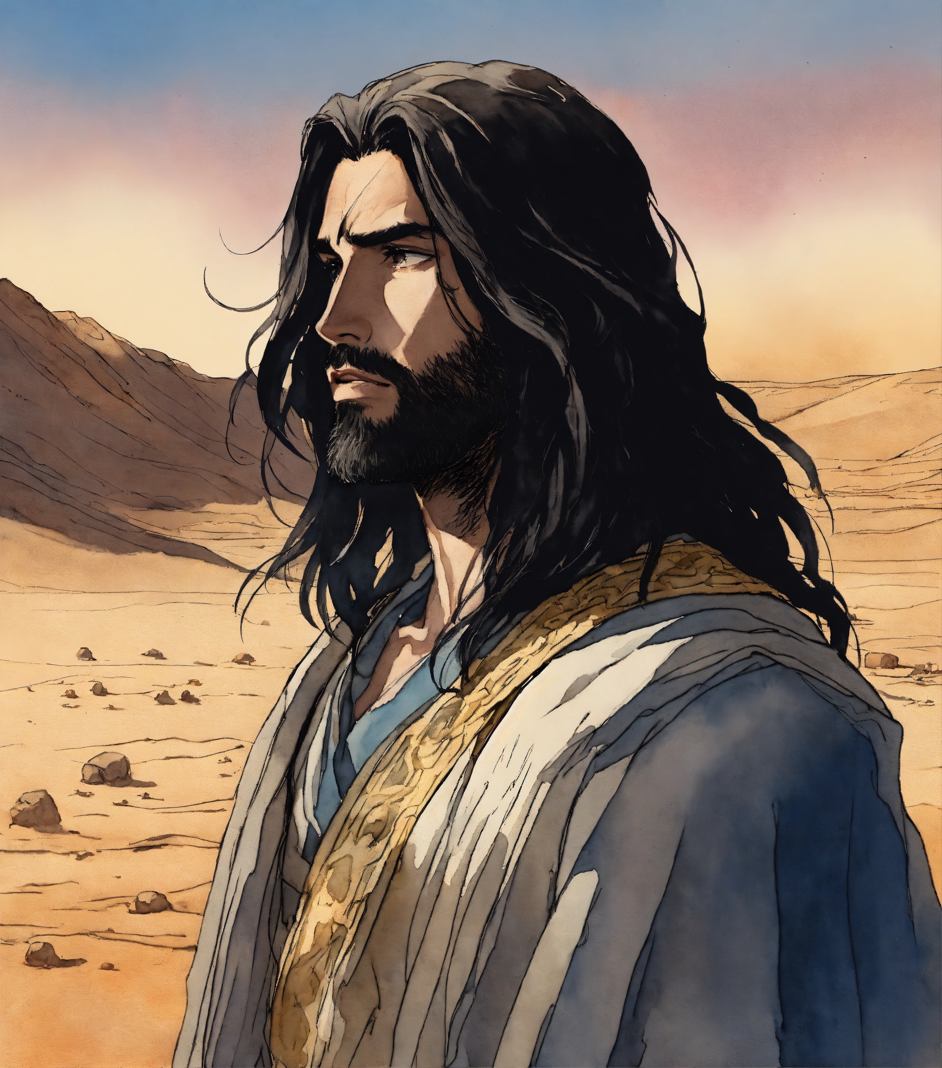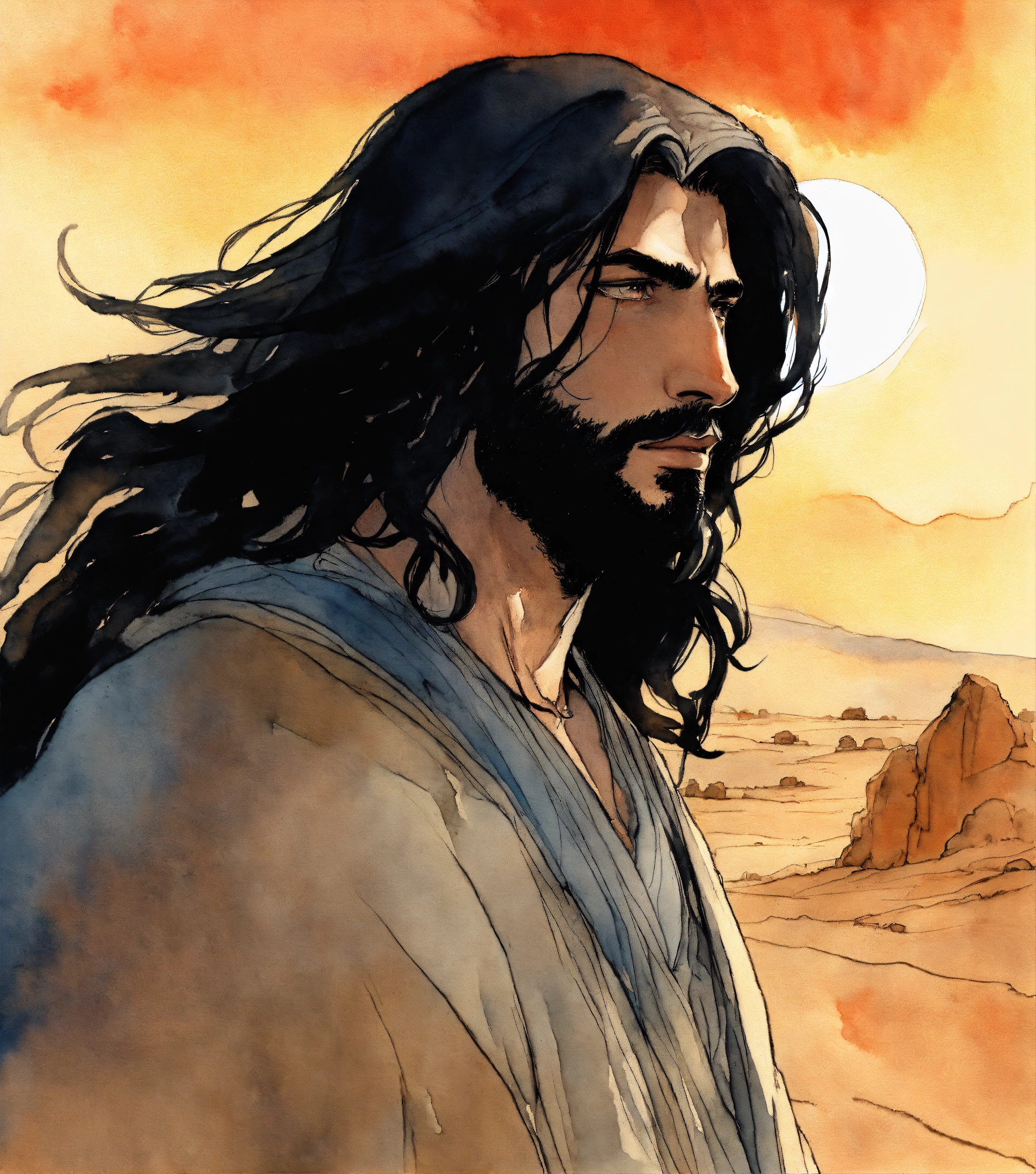 A savior is pictured from the side. long hair, arabic, chosen one, in the desert. he is gentle and kind, but his shadow is monstrous and terrifying, in stark contrast to the messiah's serenity. artistic watercolor comic book.