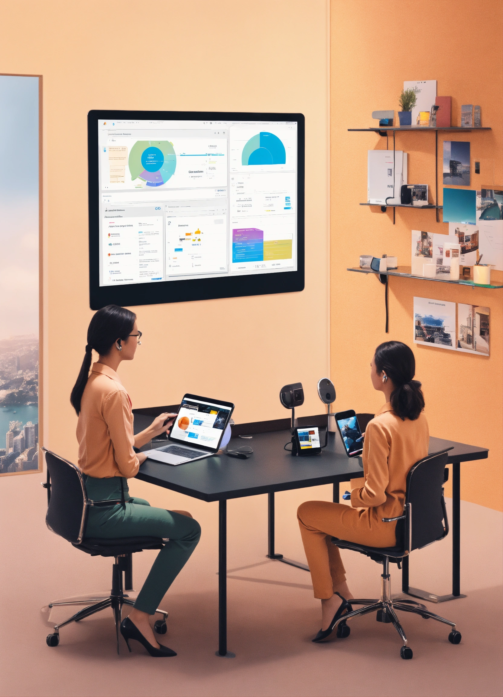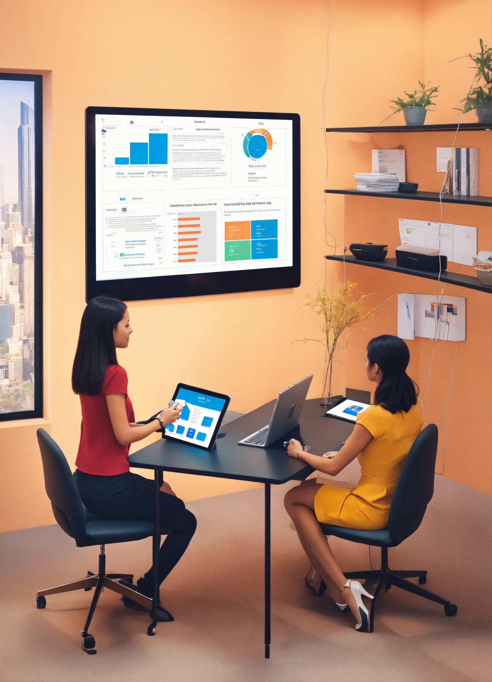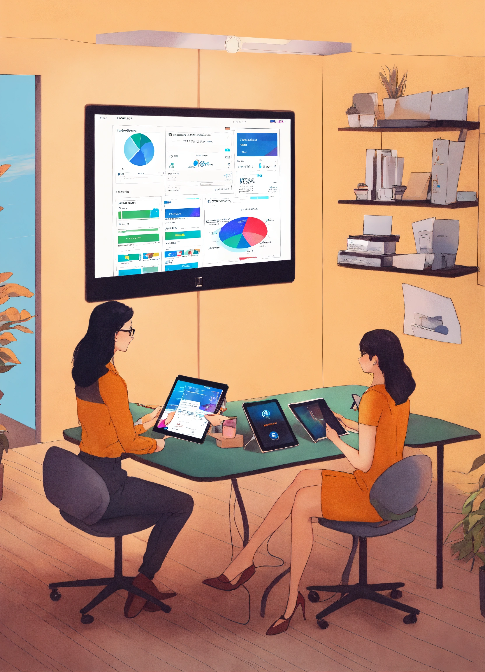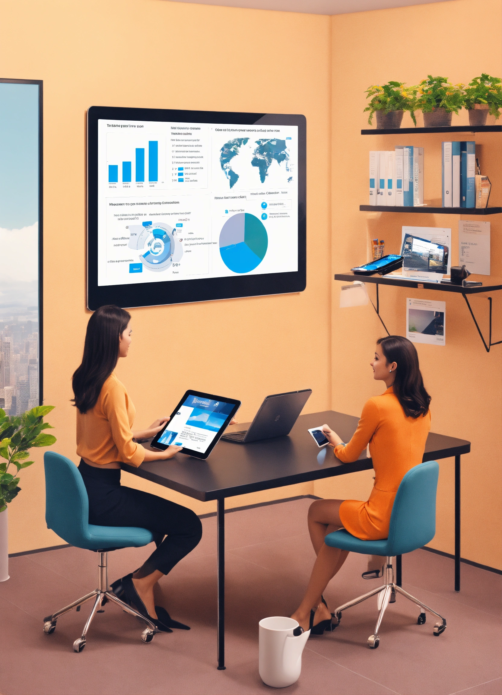 Create an office where two person serves, where there is a cell phone a tablet demonstrating visuals, big screen