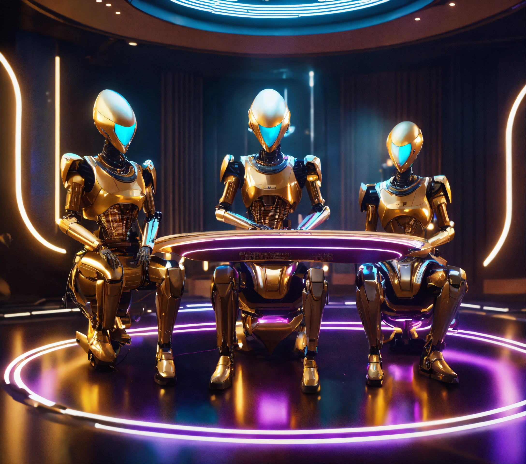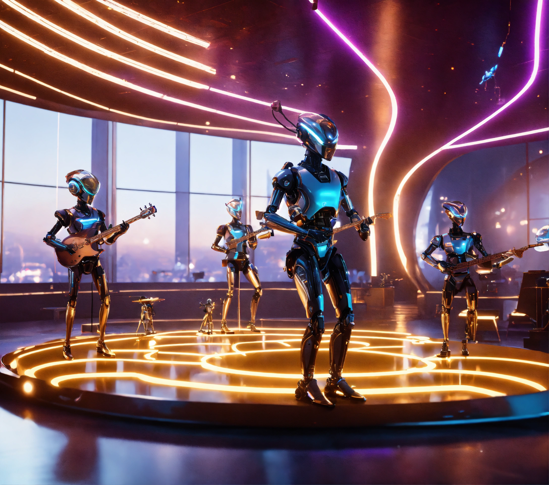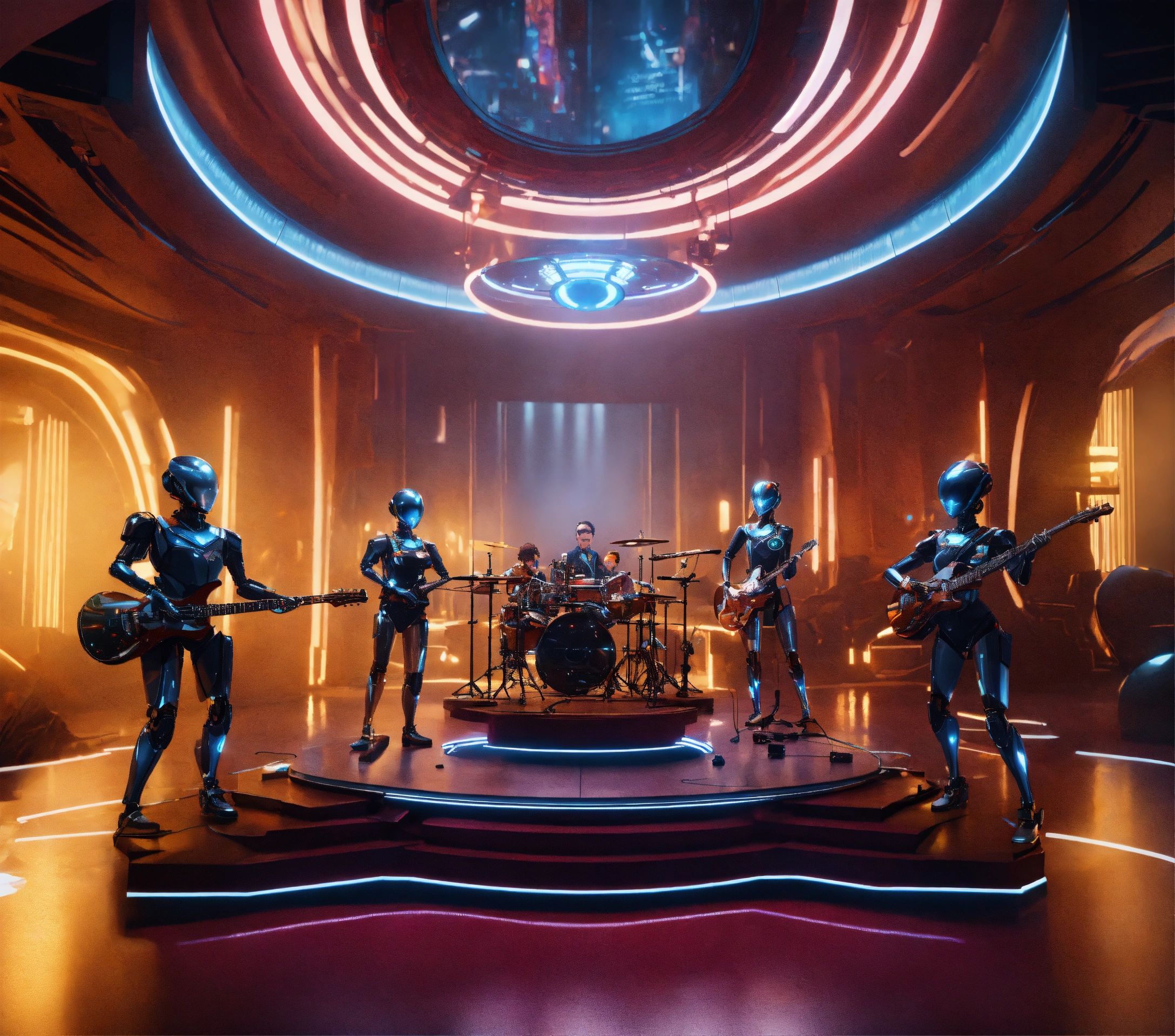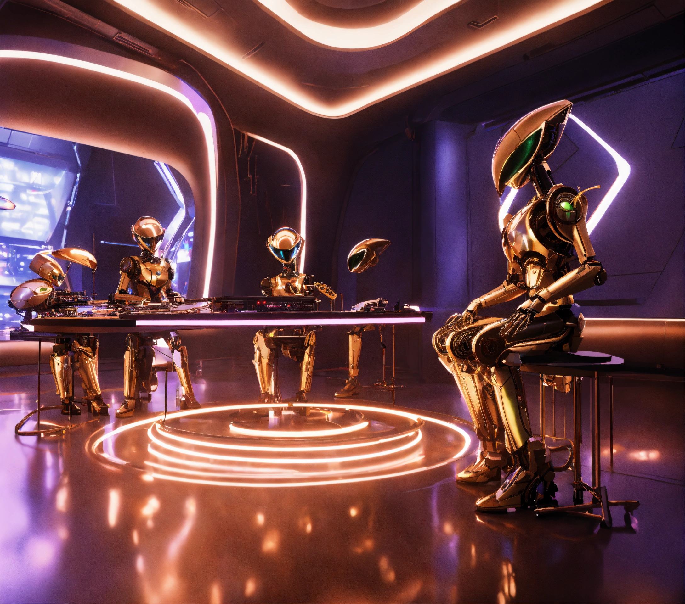 Band of 4 robot musicians with alien electric instruments playing hypnotic music on stage in a luxurious space port reception area, realistic, futuristic, sci-fi, 8k, unreal engine, pixar, disney, zaha hadid