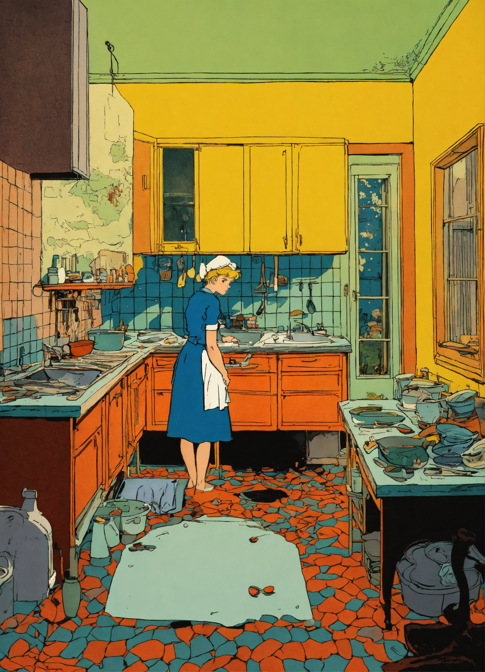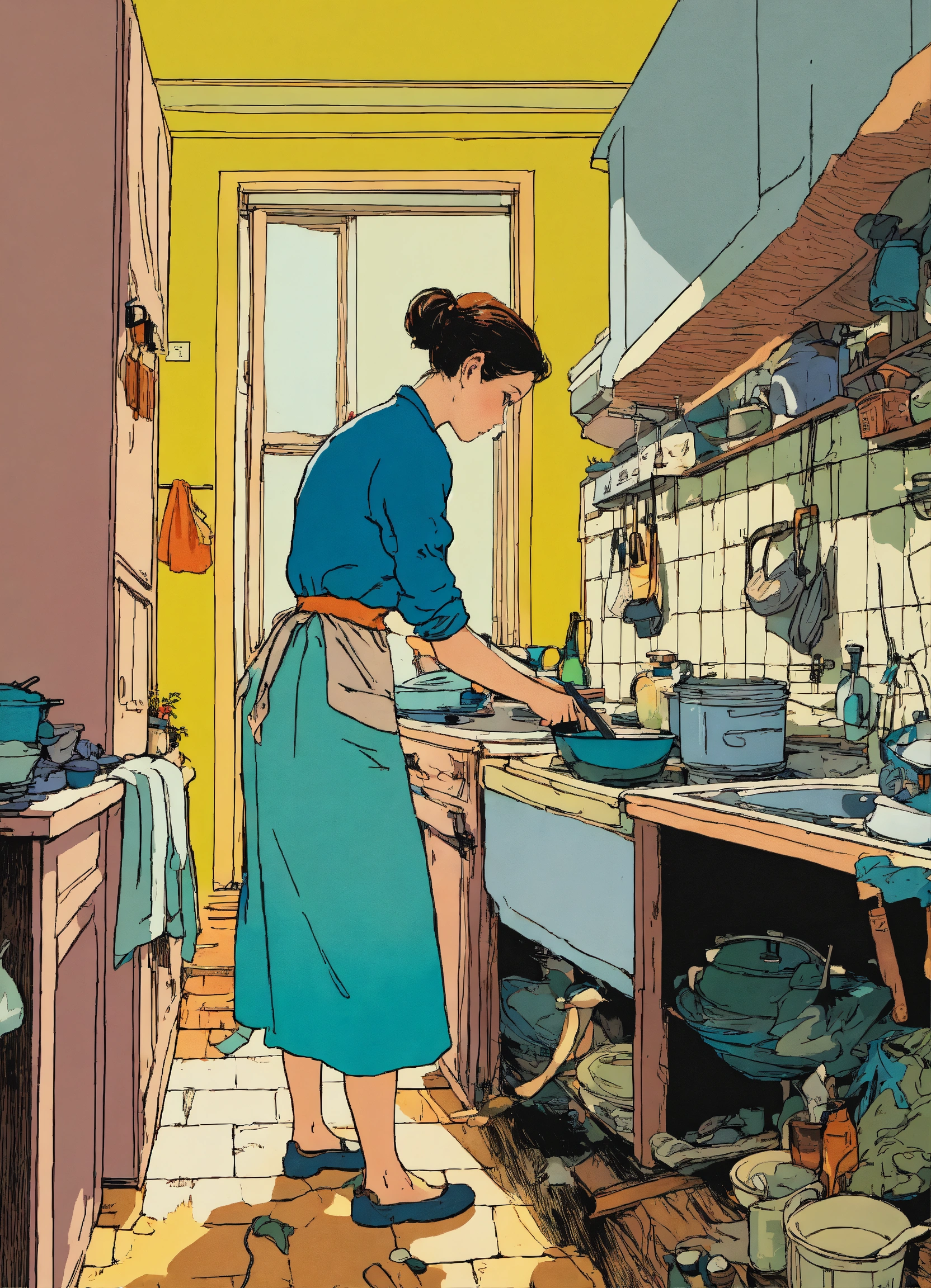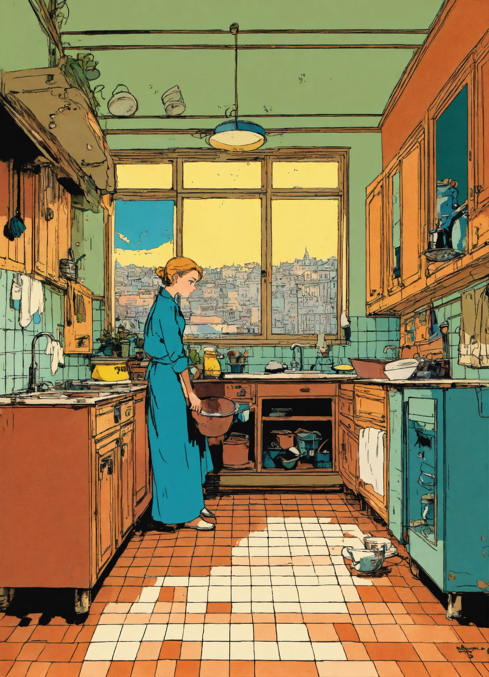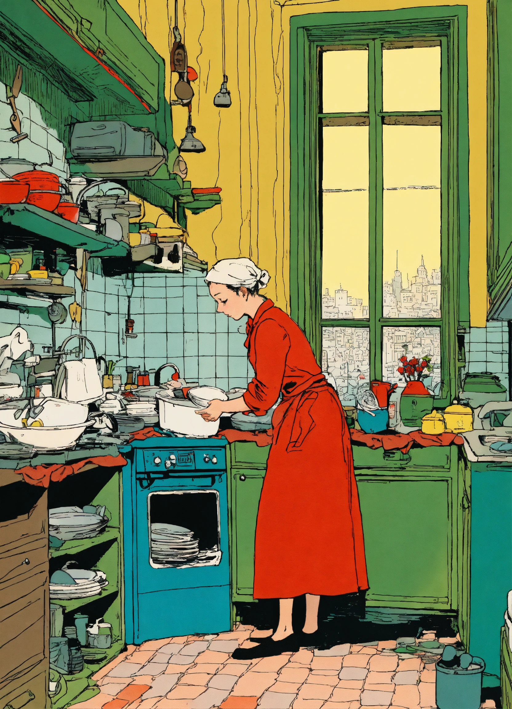 Beautiful illustration by hergé of a lonely woman washing dishes inside her cramped and messy apartment kitchen. sadness, stunning color scheme, masterpiece