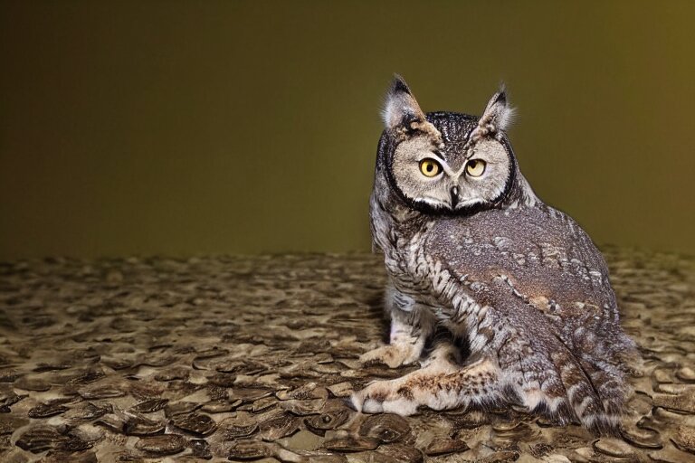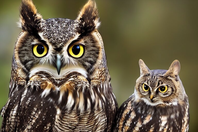 An owl cat!!! hybrid! hyper realistic!! realistic lighting!! wildlife photographer of the year!!! bold natural colors, national geographic, hd, wide angle, 8 k