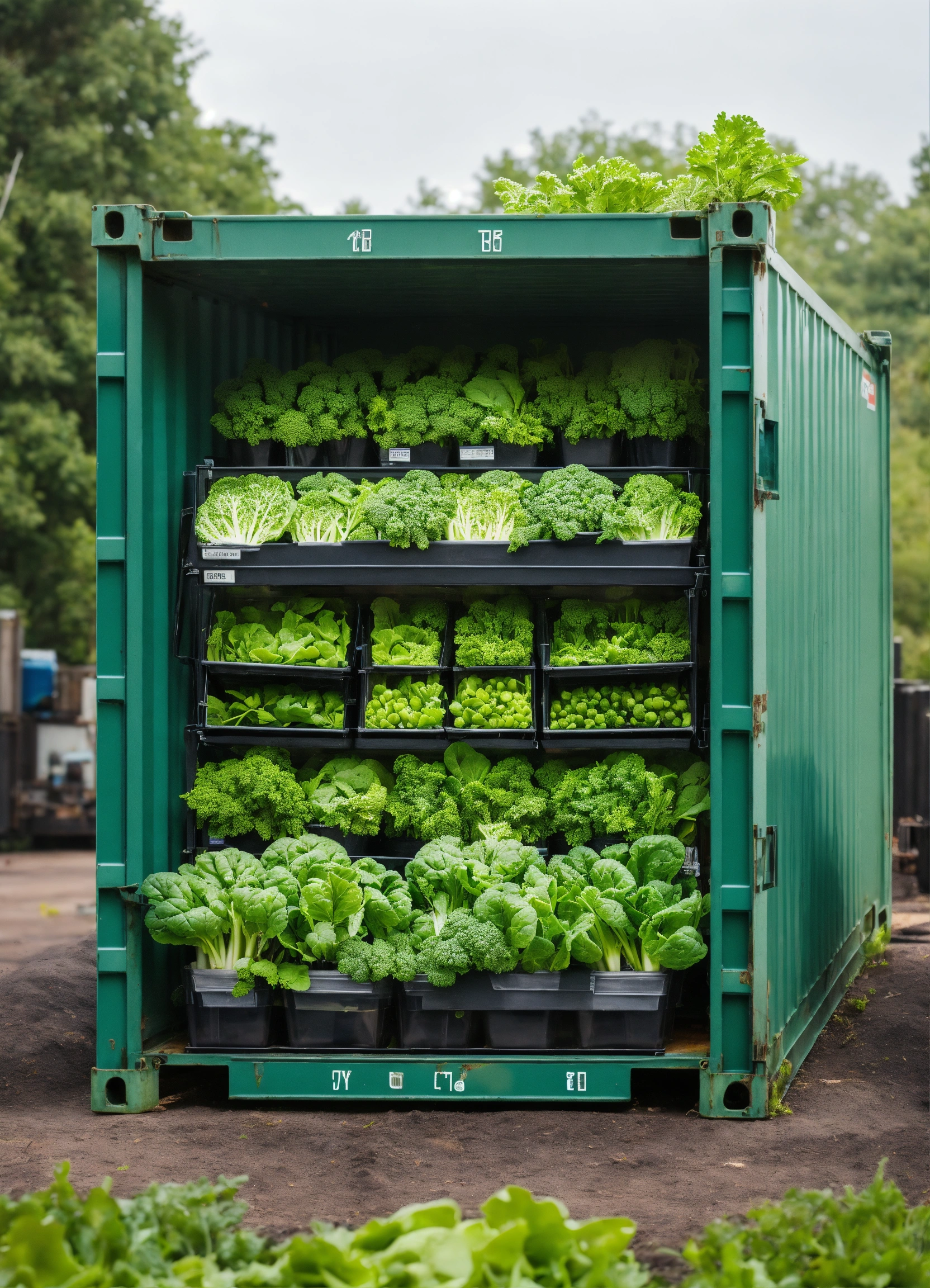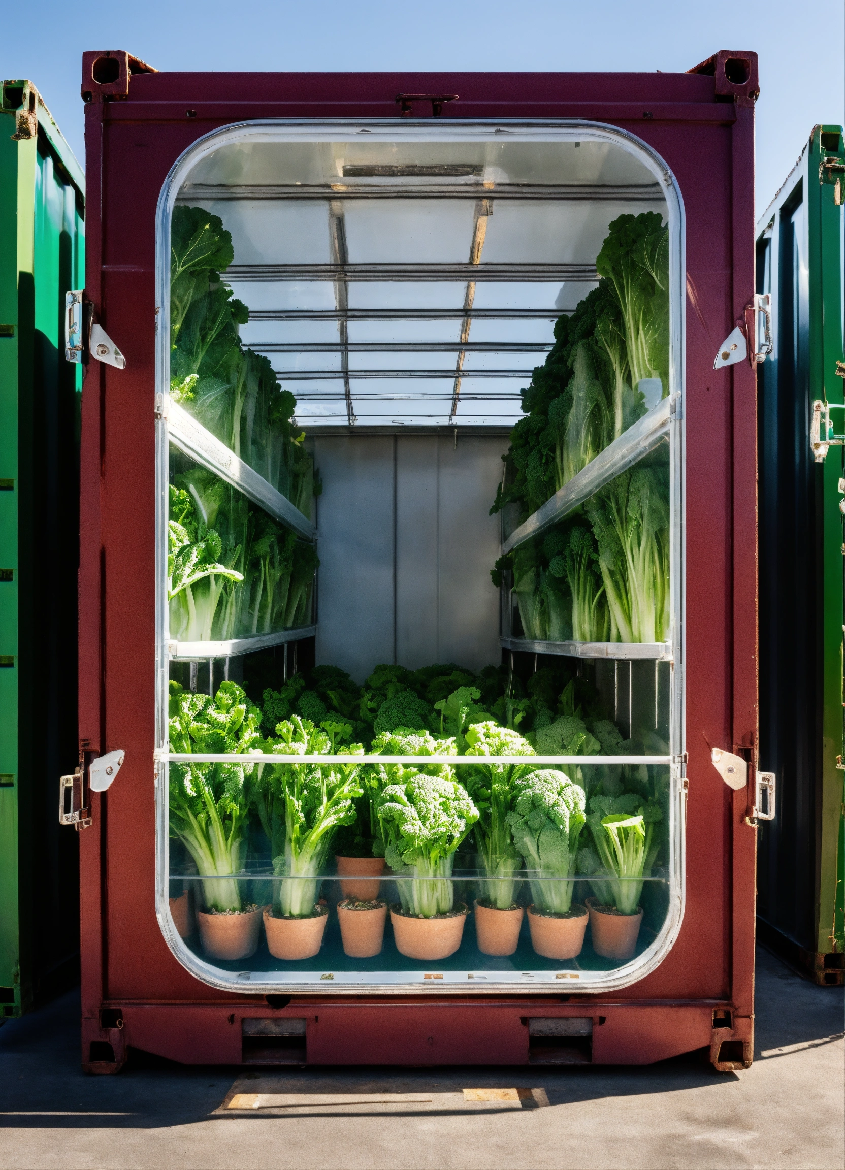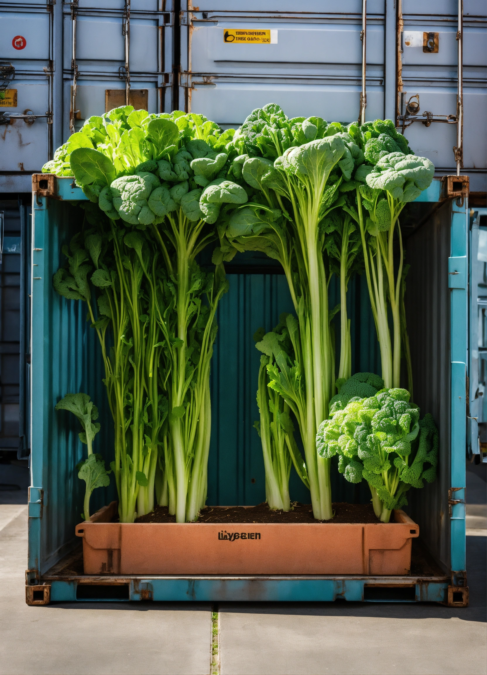 Glass shipping container with and green vegetables growing out of the top