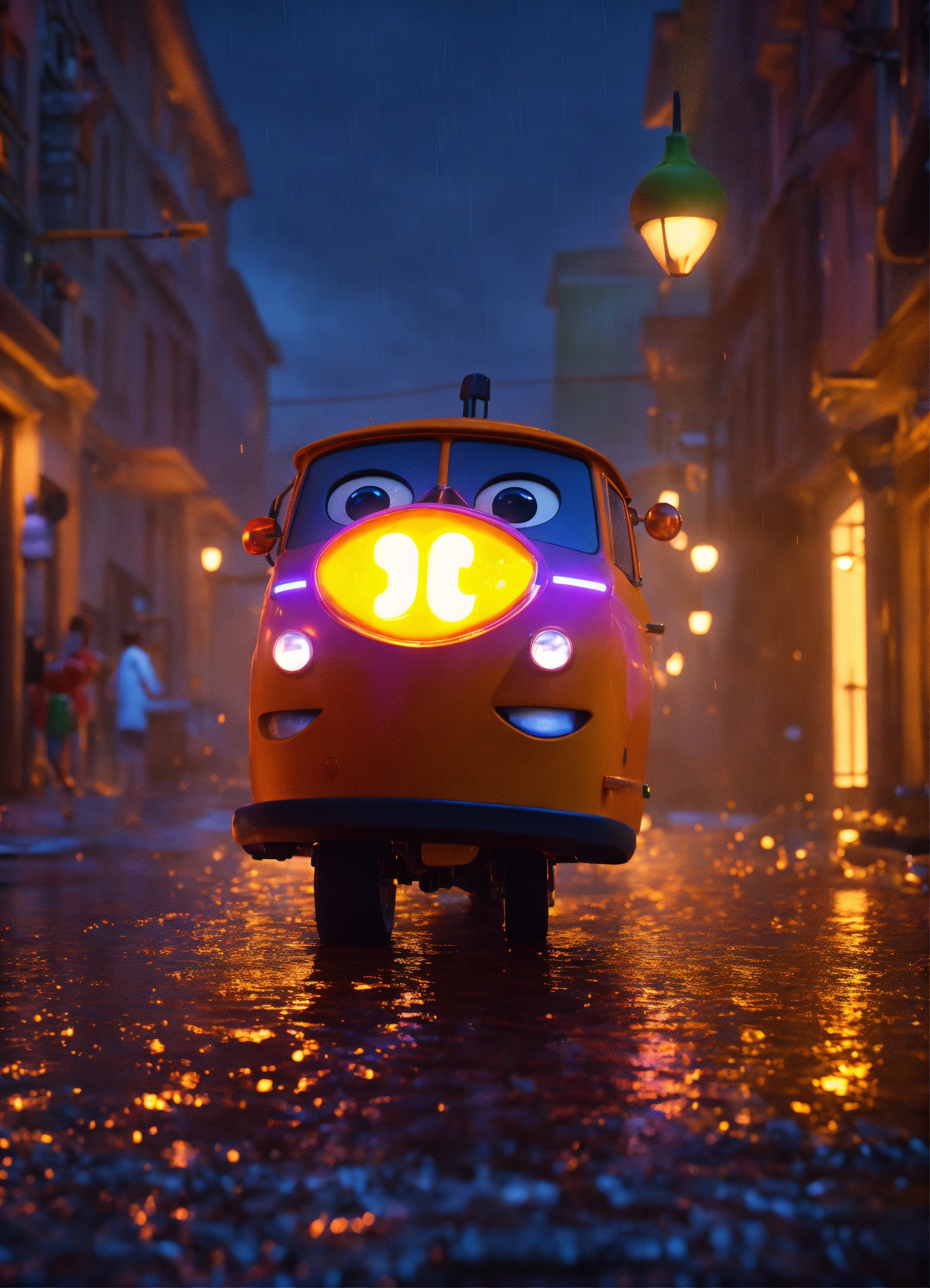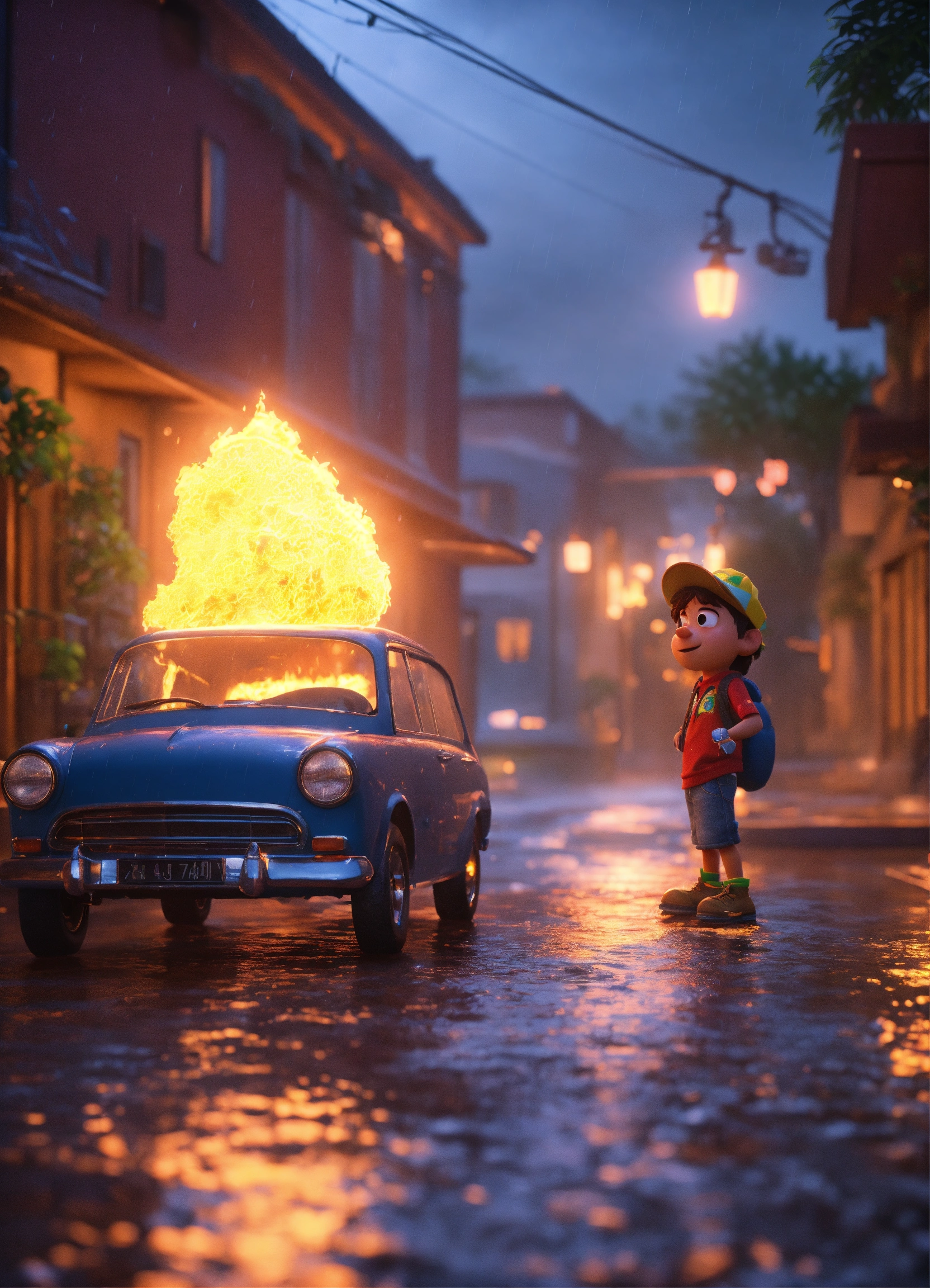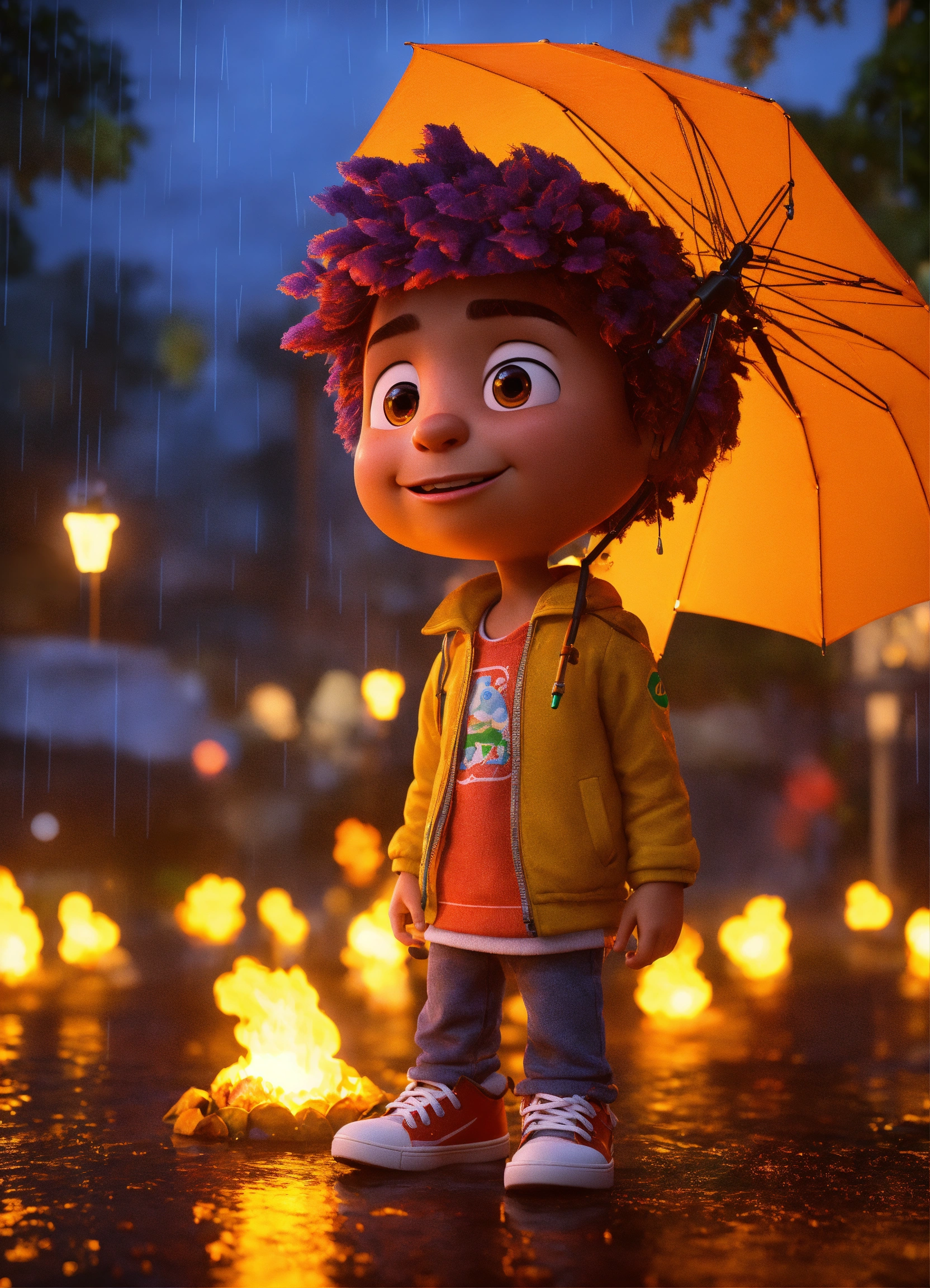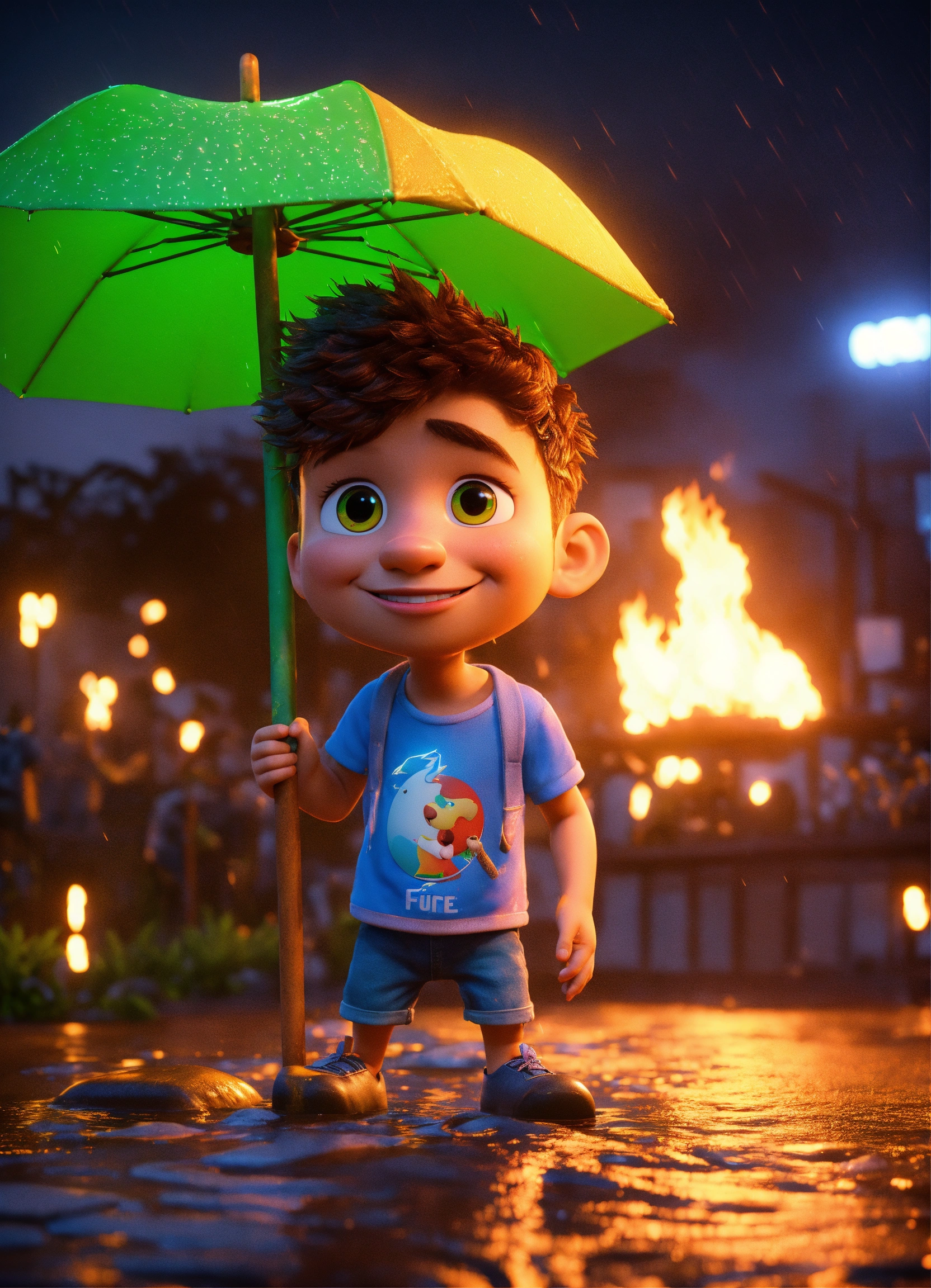 Mc kevin by pixar, 3d, blender, unreal engine, ultra realistic, brazillian, lightning studio, glow, rain, fire, night, brazillian funk