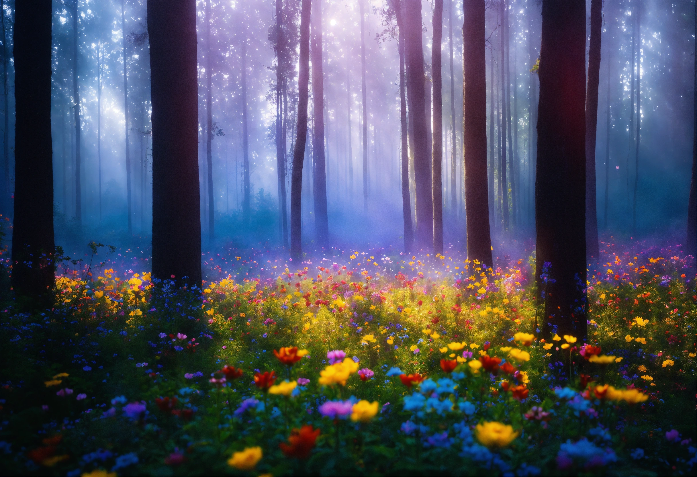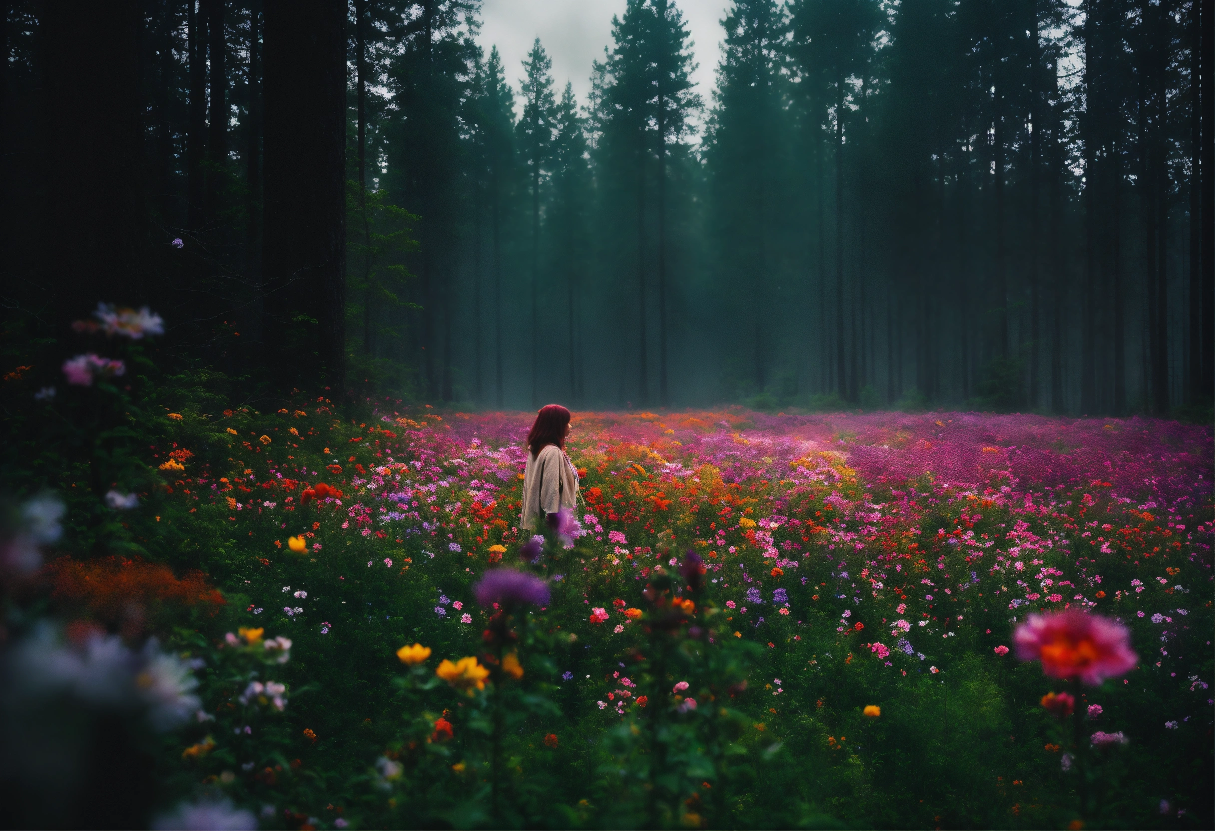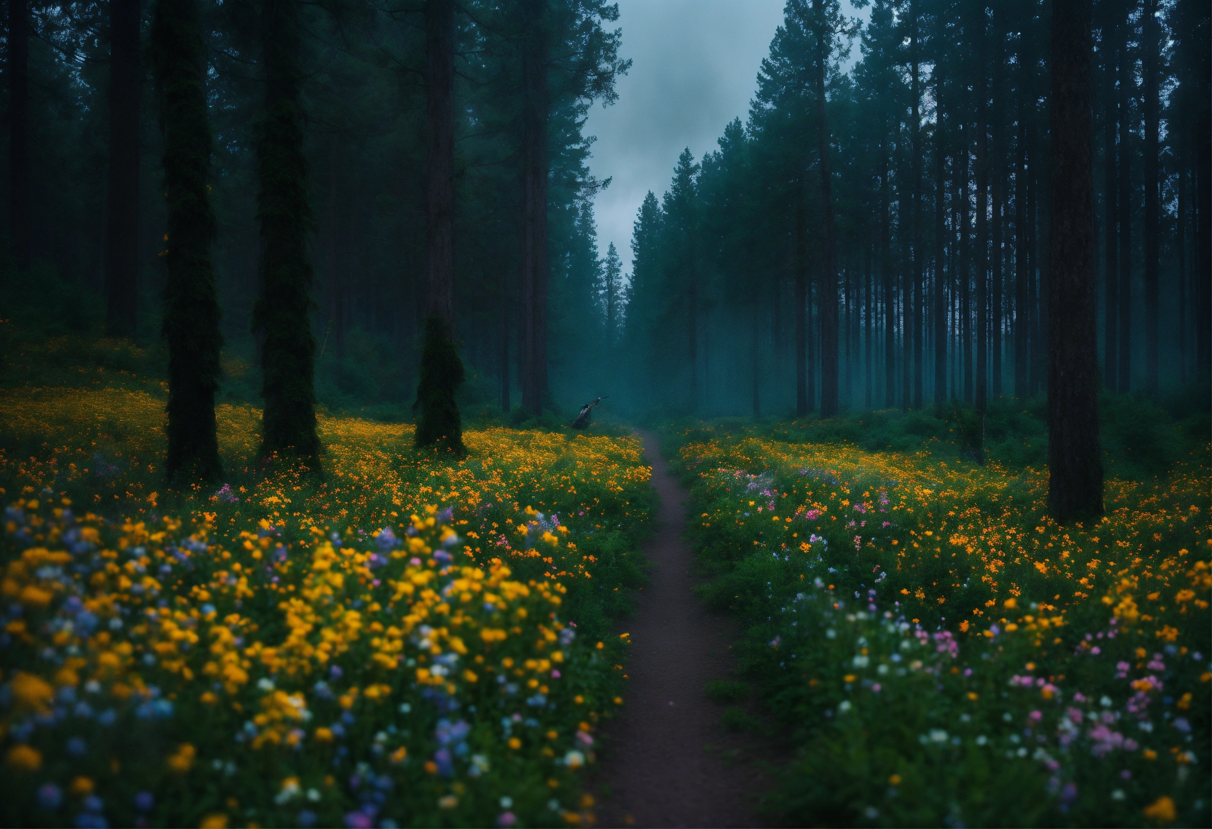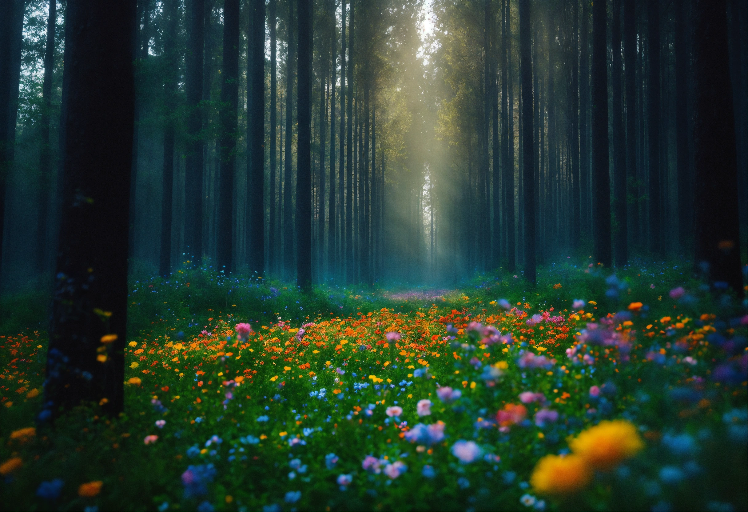 A photo where have the photo is in a field of flowers and then immediately begins a dense dark forest, mystical, pixar