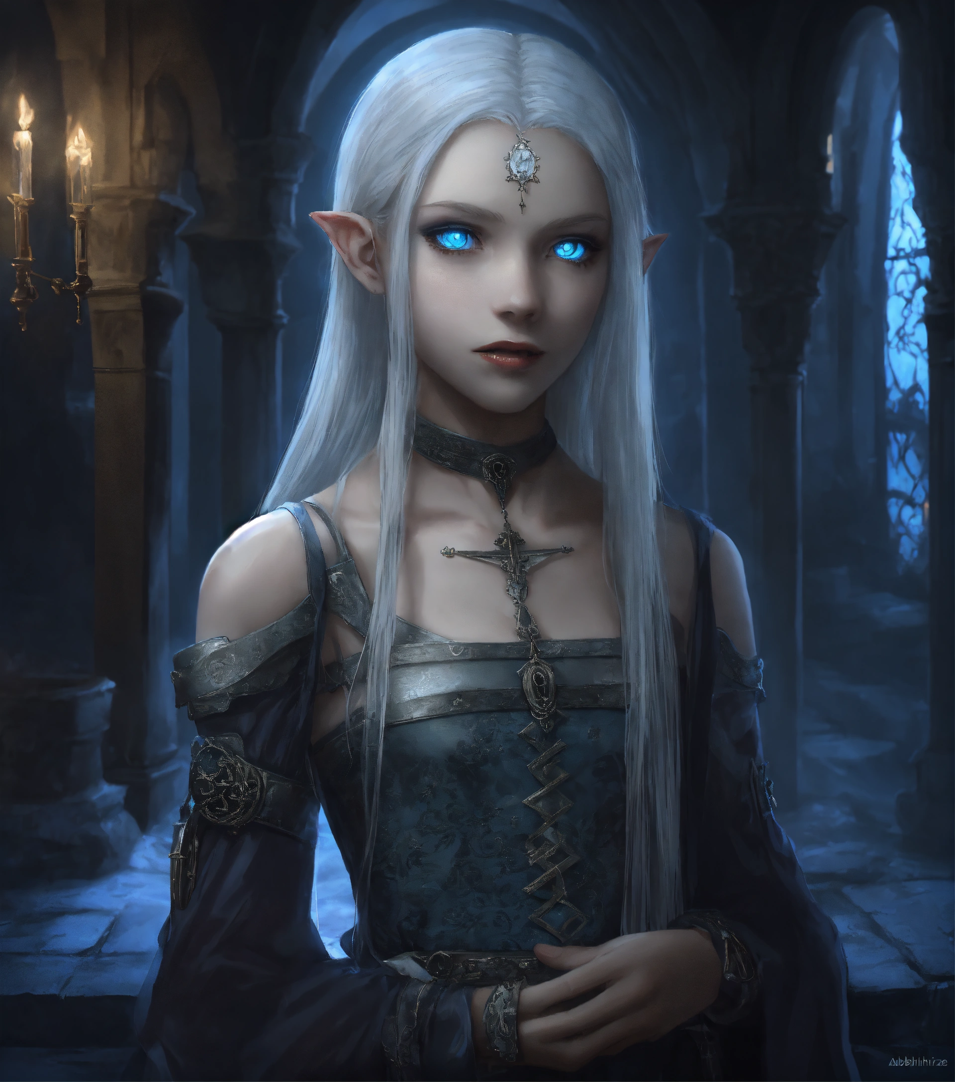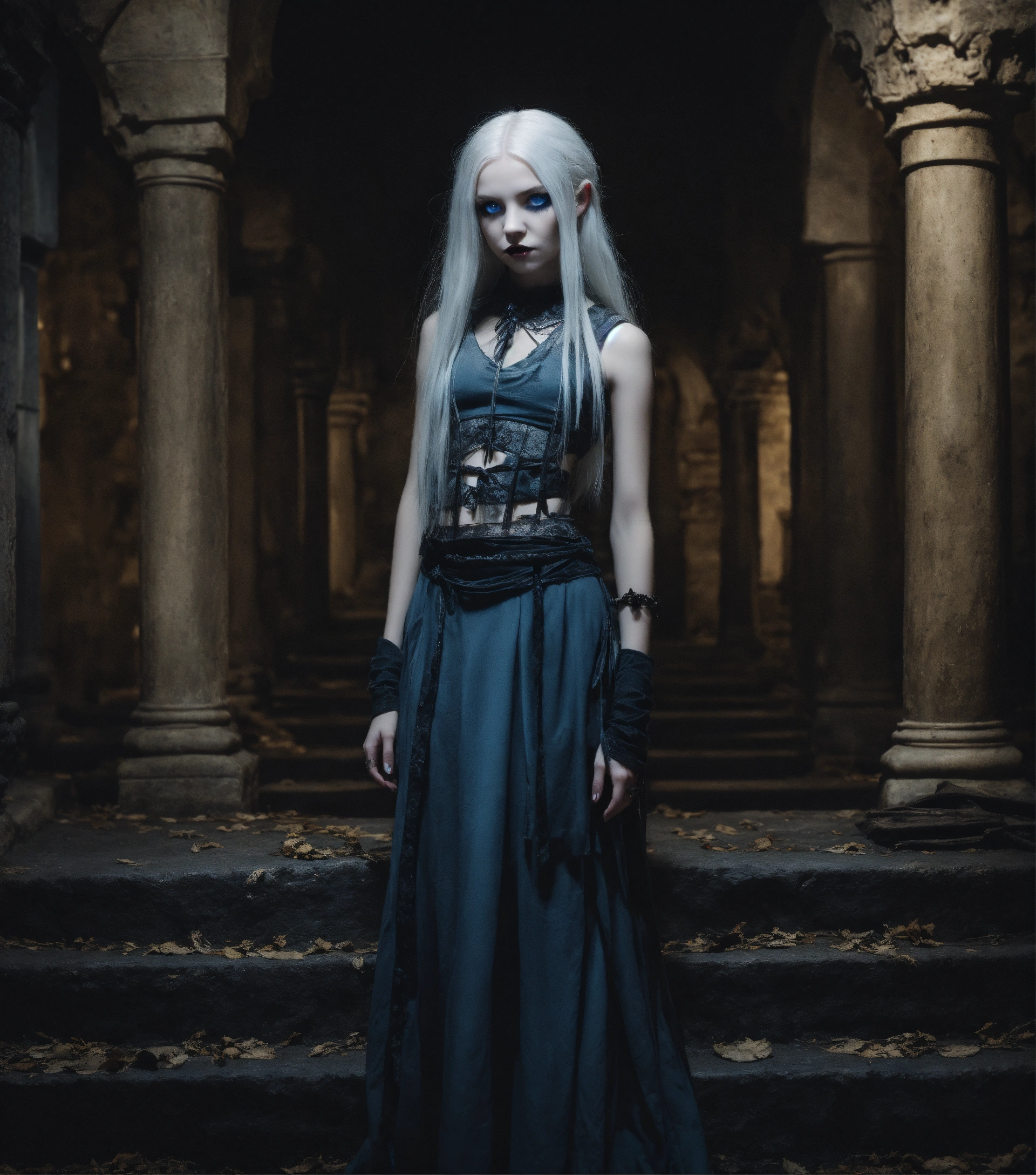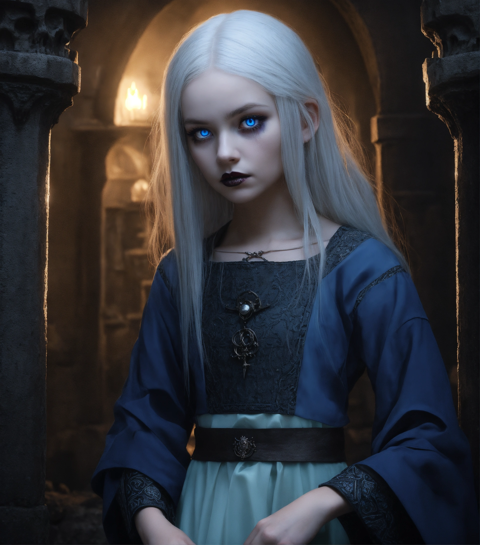 Sehr kindhafte deadly pale twelve year old female goth necromancer child with waist long silverwhite hair and a aufreizendes cropped top mit tiefem ausschnitt and a low-waisted high slit skirt, very flat belly, extremely skinny, extremely slim and emaciated body, very narrow face, alabaster skin, pale as a corpse, glowing blue eyes, slim face, innocent looking, in a gloomy crypt, kindlich, unschuldig, childlike, juvenile, graceful, wispy, glowing blue eyes, ghostly, dead, evil, demonic, undead, darkness, grotesque, mysterious, dark, dark, cold ambient lighting, extremely detailed, fantasy, medieval setting