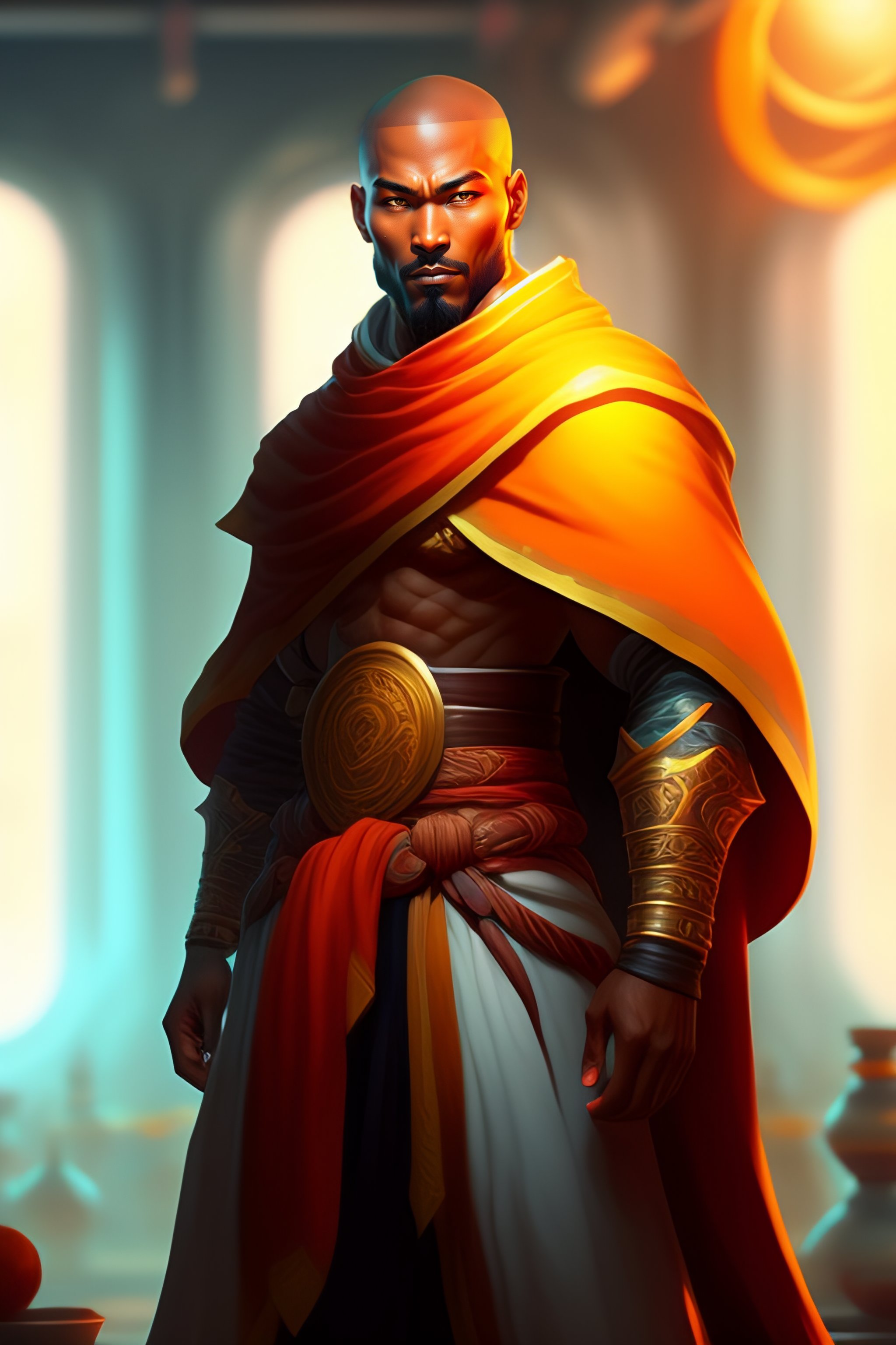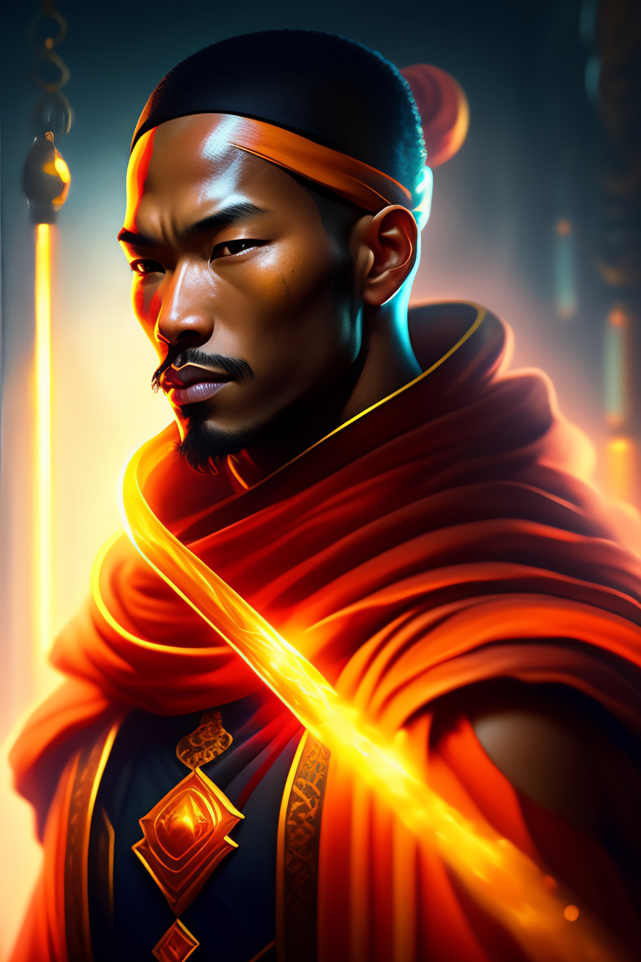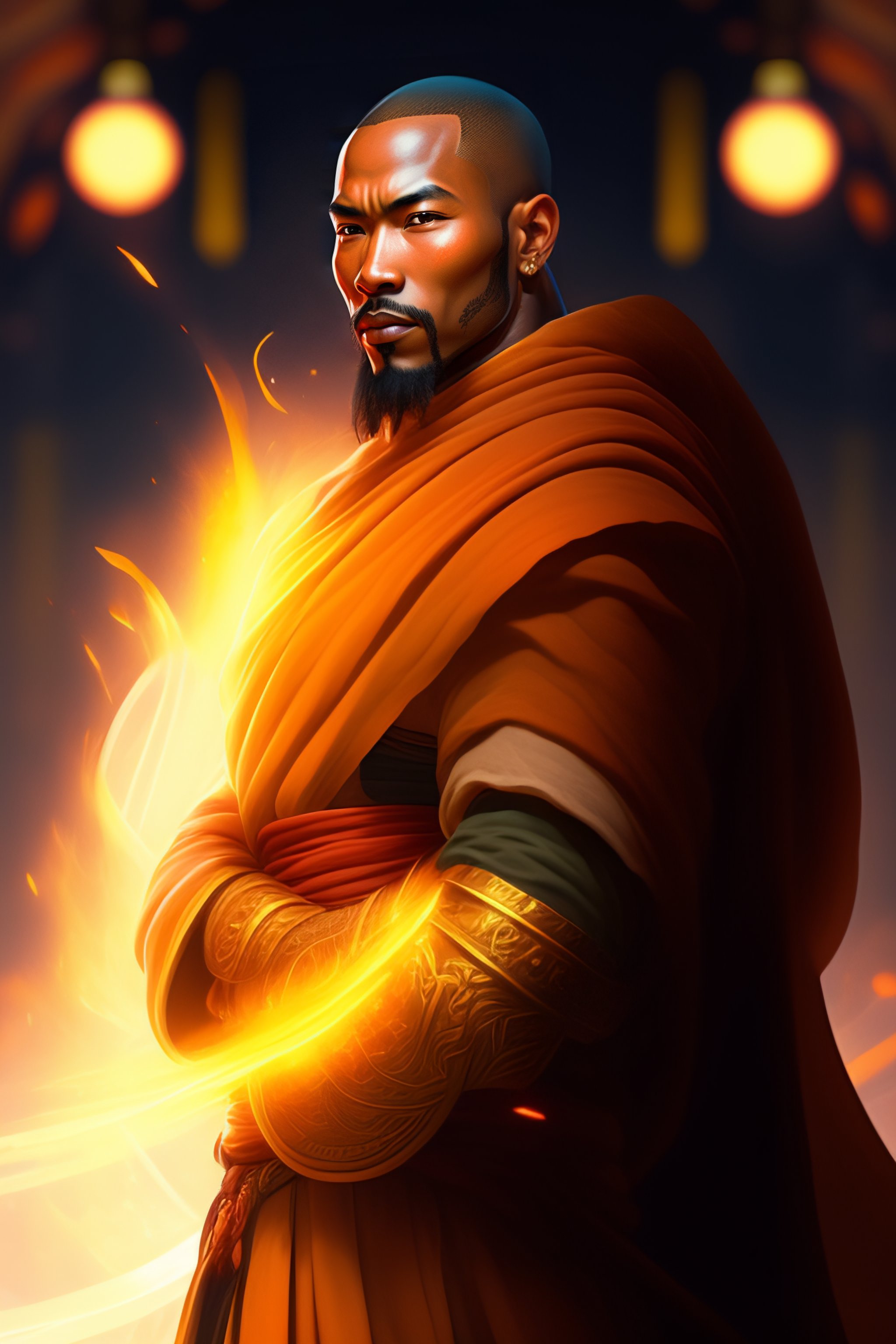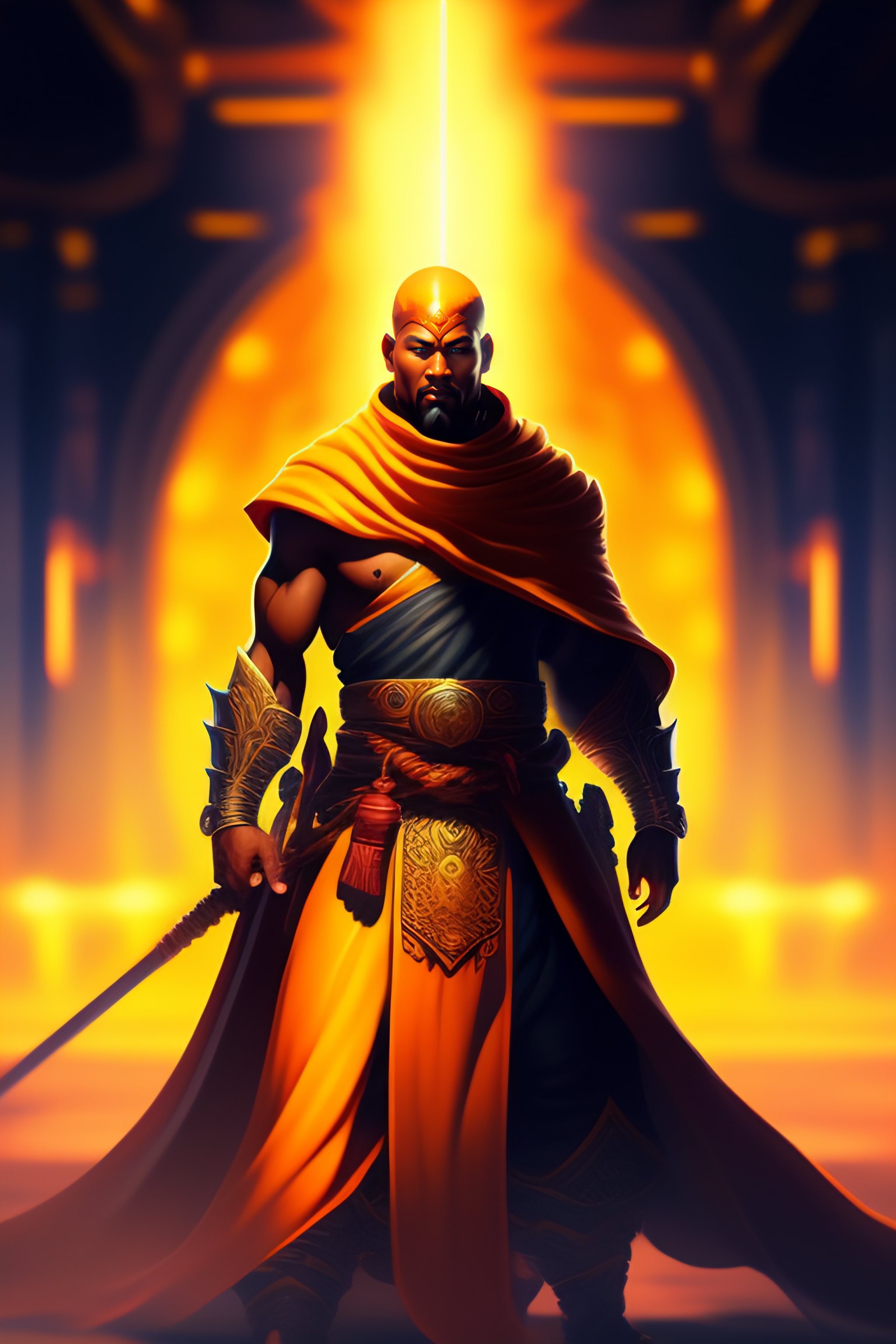 Warrior monk, exciting pose, inside a labratory, radiating a glowing aura, stylized, digital illustration, video game icon, artstation