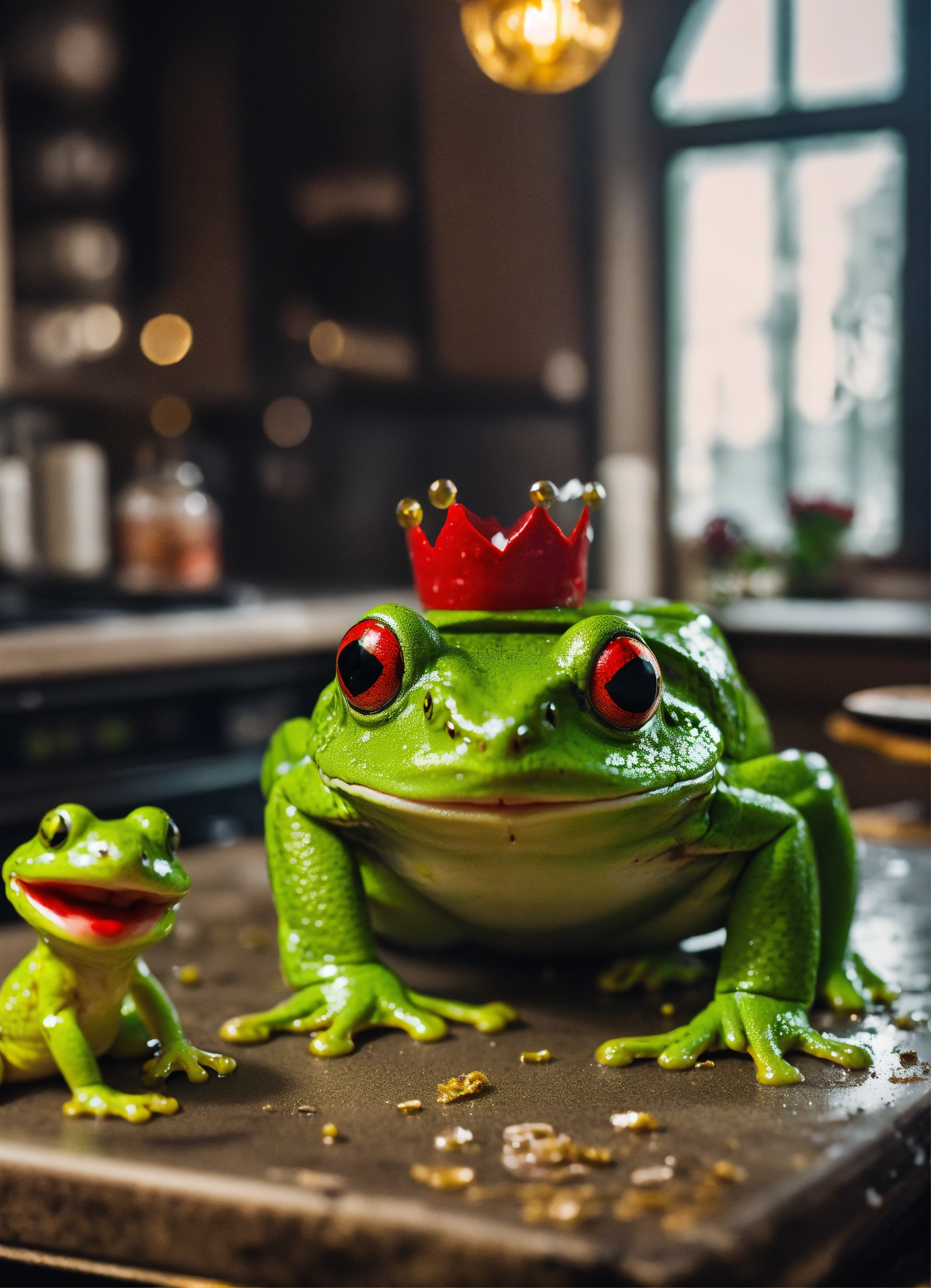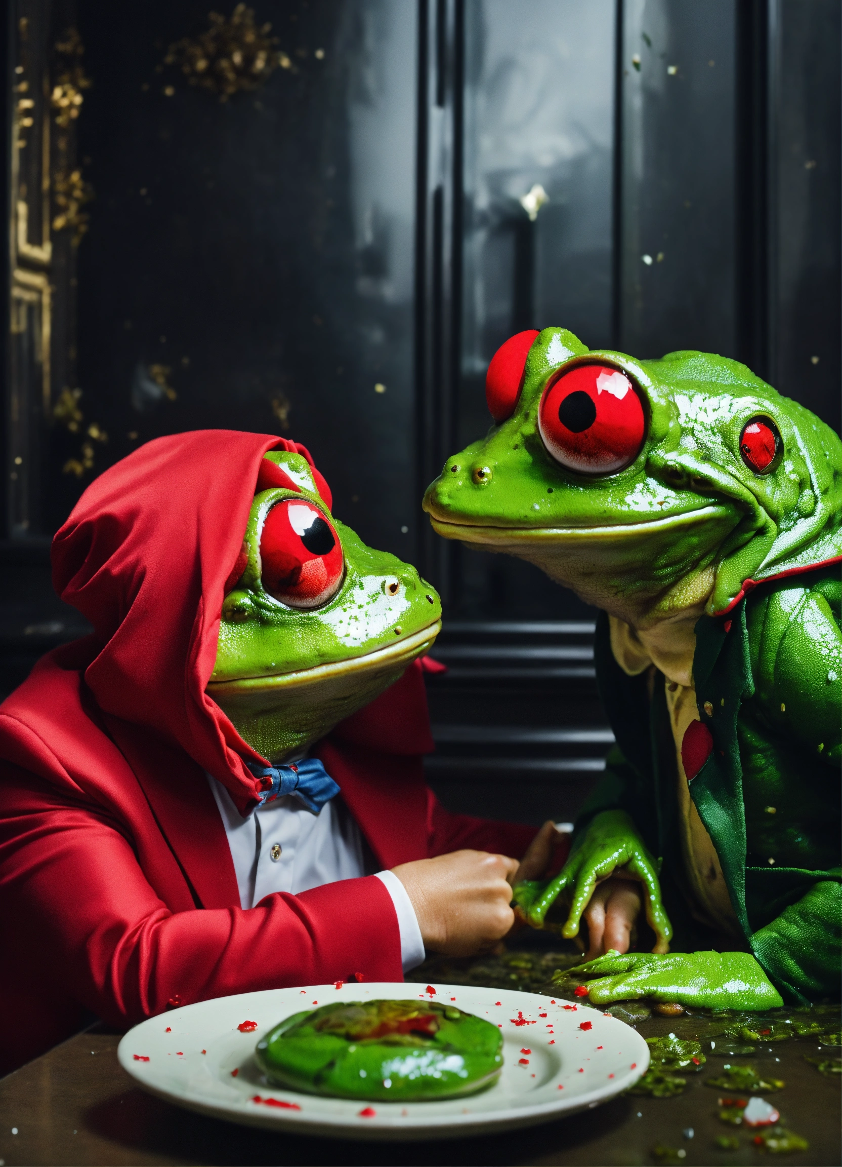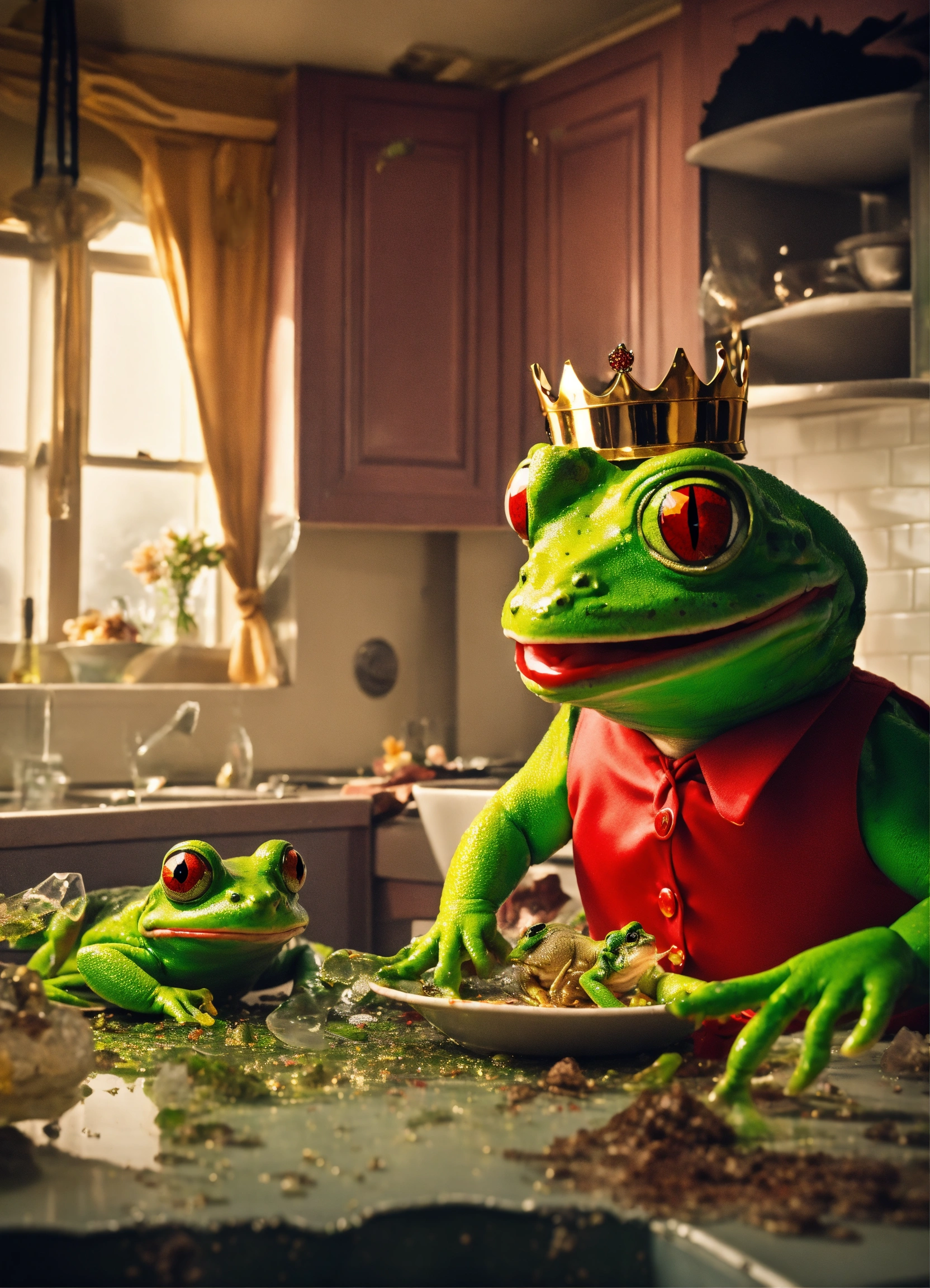 Cute human frog fighting with another cute human frog in suit crown and red lips huge eye lashes in london rush colours home kitchen smashed plates and glass mess cinematic environment