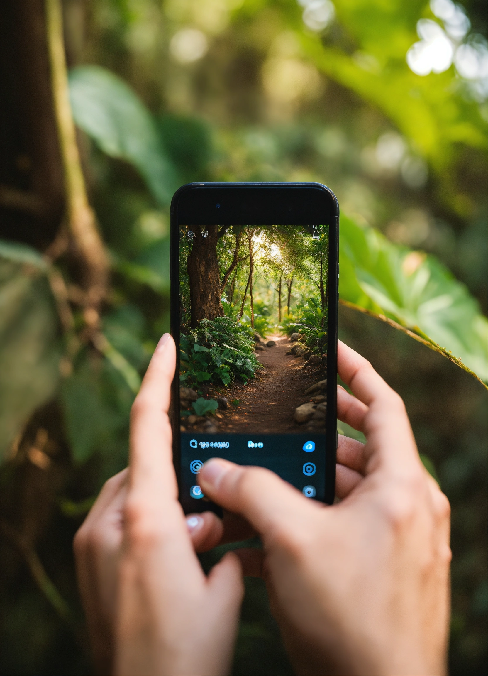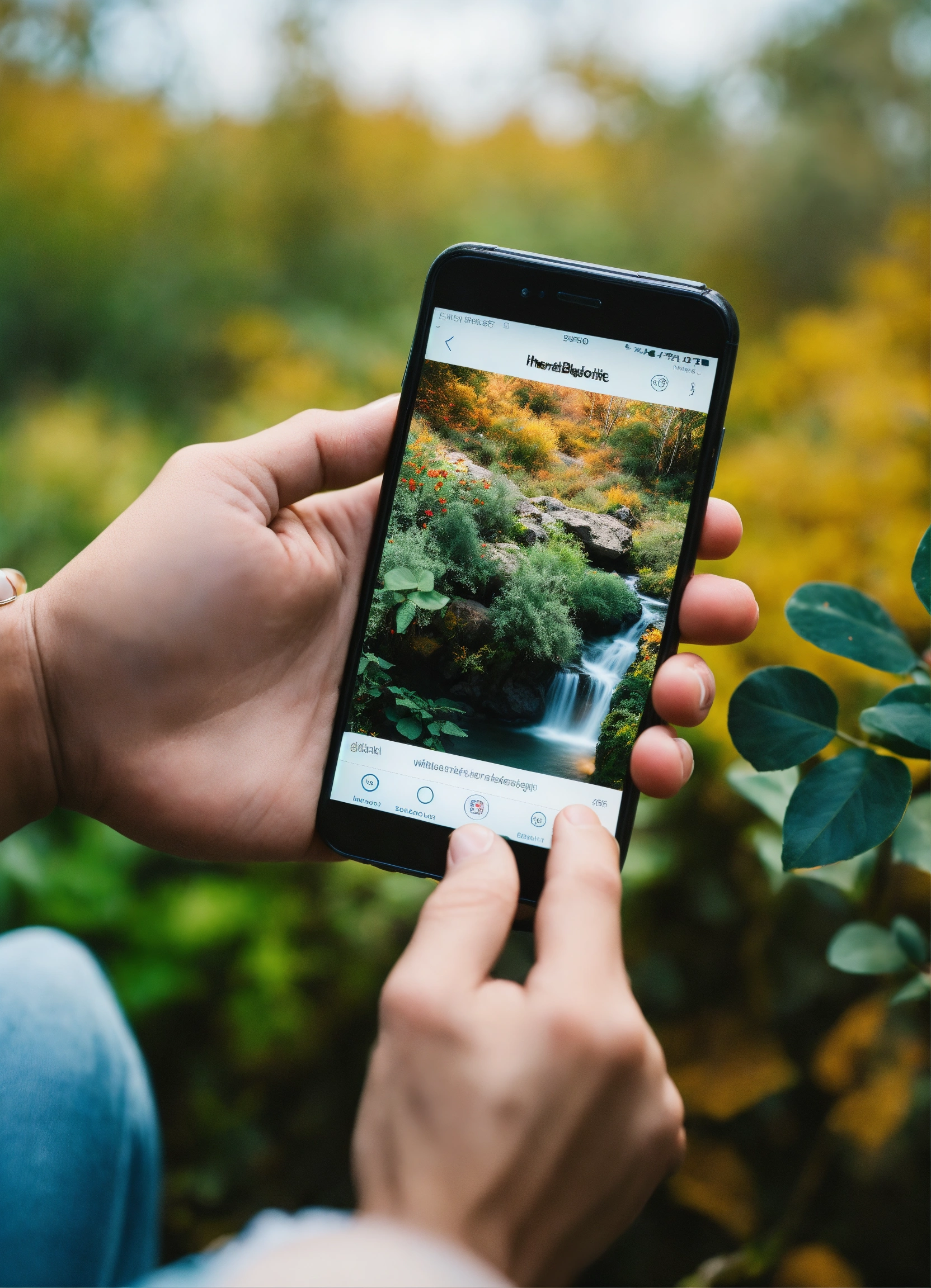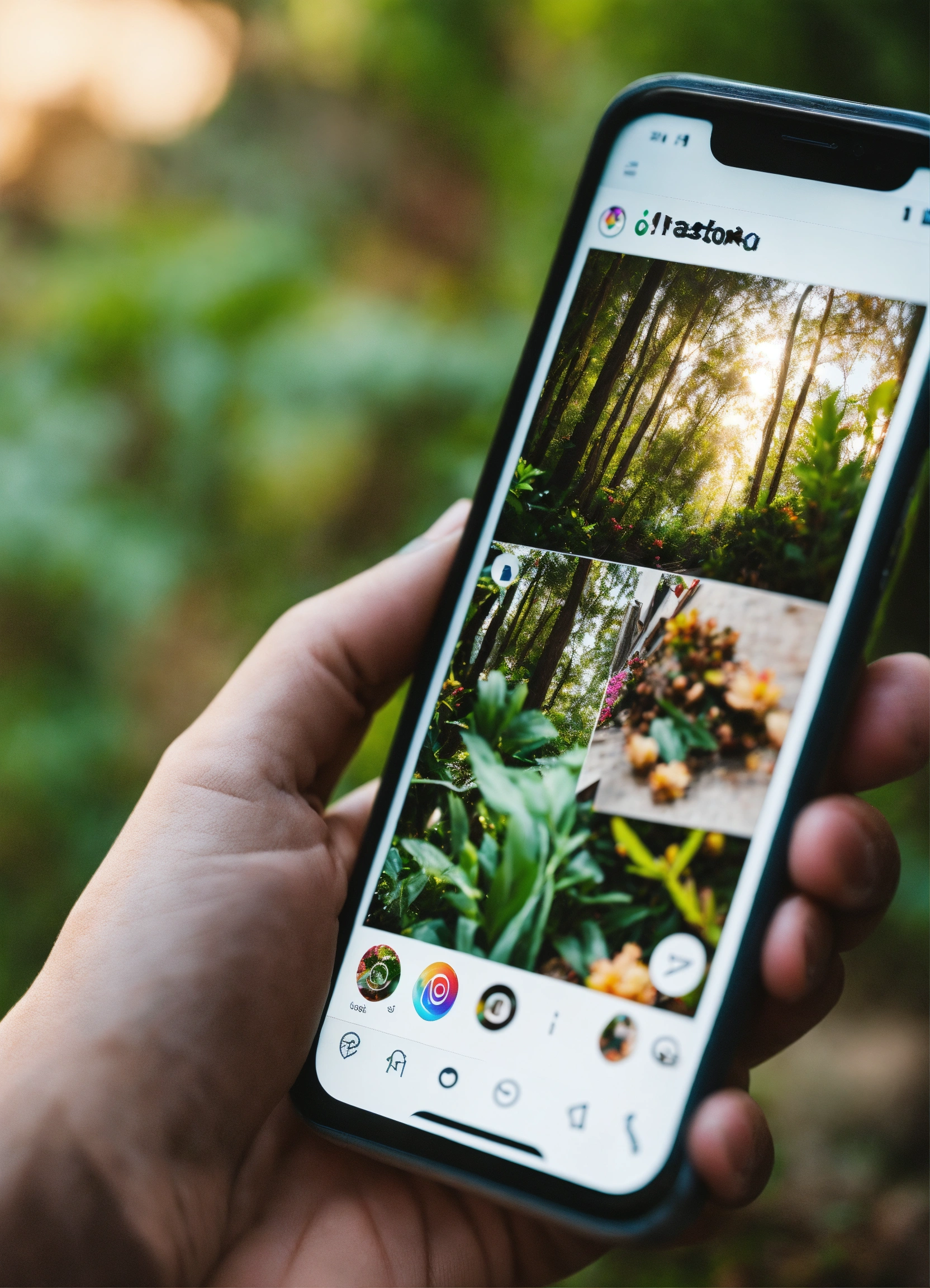 Image of a hand clicking on the instagram, on the smartphone. background natural materials, light colours, vegetation