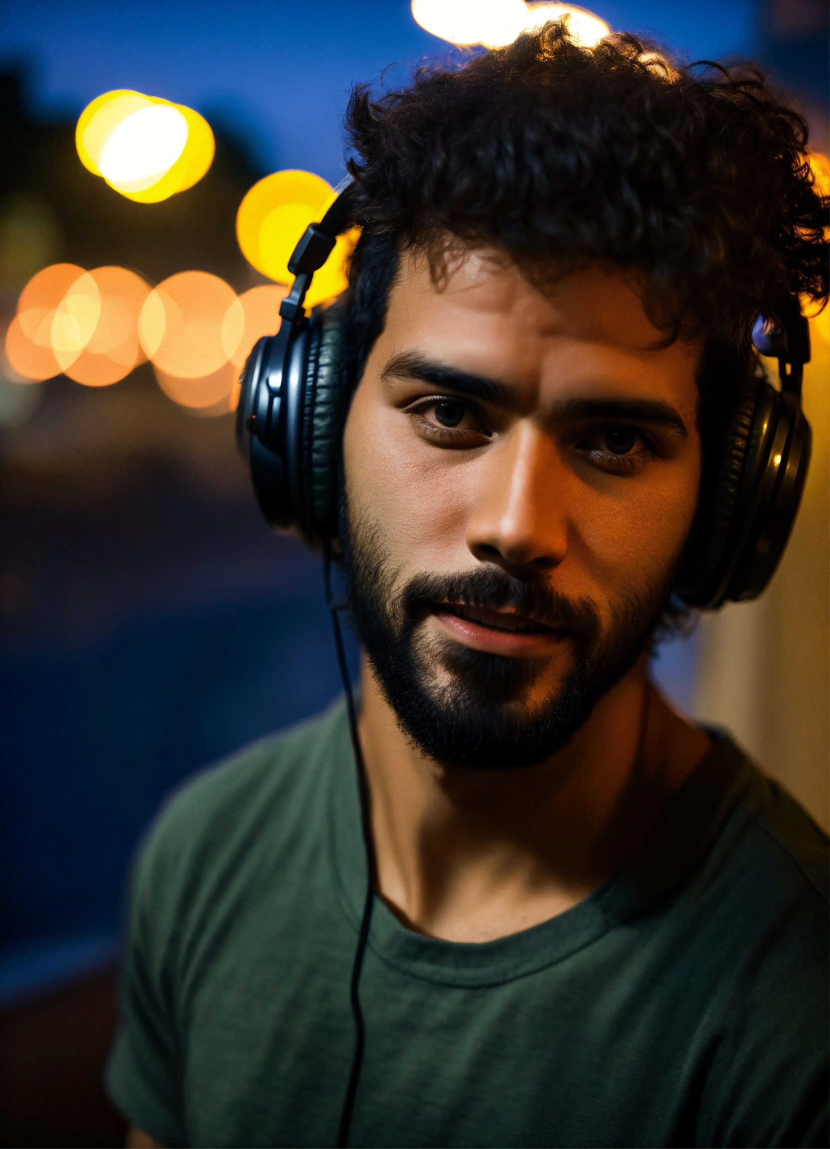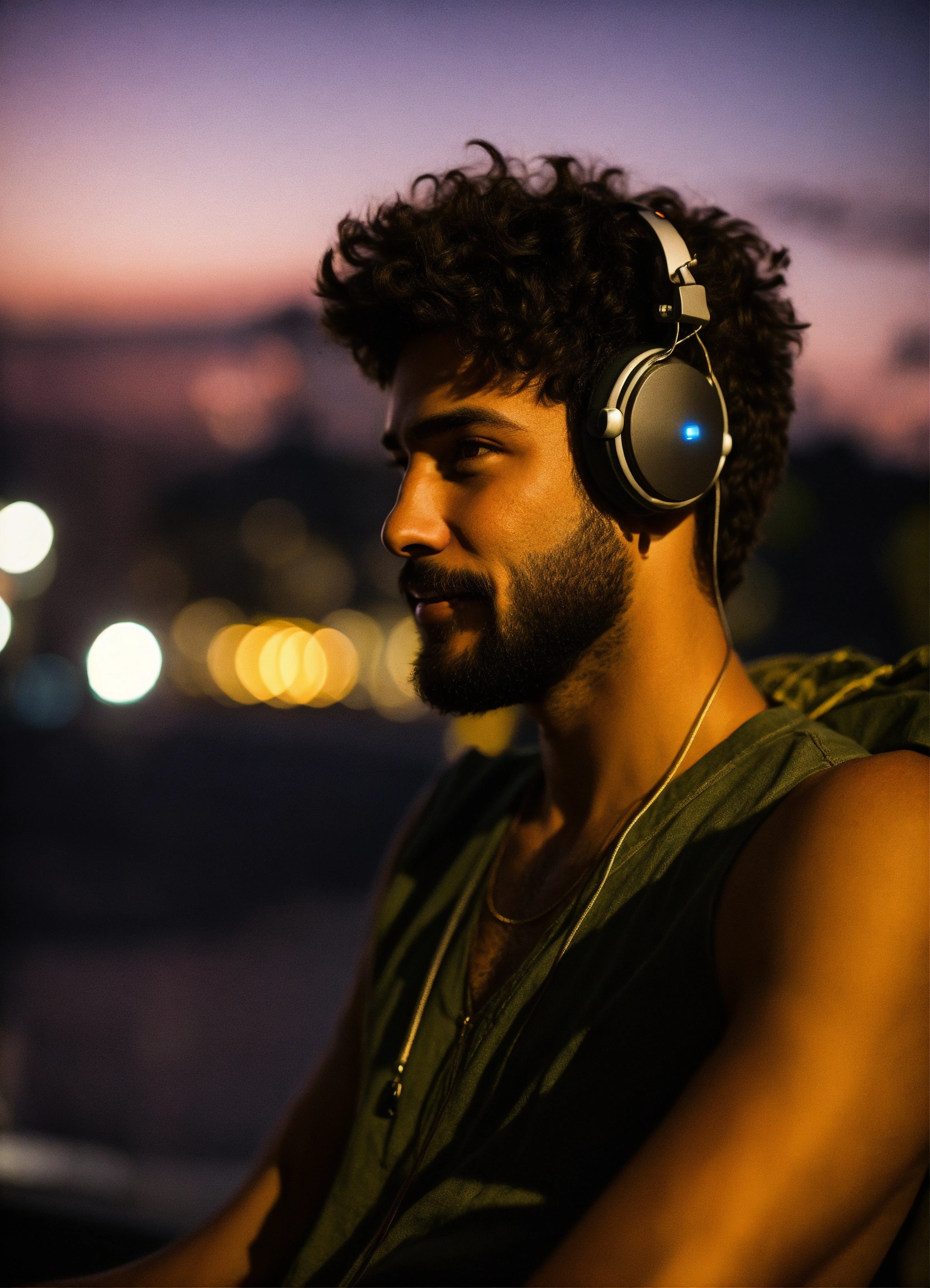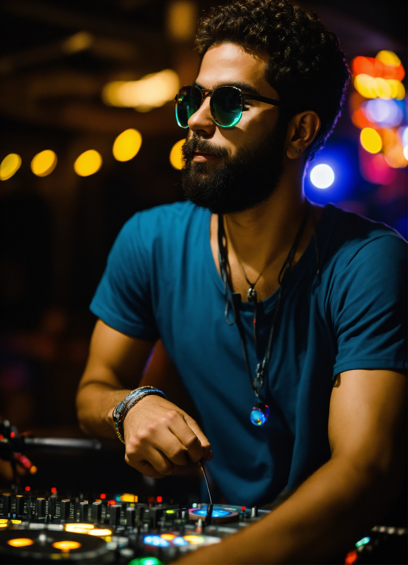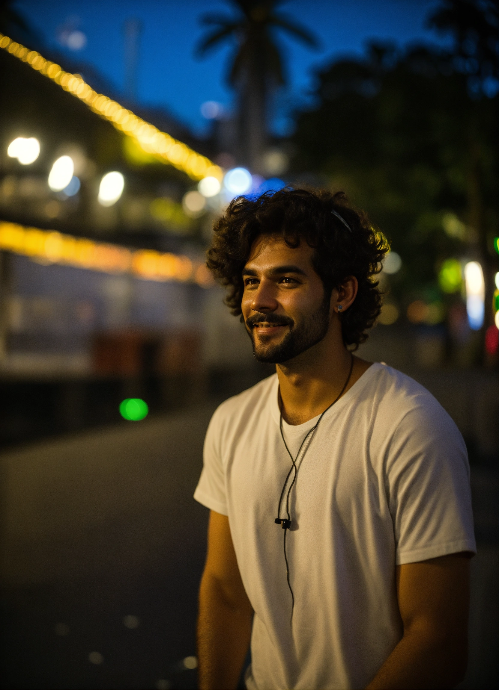 Retrato de um homem, dj, cabelo loiro, cenário a noite no rio de janeiro, perfil lateral, olhando ao longe, sorrindo, fotografia de 50 mm, iluminação direta–beta –ar23 –beta –upbeta