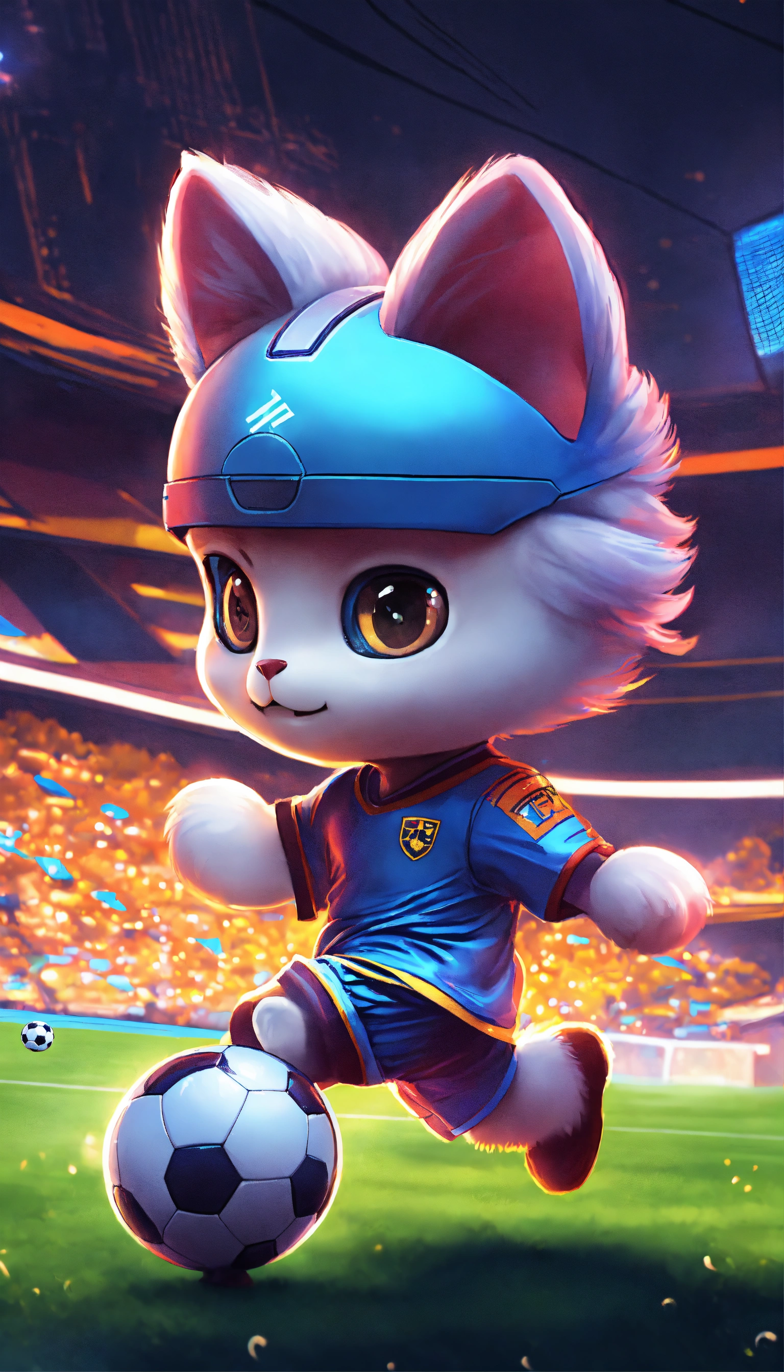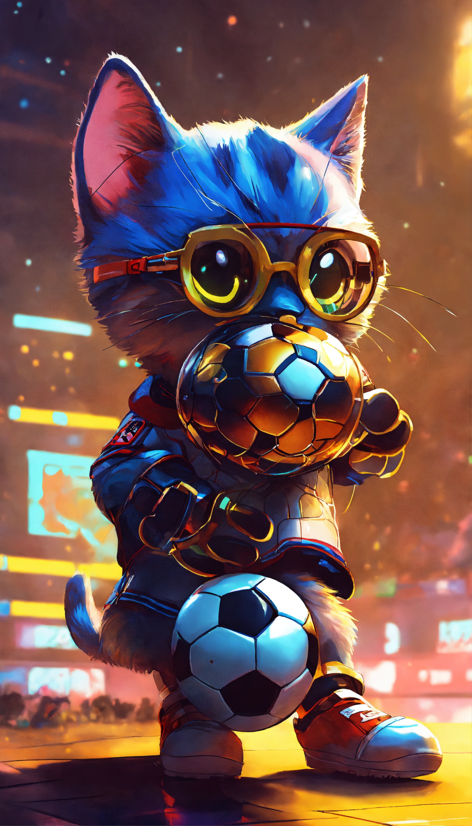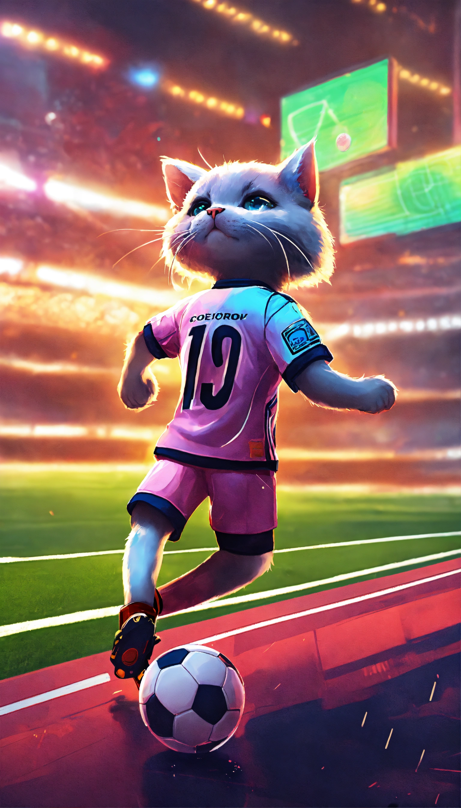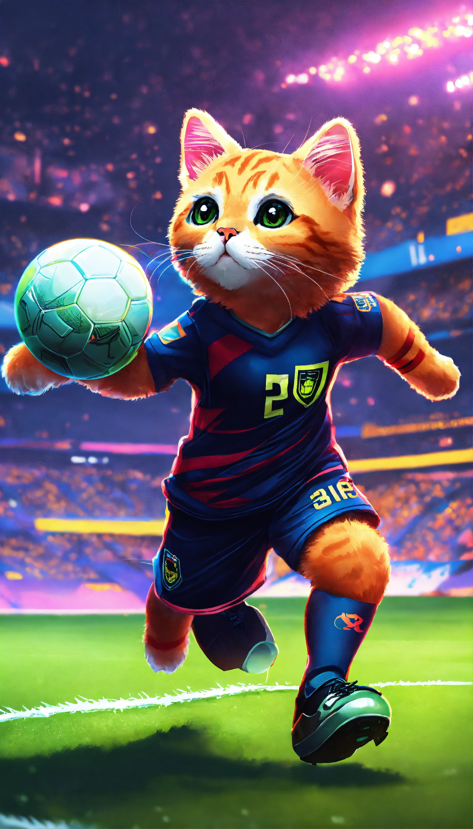 Digital cyberpunk art of cute cat soccer player scoring a goal