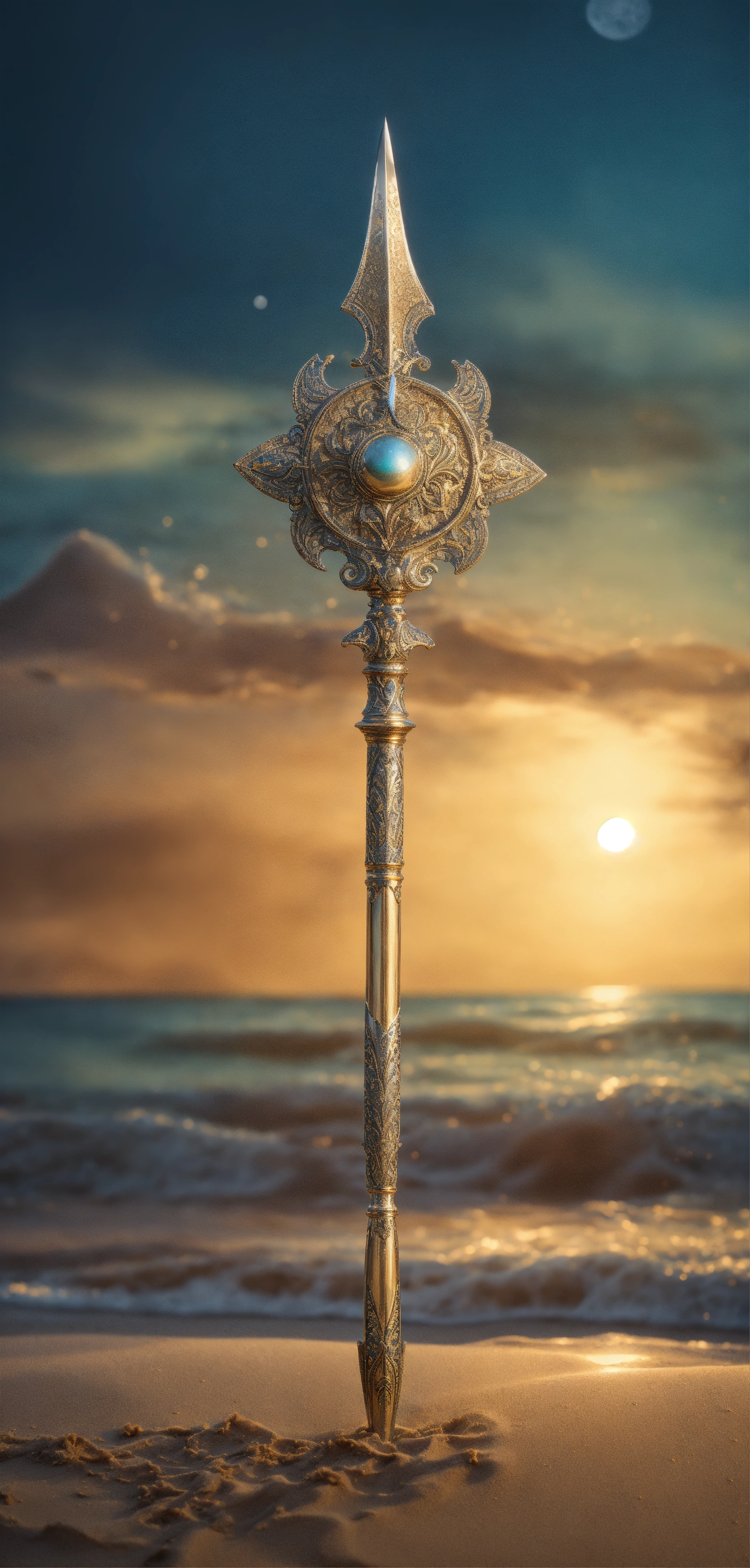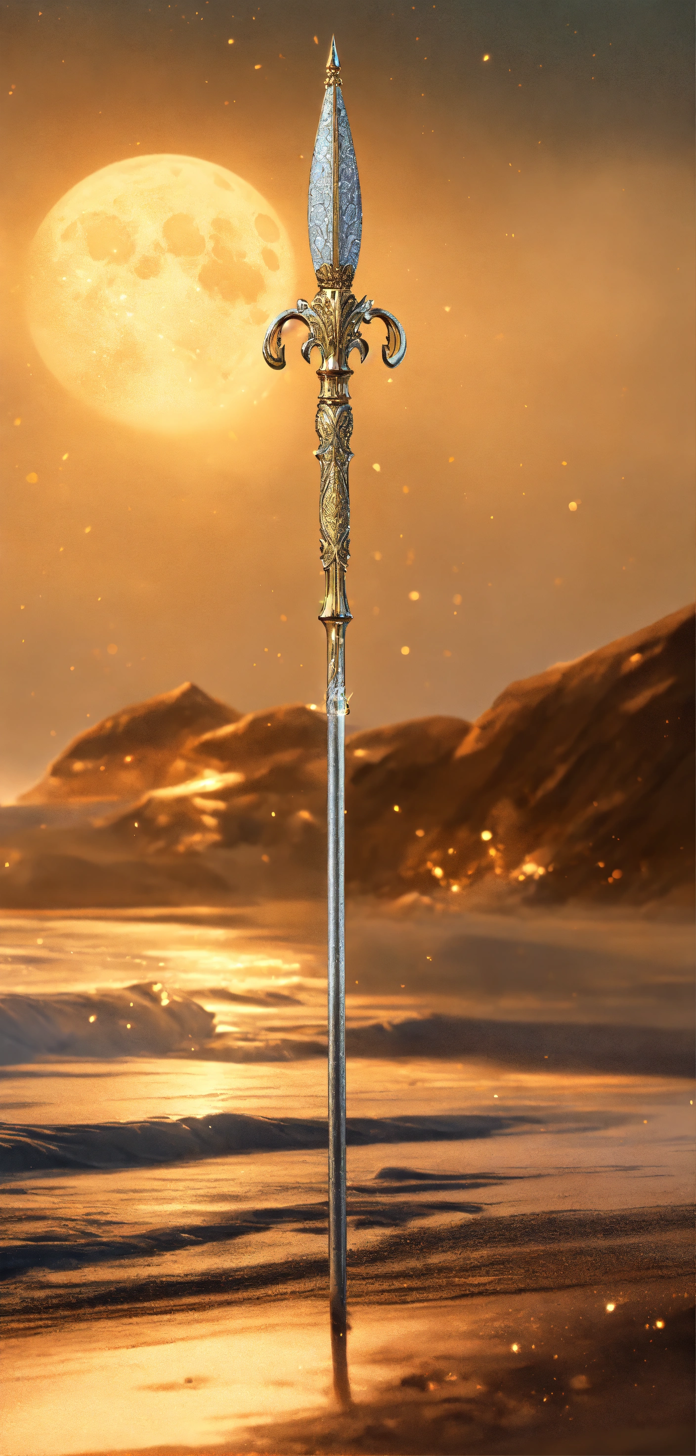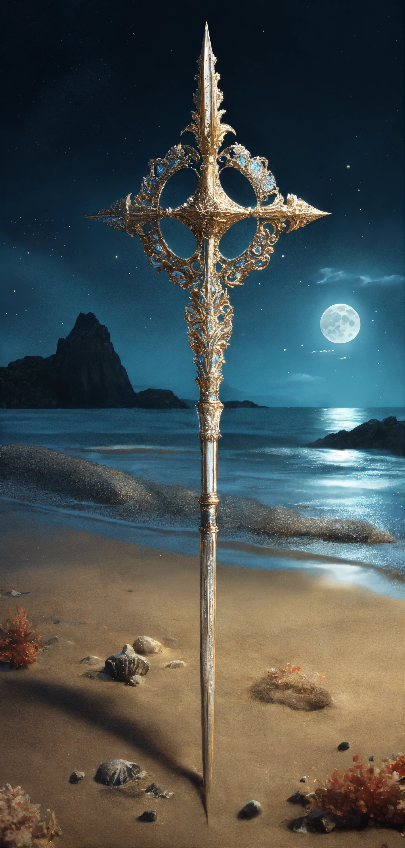 8k, picture of a narrow and delicate gezackte throwing aquatic spear with barbs made of lunar-silver, highly ornamented, very detailed, ultra realistic, stuck with the bottom end deep in the sand on the beach in a lonely bay, moonlight, fantasy, medieval