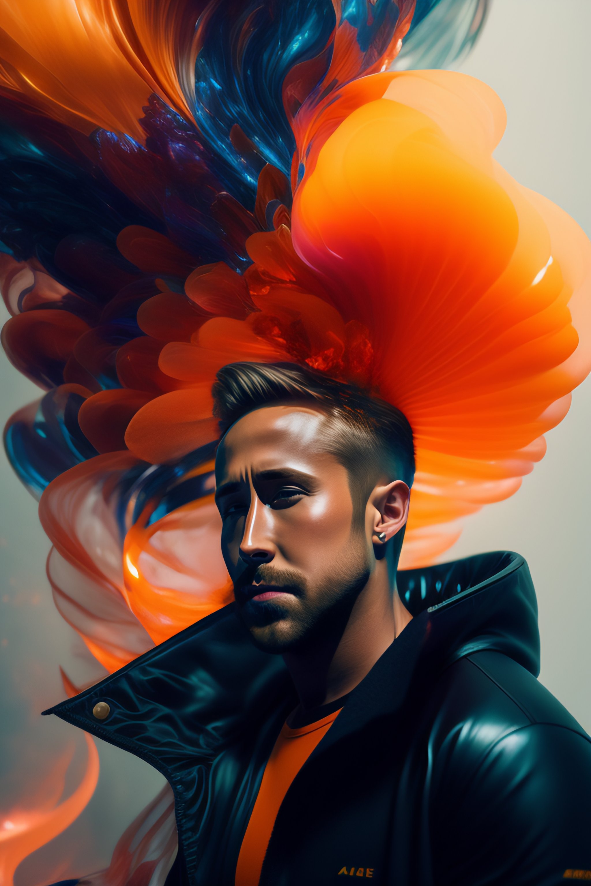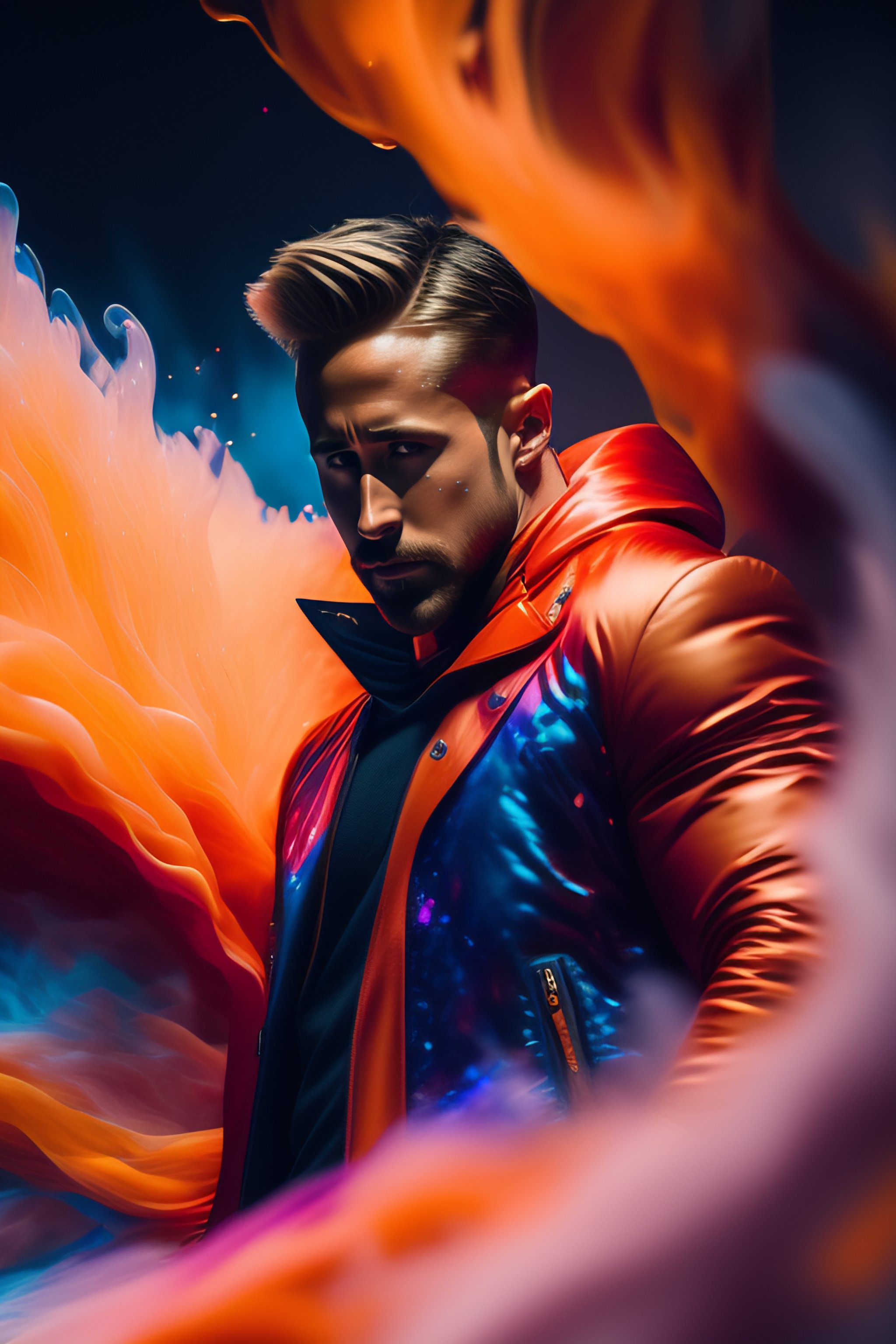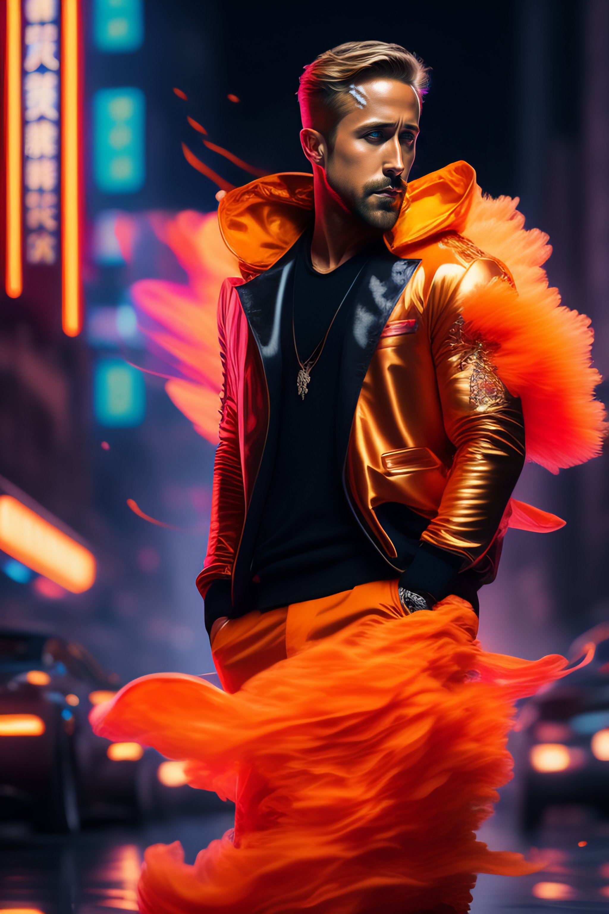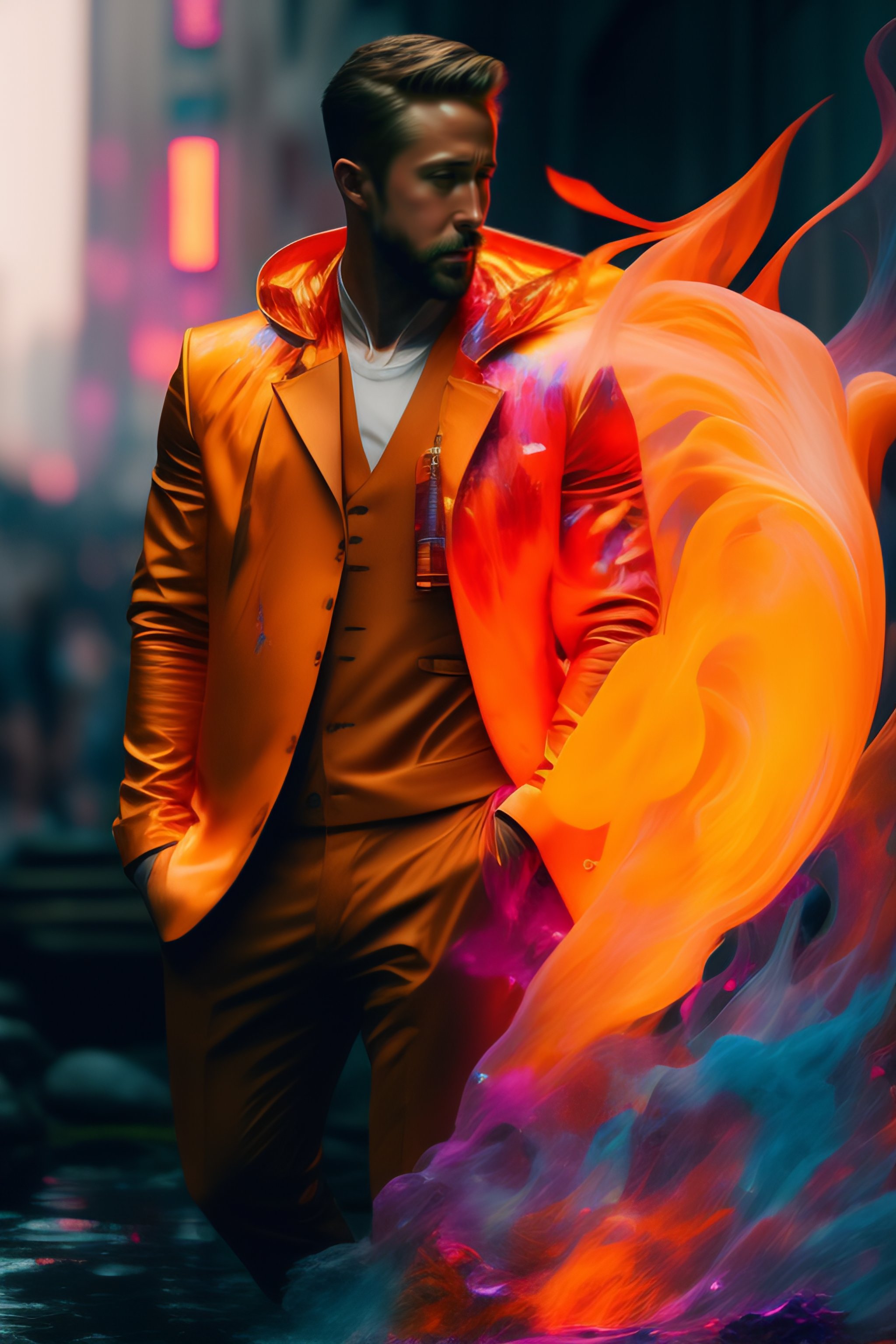 Ryan gosling, orange spike aura in motion, damaged japanese clothes, floating pieces, painted by art by tsuyoshi nagano, greg rutkowski, artgerm, alphonse mucha, spike painting, cyberpunk