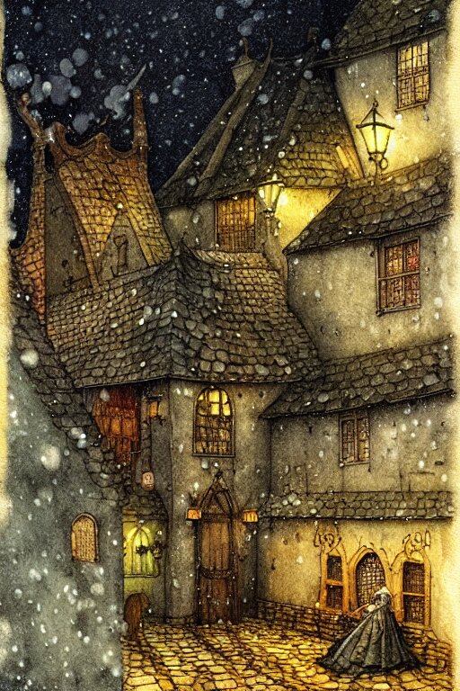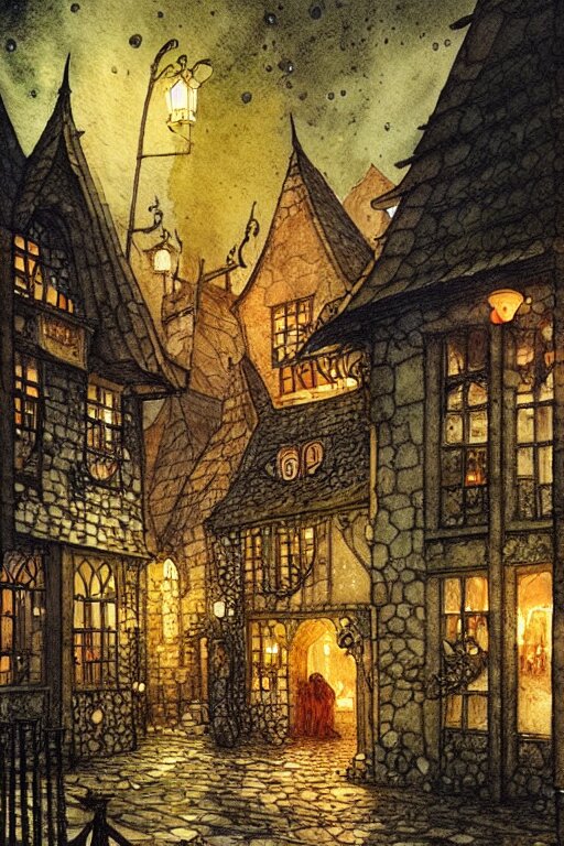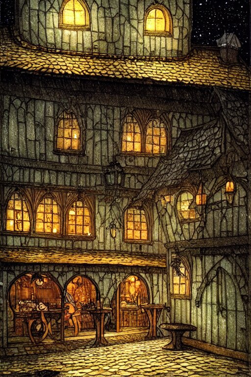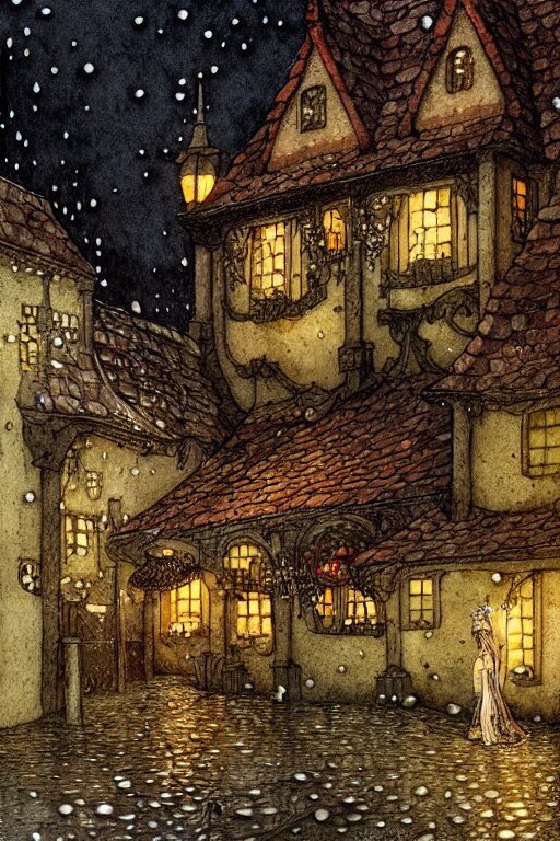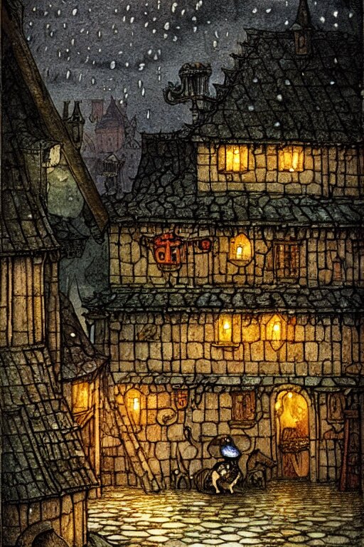 Medieval tavern exterior rainy night, shingled roof, dark alleyway, fantasy, intricate, elegant, highly detailed, digital painting, artstation, concept art, matte, sharp focus, illustration, art by kay nielsen and walter crane, illustration style, watercolor