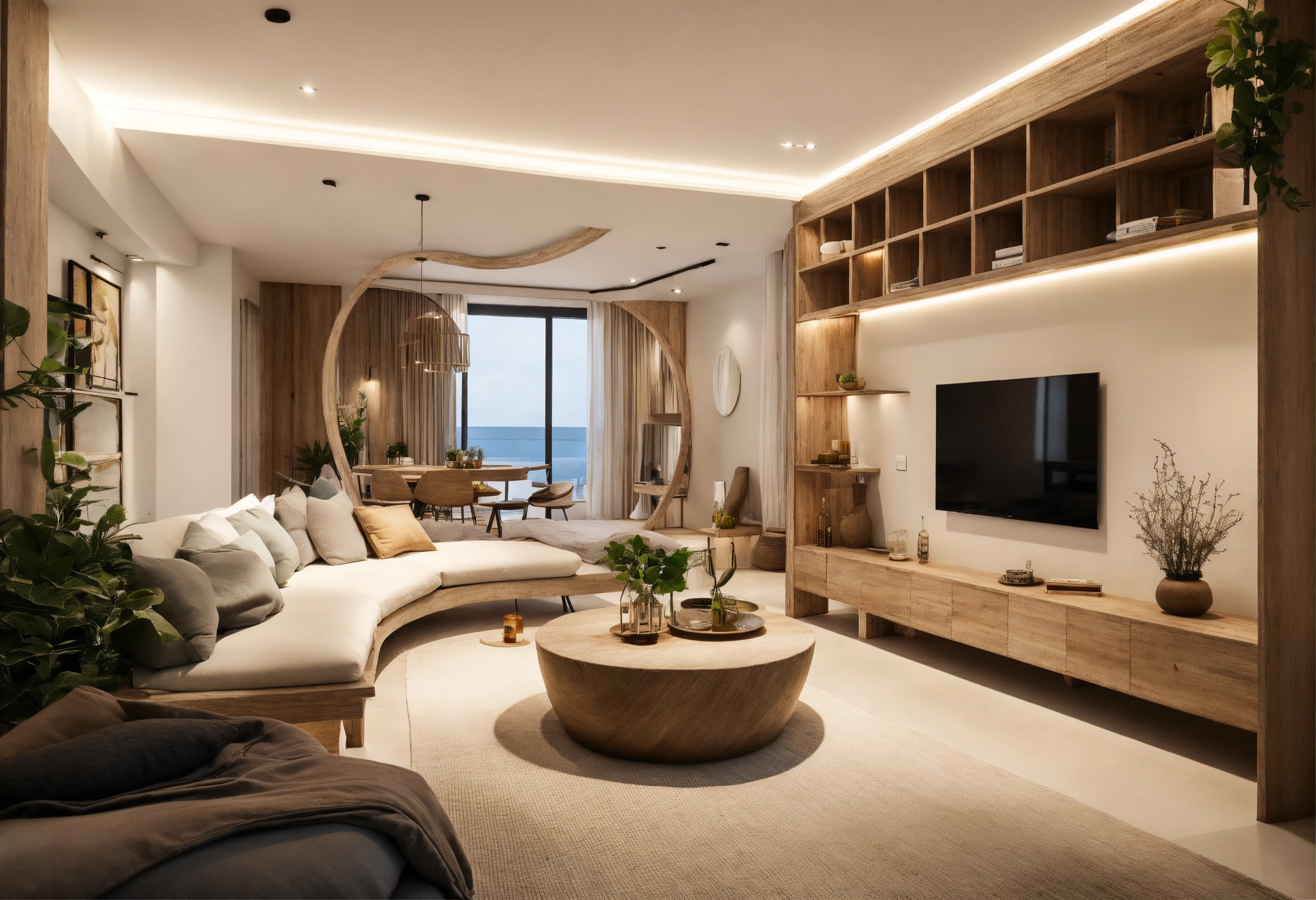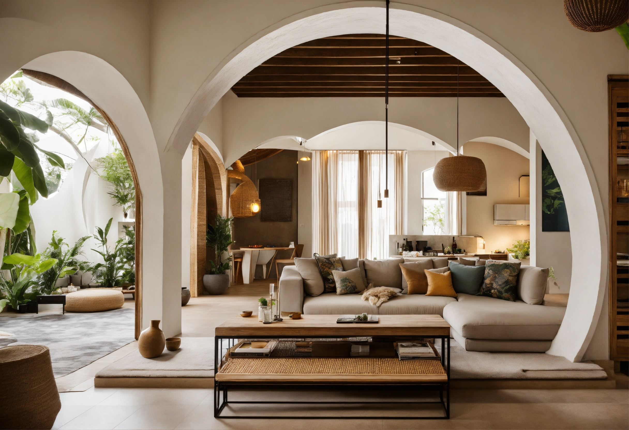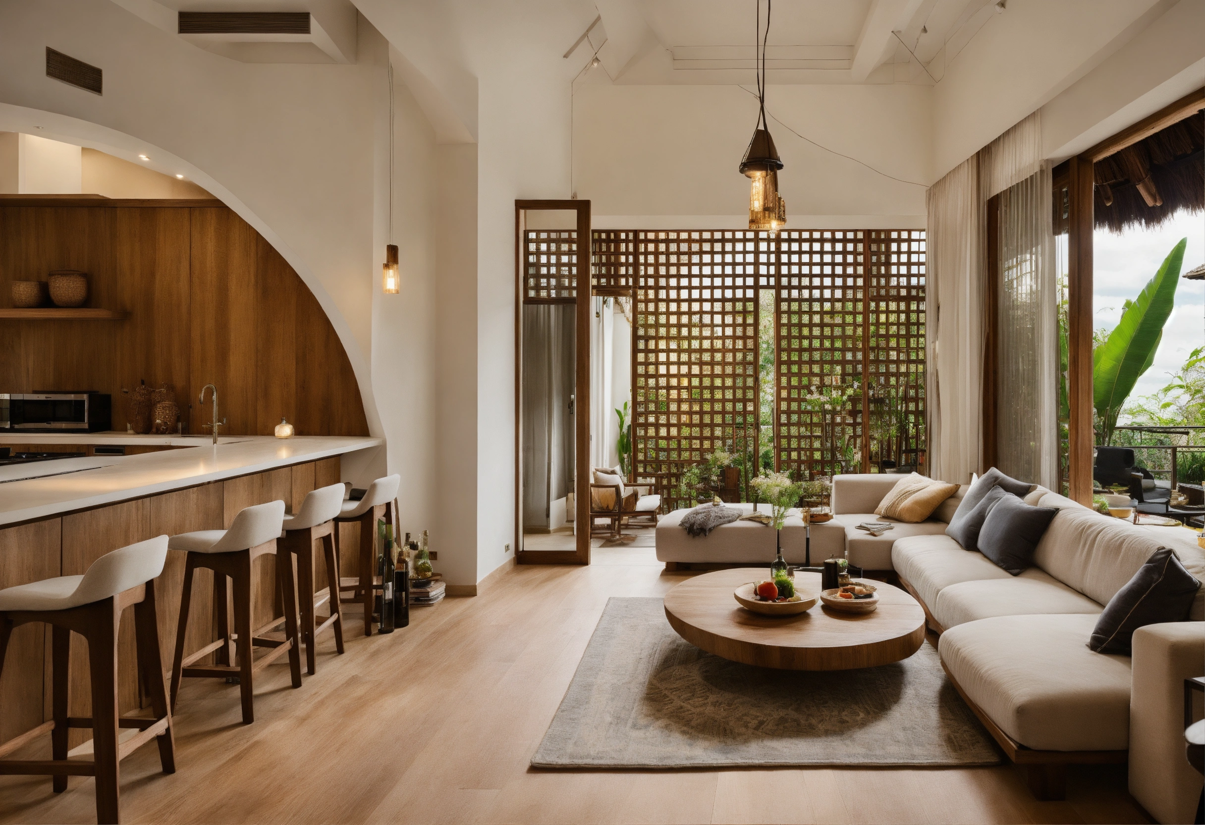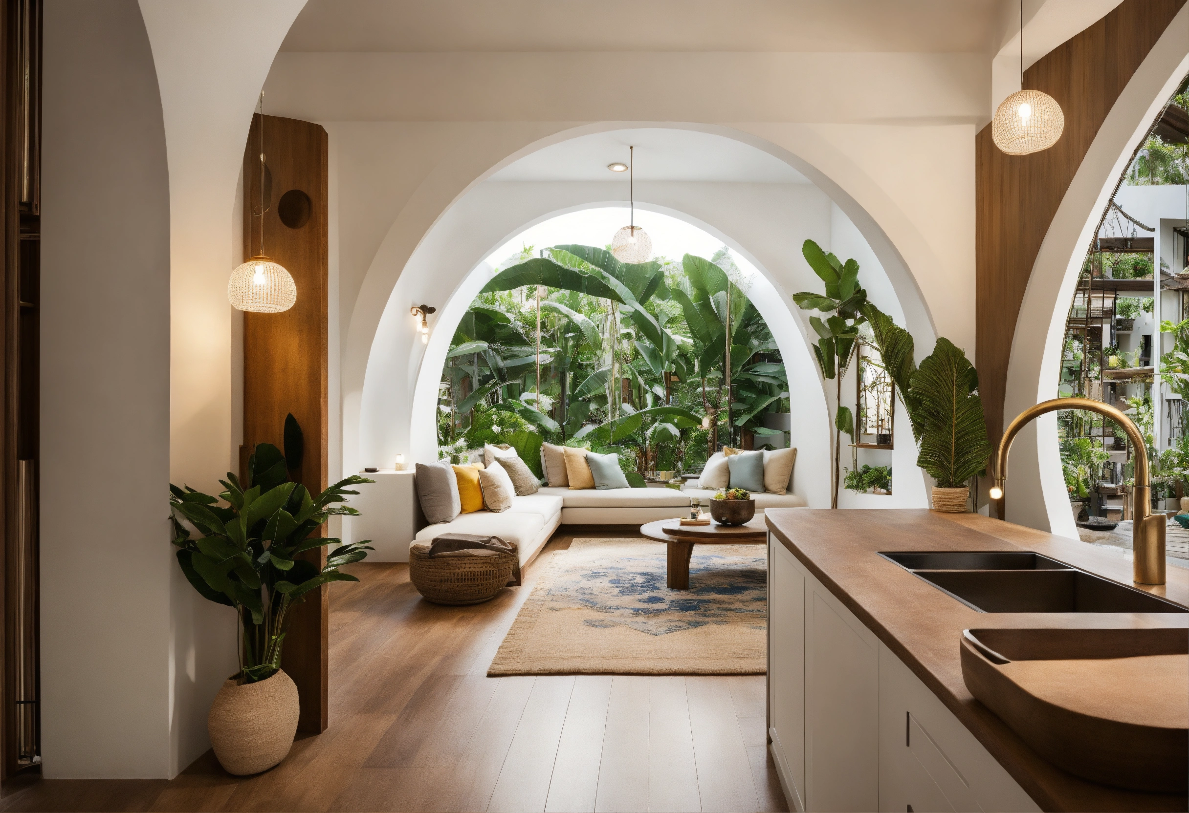 Modern take on upscale bali inspired small apartment white round arches interor view of kitchen living room bedroom