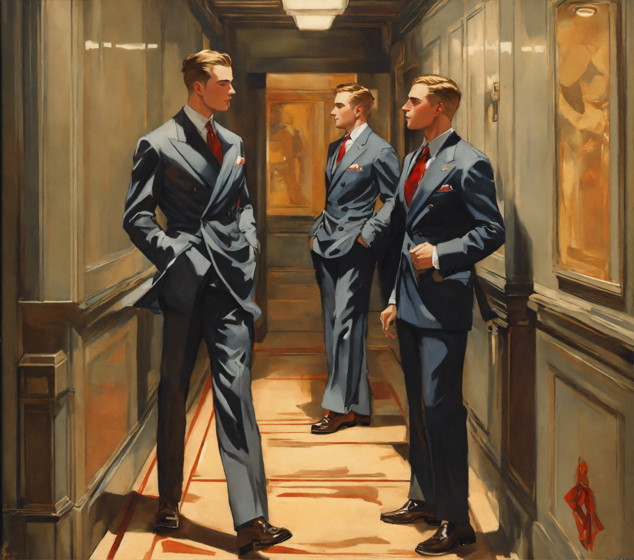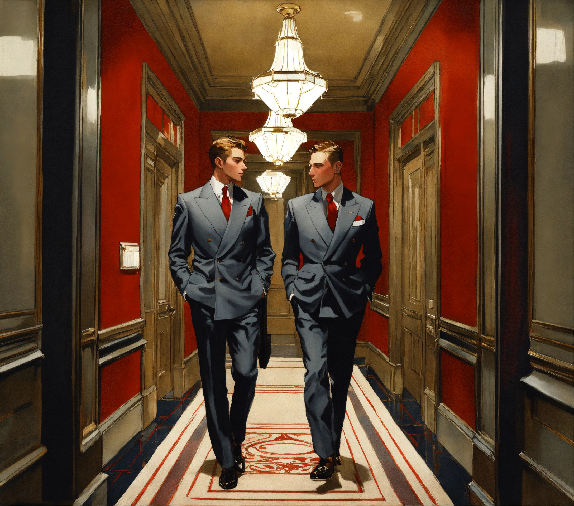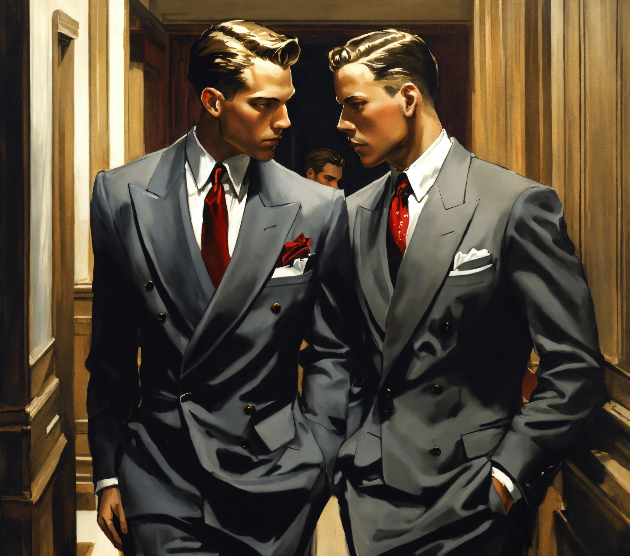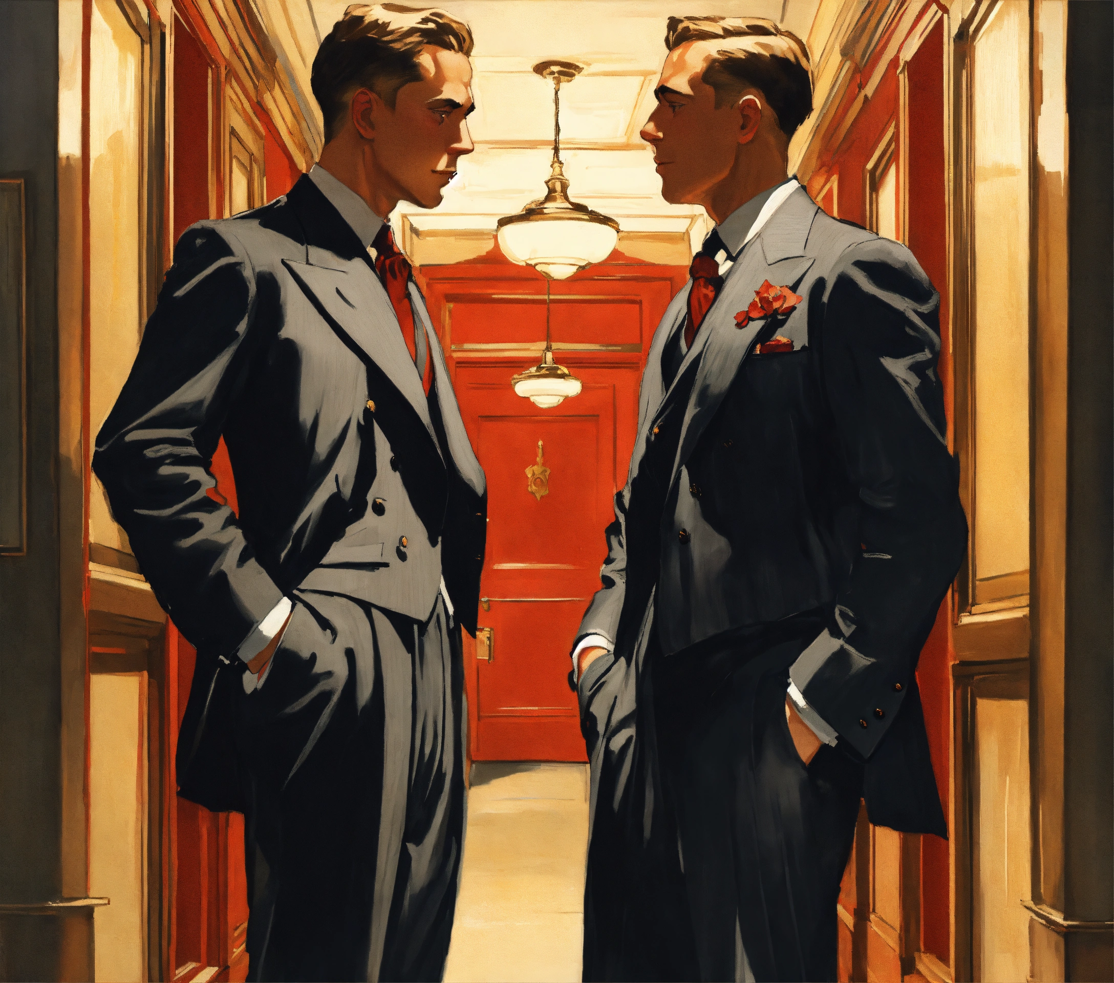 Two businessmen in dark grey double breasted suit, red tie, secretly whispering in a corridor, leyendecker style
