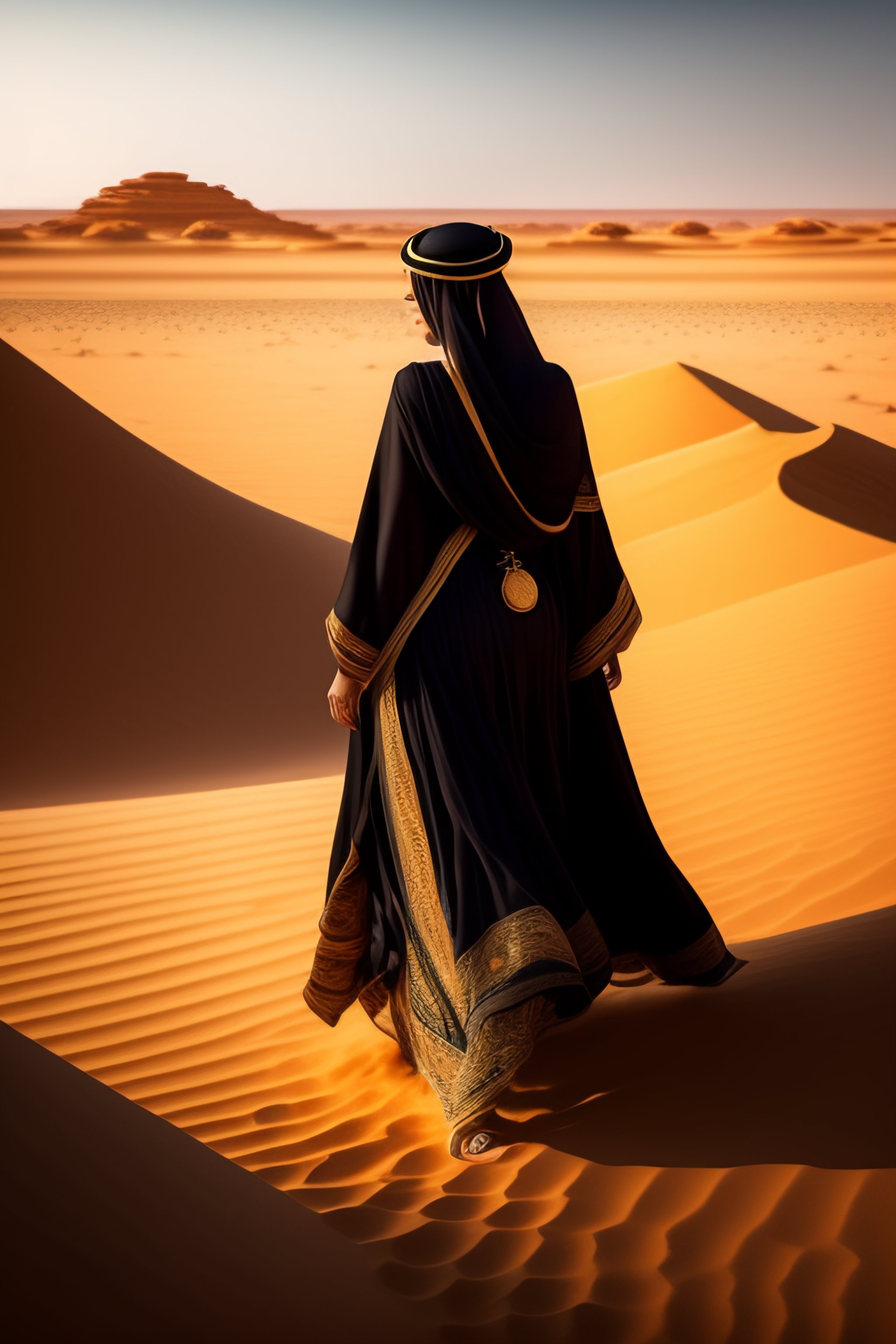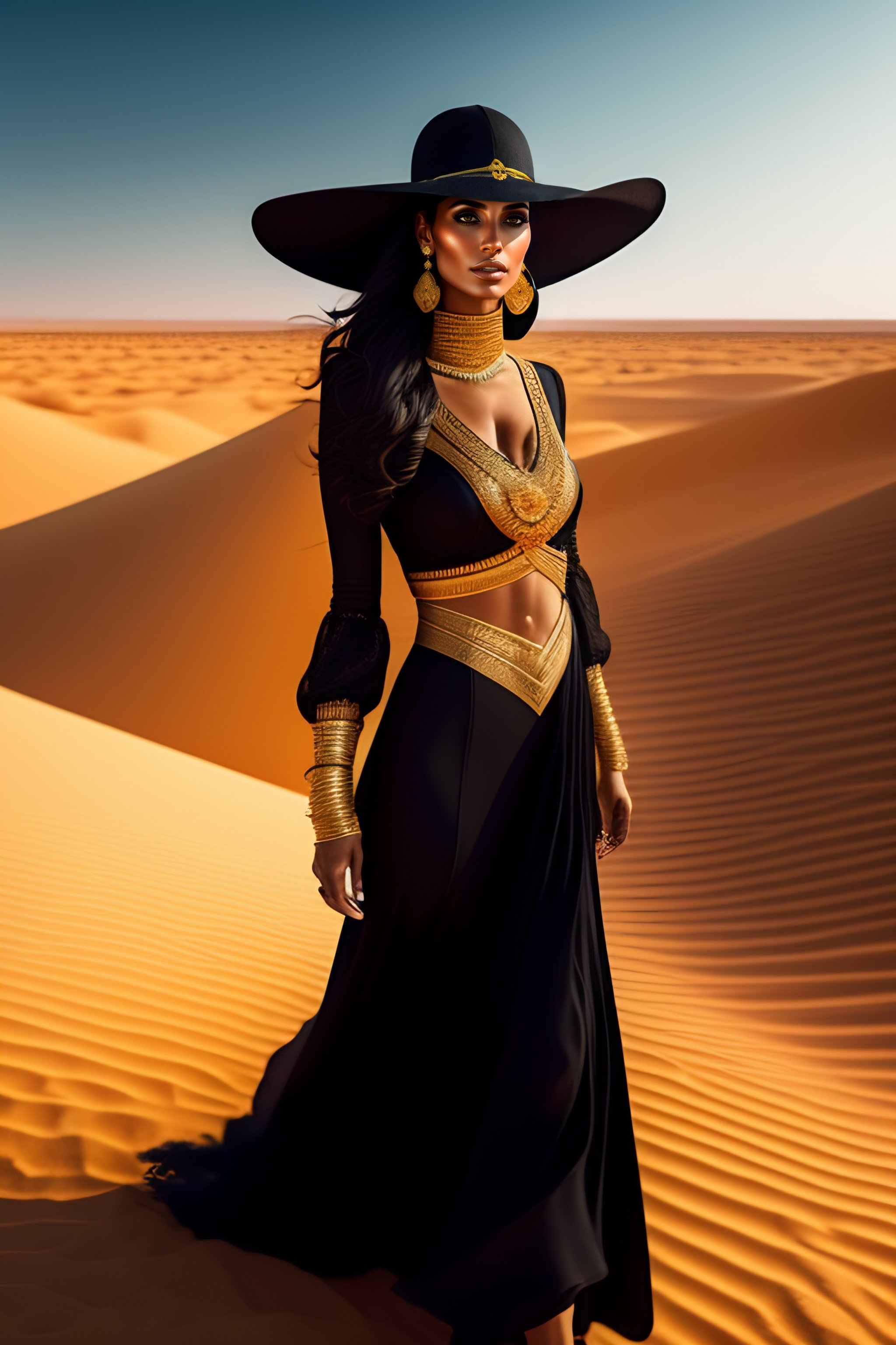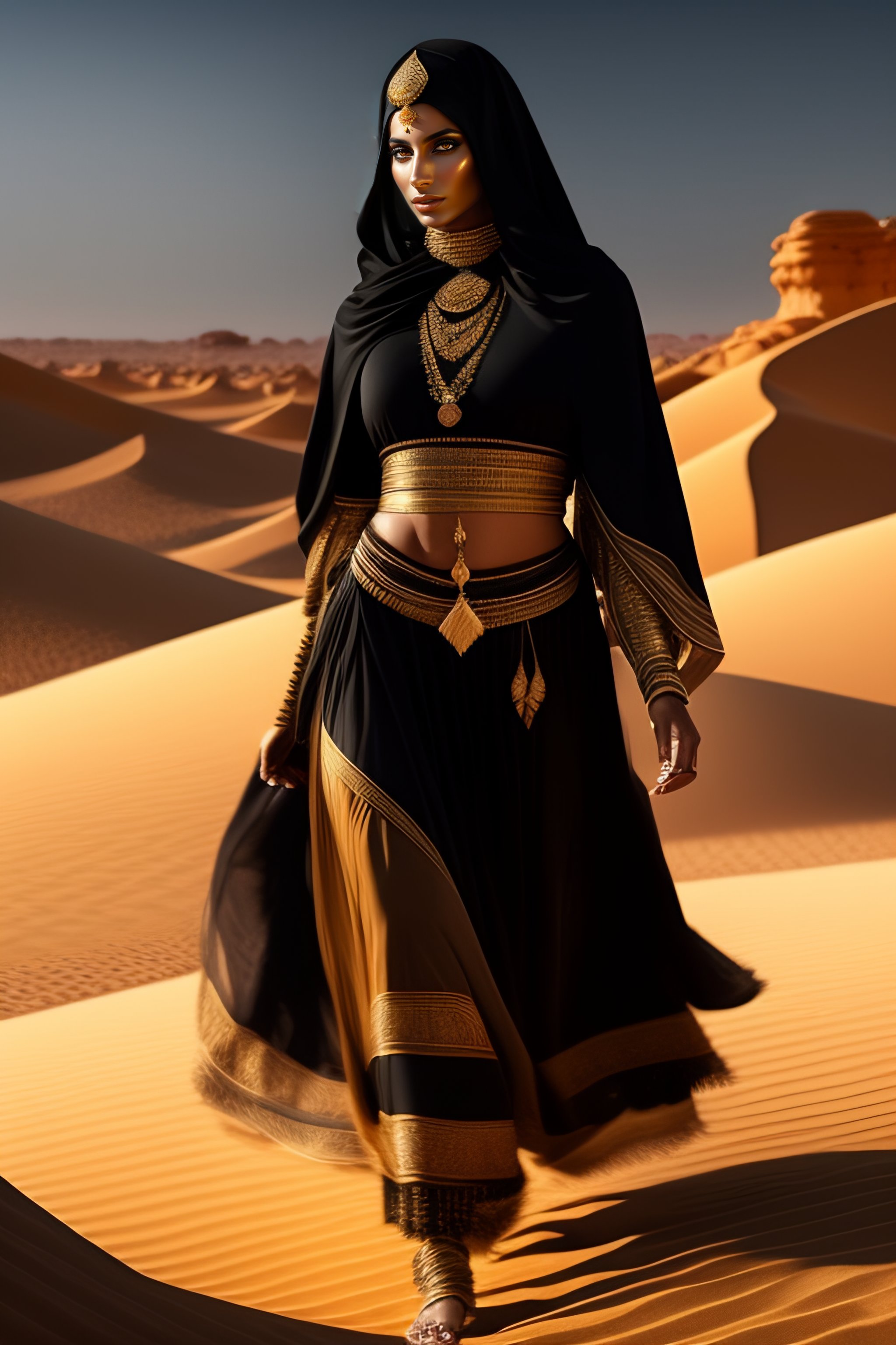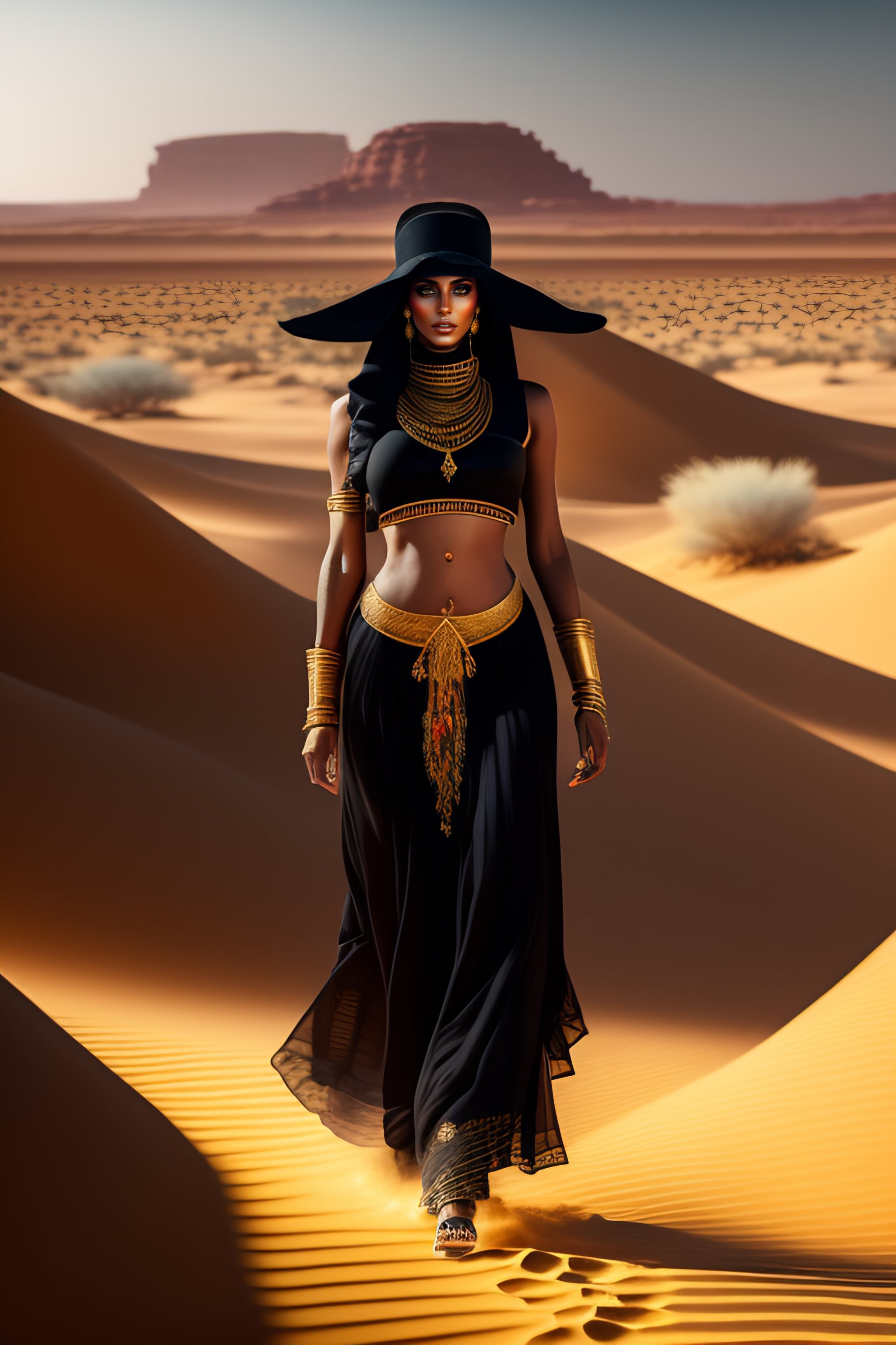 Beautiful arabian woman wearing black clothes and a tribly hat, wearing gold jewels, walking in a desert oasis with greeneries and colorful flowers, full-body view, greg rutkowski, ultra detailed, volumetric lighting