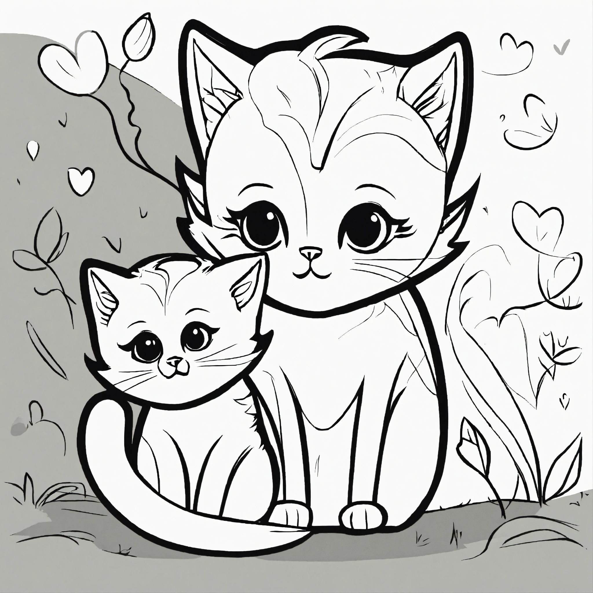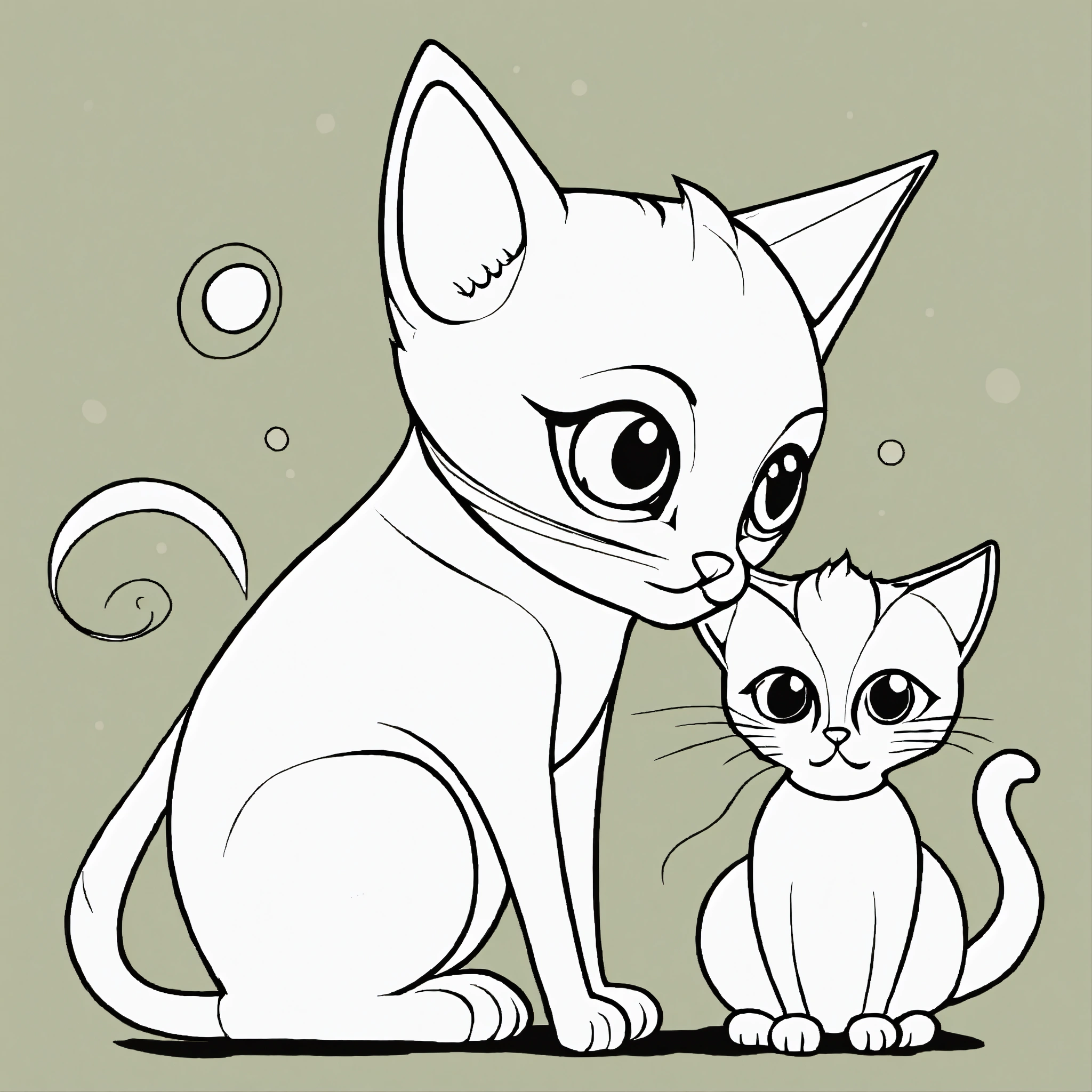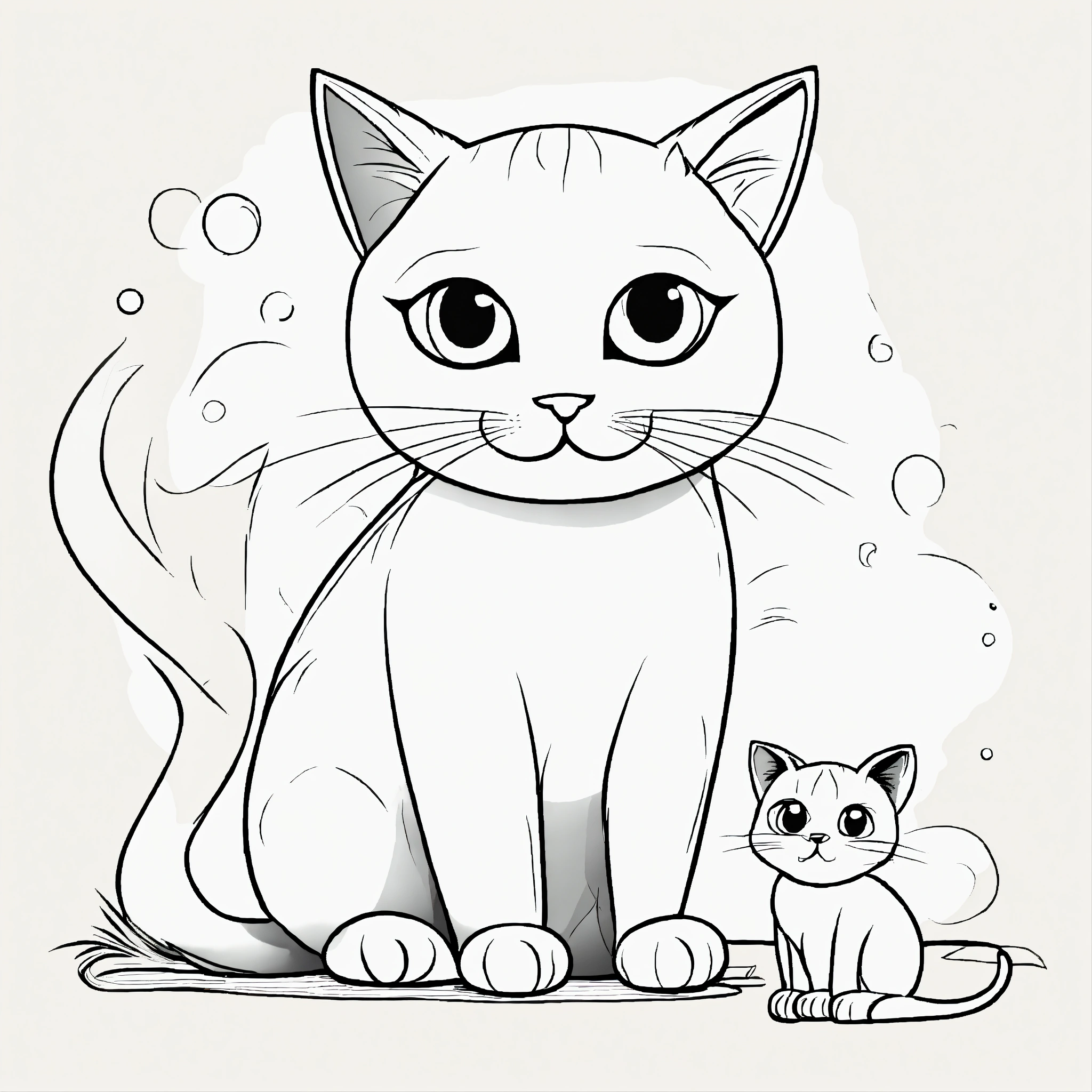 Cat mother and baby, cute for a toddler’s, big cute eyes, pixar style, simple outline and shapes, coloring page black and white, flat vector, white background, clean line art, simple, fine draw, pop style