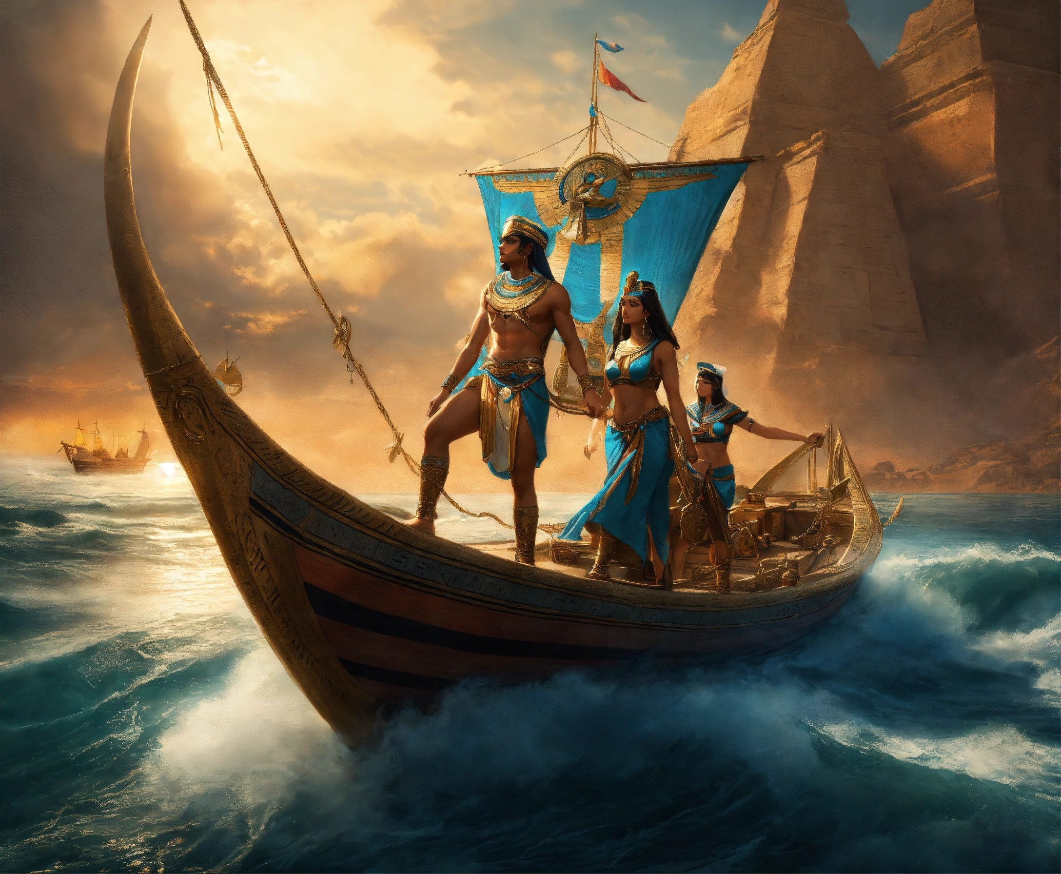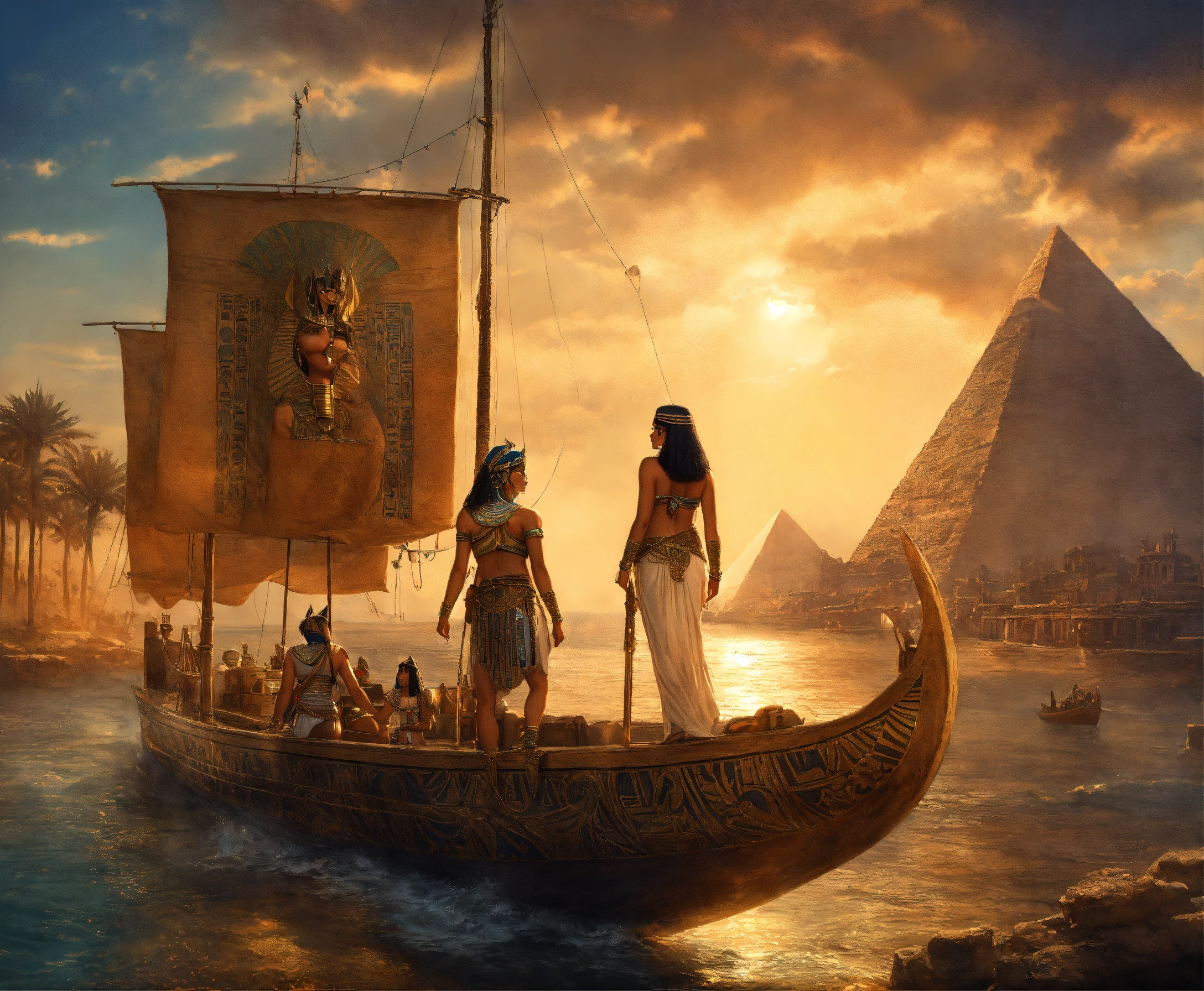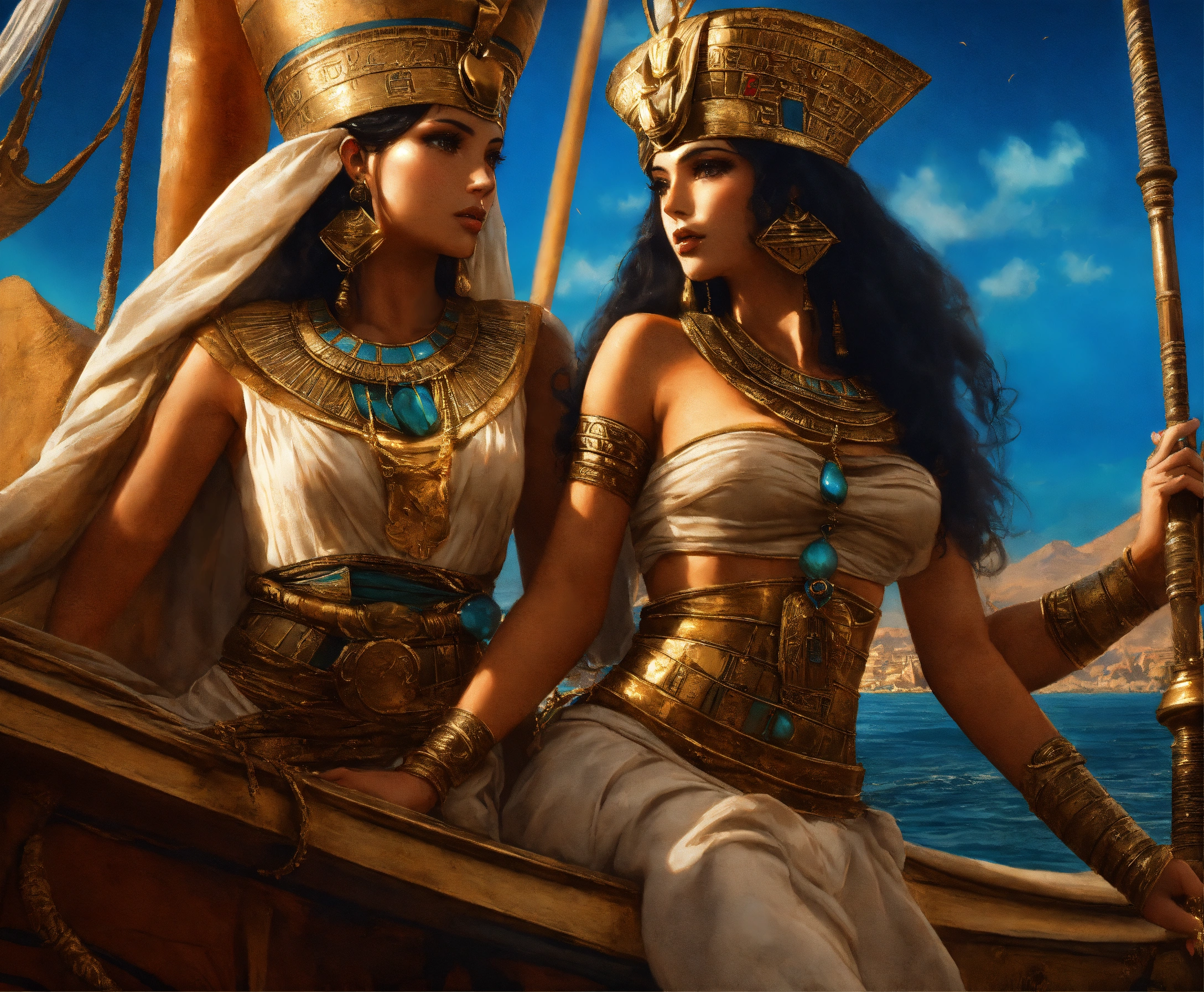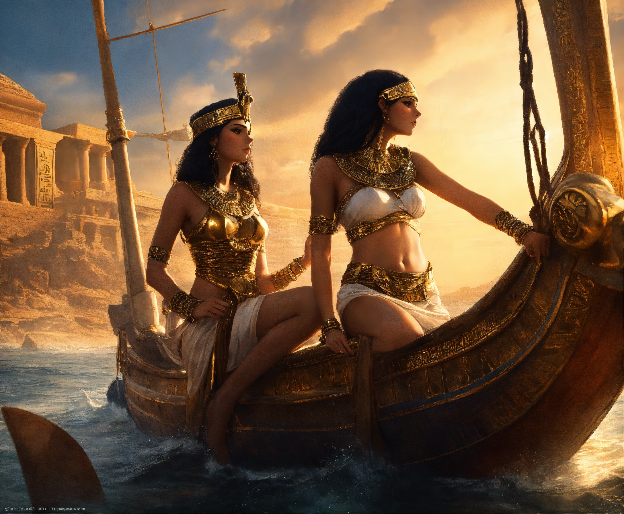 An epic fantasy scene featuring a couple beautiful egyptian women as a sailors on a pharaons boat. cinematic view, sharp detail, louis royo style