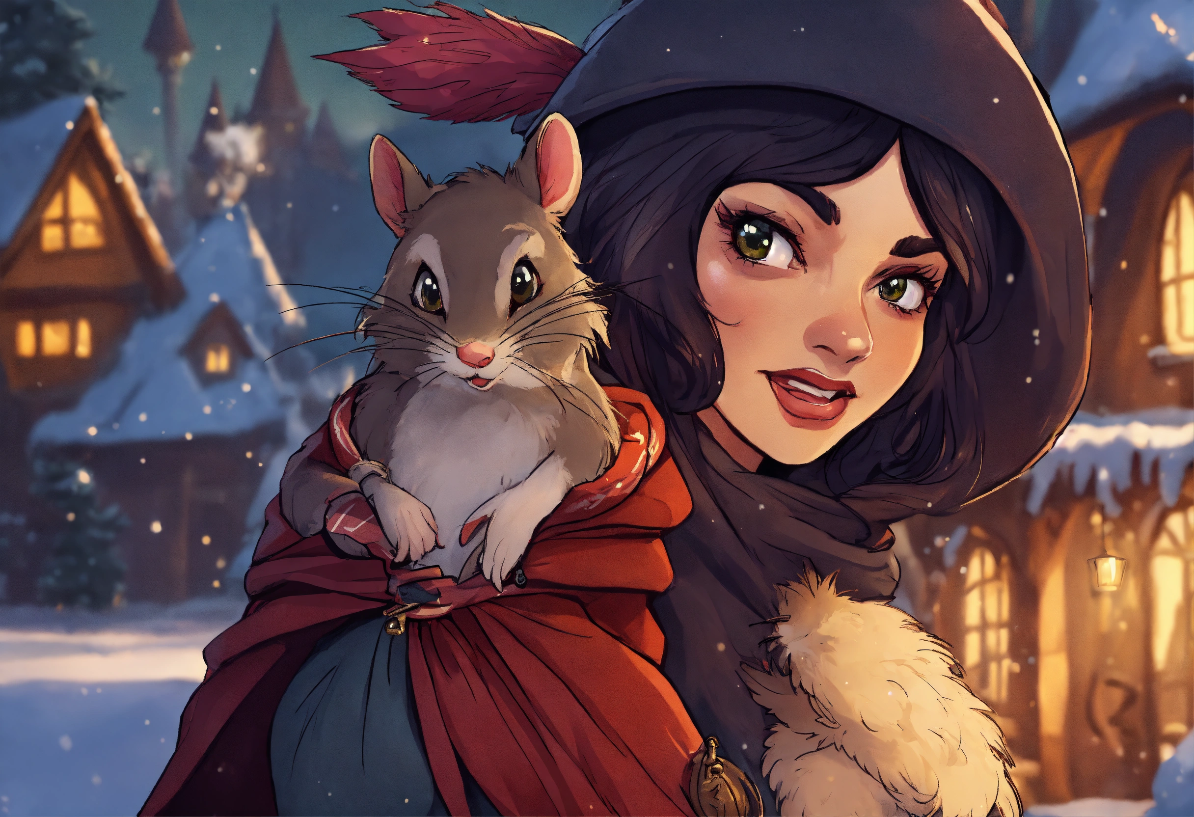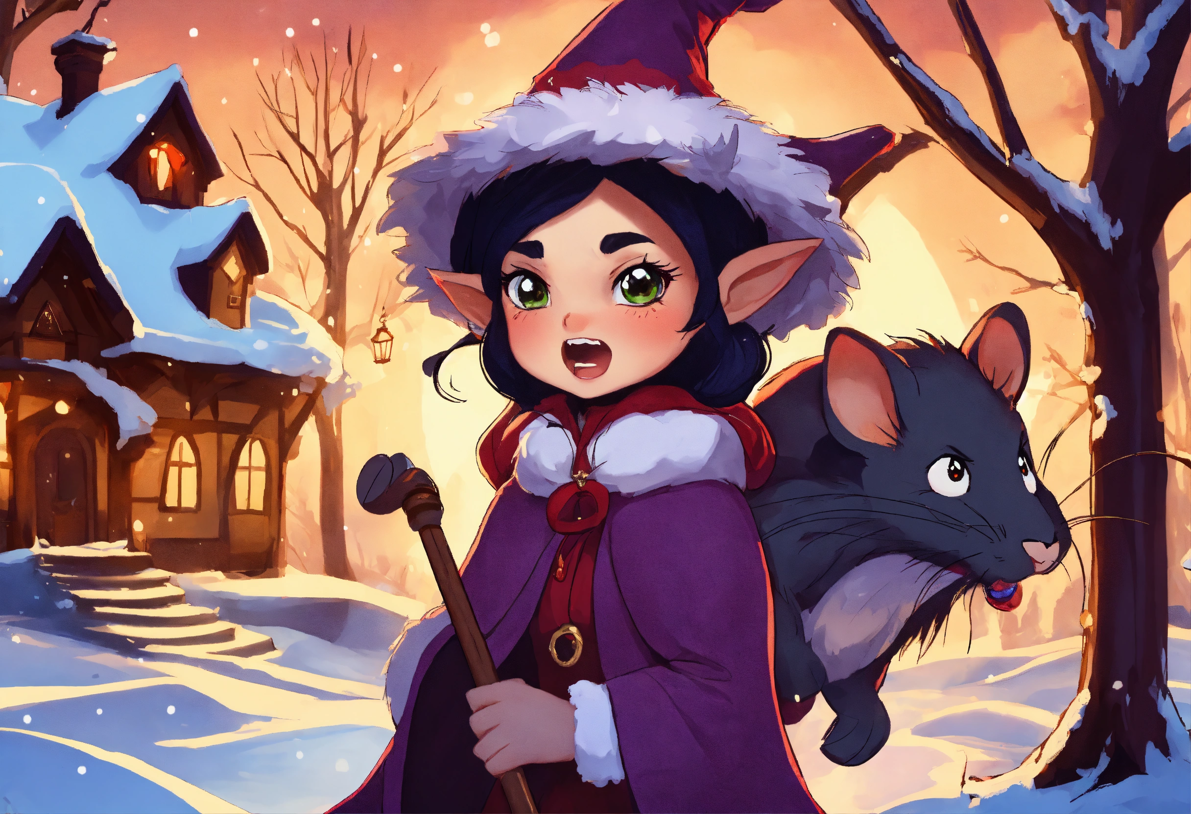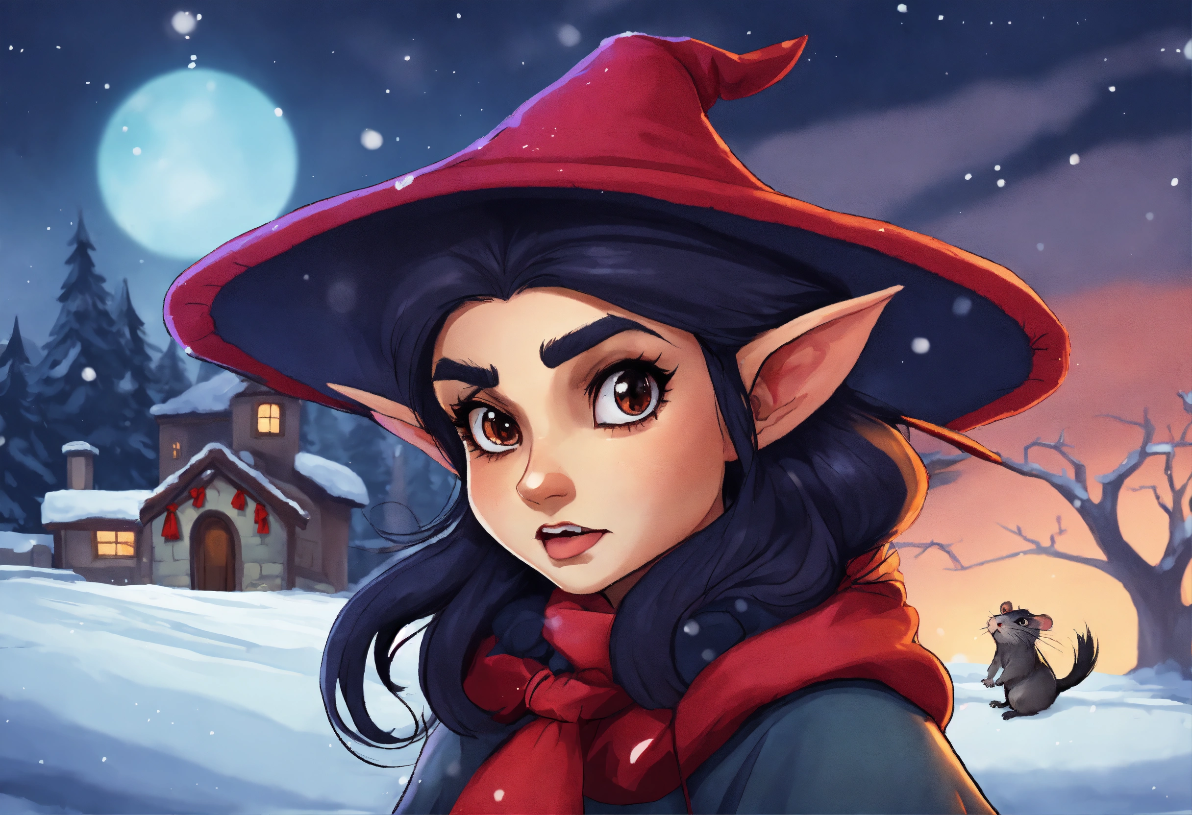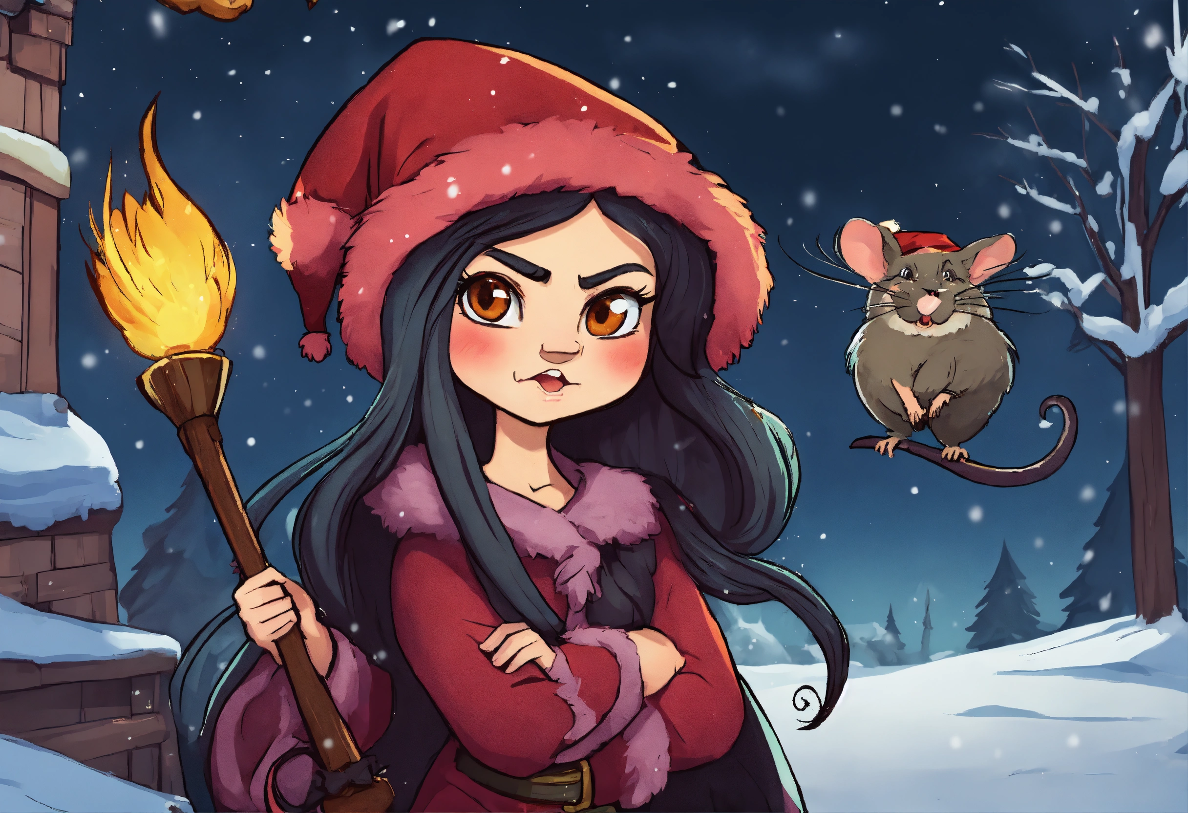 Cartoon russian fairy taie style image angry witch with dark hair with fairy rat helper funny face winter christmas time