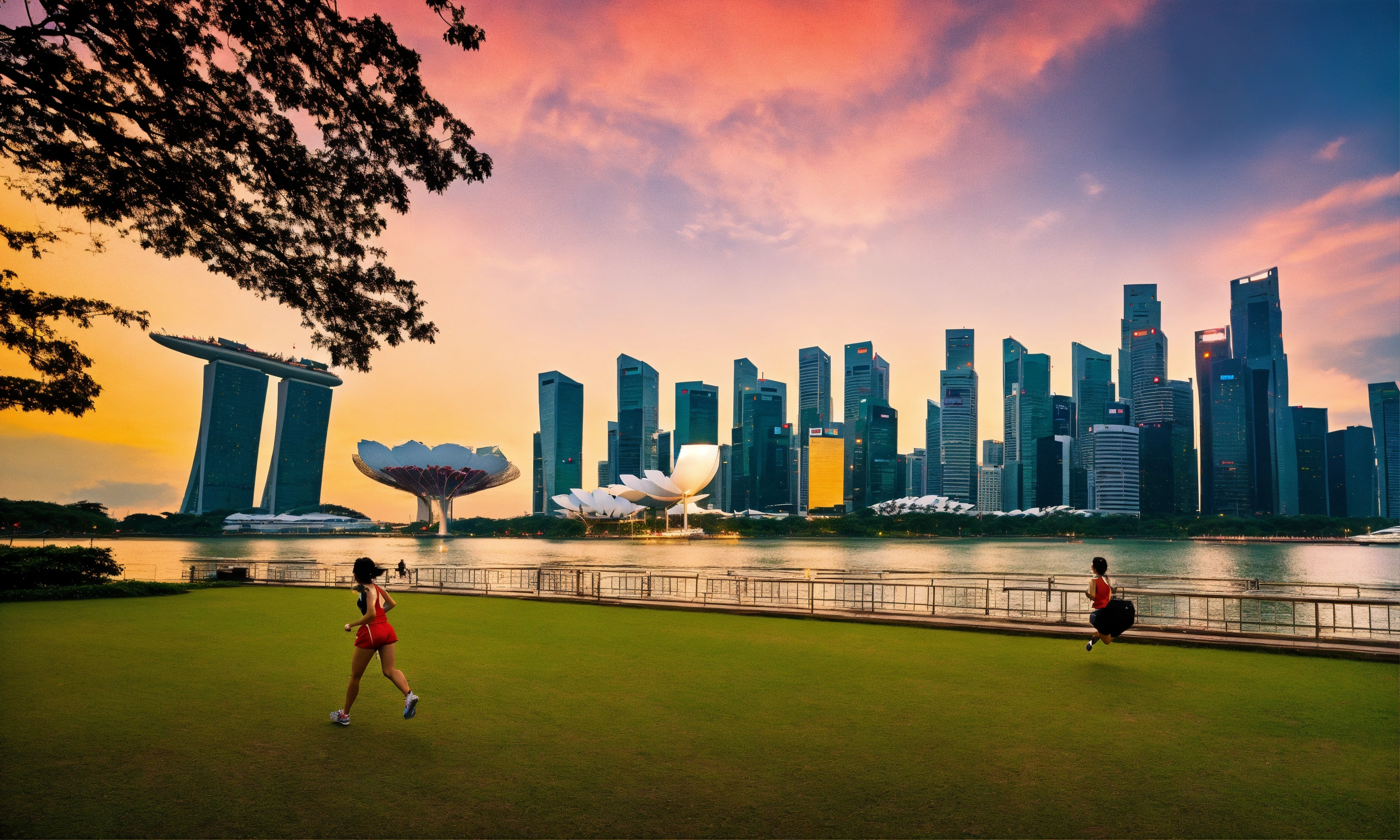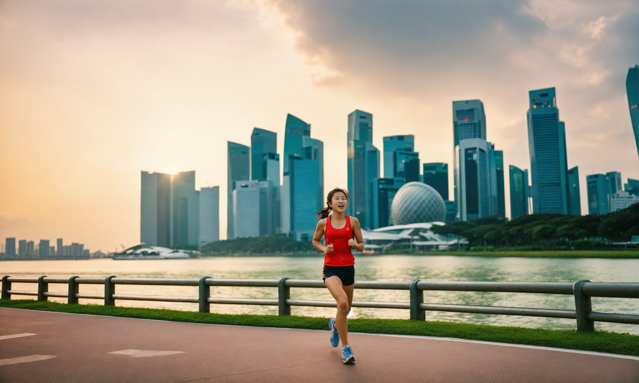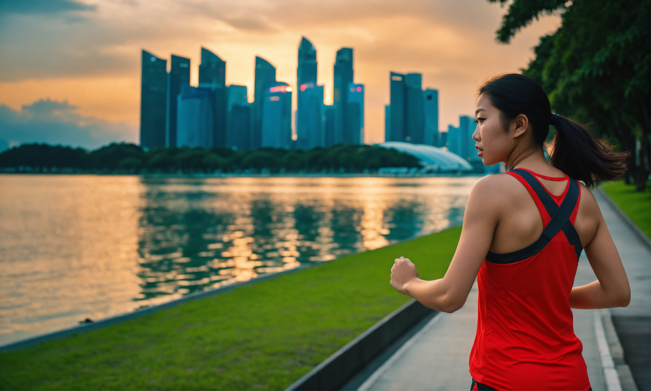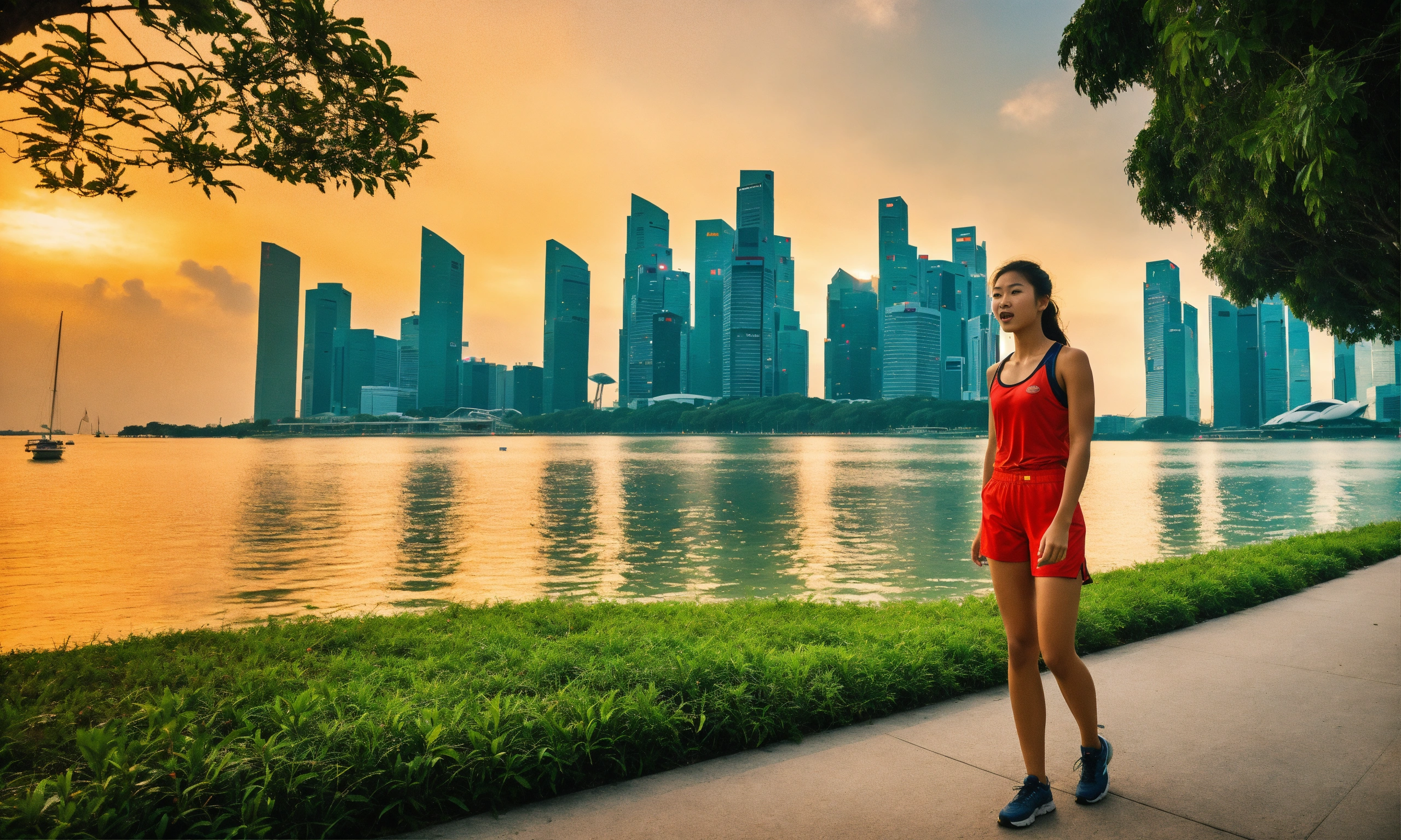 Full establishing shot of singapore's east coast park, towering trees, backdrop is the iconic singapore cityscape rises with modern skyscrapers and marina barrage, an athletic 18-year-old asian girl running in the centre of the screen, a sleeveless plain red singlet, determined expression and vibrant attire symbolize the energy of this unique urban park, a leica summicron 35mm f2.0 lens to enhance the colors, shooting with kodak portra 400 film to add cinematic richness.