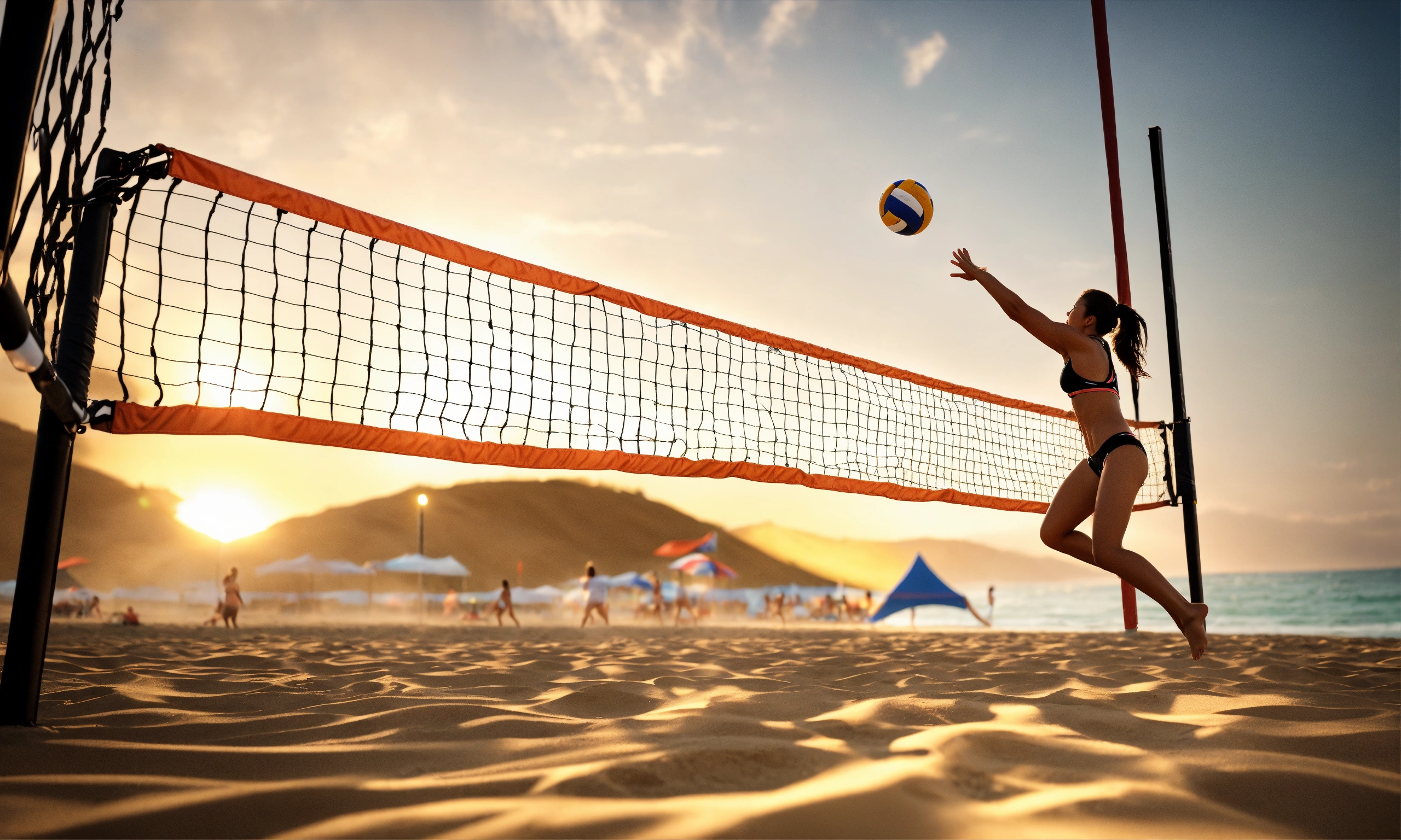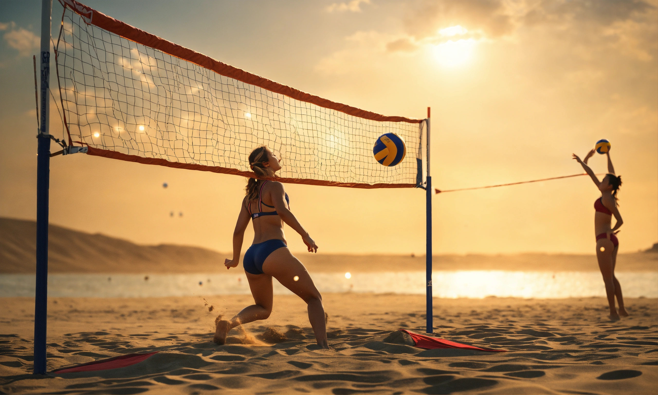 Women's beach volleyball on the sand. girl jumps and hits the ball over a volleyball net. female back bodies, girls game with a grid. team, group sport game. summertime. octane render, trending on artstation, highly detailed, lighting, professional, realistic, sharp focus, 4k, 8k, high resolution, candid, personal, –testp, bright lighting, ultra-detailed, bright lighting, photo, high quality photo, cinematic shot, volumetric light, imax