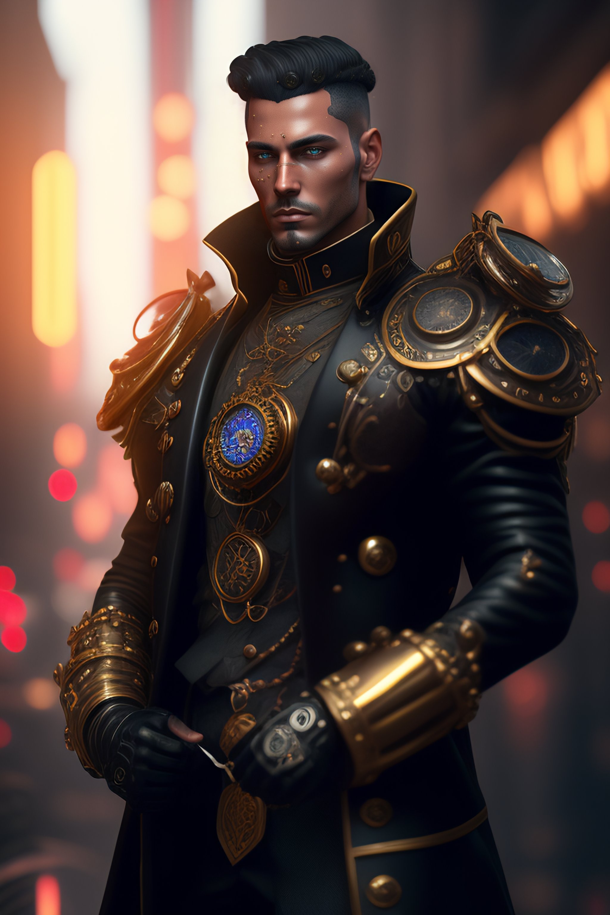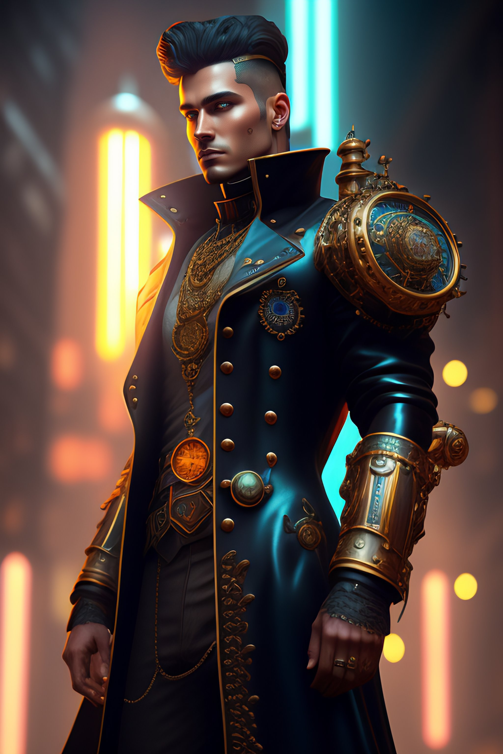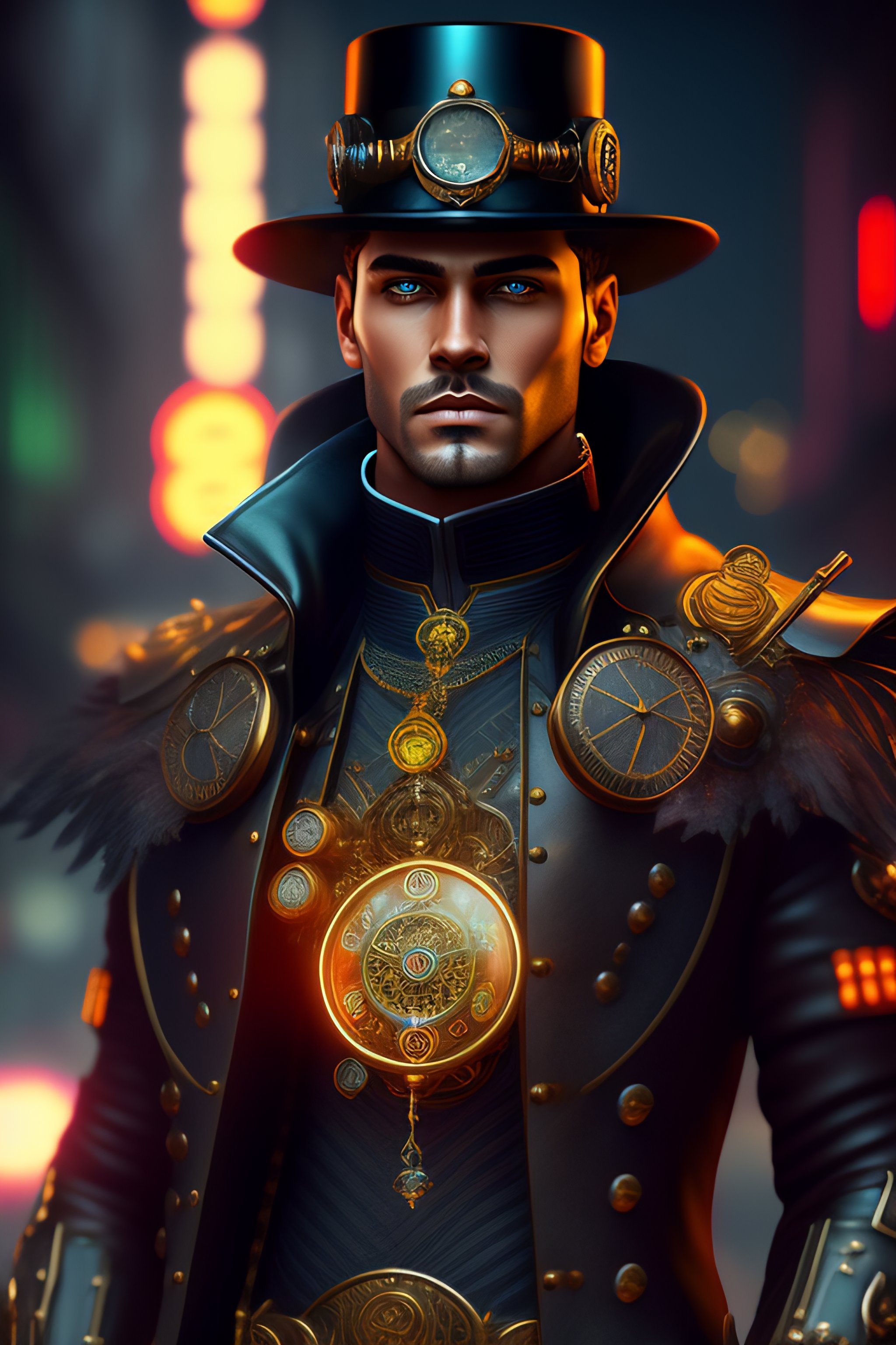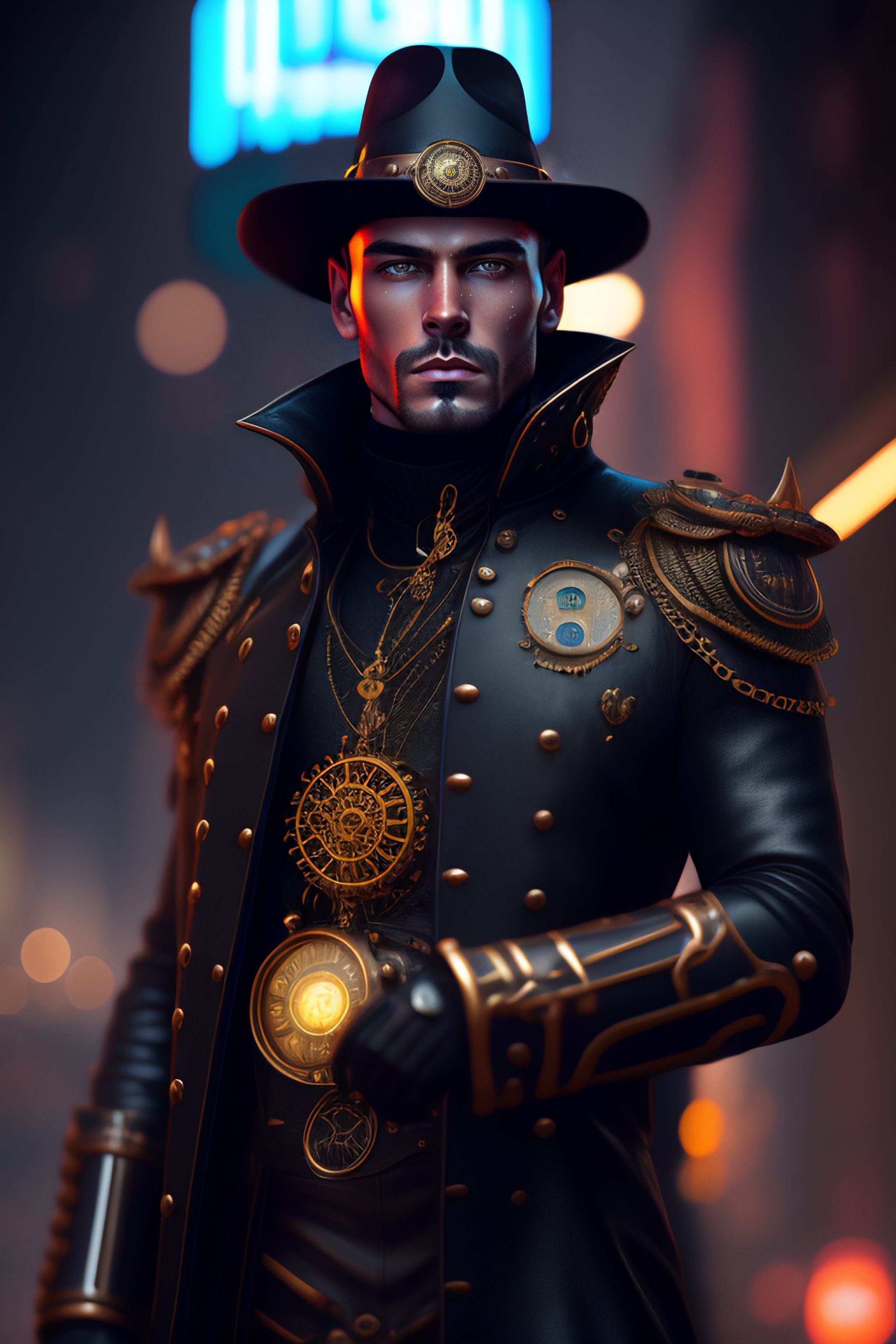 Steampunk man with a clockwork holding in his hands, wetlook, abstract black oil, gear mecha, detailed acrylic, grunge, intricate complexity, rendered in unreal engine, photorealistic, neon ambiance