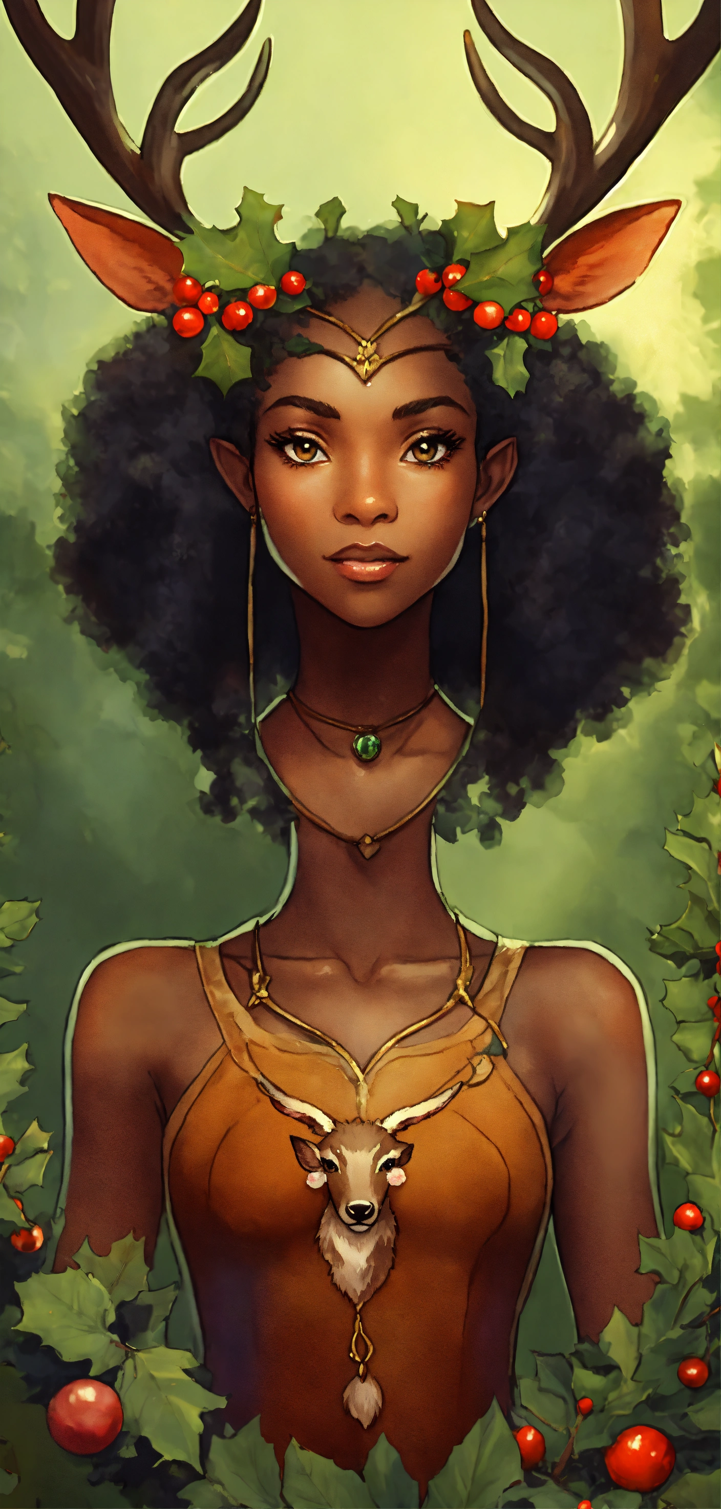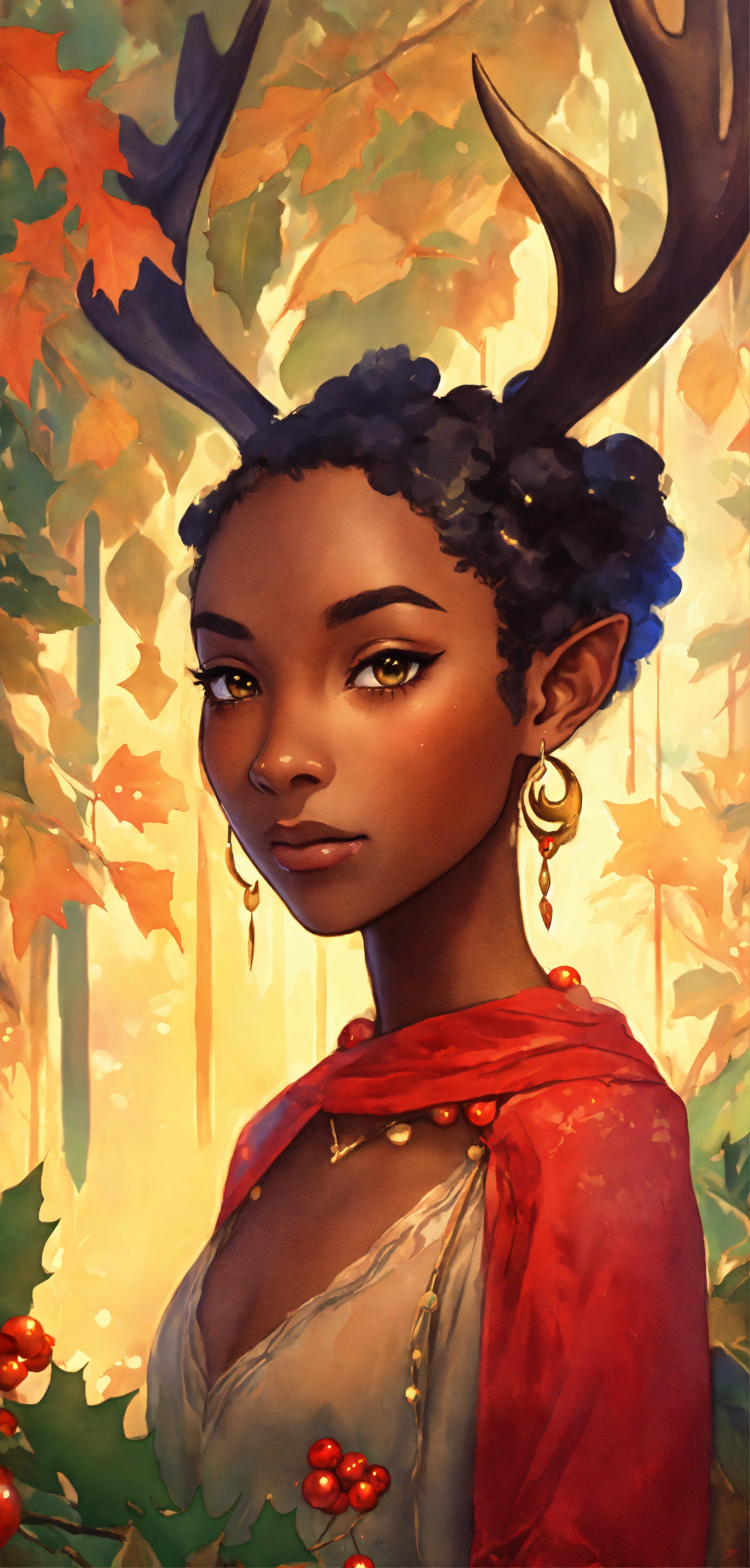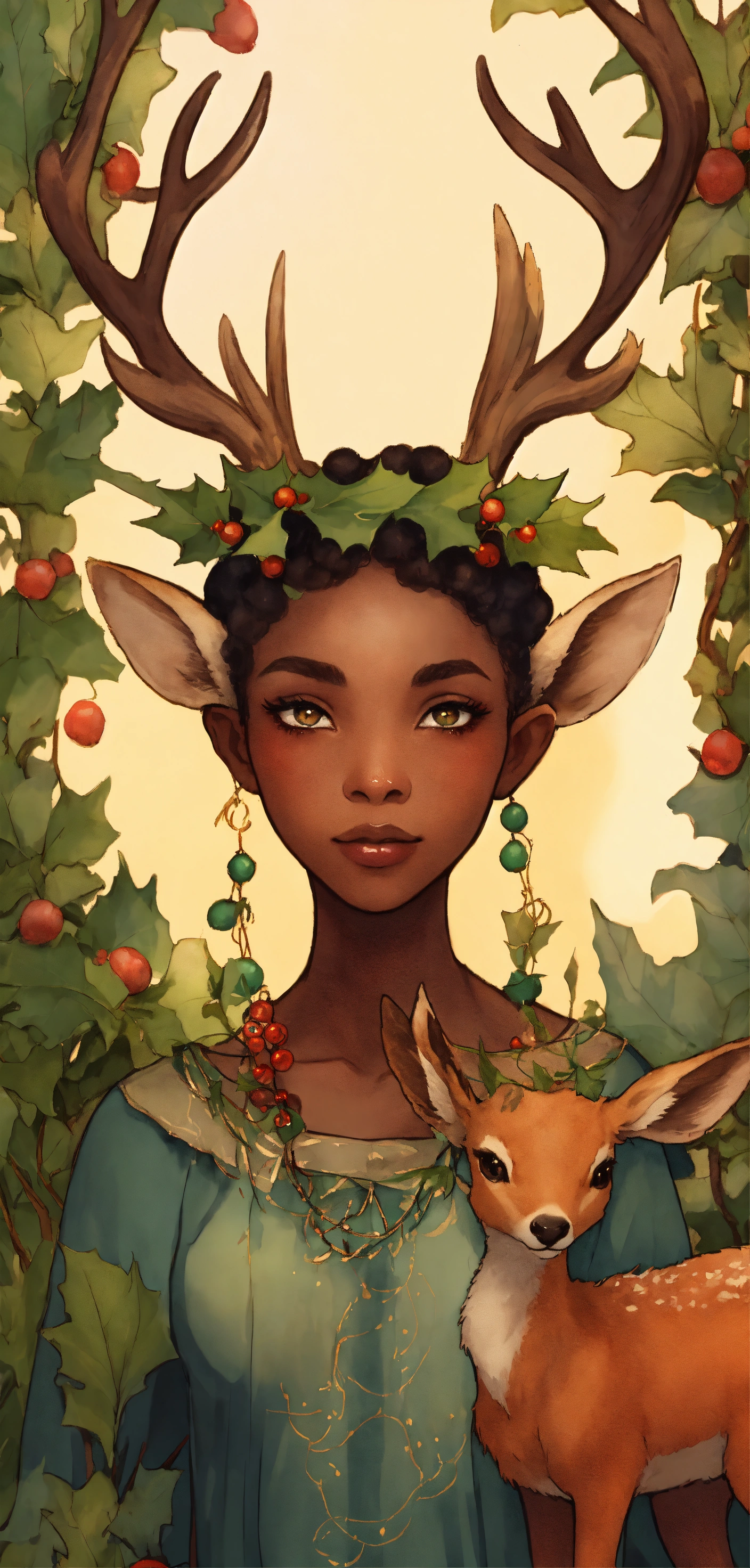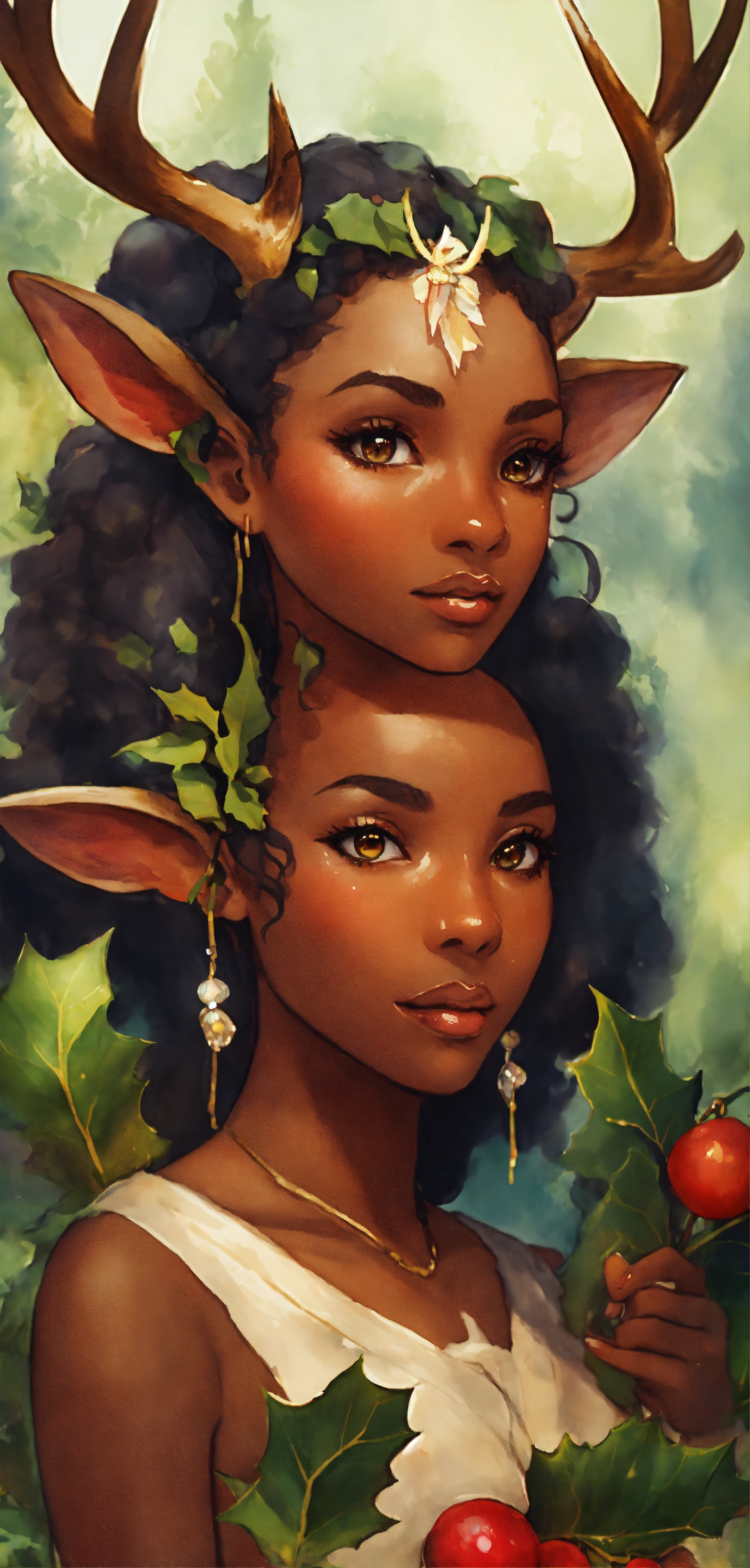 Sans antlers, deep complexion extremely pointed eared black woman elf with a second set of deer ears standing next to a fawn. bright moist and soulful eyes. dreamlike fantasy fractal watercolor within a holly berry garland vignettes. storybook ghibli style. rule of thirds