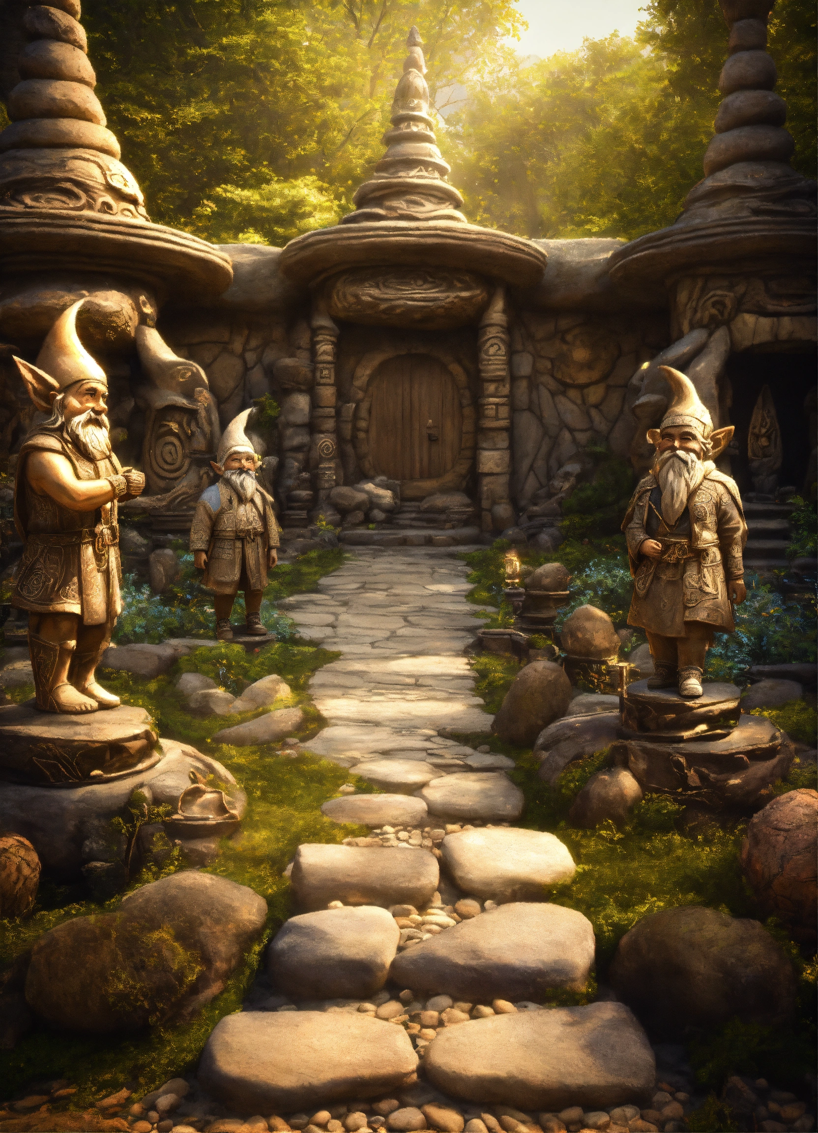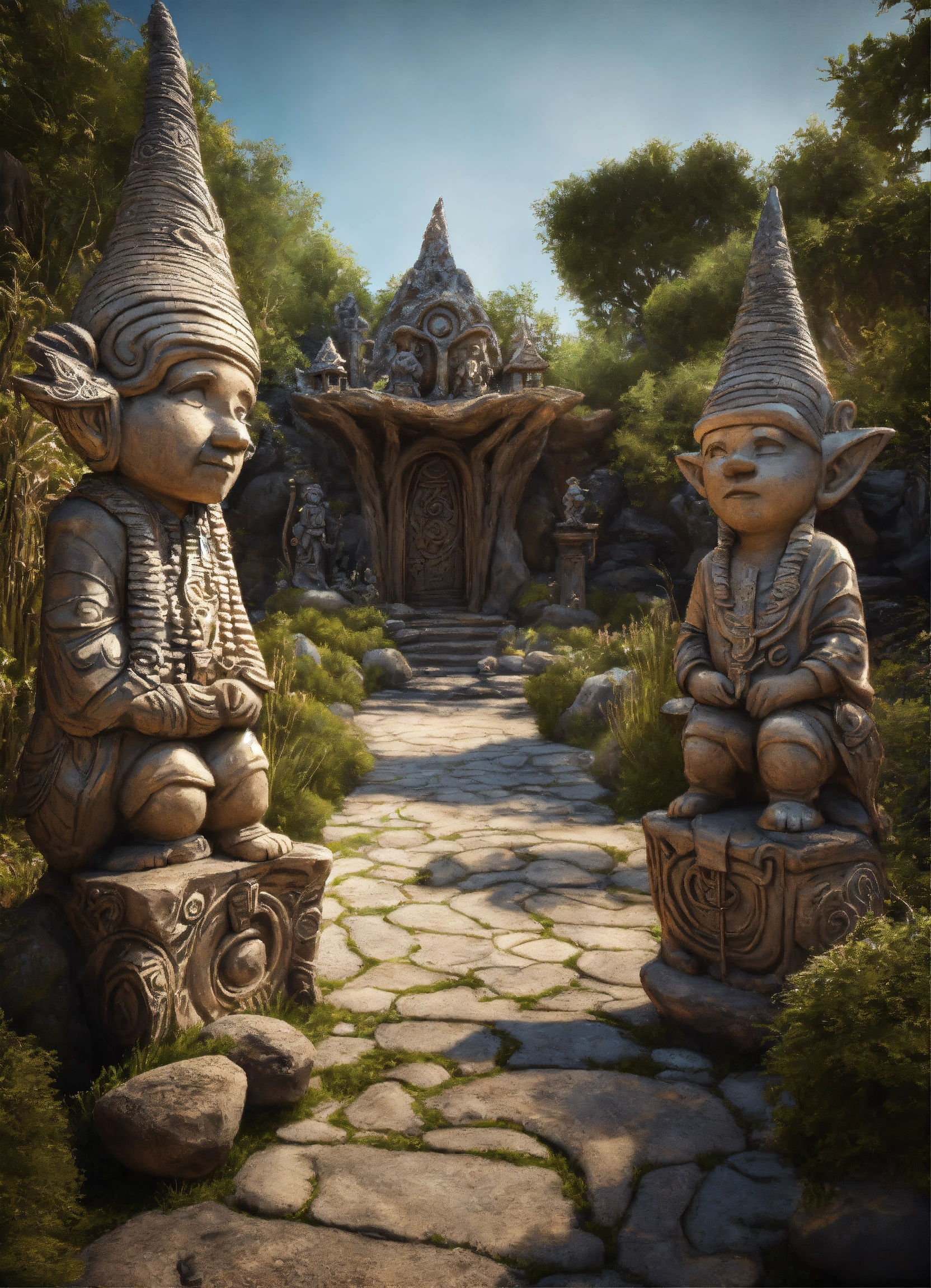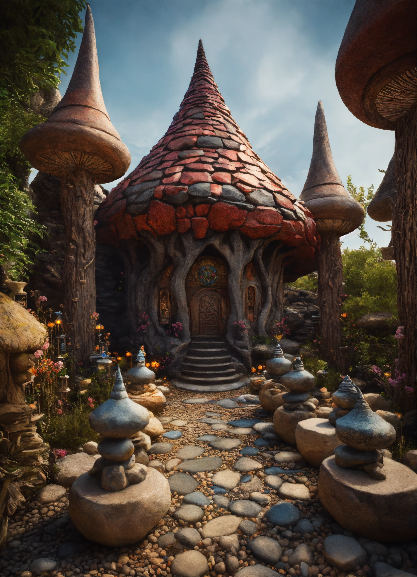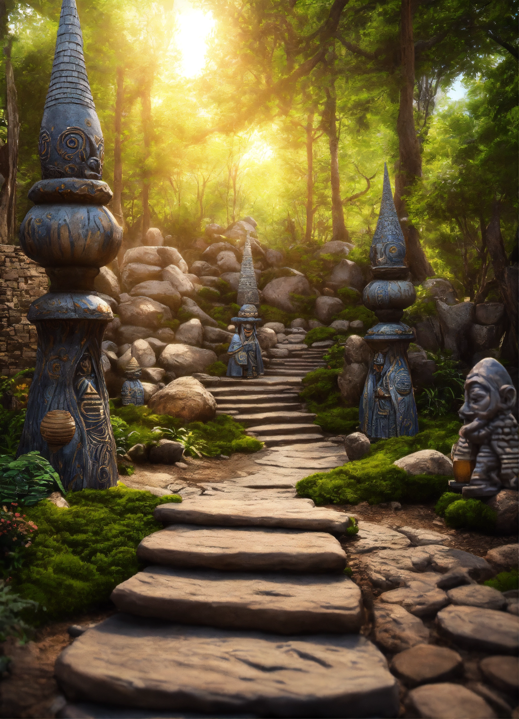 An ancient spiritual gnomes stone pathway rock garden.sculptured . style of alex grey, giger.unreal engine.totem sculptures.swirling patterned stone pathway courtyard.wood.stone.driftwood.statues. artistic sculpture.lanterns.