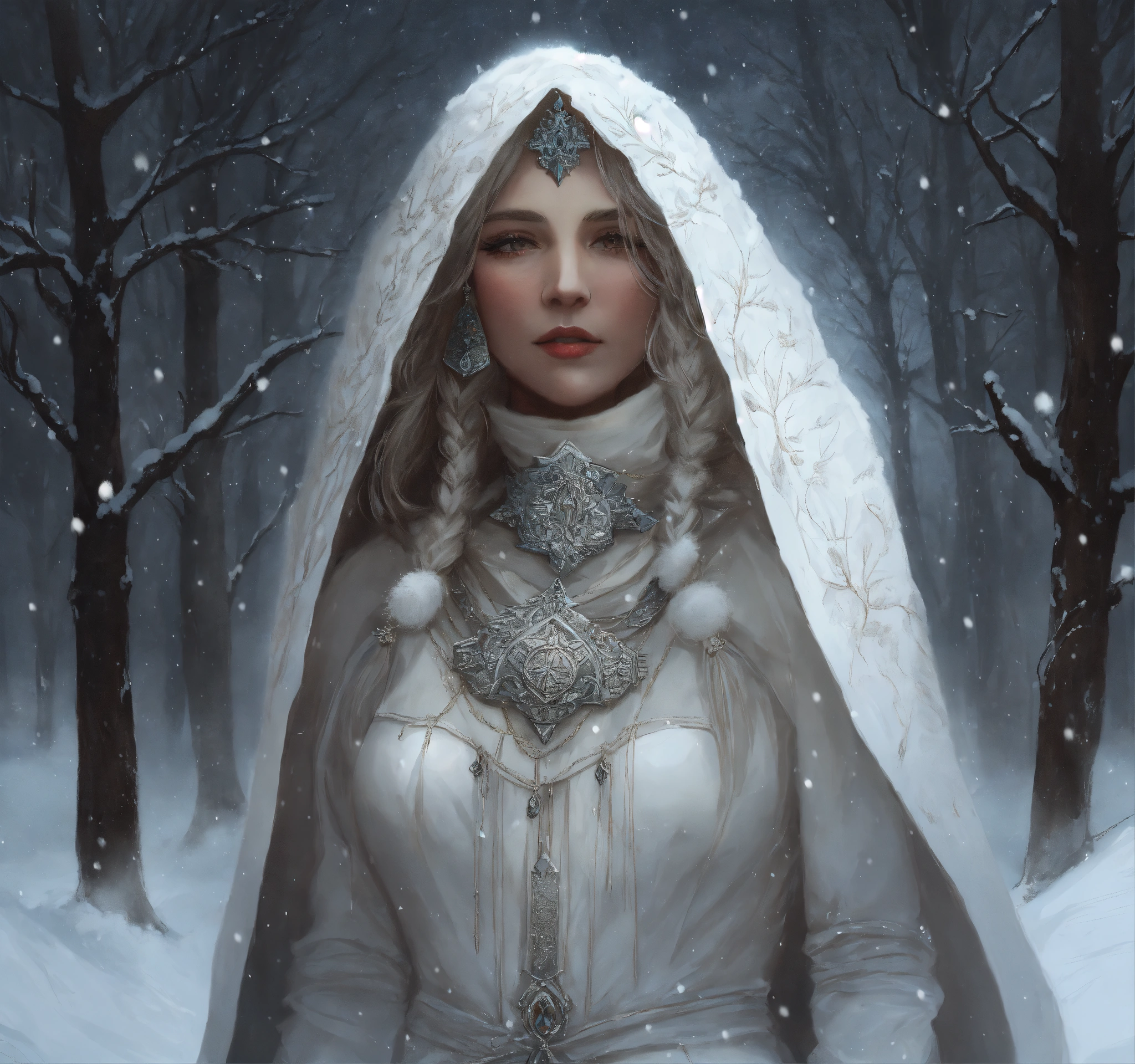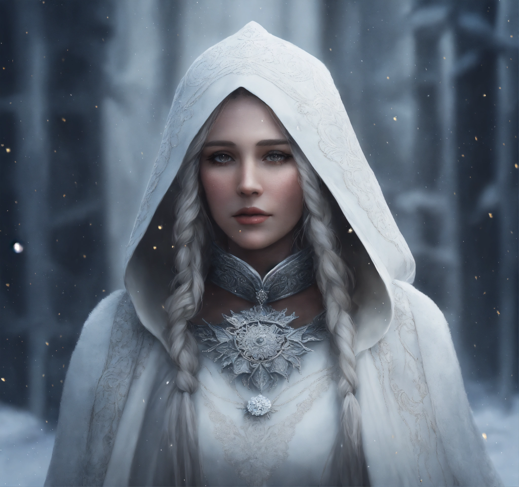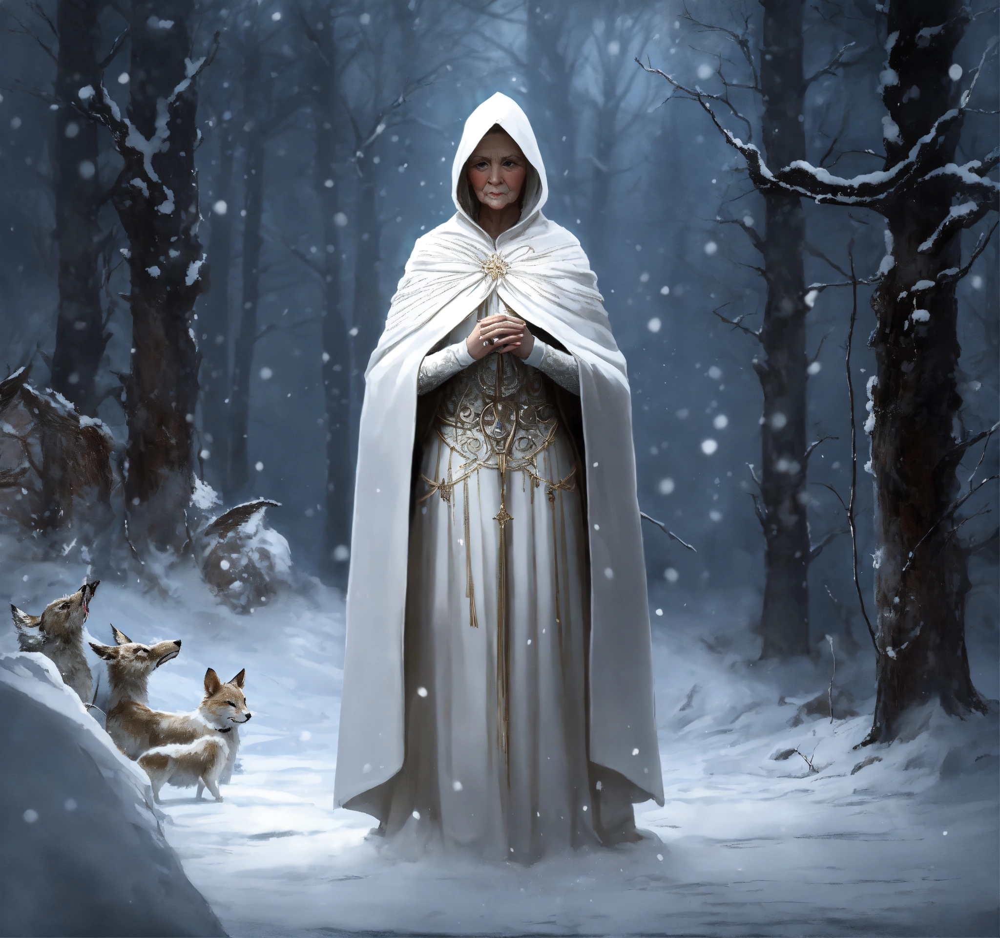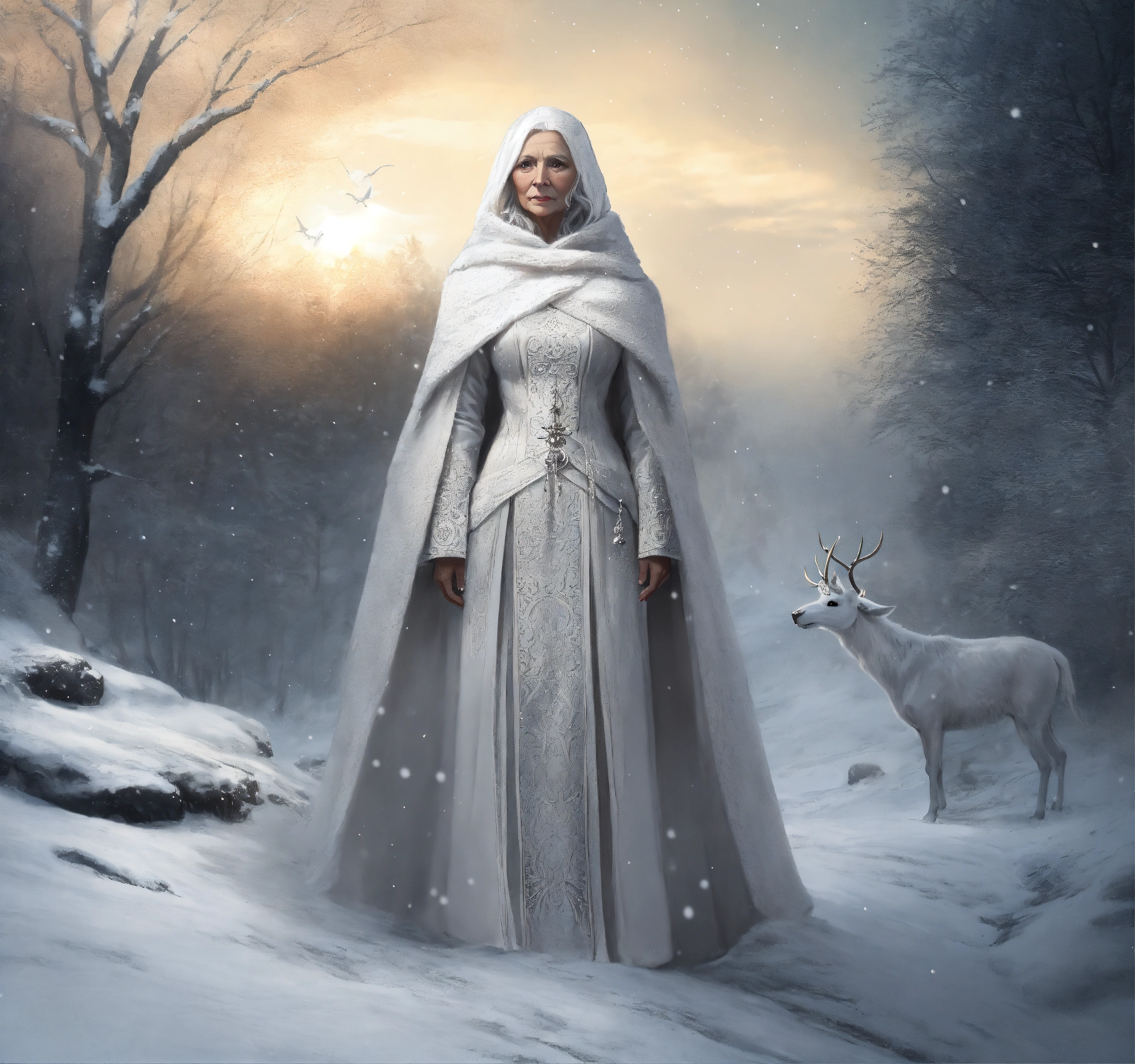Mother of the north, old lady in white clothes, snow, aurores boréales, intricate art, dark fantasy style