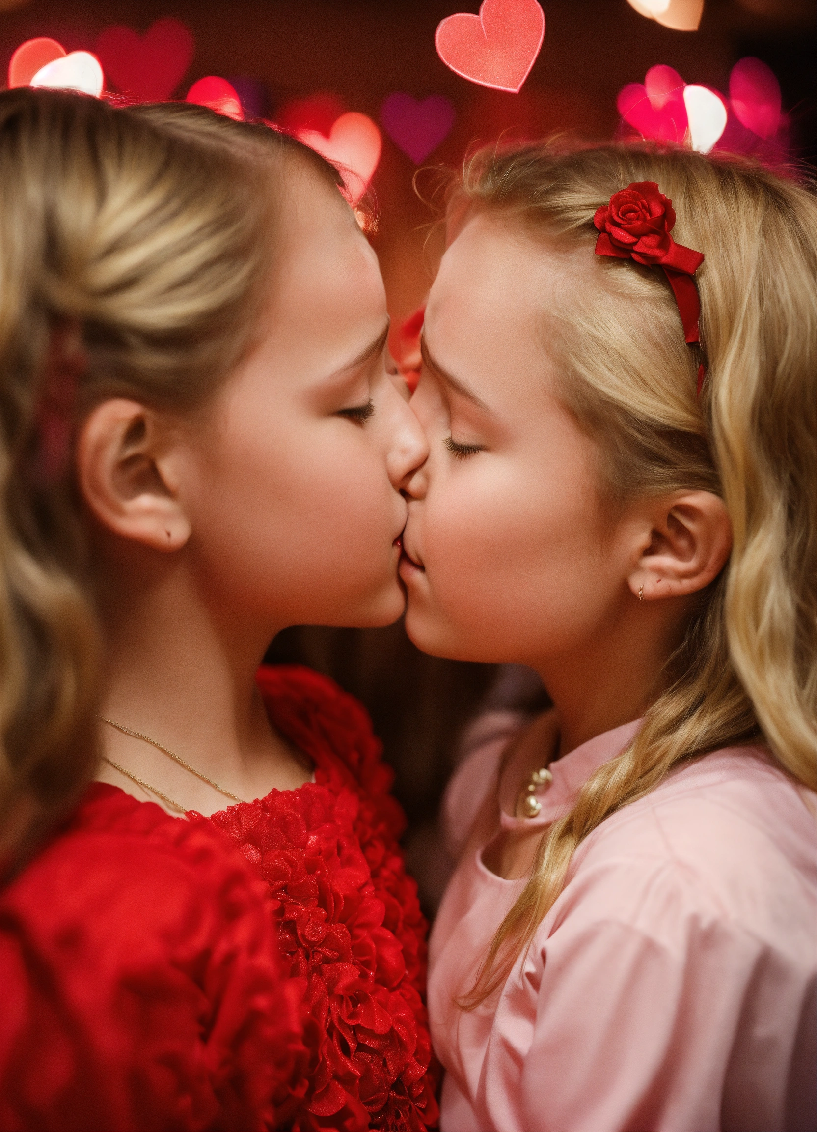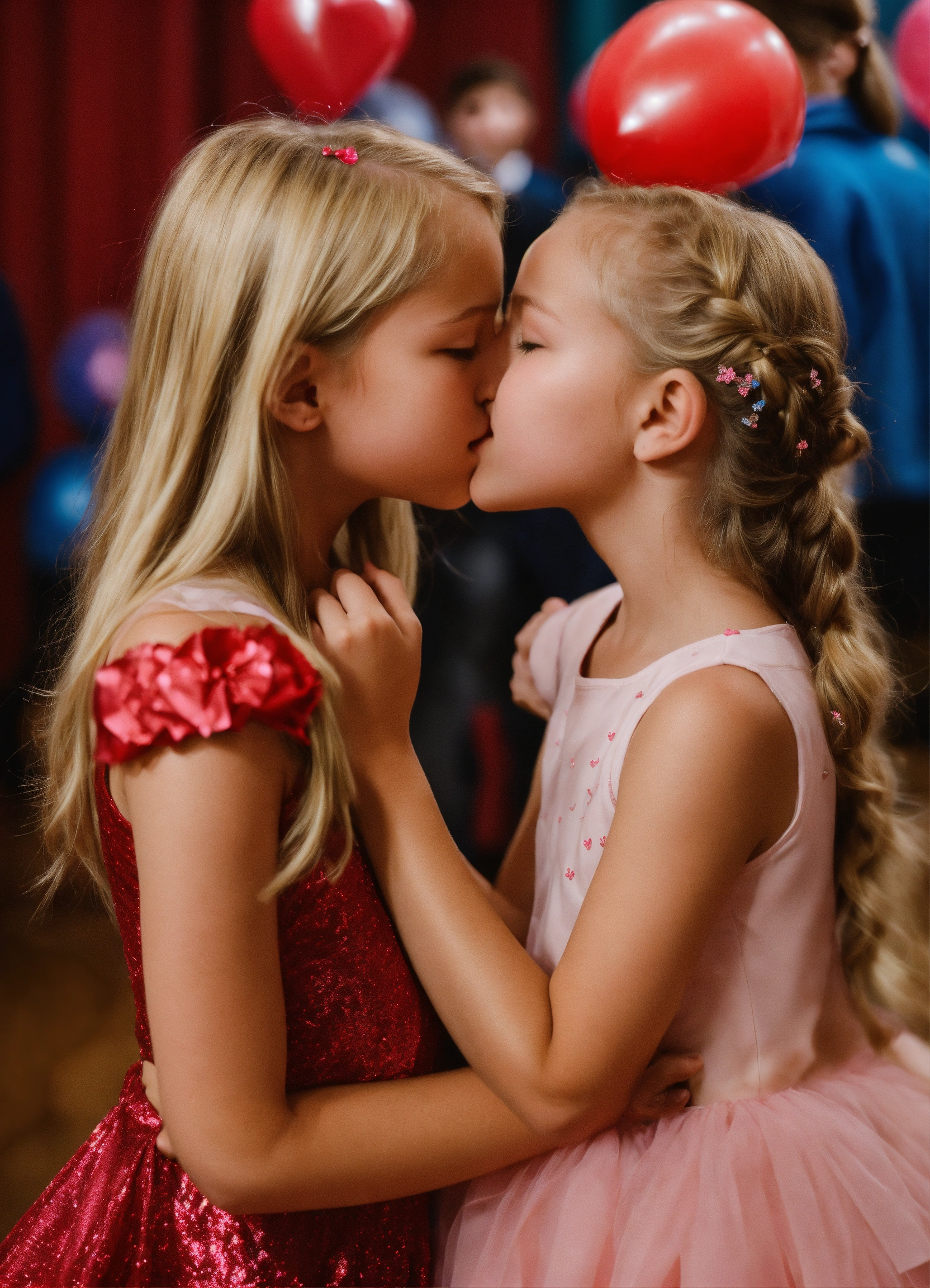 A 10-year-old blond girl kisses her best girlfriend during her school's valentine's day dance. loving and romantic, realistic, panoramic view