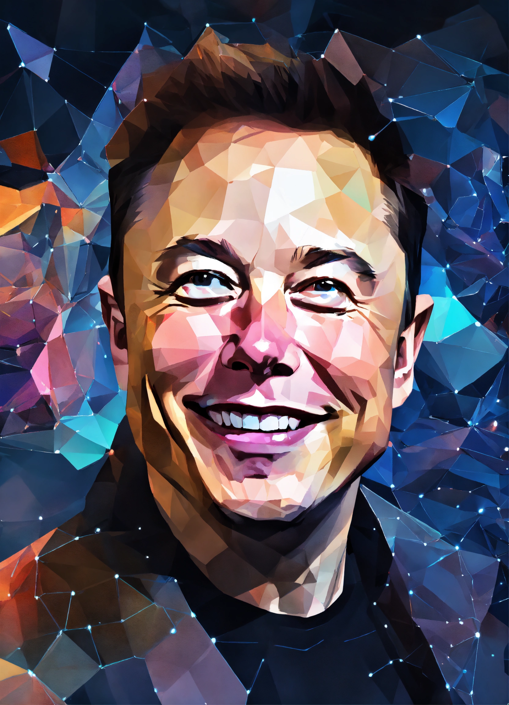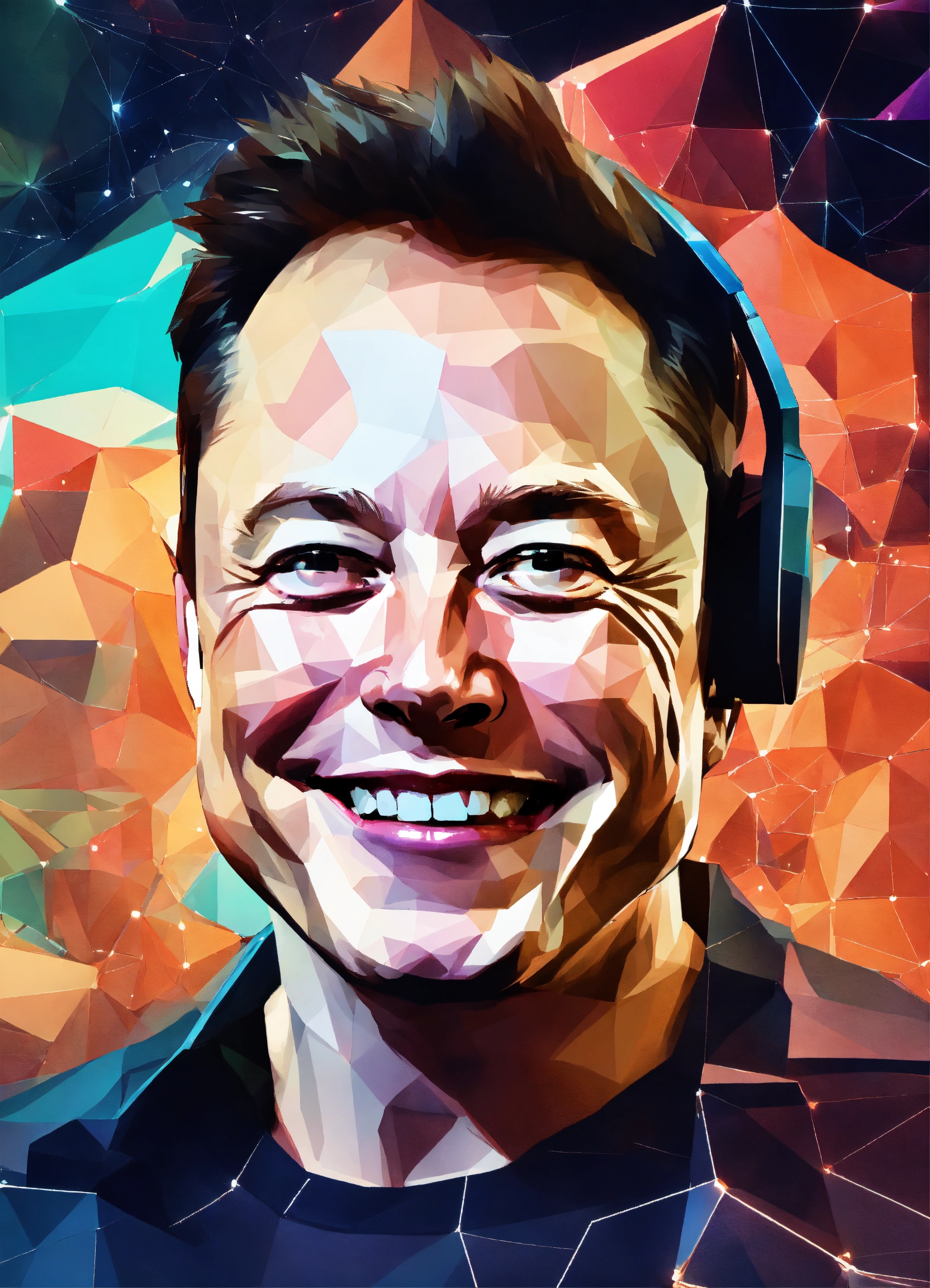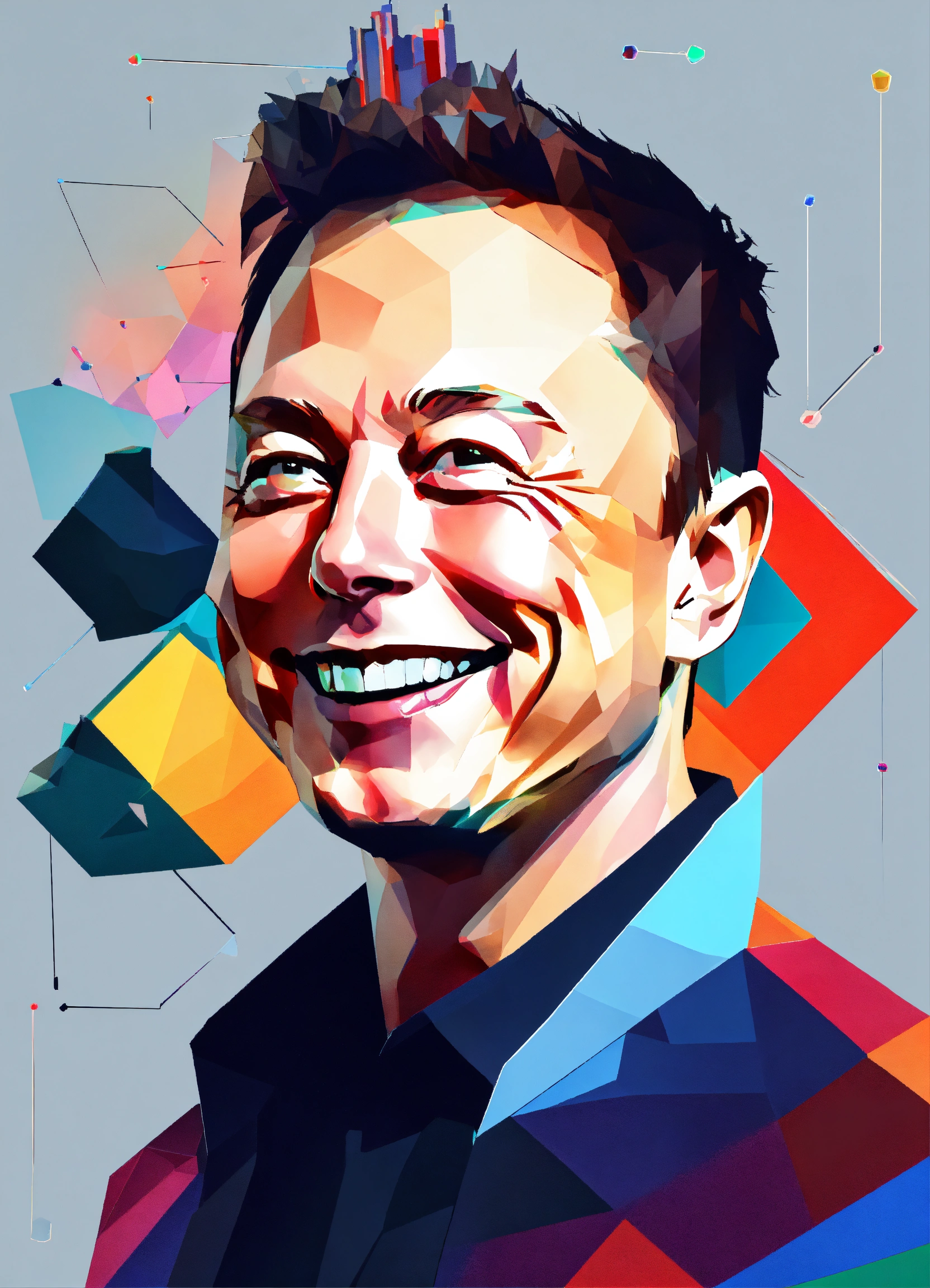 Portrait of elon musk smiling with a big computer interface in the head, very abstract polygon style 3d