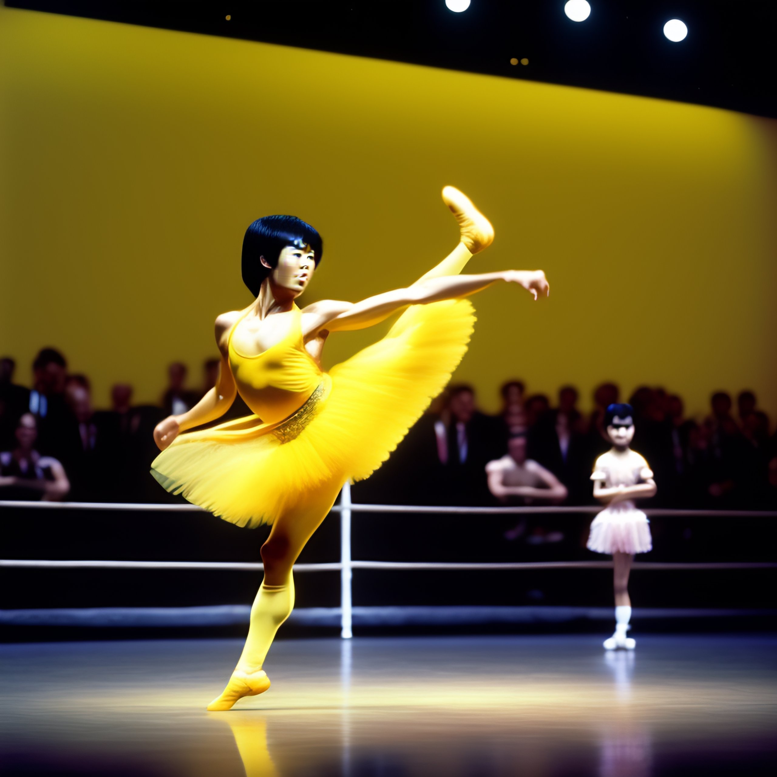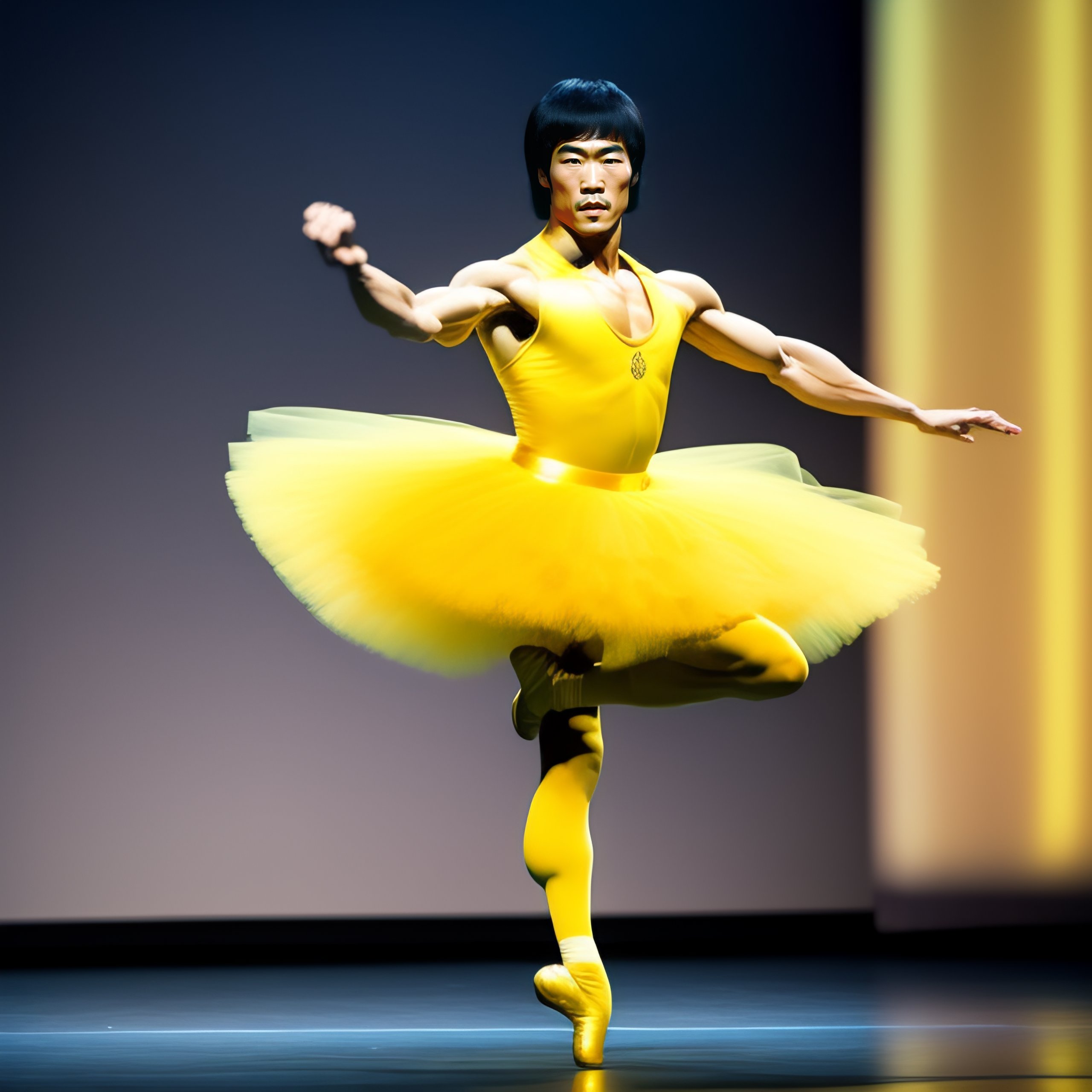 Bruce lee in yellow ballerina tutu dancing on stage