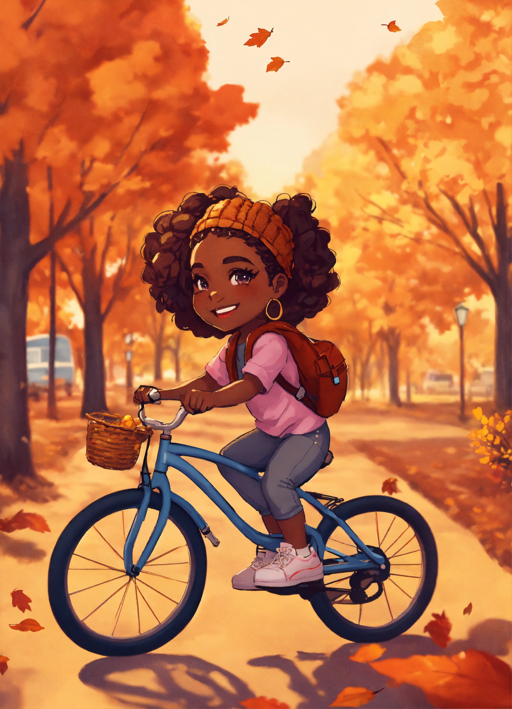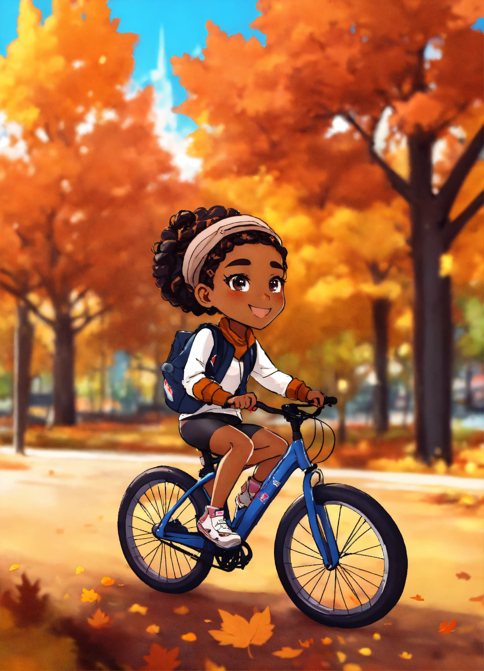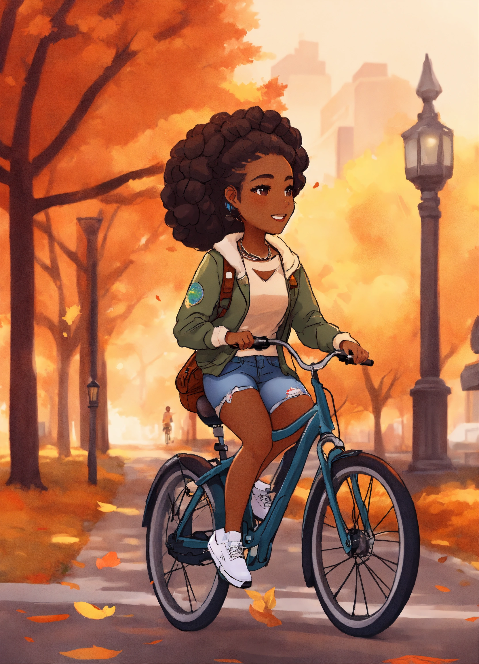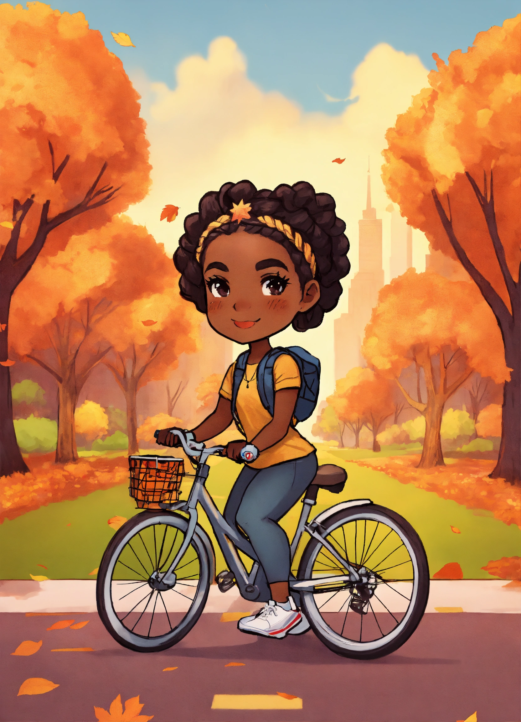 Digital illustration of a chibi african american woman with a braided crown hairstyle, cycling through a city park during autumn. her casual attire and bicycle highlight her adventurous spirit.