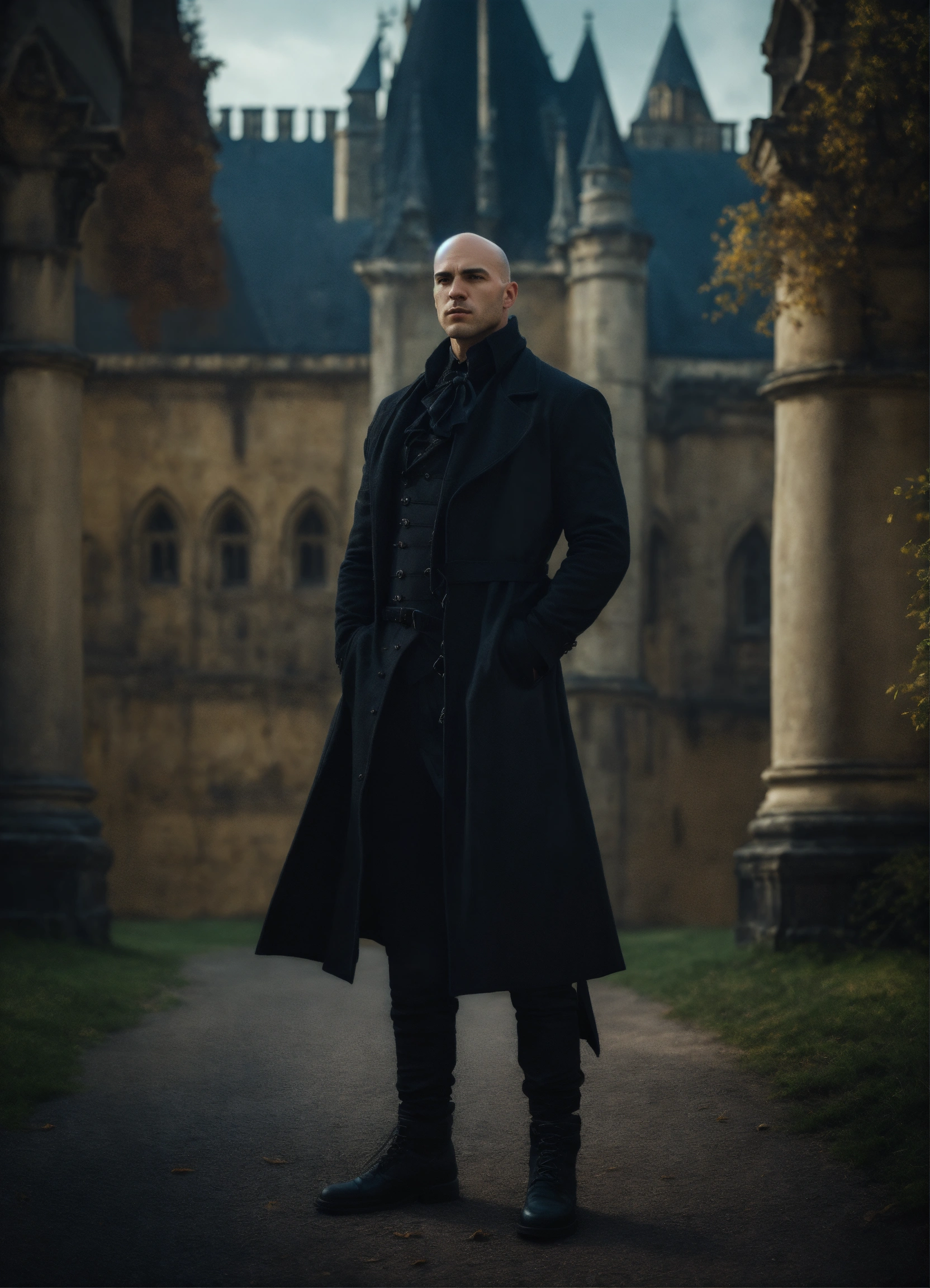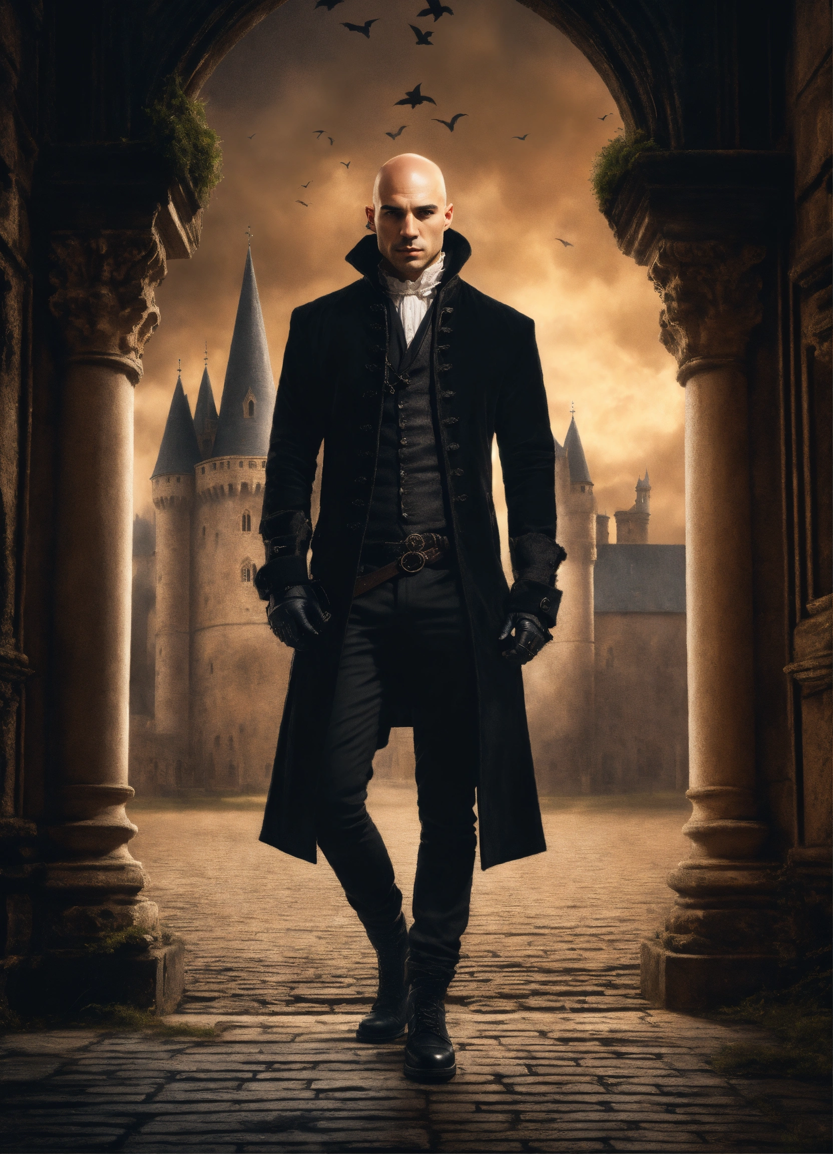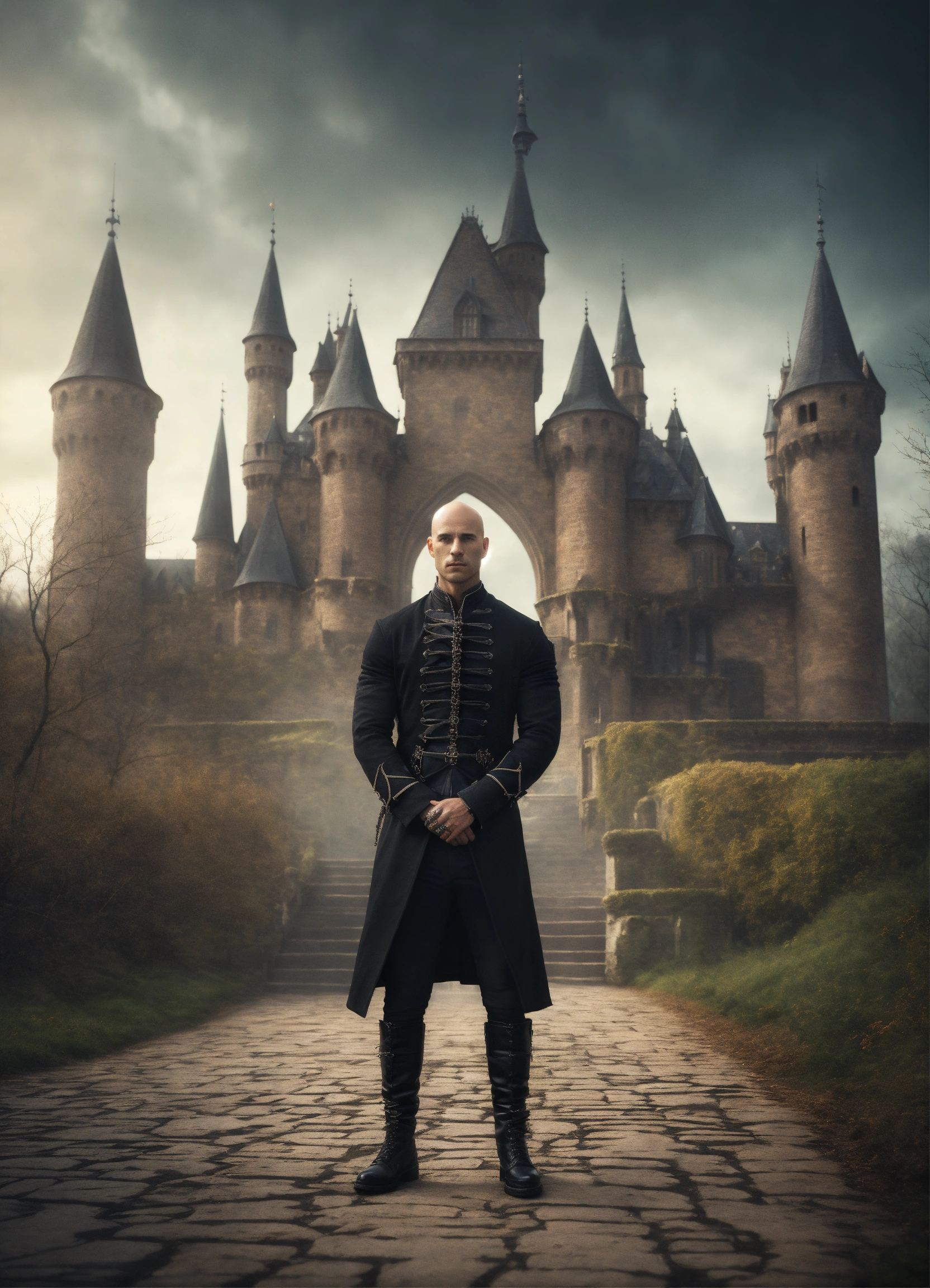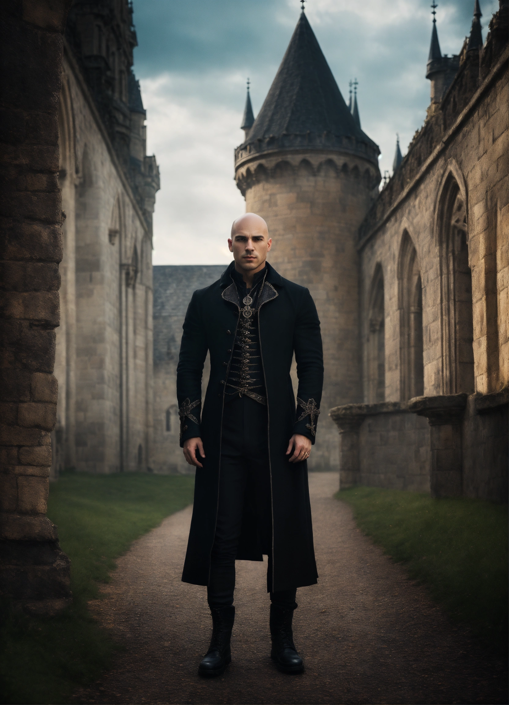 Portrait of a strong handsome young bald man standing in front of a gothic castle wearing a black short coat, mystic, dark fantasy, realistic photo, high detail, digital painting, cinematic, stunning, hyper-realistic, sharp focus, high resolution 8k, insanely detailed