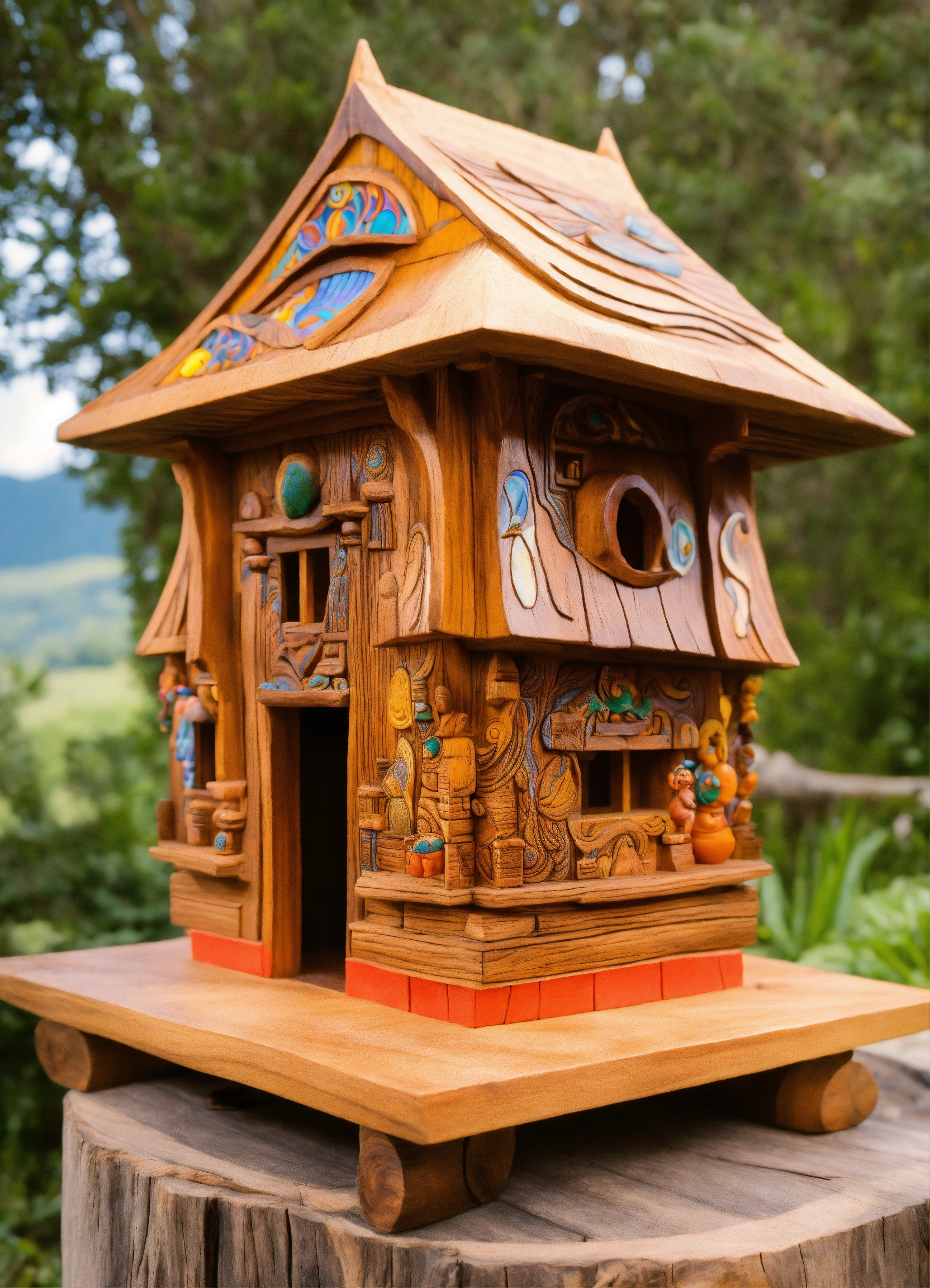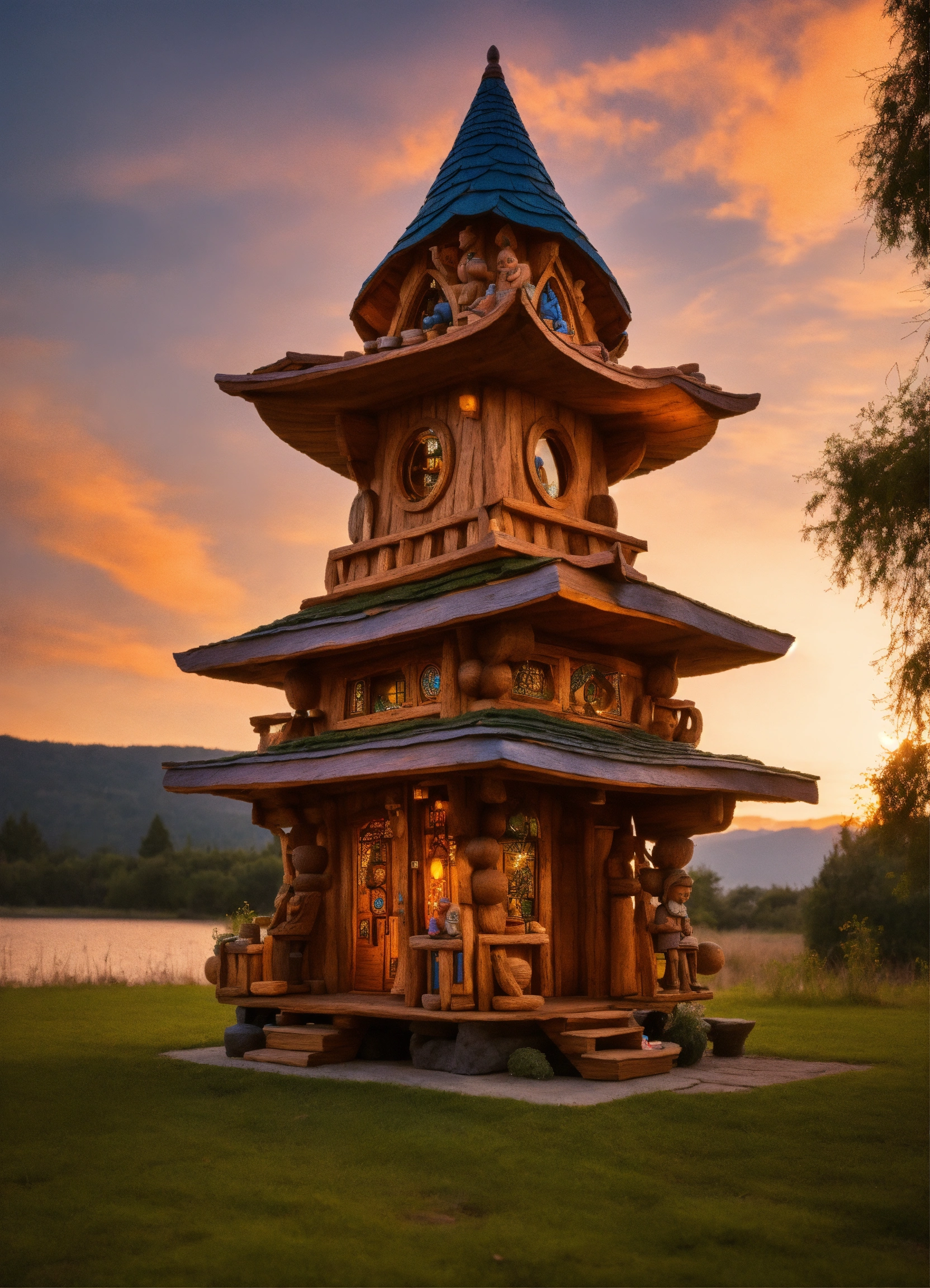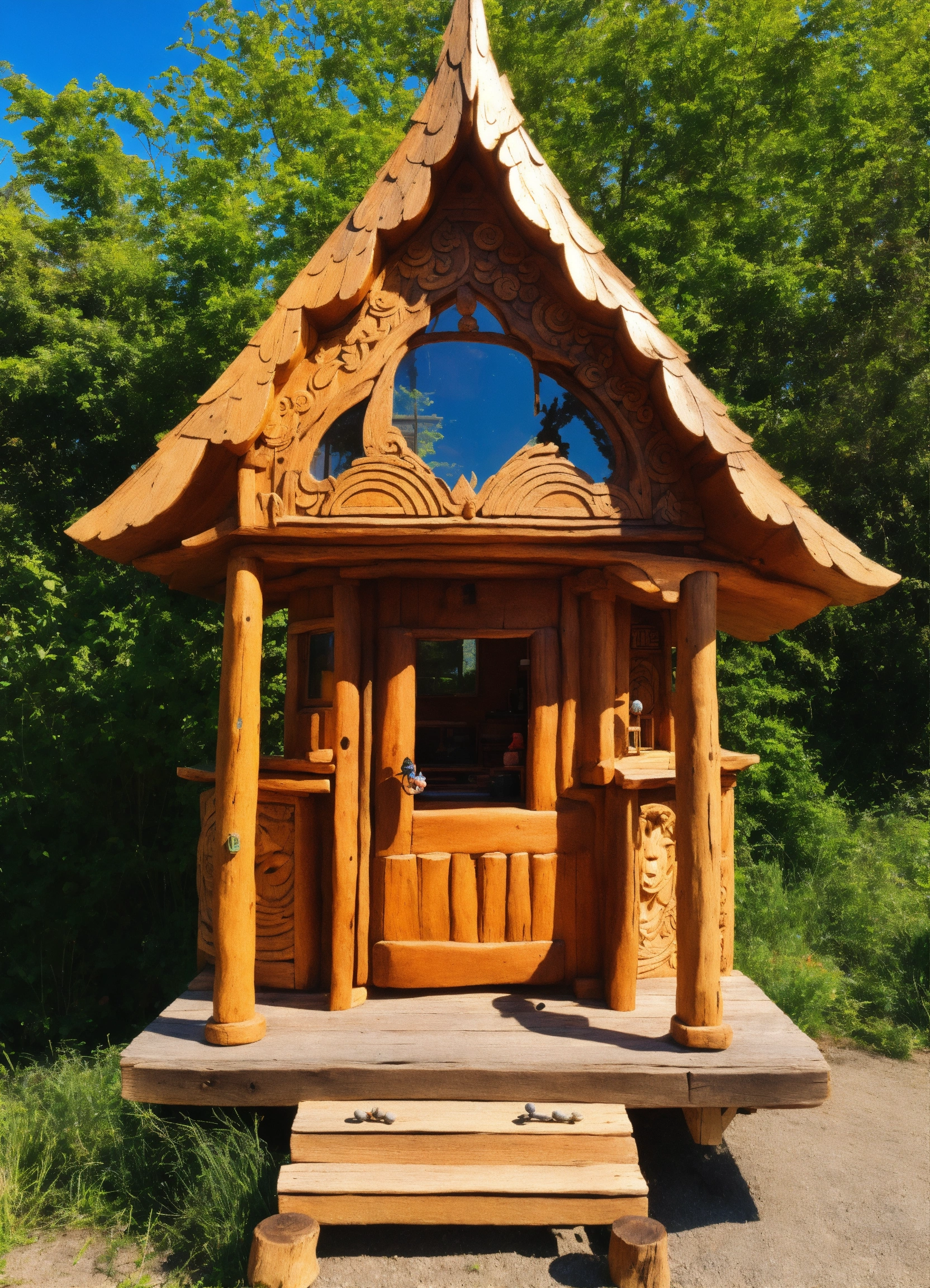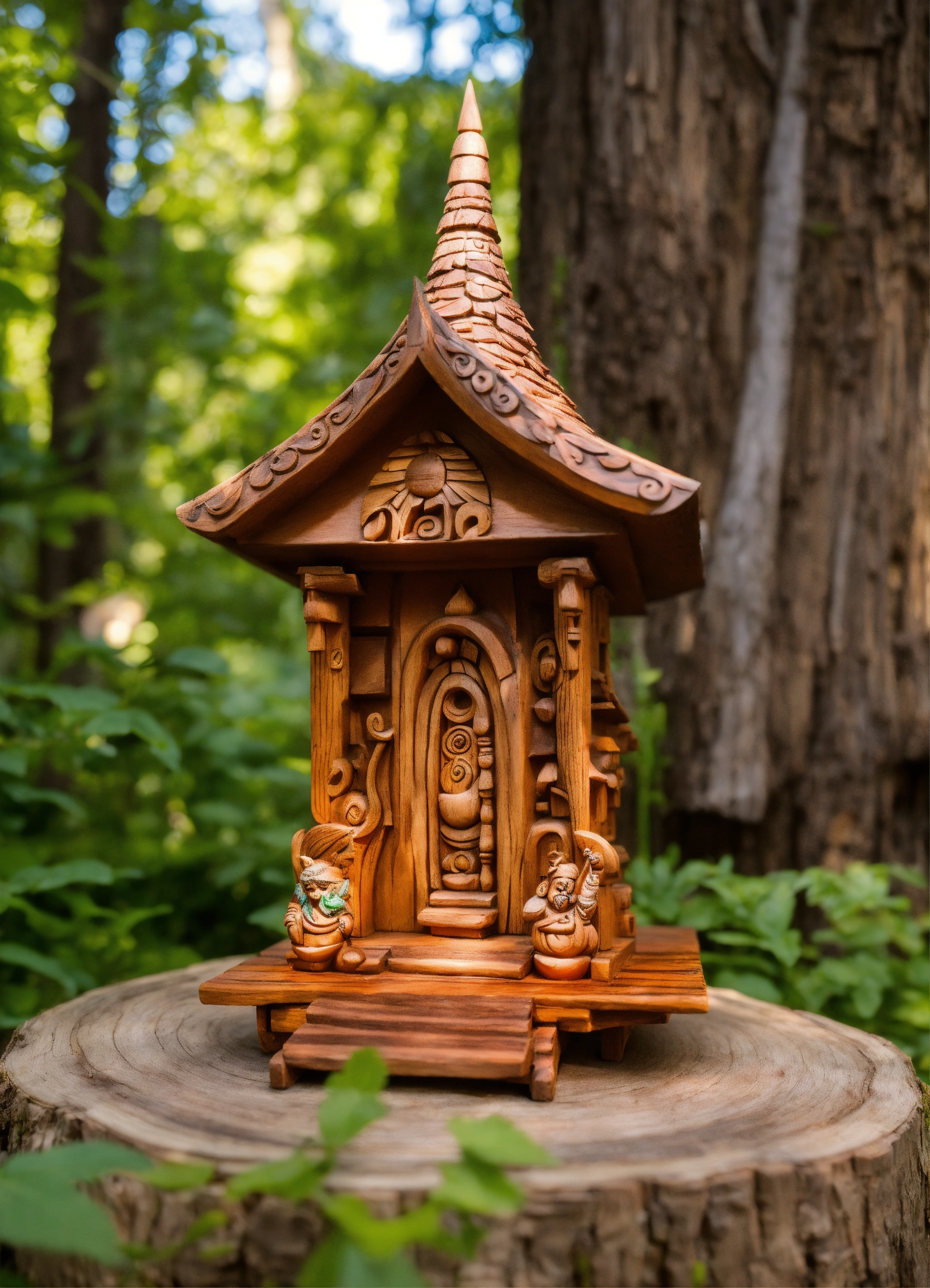 An ancient wooden temple hand made meditative sculptured tiny house in the style of alex grey, gnome, totem, air bnb