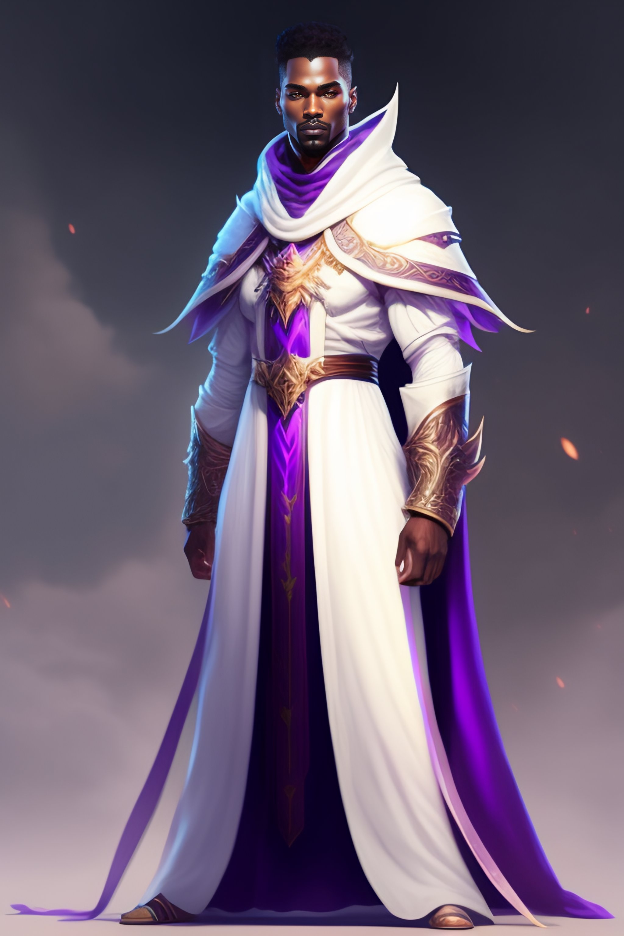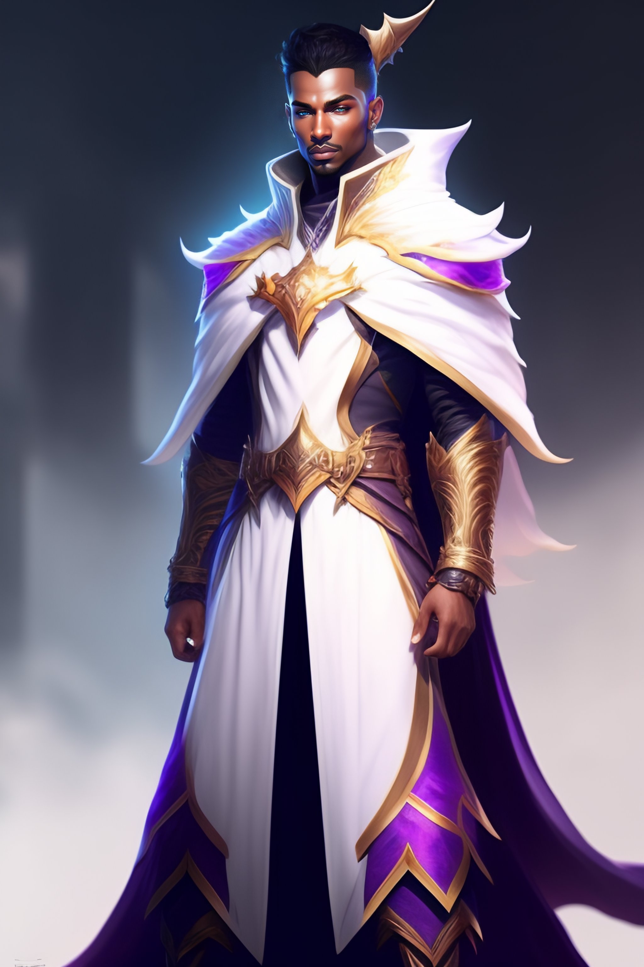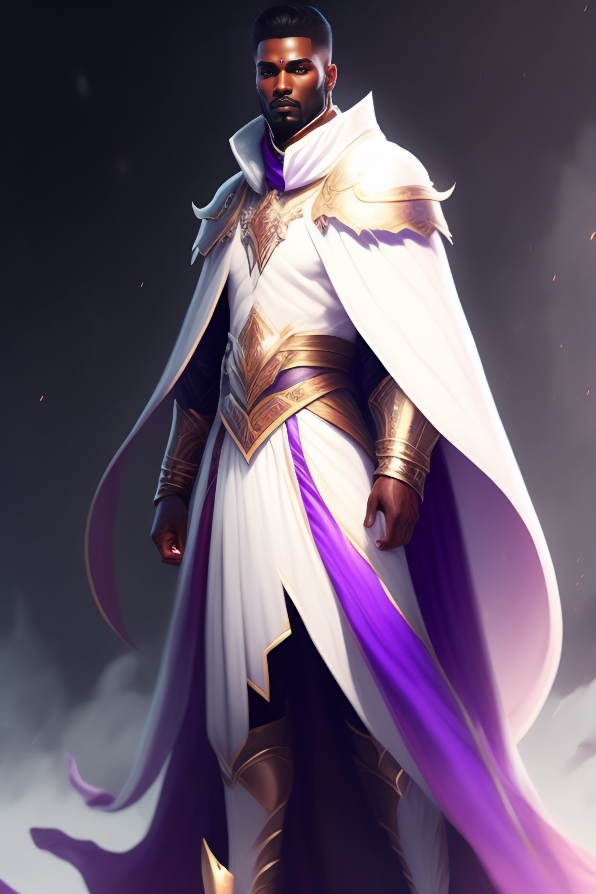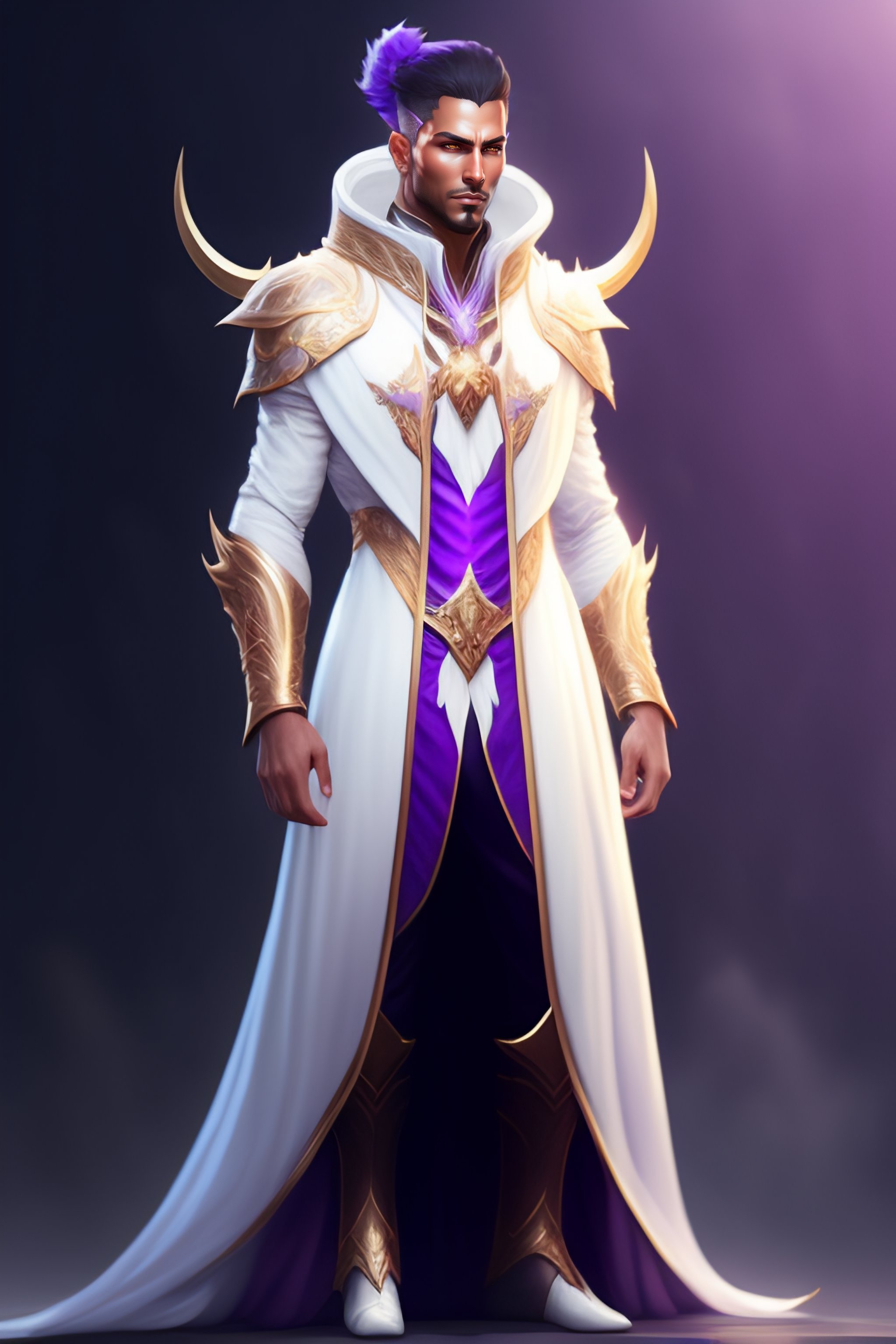 Man male, full body white purple cloak, warlock, character concept art, costume design, illustration, black eyes, white horns, trending on artstation, artgerm, wlop