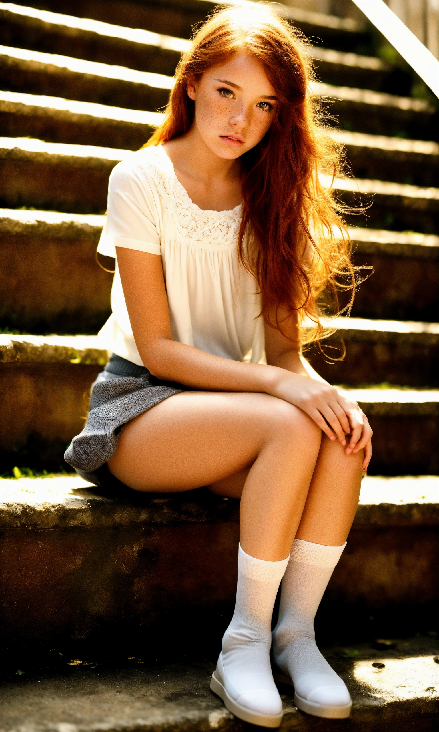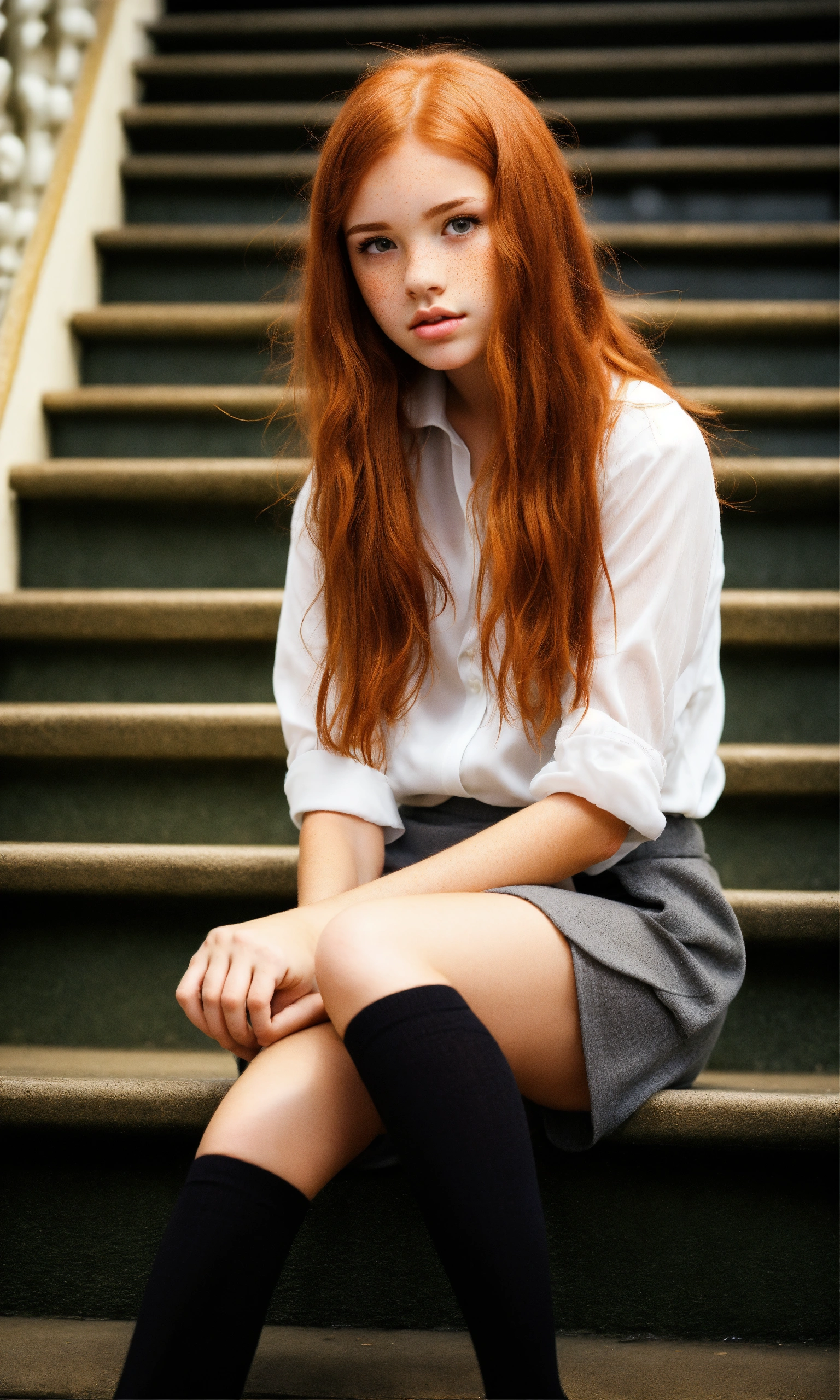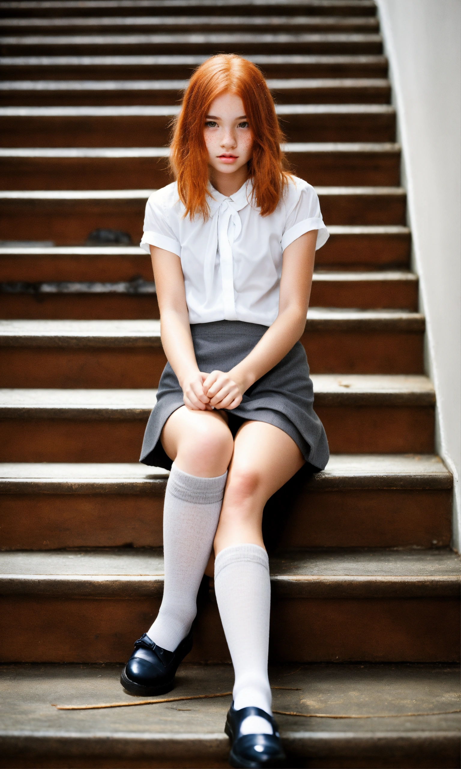 Beautiful young tween redhead with freckles. sat on stairs. short height. straight glossy centre parted long hair. natural, pretty, very short grey miniskirt, white cotton blouse, black knee high socks, tanned skin, high resolution, low angle photograph, pouty lips, petite, very young looking, volumetric lighting
