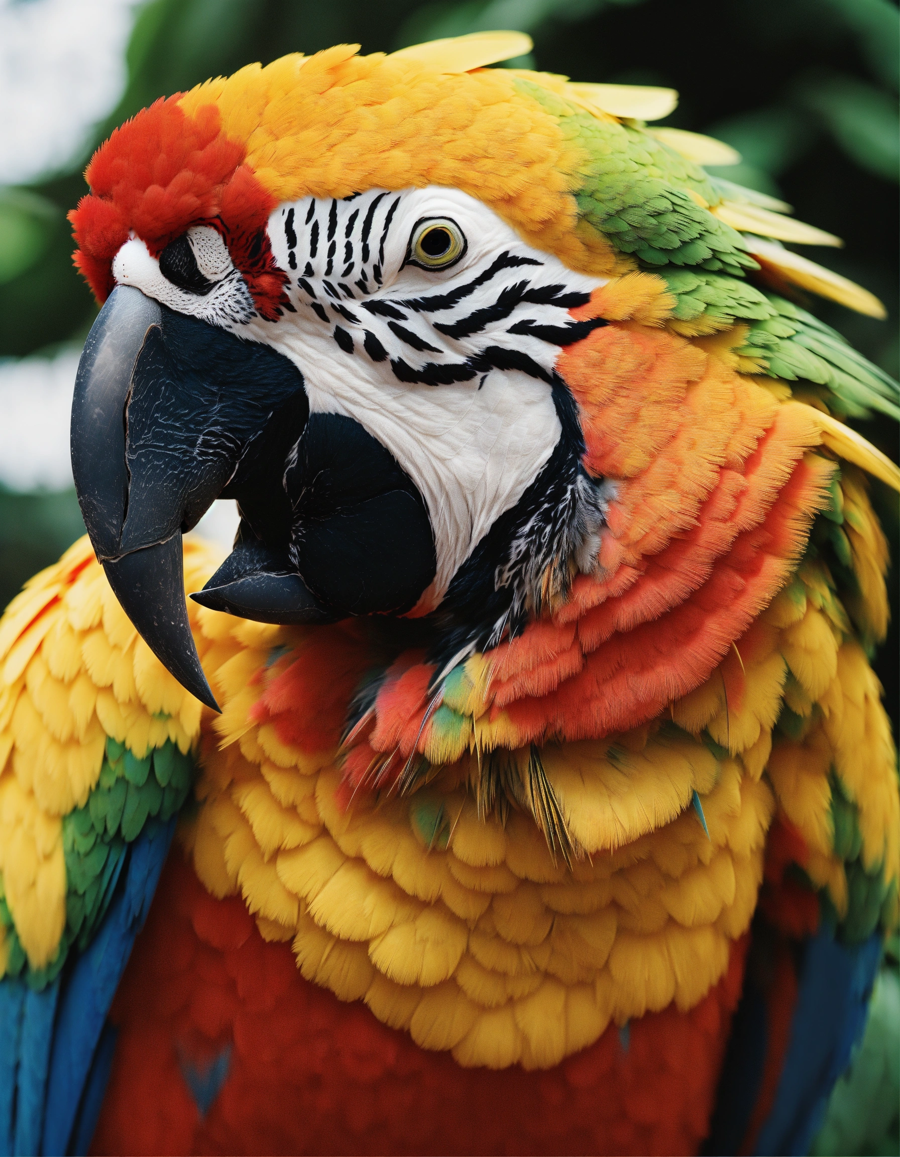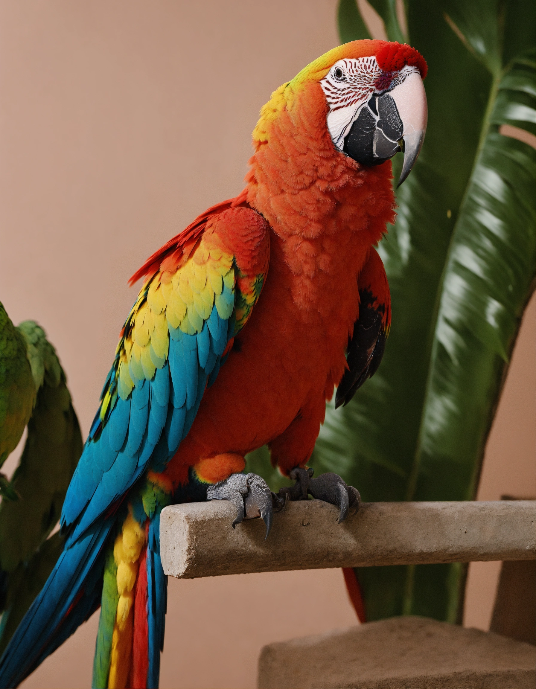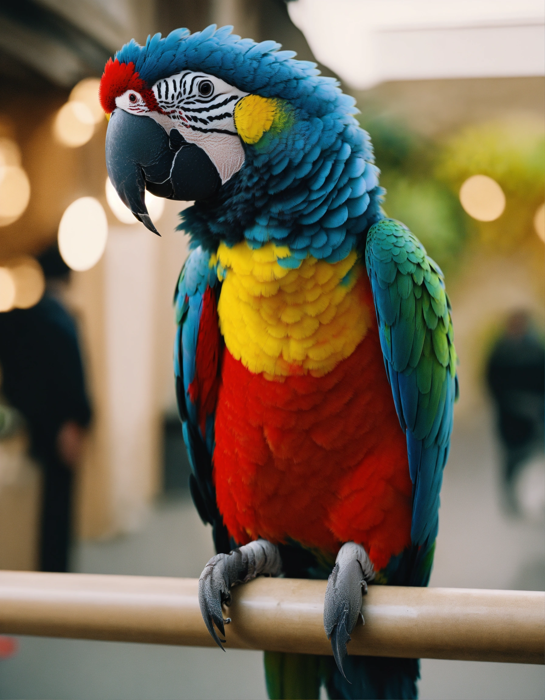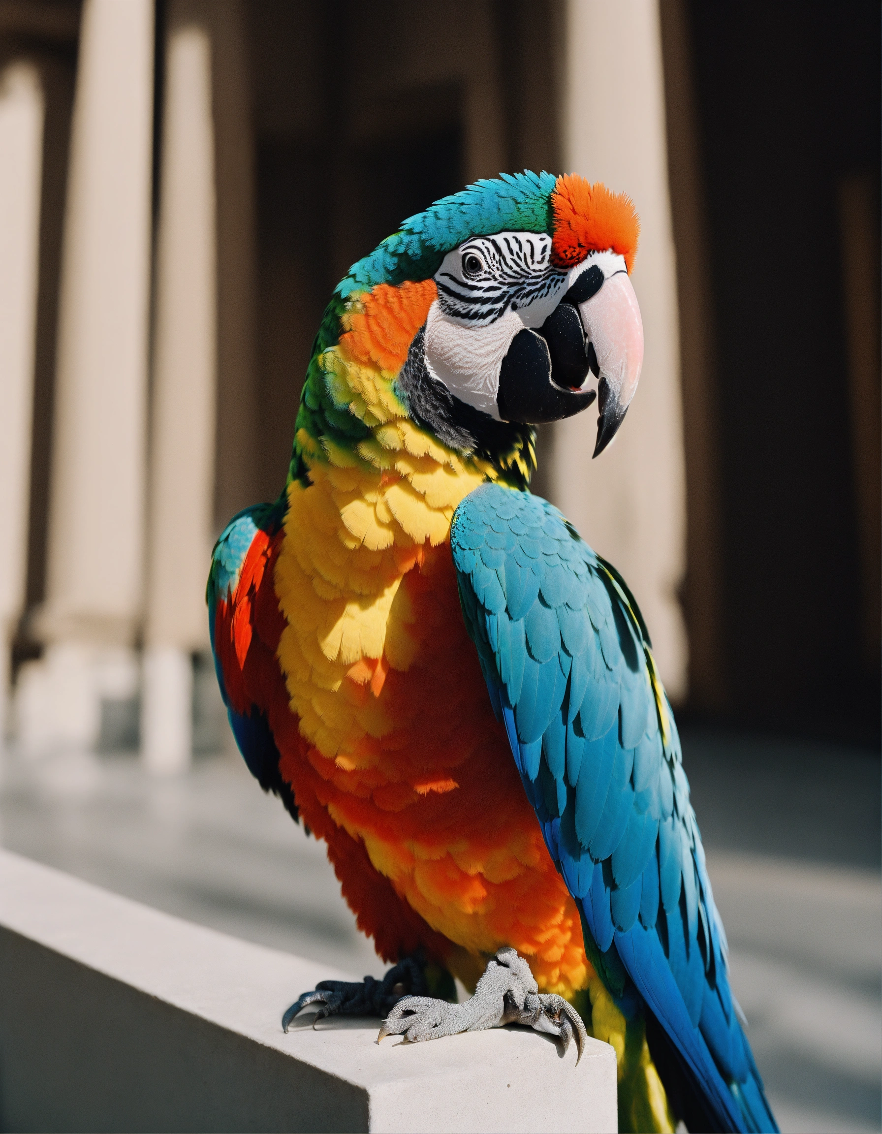Medium shot, (colorful parrot1.2), 8k resolution, hyper realistic, day, 35mm film, editorial, high fashion, 2023, off white by virgil abloh