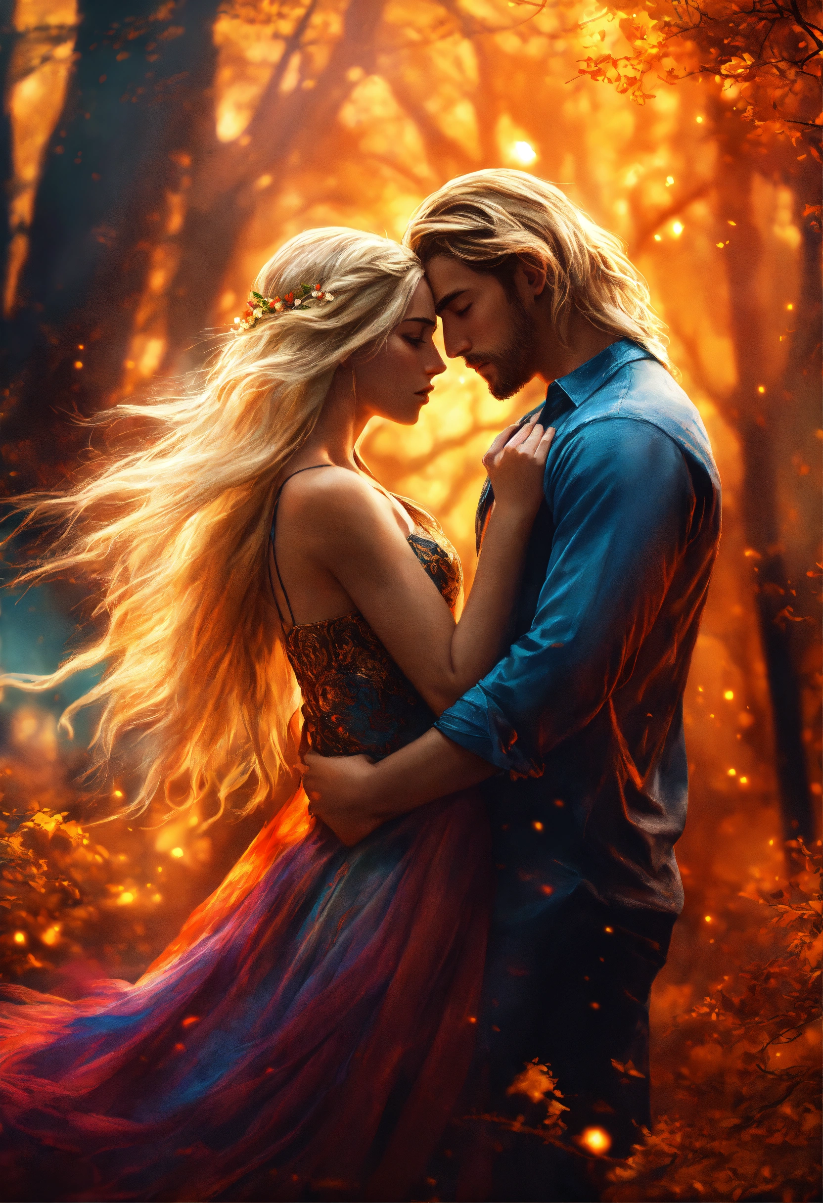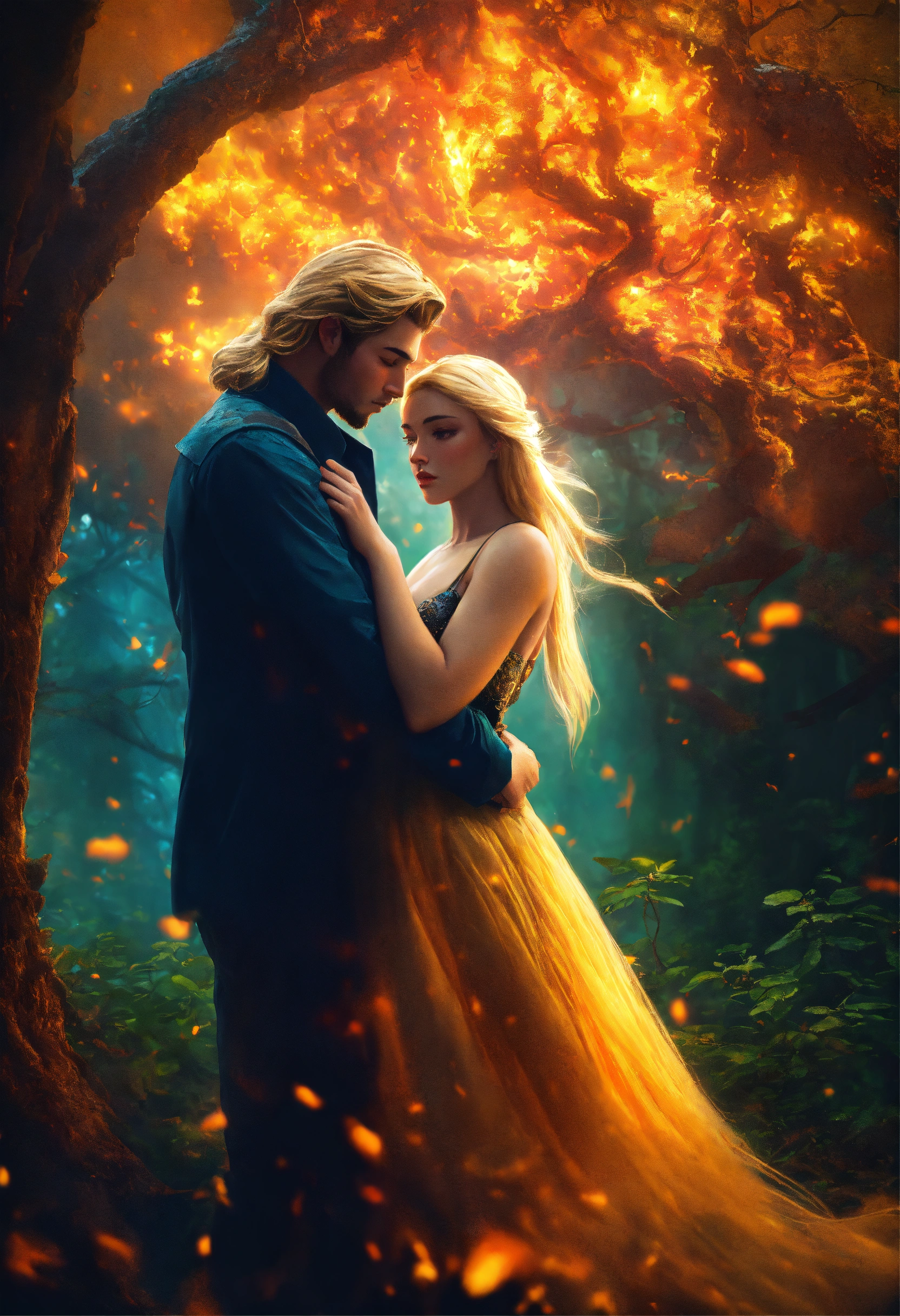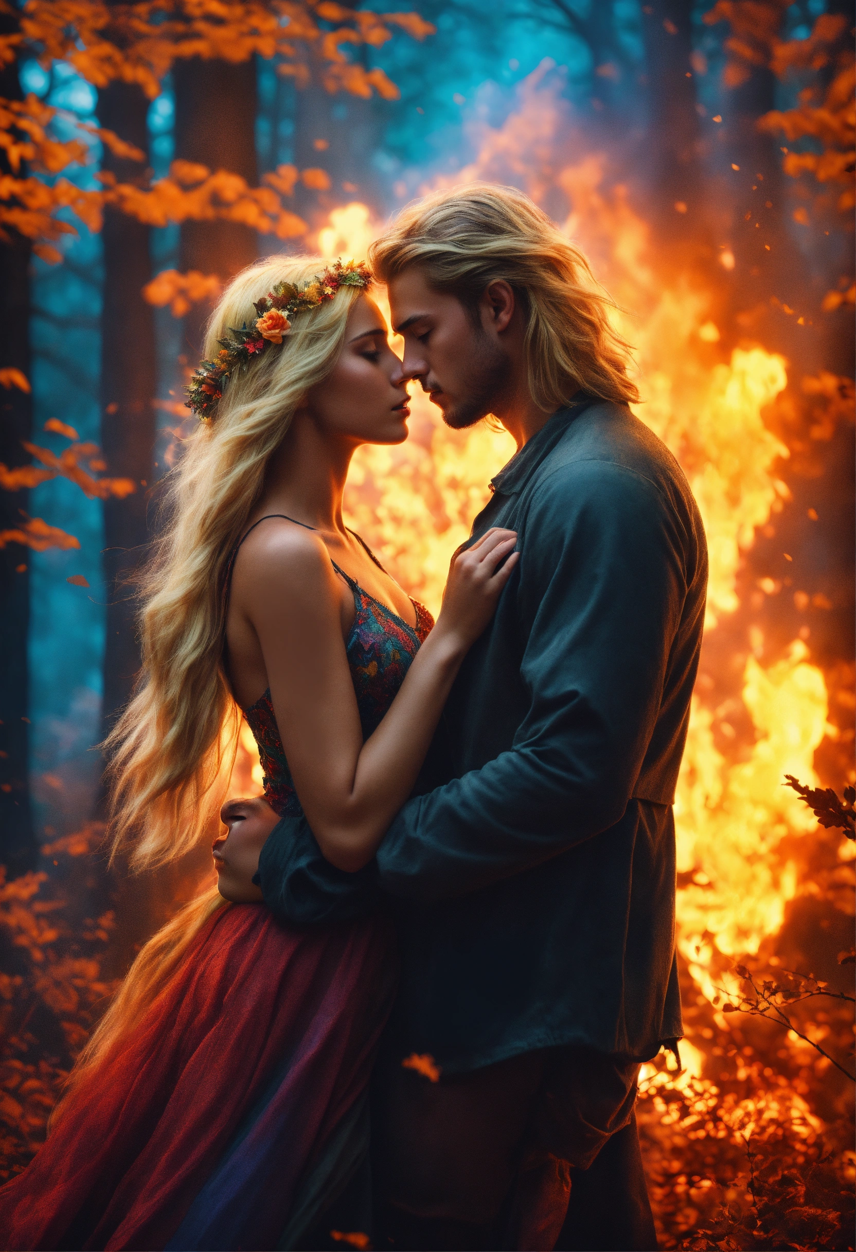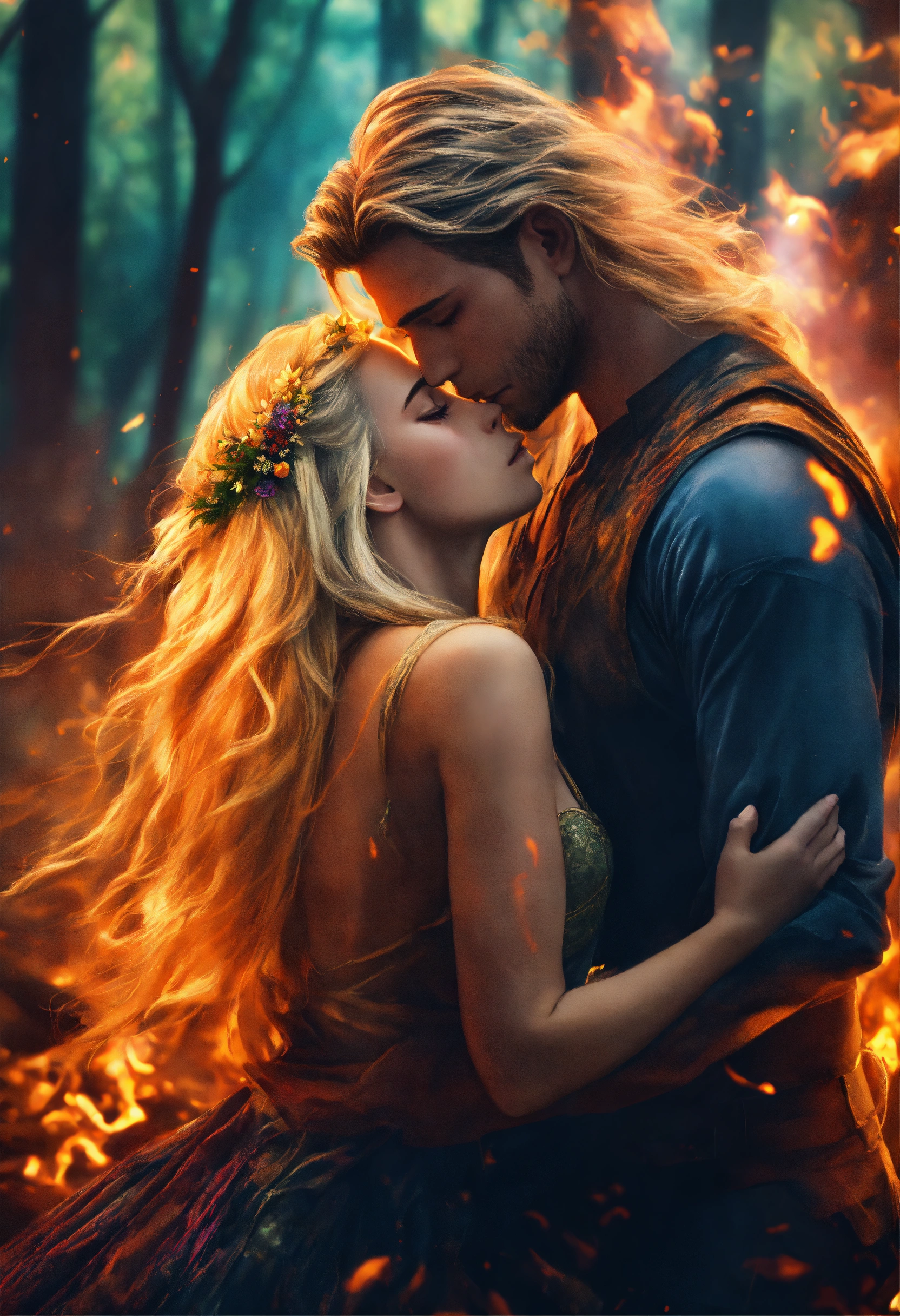 Young strong man with long blonde hair embracing a beautiful girl with colorful hair in a fairy tale forest engulfed in fire, mystic, dark fantasy, realistic photo, high detail, digital painting, cinematic, stunning, hyper-realistic, sharp focus, high resolution 8k, insanely detailed
