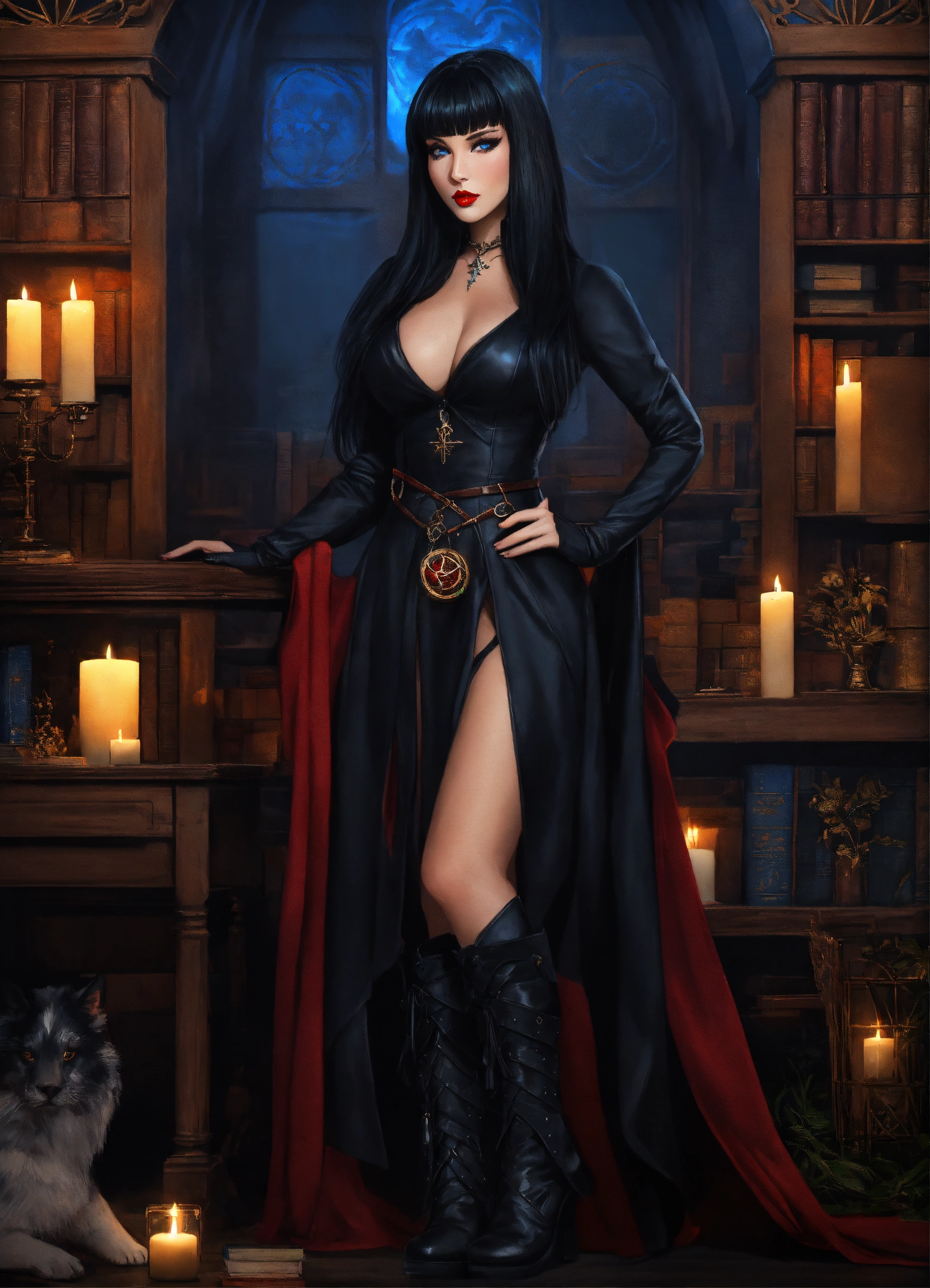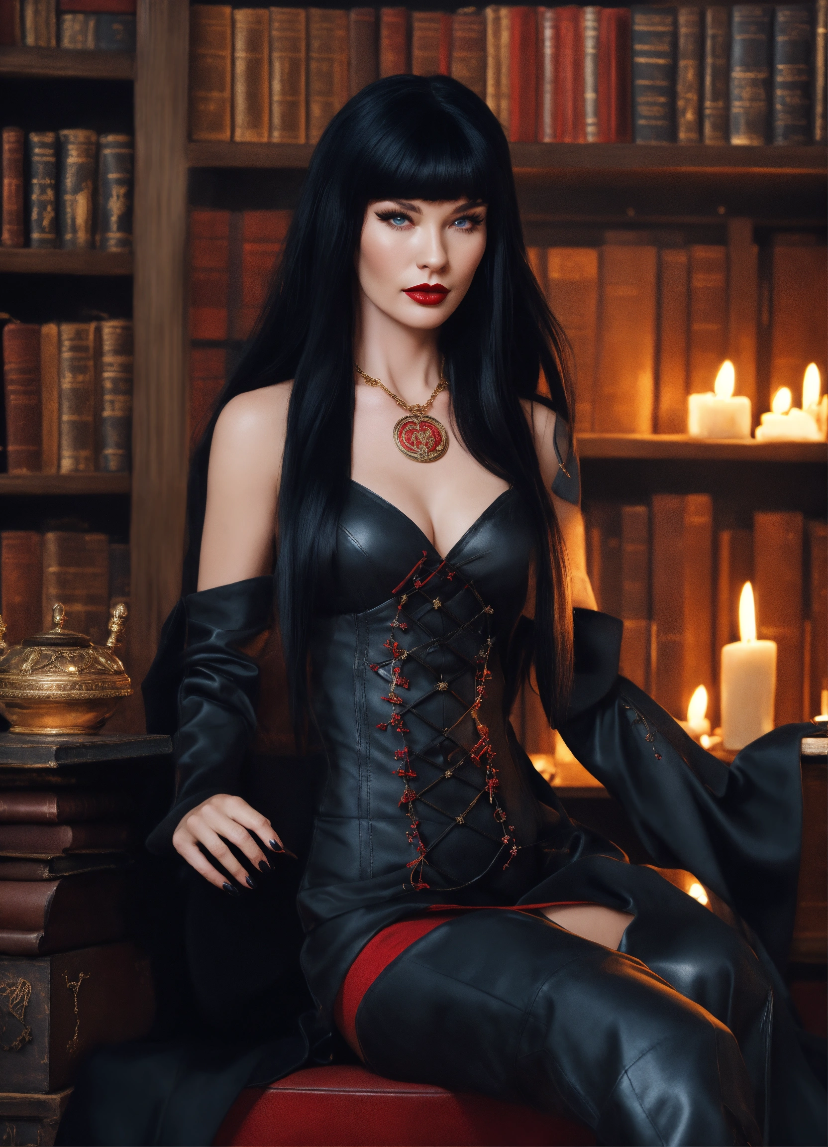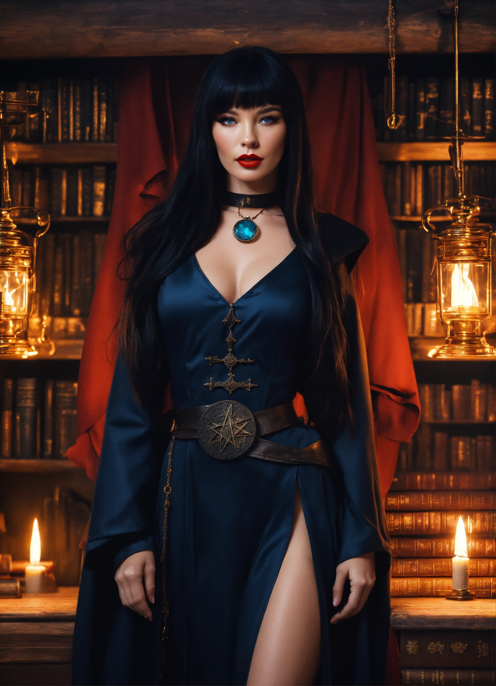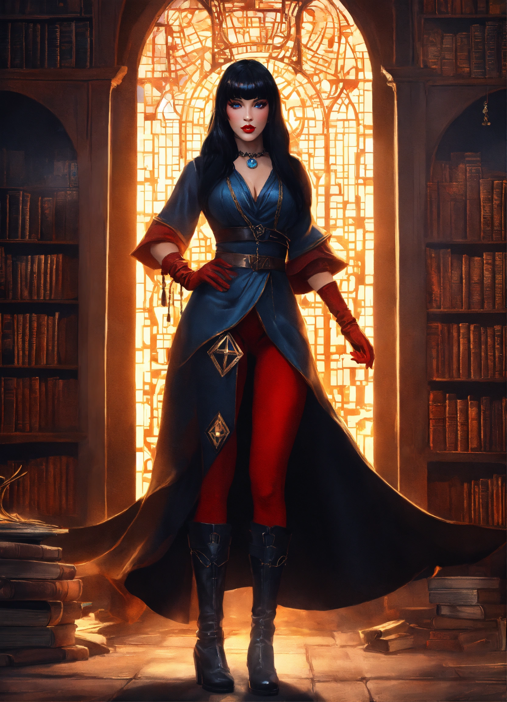 8k, fantasy art, enchantress, short height, long full body dark black robes with arcane runes, long straight black hair with straight bangs, bettie page hairstyle, blue eyes, realistic fair skin, refined face, red lipstick, excessive dark eyeshadow, petite build, arcane library background, full body, crossed legged pose, high boots, long gloves, arcane runed necklace